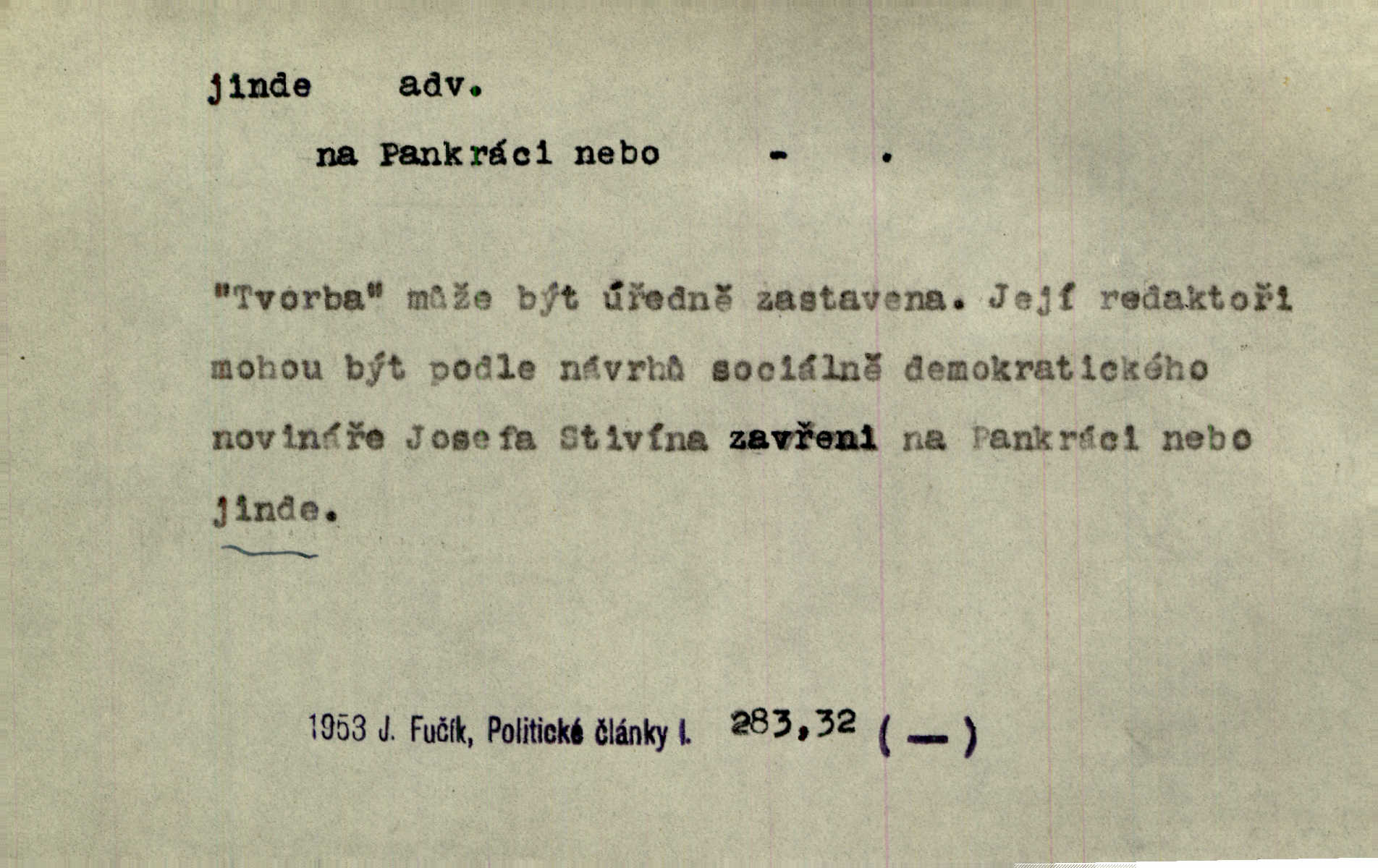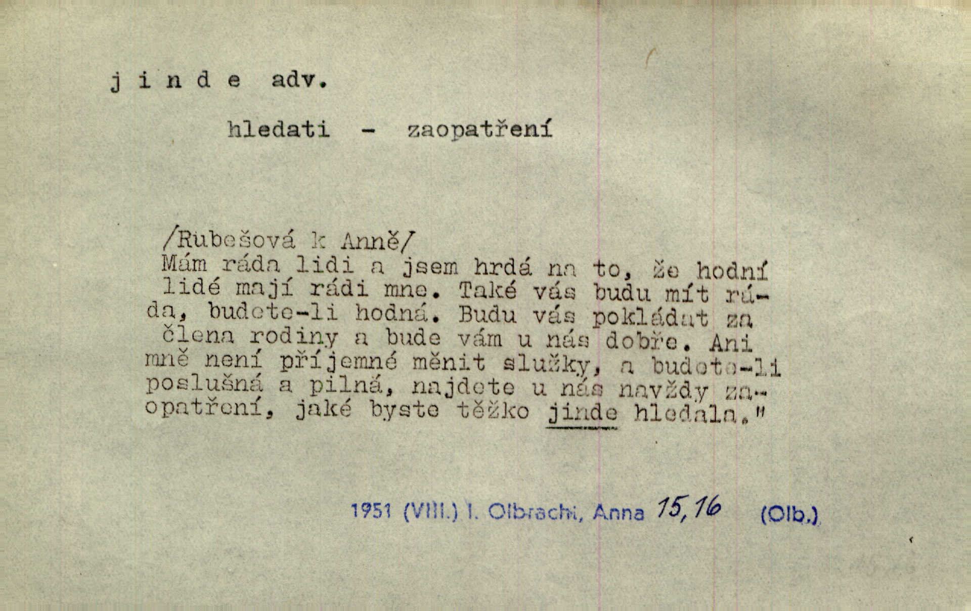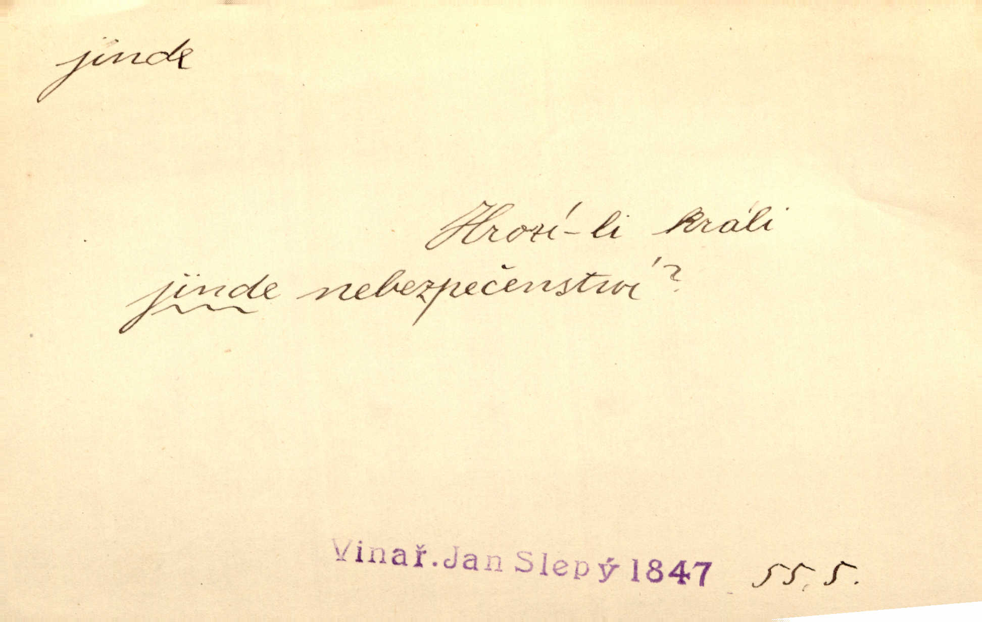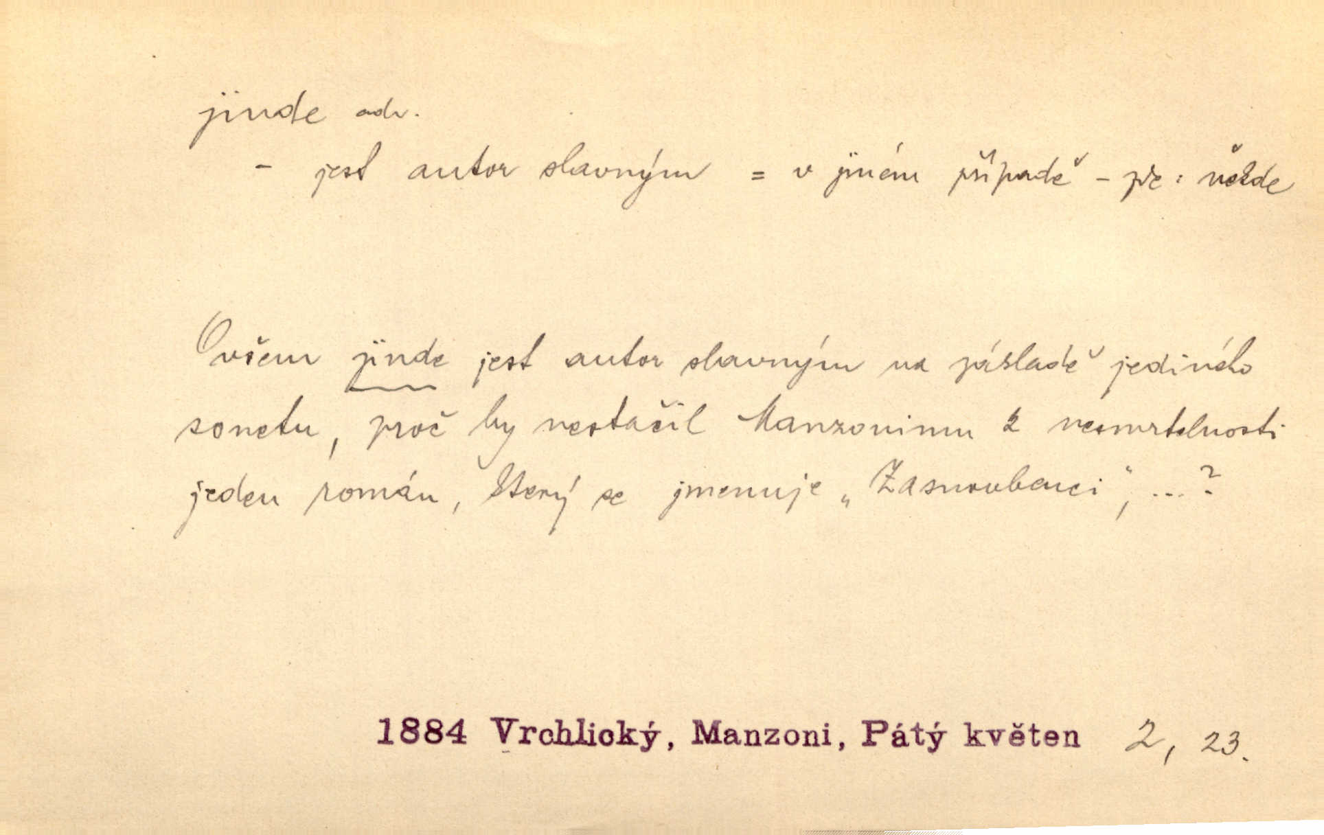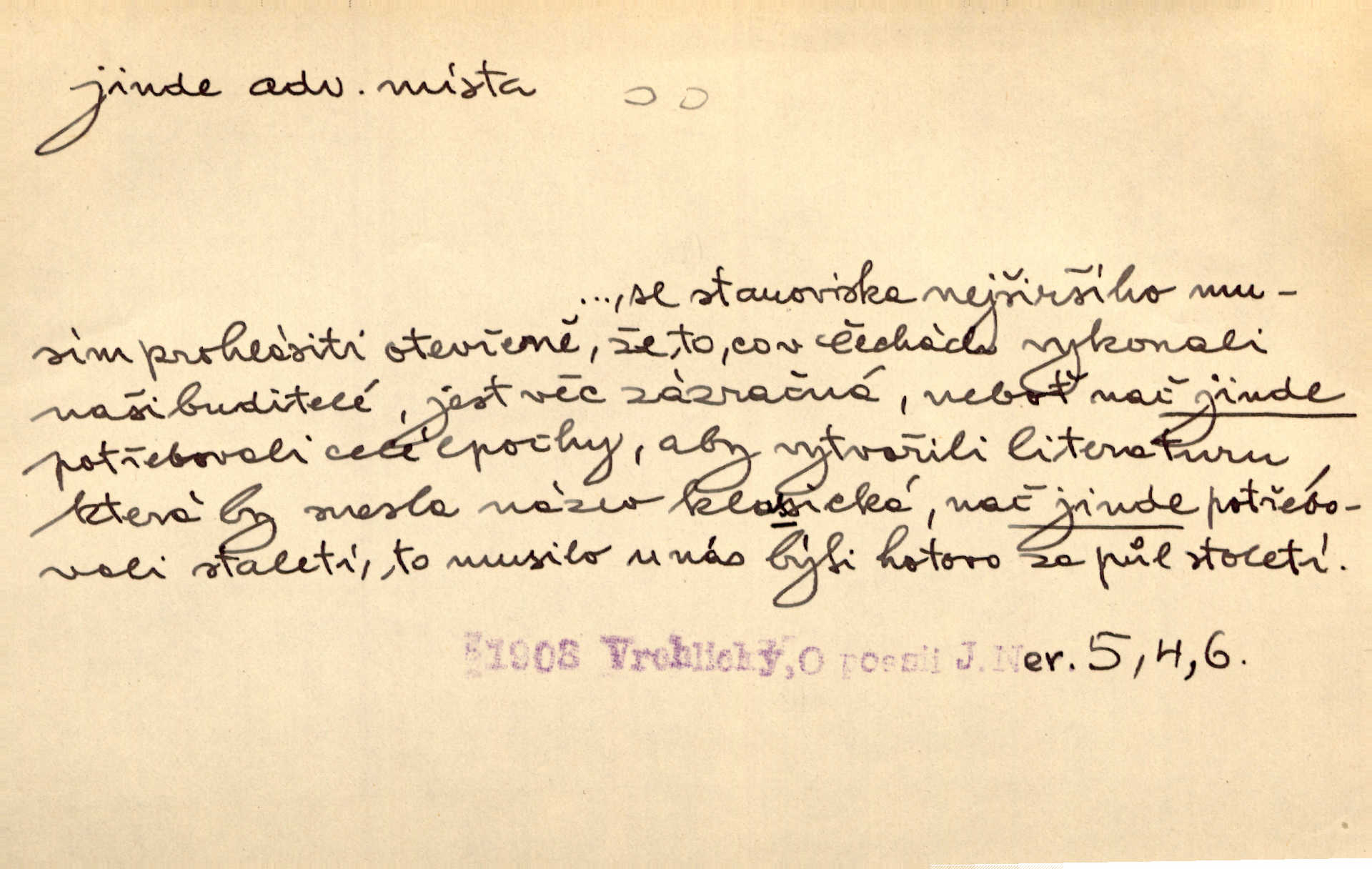 - jinde adv. na jiném místě. Taky byste mohla vyklepávat ty koberce jinde! Čech. Kde jinde, jestli ne ve Španělích, měli bychom dobrodružství hledati? Zey. D Dial. jinam. Kde bychom šli jinde jak k Balátovi? Herb. Nemůžeme spat! Půjdu jinde! Herb.