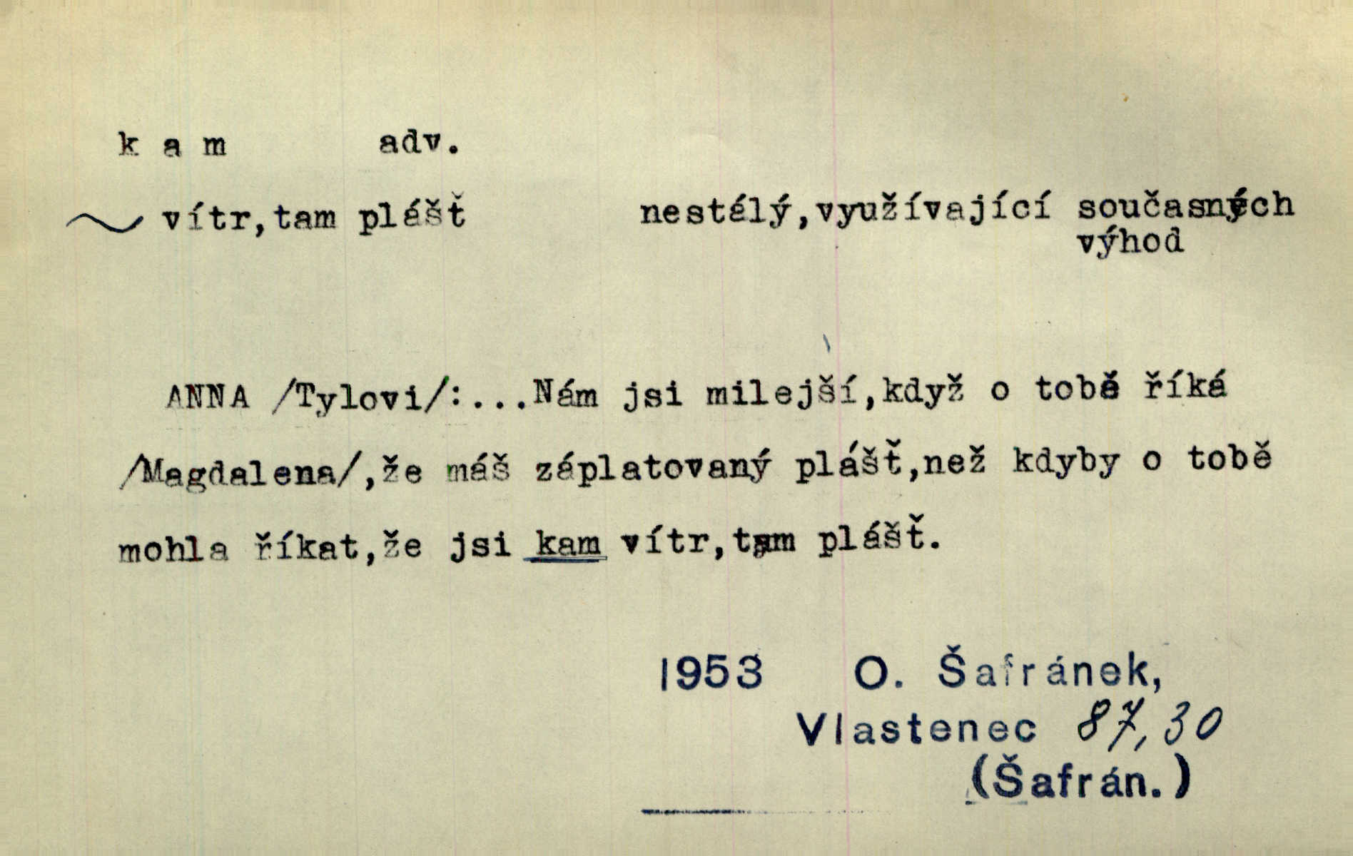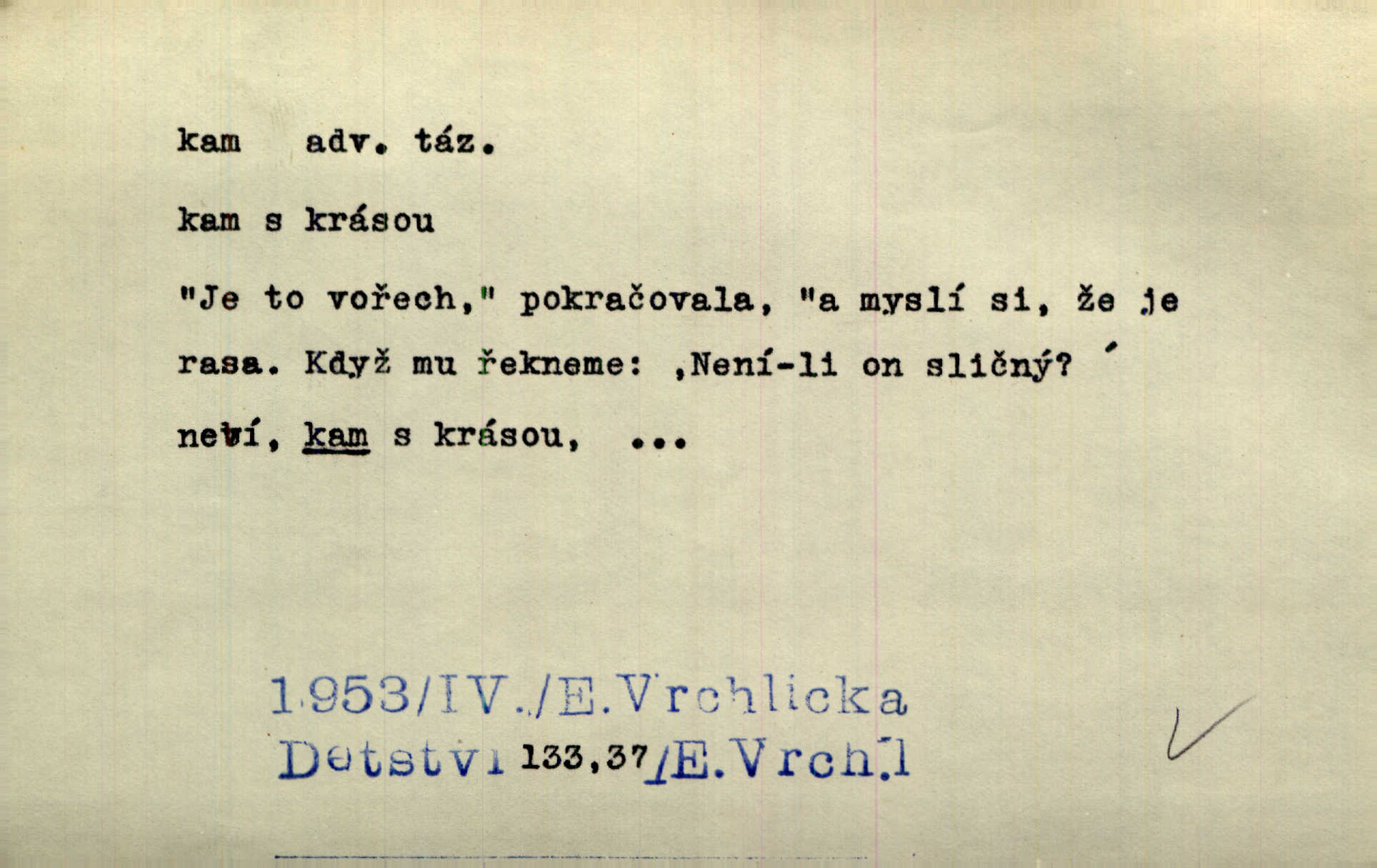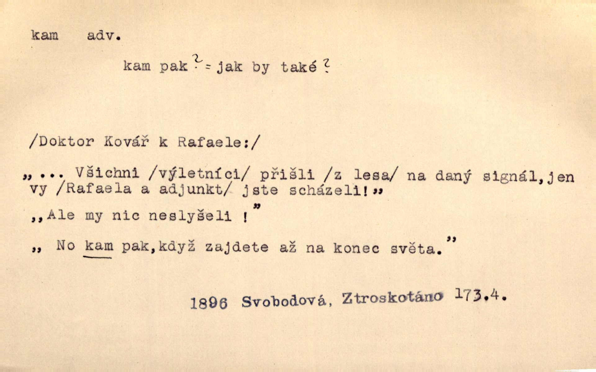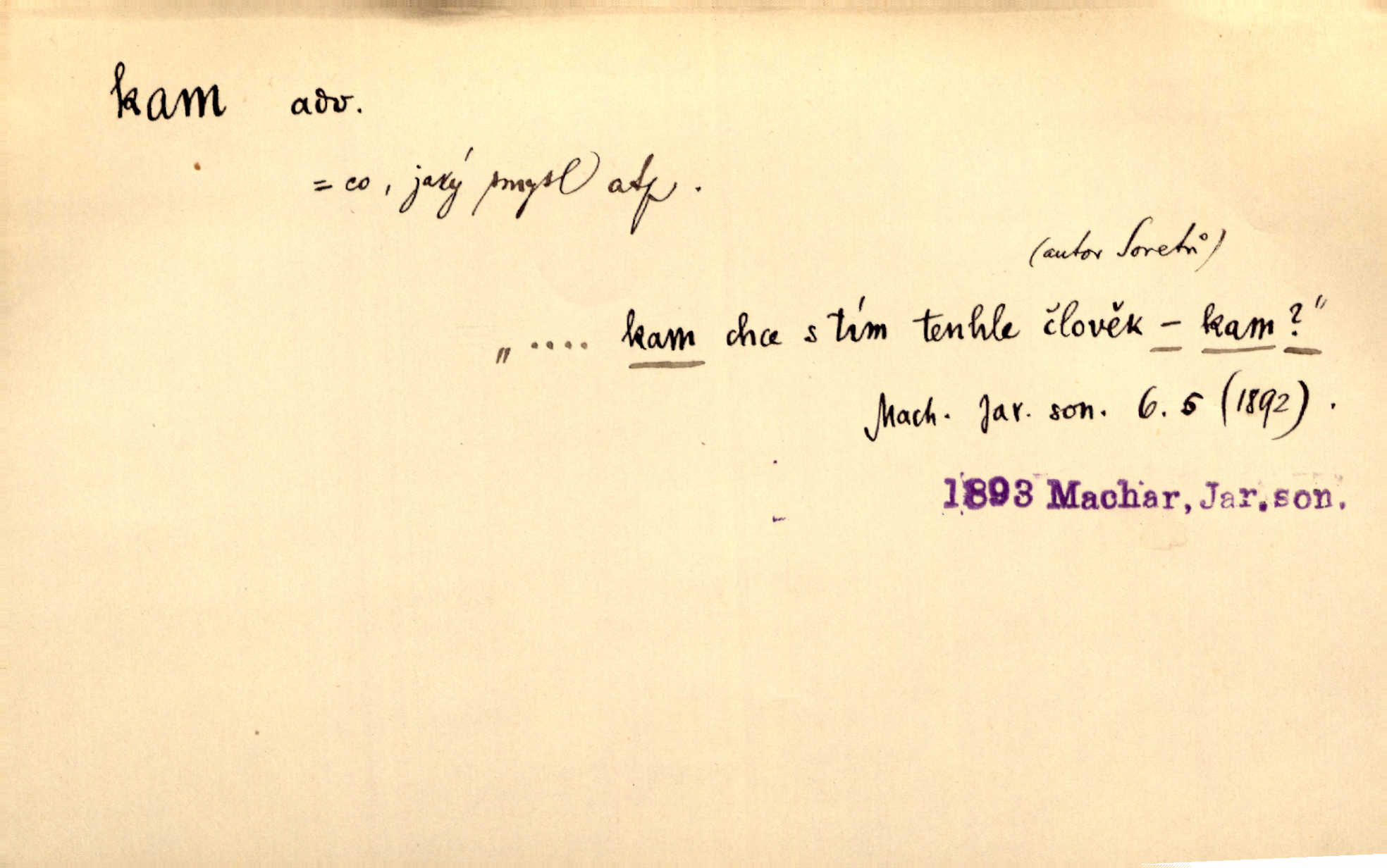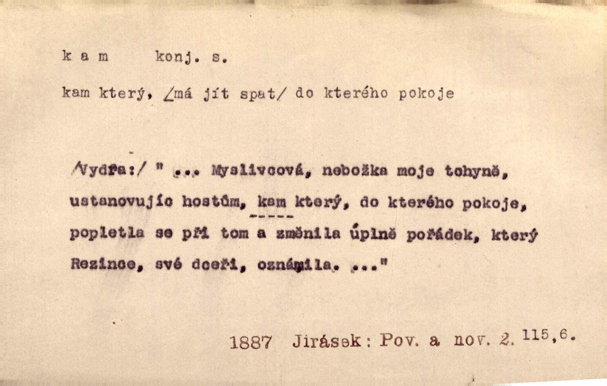 - kam (arch. a bás. kamo) zájm. adv. táz. uvozuje otázku (přímou n. nepřímou), jíž se tážeme po cíli n. účelu. Ej, ej, Tkaničko, kam pospícháš? K Adličce-li? Jir. „Kam tak pozdě na modlení?“ táži se [poutnice]. Mácha. Kampak — kampak — snad ne za nevěstou? Rais. Čisté to hospodářství! Kam jinam vésti může, než do propasti? Bozd. Prorve si hrázi obrovský kolos — jak, kdo a kamo? Mach. Nebuď bloud… snad nemyslíš… i toto, škrábe se za uchem ponocný. „Kam pak s tou flintou!“ co tě to napadá. Staš. Kam to jen myslíš, muži? — Co to máš za nápady? Třeb. Táto, táto, kams dal rozum! Jir. Kam pak s praženou [kávou]! Ta by nám pěkně vyčichla — jsme jen dvě. Herrm. Něco takového [jako je básník X.] jsme opravdu neměli. Kampak Čelakovský — takový hlupák! Mach. Kam by se dělo! není divu. Jir. Kampak mi stačí to bídné diurnum! Mám co dělat, abych zachoval „finanční rovnováhu“. Herrm. [Slepá táboritka k hochovi:] Rci, kam boj se schýlil? Čech. Jarní sny z mé duše bůh ví kam mizejí kamsi do neznáma. Vrch. Však my také víme, kam pěnkava nosem sedá nejsme hloupí. Šmil. Tak byla pomatena v tu chvíli, že nevěděla kam s očima, kam s rukama, kam s celým tělem. V. Mrš. Peníze se mu hromadily, že nevěděl, kam s nimi. Něm. Na večer nevěděl [švec] s rukou kam, tak ho bolela od samého bití. Rad. Pro okamžik nevěděl kam s řečí. Mlčel. Šmil. Nevím, kam dřív s grošem co dříve koupit, platit. Baar. Aha! nyní vím, kam bijete! kam svou řečí míříte. Sab. Mlynář se zapálil, nevěda s odpovědí kudy kam co odpověděti. Svět. Je mně jako bleše v koudeli. Nevím, kudy kam. Jir. D zájm. adv. vztaž. vyjadřuje cílový vztah své věty. Šel, kam jej nohy nesly nazdařbůh. Šmil. Půjde, kam oči povedou. Pal. Kam vítr, tam plášť. Pořek. Volně jako boží dech, který vane, kam chce, Zey. Je to stará zahrada, kam nevkročí nikdo. Kar. [Mluvilo se o tom] u rady Napila, kam chodívám v sobotu na oběd. Šim. Nad jícnem lidstvo zastav, kamo pádí. Vrch. [V pokoji] si nebylo kam sednout. Prav. [Učitel] si položí dítě přes koleno, a kam řeže, tam řeže bije nehledě na to kam. Něm. Studenti rozprášili se kam který na všecky strany. Kosm. D zájm. adv. neurč. někam. Kdo chce kam, pomozme mu tam. Přísl. V létě, když kam jdou, hodí [horalé] přes ramena kabanicu. Něm. Málo kam [paní] vycházela, sedala ustavičně u svého děcka. Jir. D zájm. adv. neurč. vztaž. kamkoli. Kam přišel, všudy byl Jakub jako doma. Prav. Květný koberec, kam noha vkročí. Čech. D Ať se takový člověk obrátí kam obrátí, cop má vždycky vzadu. Praž. pos. Dopadaly [hole] jako cepy do zralého obilí, uhoď kam uhoď. Maj. V. t. kamž.