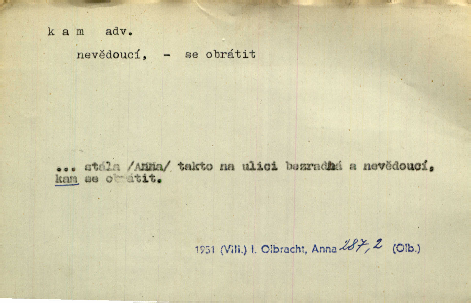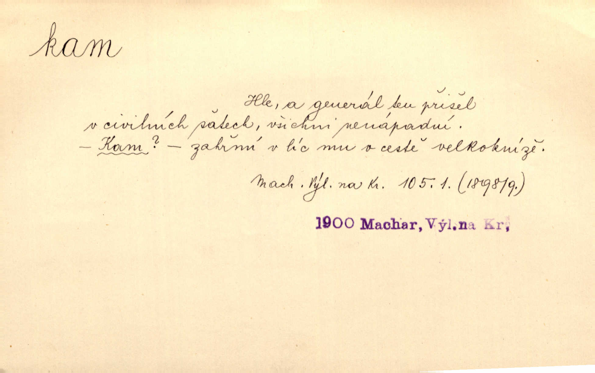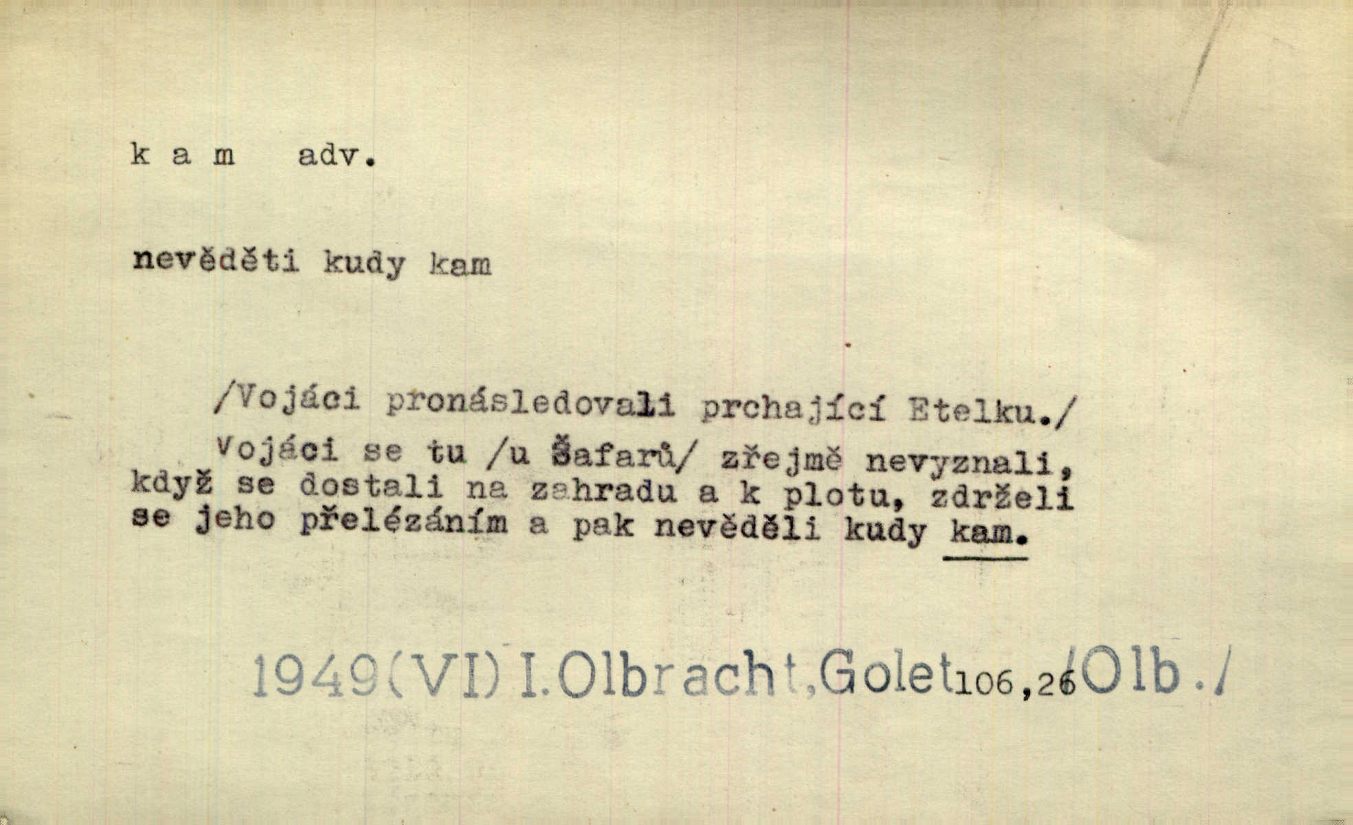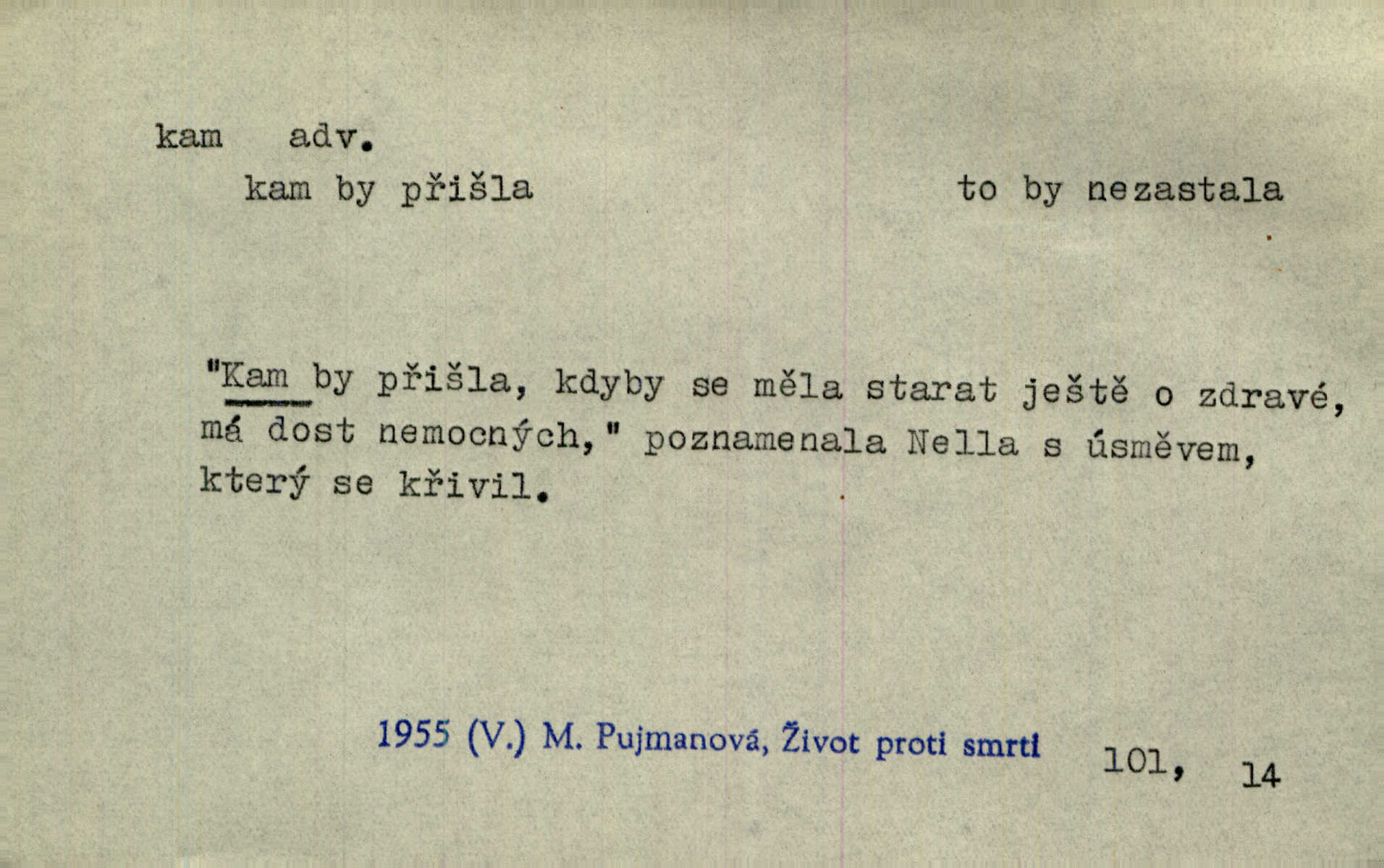 - kam (arch. a bás. kamo) zájm. adv. táz. uvozuje otázku (přímou n. nepřímou), jíž se tážeme po cíli n. účelu. Ej, ej, Tkaničko, kam pospícháš? K Adličce-li? Jir. „Kam tak pozdě na modlení?“ táži se [poutnice]. Mácha. Kampak — kampak — snad ne za nevěstou? Rais. Čisté to hospodářství! Kam jinam vésti může, než do propasti? Bozd. Prorve si hrázi obrovský kolos — jak, kdo a kamo? Mach. Nebuď bloud… snad nemyslíš… i toto, škrábe se za uchem ponocný. „Kam pak s tou flintou!“ co tě to napadá. Staš. Kam to jen myslíš, muži? — Co to máš za nápady? Třeb. Táto, táto, kams dal rozum! Jir. Kam pak s praženou [kávou]! Ta by nám pěkně vyčichla — jsme jen dvě. Herrm. Něco takového [jako je básník X.] jsme opravdu neměli. Kampak Čelakovský — takový hlupák! Mach. Kam by se dělo! není divu. Jir. Kampak mi stačí to bídné diurnum! Mám co dělat, abych zachoval „finanční rovnováhu“. Herrm. [Slepá táboritka k hochovi:] Rci, kam boj se schýlil? Čech. Jarní sny z mé duše bůh ví kam mizejí kamsi do neznáma. Vrch. Však my také víme, kam pěnkava nosem sedá nejsme hloupí. Šmil. Tak byla pomatena v tu chvíli, že nevěděla kam s očima, kam s rukama, kam s celým tělem. V. Mrš. Peníze se mu hromadily, že nevěděl, kam s nimi. Něm. Na večer nevěděl [švec] s rukou kam, tak ho bolela od samého bití. Rad. Pro okamžik nevěděl kam s řečí. Mlčel. Šmil. Nevím, kam dřív s grošem co dříve koupit, platit. Baar. Aha! nyní vím, kam bijete! kam svou řečí míříte. Sab. Mlynář se zapálil, nevěda s odpovědí kudy kam co odpověděti. Svět. Je mně jako bleše v koudeli. Nevím, kudy kam. Jir. D zájm. adv. vztaž. vyjadřuje cílový vztah své věty. Šel, kam jej nohy nesly nazdařbůh. Šmil. Půjde, kam oči povedou. Pal. Kam vítr, tam plášť. Pořek. Volně jako boží dech, který vane, kam chce, Zey. Je to stará zahrada, kam nevkročí nikdo. Kar. [Mluvilo se o tom] u rady Napila, kam chodívám v sobotu na oběd. Šim. Nad jícnem lidstvo zastav, kamo pádí. Vrch. [V pokoji] si nebylo kam sednout. Prav. [Učitel] si položí dítě přes koleno, a kam řeže, tam řeže bije nehledě na to kam. Něm. Studenti rozprášili se kam který na všecky strany. Kosm. D zájm. adv. neurč. někam. Kdo chce kam, pomozme mu tam. Přísl. V létě, když kam jdou, hodí [horalé] přes ramena kabanicu. Něm. Málo kam [paní] vycházela, sedala ustavičně u svého děcka. Jir. D zájm. adv. neurč. vztaž. kamkoli. Kam přišel, všudy byl Jakub jako doma. Prav. Květný koberec, kam noha vkročí. Čech. D Ať se takový člověk obrátí kam obrátí, cop má vždycky vzadu. Praž. pos. Dopadaly [hole] jako cepy do zralého obilí, uhoď kam uhoď. Maj. V. t. kamž.