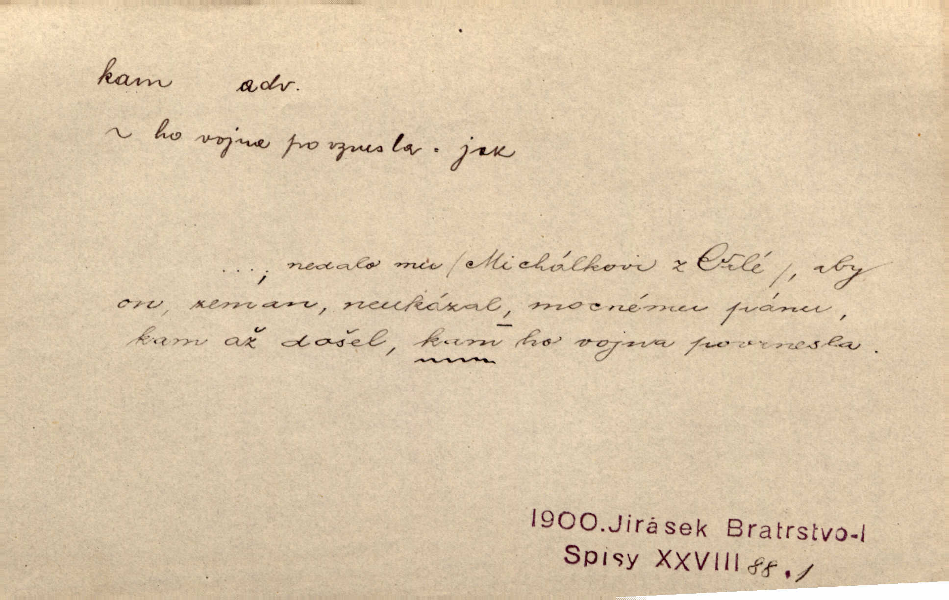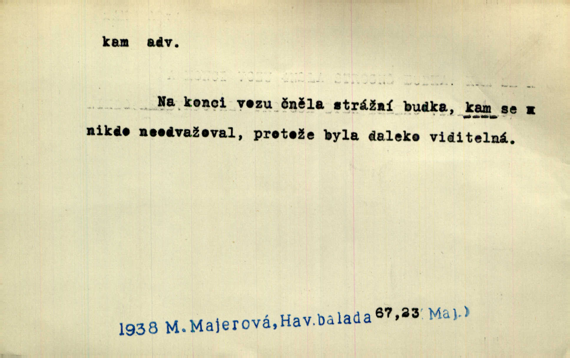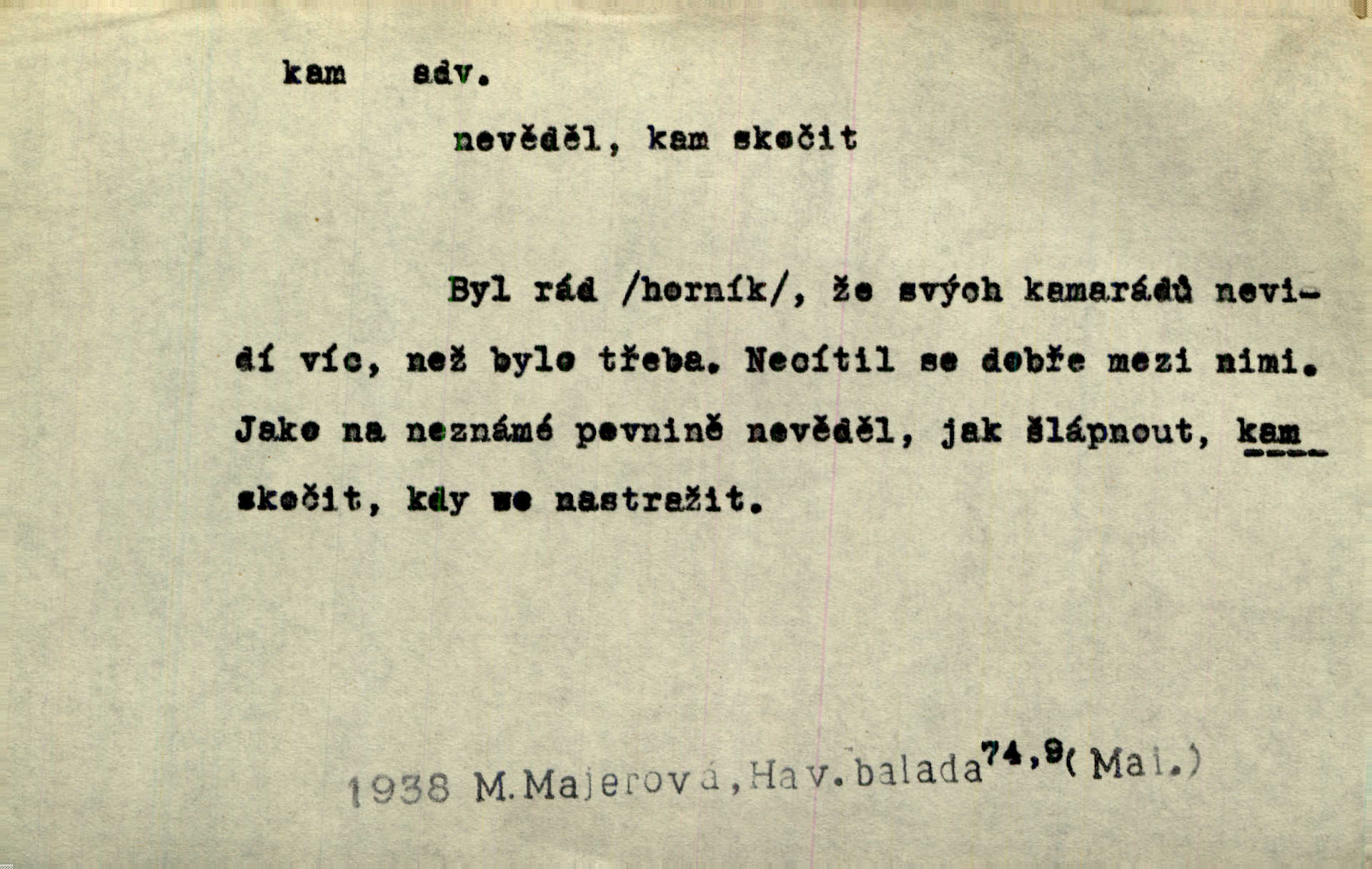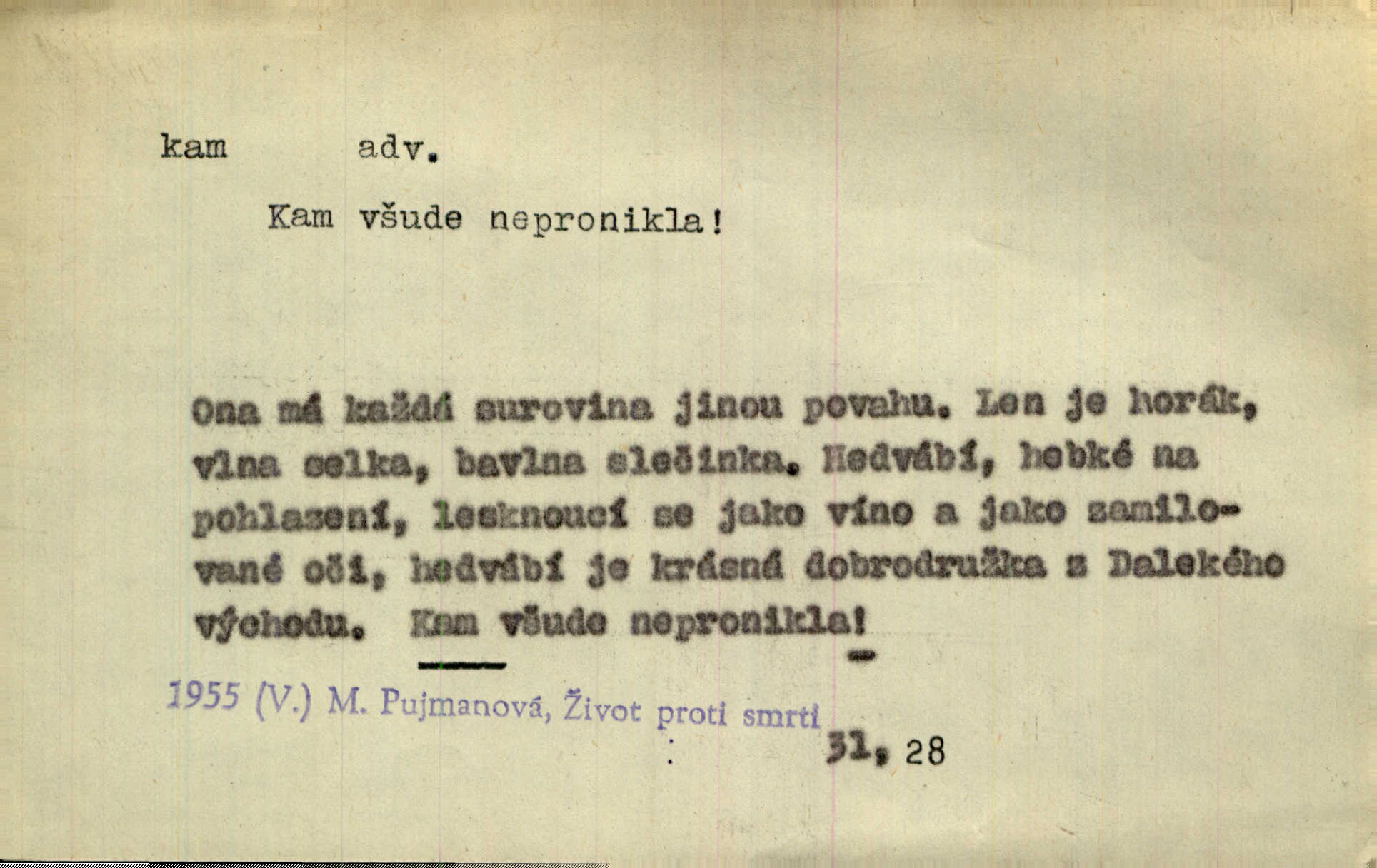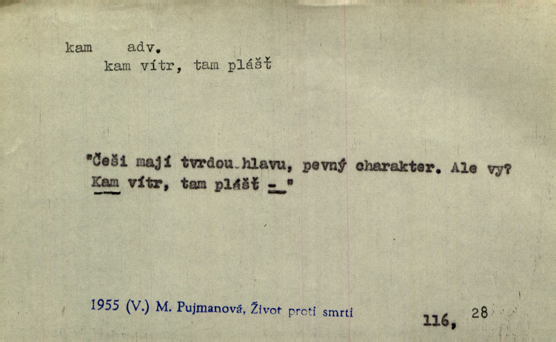 - kam (arch. a bás. kamo) zájm. adv. táz. uvozuje otázku (přímou n. nepřímou), jíž se tážeme po cíli n. účelu. Ej, ej, Tkaničko, kam pospícháš? K Adličce-li? Jir. „Kam tak pozdě na modlení?“ táži se [poutnice]. Mácha. Kampak — kampak — snad ne za nevěstou? Rais. Čisté to hospodářství! Kam jinam vésti může, než do propasti? Bozd. Prorve si hrázi obrovský kolos — jak, kdo a kamo? Mach. Nebuď bloud… snad nemyslíš… i toto, škrábe se za uchem ponocný. „Kam pak s tou flintou!“ co tě to napadá. Staš. Kam to jen myslíš, muži? — Co to máš za nápady? Třeb. Táto, táto, kams dal rozum! Jir. Kam pak s praženou [kávou]! Ta by nám pěkně vyčichla — jsme jen dvě. Herrm. Něco takového [jako je básník X.] jsme opravdu neměli. Kampak Čelakovský — takový hlupák! Mach. Kam by se dělo! není divu. Jir. Kampak mi stačí to bídné diurnum! Mám co dělat, abych zachoval „finanční rovnováhu“. Herrm. [Slepá táboritka k hochovi:] Rci, kam boj se schýlil? Čech. Jarní sny z mé duše bůh ví kam mizejí kamsi do neznáma. Vrch. Však my také víme, kam pěnkava nosem sedá nejsme hloupí. Šmil. Tak byla pomatena v tu chvíli, že nevěděla kam s očima, kam s rukama, kam s celým tělem. V. Mrš. Peníze se mu hromadily, že nevěděl, kam s nimi. Něm. Na večer nevěděl [švec] s rukou kam, tak ho bolela od samého bití. Rad. Pro okamžik nevěděl kam s řečí. Mlčel. Šmil. Nevím, kam dřív s grošem co dříve koupit, platit. Baar. Aha! nyní vím, kam bijete! kam svou řečí míříte. Sab. Mlynář se zapálil, nevěda s odpovědí kudy kam co odpověděti. Svět. Je mně jako bleše v koudeli. Nevím, kudy kam. Jir. D zájm. adv. vztaž. vyjadřuje cílový vztah své věty. Šel, kam jej nohy nesly nazdařbůh. Šmil. Půjde, kam oči povedou. Pal. Kam vítr, tam plášť. Pořek. Volně jako boží dech, který vane, kam chce, Zey. Je to stará zahrada, kam nevkročí nikdo. Kar. [Mluvilo se o tom] u rady Napila, kam chodívám v sobotu na oběd. Šim. Nad jícnem lidstvo zastav, kamo pádí. Vrch. [V pokoji] si nebylo kam sednout. Prav. [Učitel] si položí dítě přes koleno, a kam řeže, tam řeže bije nehledě na to kam. Něm. Studenti rozprášili se kam který na všecky strany. Kosm. D zájm. adv. neurč. někam. Kdo chce kam, pomozme mu tam. Přísl. V létě, když kam jdou, hodí [horalé] přes ramena kabanicu. Něm. Málo kam [paní] vycházela, sedala ustavičně u svého děcka. Jir. D zájm. adv. neurč. vztaž. kamkoli. Kam přišel, všudy byl Jakub jako doma. Prav. Květný koberec, kam noha vkročí. Čech. D Ať se takový člověk obrátí kam obrátí, cop má vždycky vzadu. Praž. pos. Dopadaly [hole] jako cepy do zralého obilí, uhoď kam uhoď. Maj. V. t. kamž.