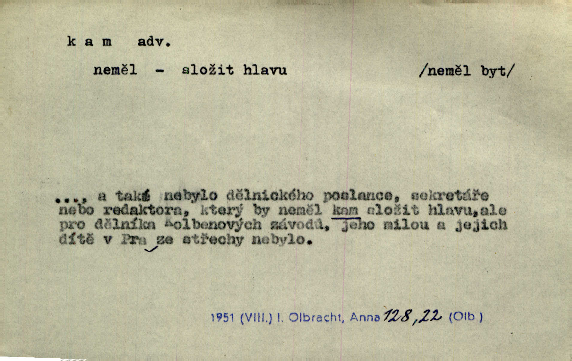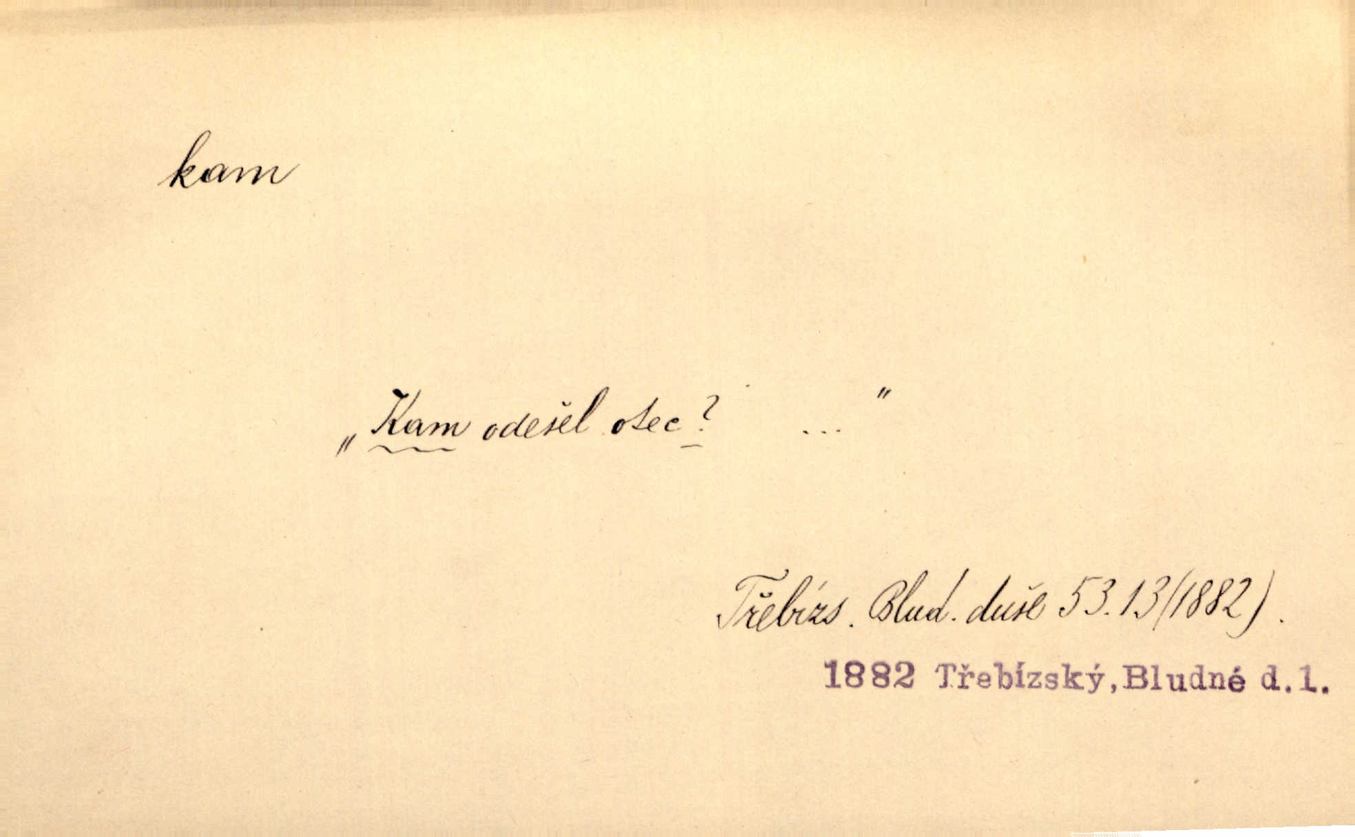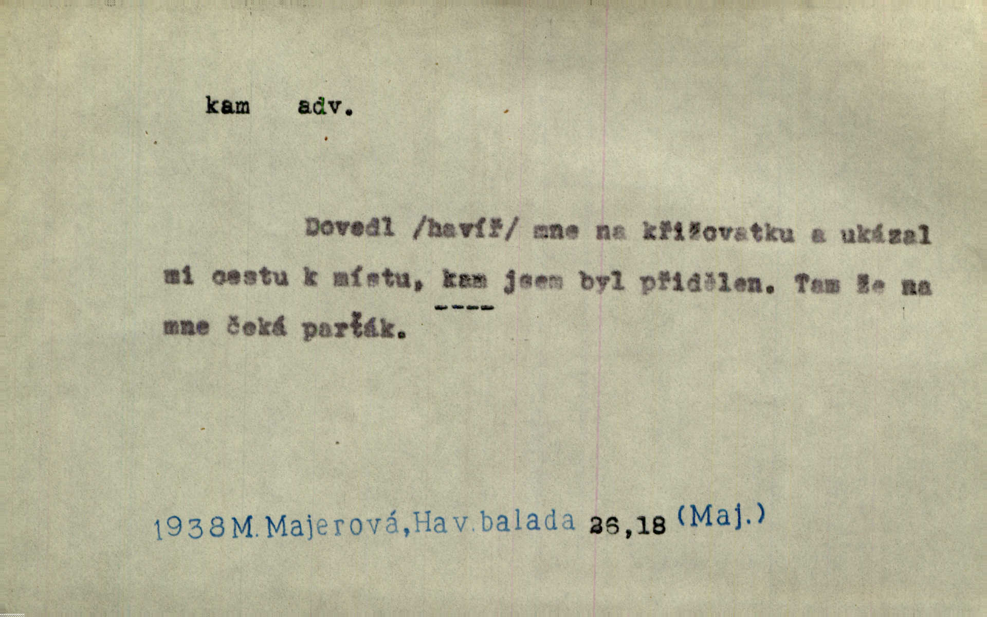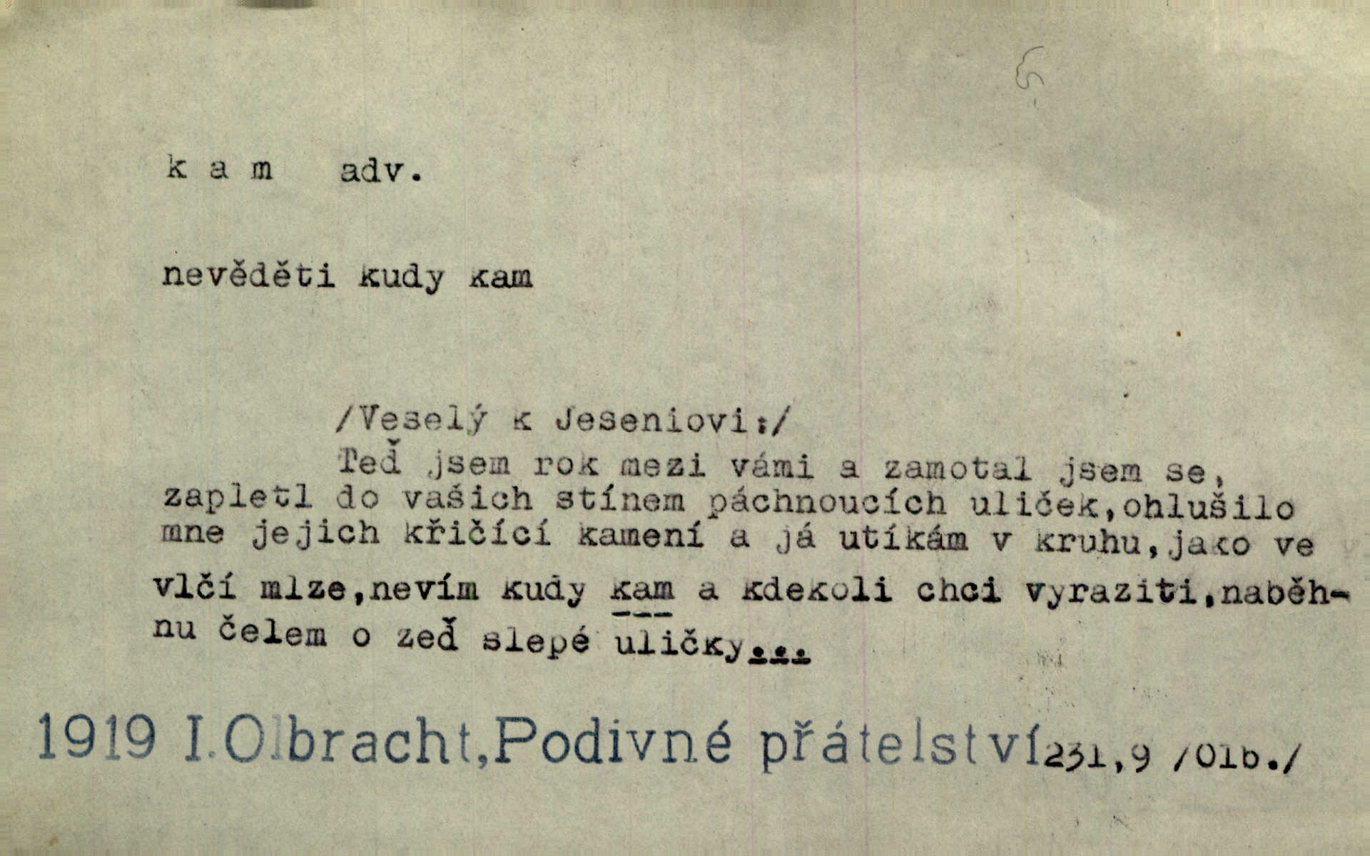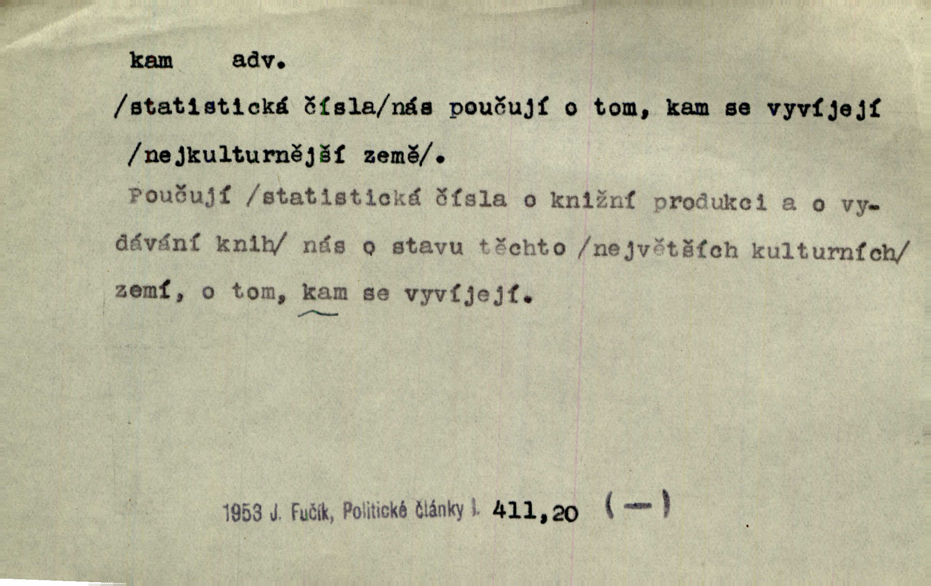 - kam (arch. a bás. kamo) zájm. adv. táz. uvozuje otázku (přímou n. nepřímou), jíž se tážeme po cíli n. účelu. Ej, ej, Tkaničko, kam pospícháš? K Adličce-li? Jir. „Kam tak pozdě na modlení?“ táži se [poutnice]. Mácha. Kampak — kampak — snad ne za nevěstou? Rais. Čisté to hospodářství! Kam jinam vésti může, než do propasti? Bozd. Prorve si hrázi obrovský kolos — jak, kdo a kamo? Mach. Nebuď bloud… snad nemyslíš… i toto, škrábe se za uchem ponocný. „Kam pak s tou flintou!“ co tě to napadá. Staš. Kam to jen myslíš, muži? — Co to máš za nápady? Třeb. Táto, táto, kams dal rozum! Jir. Kam pak s praženou [kávou]! Ta by nám pěkně vyčichla — jsme jen dvě. Herrm. Něco takového [jako je básník X.] jsme opravdu neměli. Kampak Čelakovský — takový hlupák! Mach. Kam by se dělo! není divu. Jir. Kampak mi stačí to bídné diurnum! Mám co dělat, abych zachoval „finanční rovnováhu“. Herrm. [Slepá táboritka k hochovi:] Rci, kam boj se schýlil? Čech. Jarní sny z mé duše bůh ví kam mizejí kamsi do neznáma. Vrch. Však my také víme, kam pěnkava nosem sedá nejsme hloupí. Šmil. Tak byla pomatena v tu chvíli, že nevěděla kam s očima, kam s rukama, kam s celým tělem. V. Mrš. Peníze se mu hromadily, že nevěděl, kam s nimi. Něm. Na večer nevěděl [švec] s rukou kam, tak ho bolela od samého bití. Rad. Pro okamžik nevěděl kam s řečí. Mlčel. Šmil. Nevím, kam dřív s grošem co dříve koupit, platit. Baar. Aha! nyní vím, kam bijete! kam svou řečí míříte. Sab. Mlynář se zapálil, nevěda s odpovědí kudy kam co odpověděti. Svět. Je mně jako bleše v koudeli. Nevím, kudy kam. Jir. D zájm. adv. vztaž. vyjadřuje cílový vztah své věty. Šel, kam jej nohy nesly nazdařbůh. Šmil. Půjde, kam oči povedou. Pal. Kam vítr, tam plášť. Pořek. Volně jako boží dech, který vane, kam chce, Zey. Je to stará zahrada, kam nevkročí nikdo. Kar. [Mluvilo se o tom] u rady Napila, kam chodívám v sobotu na oběd. Šim. Nad jícnem lidstvo zastav, kamo pádí. Vrch. [V pokoji] si nebylo kam sednout. Prav. [Učitel] si položí dítě přes koleno, a kam řeže, tam řeže bije nehledě na to kam. Něm. Studenti rozprášili se kam který na všecky strany. Kosm. D zájm. adv. neurč. někam. Kdo chce kam, pomozme mu tam. Přísl. V létě, když kam jdou, hodí [horalé] přes ramena kabanicu. Něm. Málo kam [paní] vycházela, sedala ustavičně u svého děcka. Jir. D zájm. adv. neurč. vztaž. kamkoli. Kam přišel, všudy byl Jakub jako doma. Prav. Květný koberec, kam noha vkročí. Čech. D Ať se takový člověk obrátí kam obrátí, cop má vždycky vzadu. Praž. pos. Dopadaly [hole] jako cepy do zralého obilí, uhoď kam uhoď. Maj. V. t. kamž.