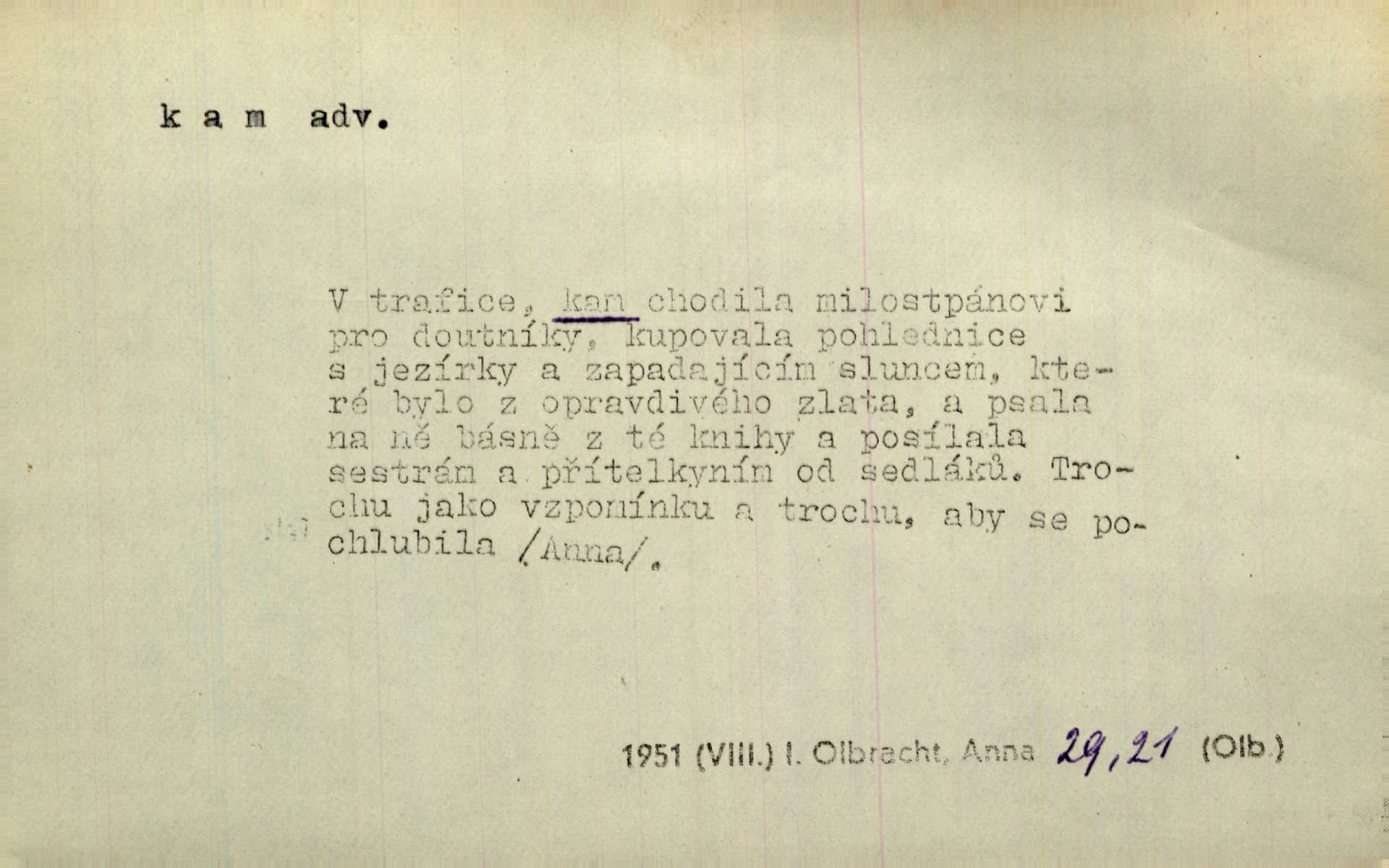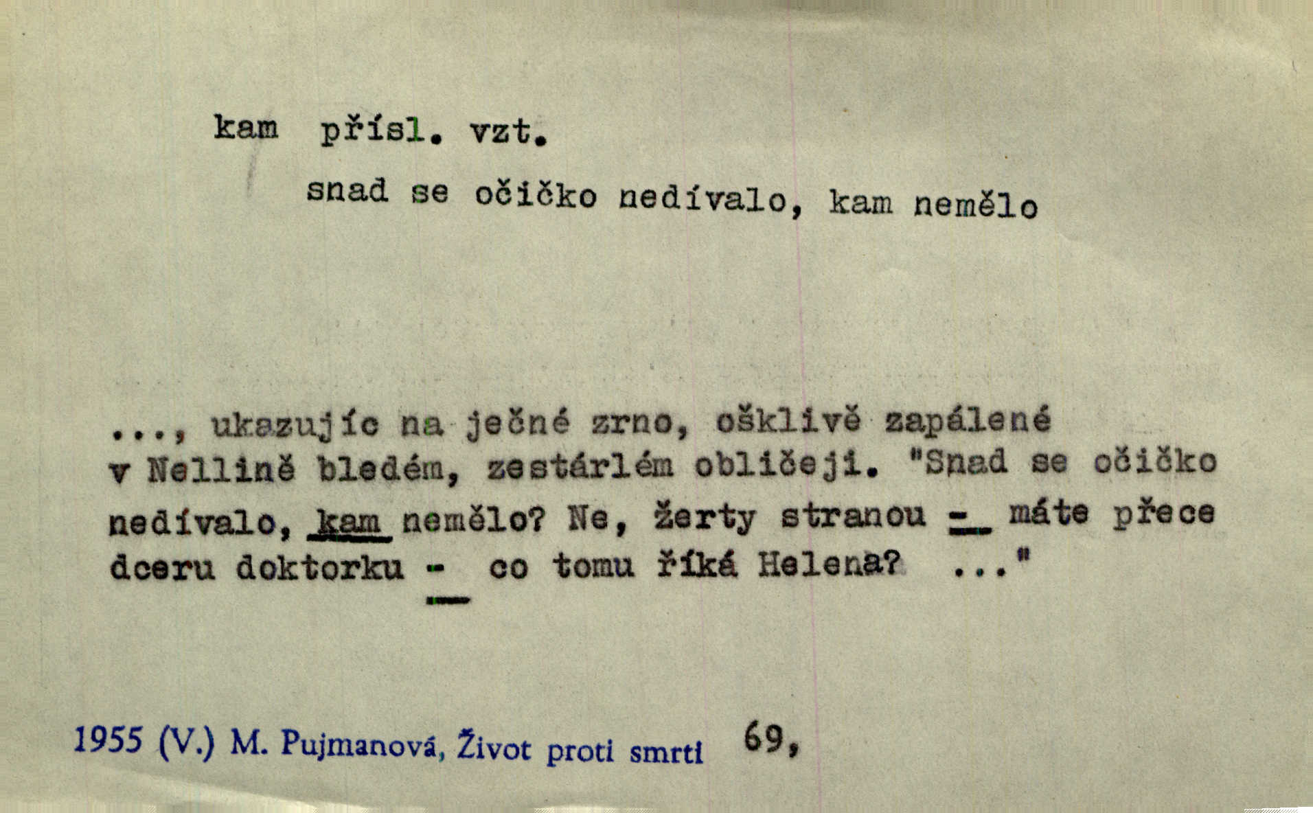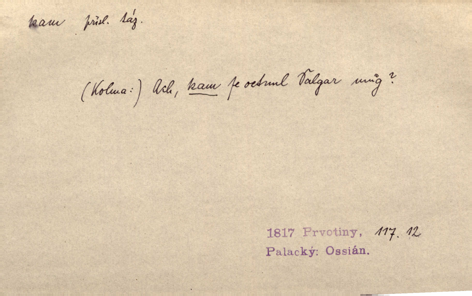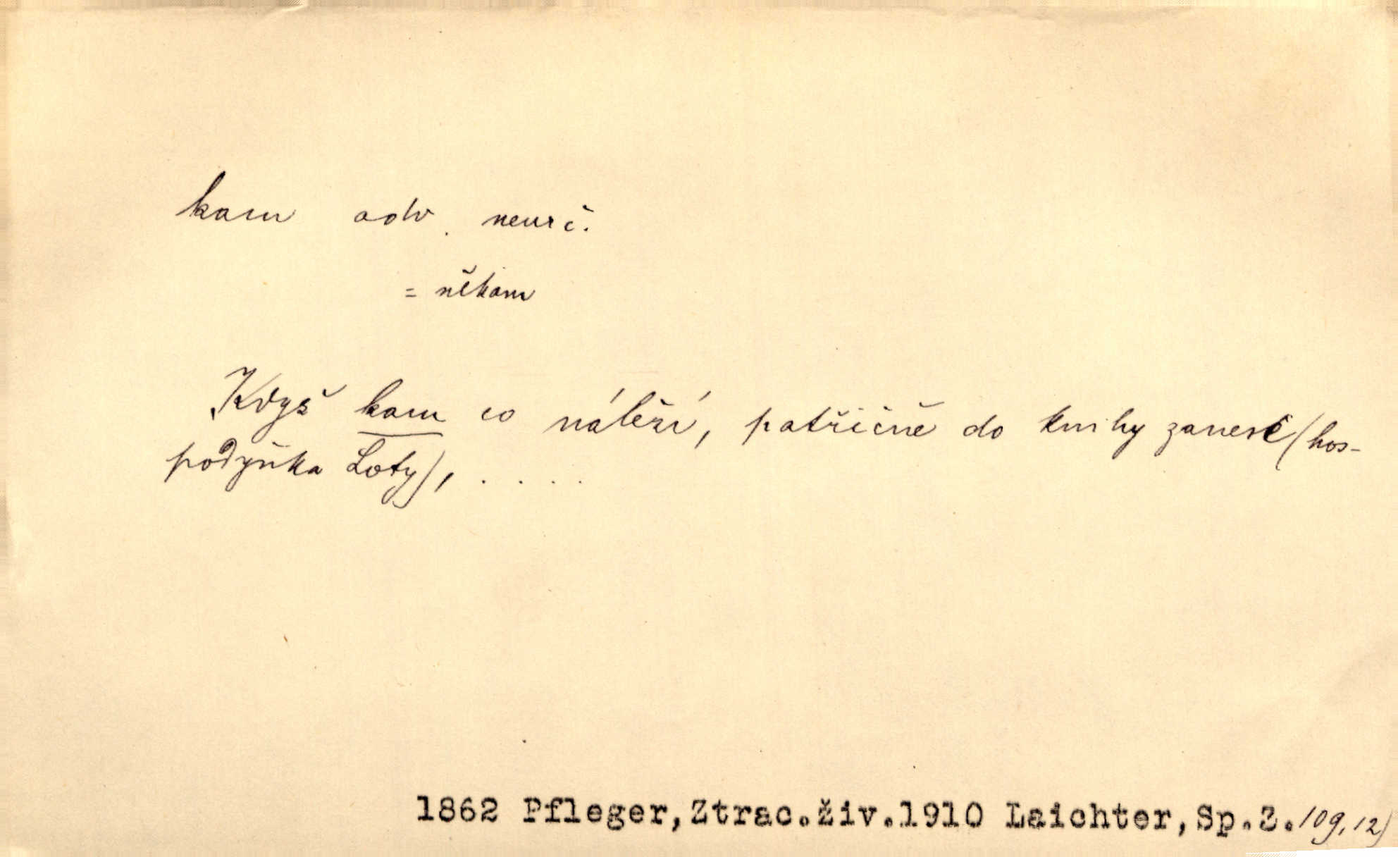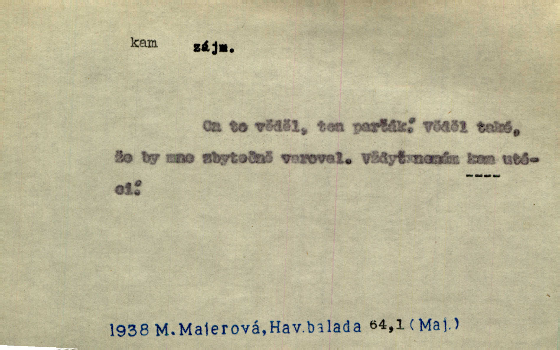 - kam (arch. a bás. kamo) zájm. adv. táz. uvozuje otázku (přímou n. nepřímou), jíž se tážeme po cíli n. účelu. Ej, ej, Tkaničko, kam pospícháš? K Adličce-li? Jir. „Kam tak pozdě na modlení?“ táži se [poutnice]. Mácha. Kampak — kampak — snad ne za nevěstou? Rais. Čisté to hospodářství! Kam jinam vésti může, než do propasti? Bozd. Prorve si hrázi obrovský kolos — jak, kdo a kamo? Mach. Nebuď bloud… snad nemyslíš… i toto, škrábe se za uchem ponocný. „Kam pak s tou flintou!“ co tě to napadá. Staš. Kam to jen myslíš, muži? — Co to máš za nápady? Třeb. Táto, táto, kams dal rozum! Jir. Kam pak s praženou [kávou]! Ta by nám pěkně vyčichla — jsme jen dvě. Herrm. Něco takového [jako je básník X.] jsme opravdu neměli. Kampak Čelakovský — takový hlupák! Mach. Kam by se dělo! není divu. Jir. Kampak mi stačí to bídné diurnum! Mám co dělat, abych zachoval „finanční rovnováhu“. Herrm. [Slepá táboritka k hochovi:] Rci, kam boj se schýlil? Čech. Jarní sny z mé duše bůh ví kam mizejí kamsi do neznáma. Vrch. Však my také víme, kam pěnkava nosem sedá nejsme hloupí. Šmil. Tak byla pomatena v tu chvíli, že nevěděla kam s očima, kam s rukama, kam s celým tělem. V. Mrš. Peníze se mu hromadily, že nevěděl, kam s nimi. Něm. Na večer nevěděl [švec] s rukou kam, tak ho bolela od samého bití. Rad. Pro okamžik nevěděl kam s řečí. Mlčel. Šmil. Nevím, kam dřív s grošem co dříve koupit, platit. Baar. Aha! nyní vím, kam bijete! kam svou řečí míříte. Sab. Mlynář se zapálil, nevěda s odpovědí kudy kam co odpověděti. Svět. Je mně jako bleše v koudeli. Nevím, kudy kam. Jir. D zájm. adv. vztaž. vyjadřuje cílový vztah své věty. Šel, kam jej nohy nesly nazdařbůh. Šmil. Půjde, kam oči povedou. Pal. Kam vítr, tam plášť. Pořek. Volně jako boží dech, který vane, kam chce, Zey. Je to stará zahrada, kam nevkročí nikdo. Kar. [Mluvilo se o tom] u rady Napila, kam chodívám v sobotu na oběd. Šim. Nad jícnem lidstvo zastav, kamo pádí. Vrch. [V pokoji] si nebylo kam sednout. Prav. [Učitel] si položí dítě přes koleno, a kam řeže, tam řeže bije nehledě na to kam. Něm. Studenti rozprášili se kam který na všecky strany. Kosm. D zájm. adv. neurč. někam. Kdo chce kam, pomozme mu tam. Přísl. V létě, když kam jdou, hodí [horalé] přes ramena kabanicu. Něm. Málo kam [paní] vycházela, sedala ustavičně u svého děcka. Jir. D zájm. adv. neurč. vztaž. kamkoli. Kam přišel, všudy byl Jakub jako doma. Prav. Květný koberec, kam noha vkročí. Čech. D Ať se takový člověk obrátí kam obrátí, cop má vždycky vzadu. Praž. pos. Dopadaly [hole] jako cepy do zralého obilí, uhoď kam uhoď. Maj. V. t. kamž.