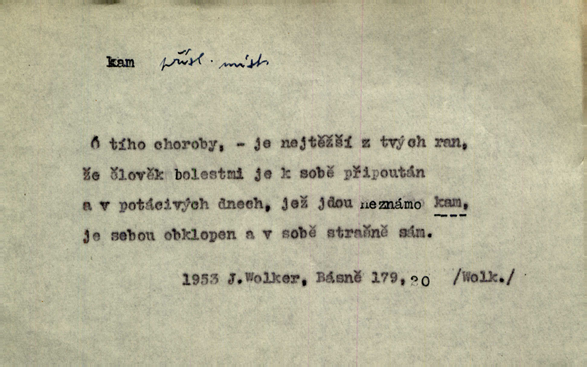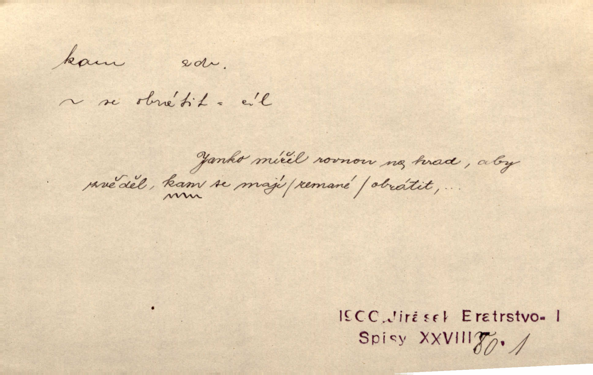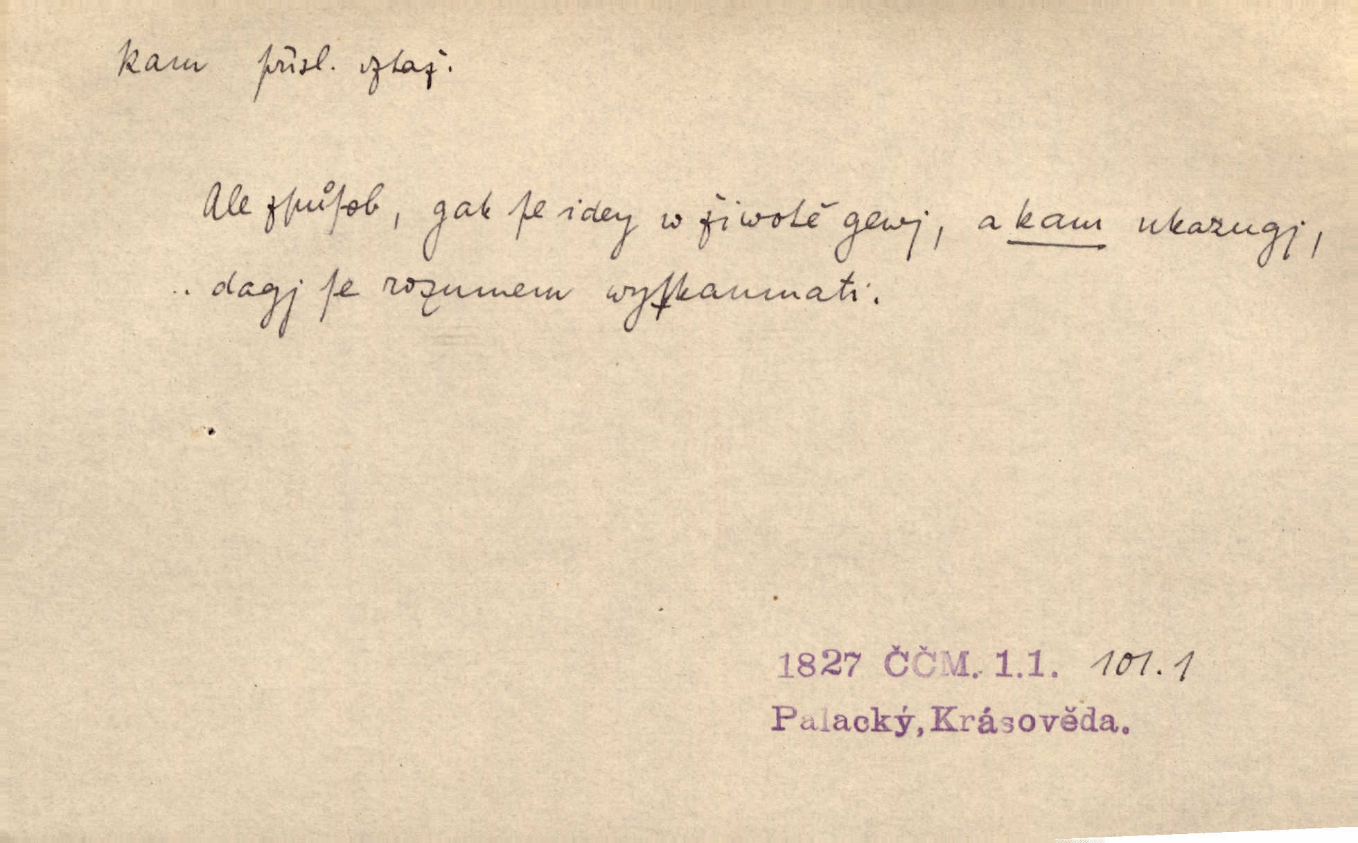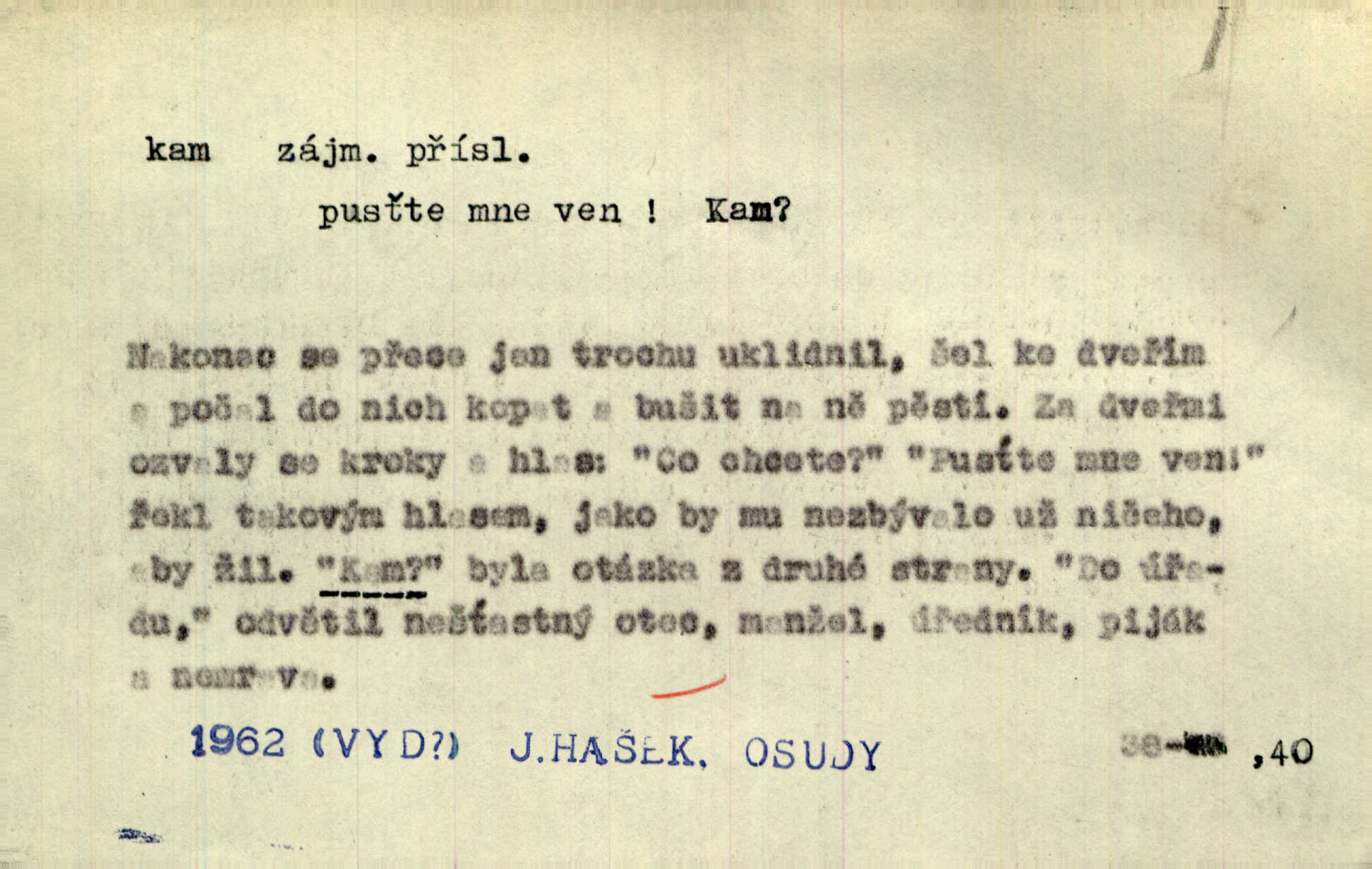 - kam (arch. a bás. kamo) zájm. adv. táz. uvozuje otázku (přímou n. nepřímou), jíž se tážeme po cíli n. účelu. Ej, ej, Tkaničko, kam pospícháš? K Adličce-li? Jir. „Kam tak pozdě na modlení?“ táži se [poutnice]. Mácha. Kampak — kampak — snad ne za nevěstou? Rais. Čisté to hospodářství! Kam jinam vésti může, než do propasti? Bozd. Prorve si hrázi obrovský kolos — jak, kdo a kamo? Mach. Nebuď bloud… snad nemyslíš… i toto, škrábe se za uchem ponocný. „Kam pak s tou flintou!“ co tě to napadá. Staš. Kam to jen myslíš, muži? — Co to máš za nápady? Třeb. Táto, táto, kams dal rozum! Jir. Kam pak s praženou [kávou]! Ta by nám pěkně vyčichla — jsme jen dvě. Herrm. Něco takového [jako je básník X.] jsme opravdu neměli. Kampak Čelakovský — takový hlupák! Mach. Kam by se dělo! není divu. Jir. Kampak mi stačí to bídné diurnum! Mám co dělat, abych zachoval „finanční rovnováhu“. Herrm. [Slepá táboritka k hochovi:] Rci, kam boj se schýlil? Čech. Jarní sny z mé duše bůh ví kam mizejí kamsi do neznáma. Vrch. Však my také víme, kam pěnkava nosem sedá nejsme hloupí. Šmil. Tak byla pomatena v tu chvíli, že nevěděla kam s očima, kam s rukama, kam s celým tělem. V. Mrš. Peníze se mu hromadily, že nevěděl, kam s nimi. Něm. Na večer nevěděl [švec] s rukou kam, tak ho bolela od samého bití. Rad. Pro okamžik nevěděl kam s řečí. Mlčel. Šmil. Nevím, kam dřív s grošem co dříve koupit, platit. Baar. Aha! nyní vím, kam bijete! kam svou řečí míříte. Sab. Mlynář se zapálil, nevěda s odpovědí kudy kam co odpověděti. Svět. Je mně jako bleše v koudeli. Nevím, kudy kam. Jir. D zájm. adv. vztaž. vyjadřuje cílový vztah své věty. Šel, kam jej nohy nesly nazdařbůh. Šmil. Půjde, kam oči povedou. Pal. Kam vítr, tam plášť. Pořek. Volně jako boží dech, který vane, kam chce, Zey. Je to stará zahrada, kam nevkročí nikdo. Kar. [Mluvilo se o tom] u rady Napila, kam chodívám v sobotu na oběd. Šim. Nad jícnem lidstvo zastav, kamo pádí. Vrch. [V pokoji] si nebylo kam sednout. Prav. [Učitel] si položí dítě přes koleno, a kam řeže, tam řeže bije nehledě na to kam. Něm. Studenti rozprášili se kam který na všecky strany. Kosm. D zájm. adv. neurč. někam. Kdo chce kam, pomozme mu tam. Přísl. V létě, když kam jdou, hodí [horalé] přes ramena kabanicu. Něm. Málo kam [paní] vycházela, sedala ustavičně u svého děcka. Jir. D zájm. adv. neurč. vztaž. kamkoli. Kam přišel, všudy byl Jakub jako doma. Prav. Květný koberec, kam noha vkročí. Čech. D Ať se takový člověk obrátí kam obrátí, cop má vždycky vzadu. Praž. pos. Dopadaly [hole] jako cepy do zralého obilí, uhoď kam uhoď. Maj. V. t. kamž.