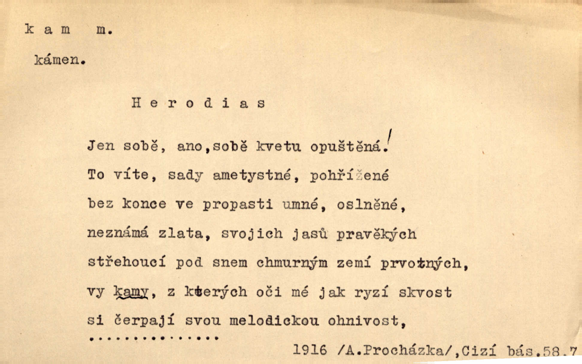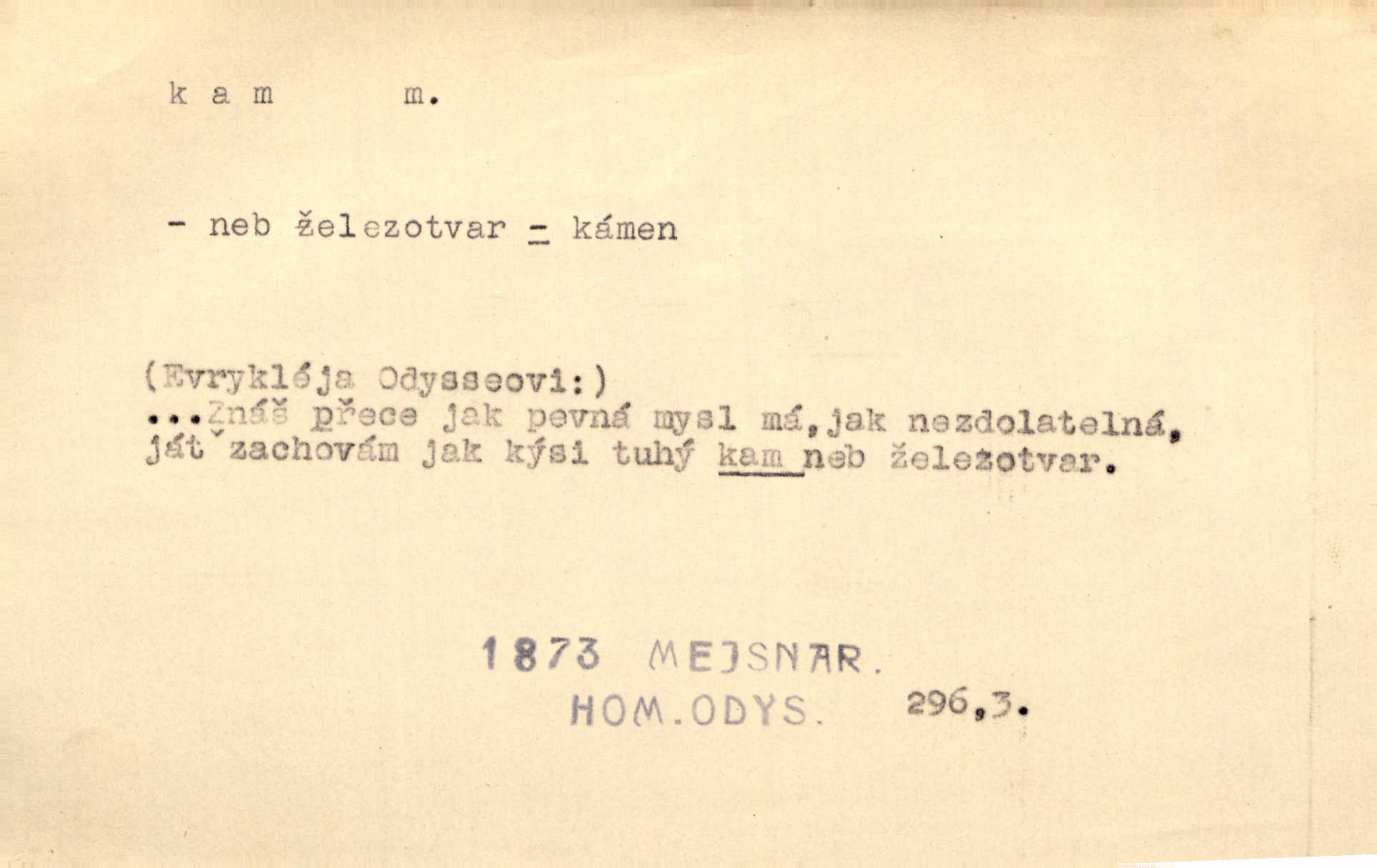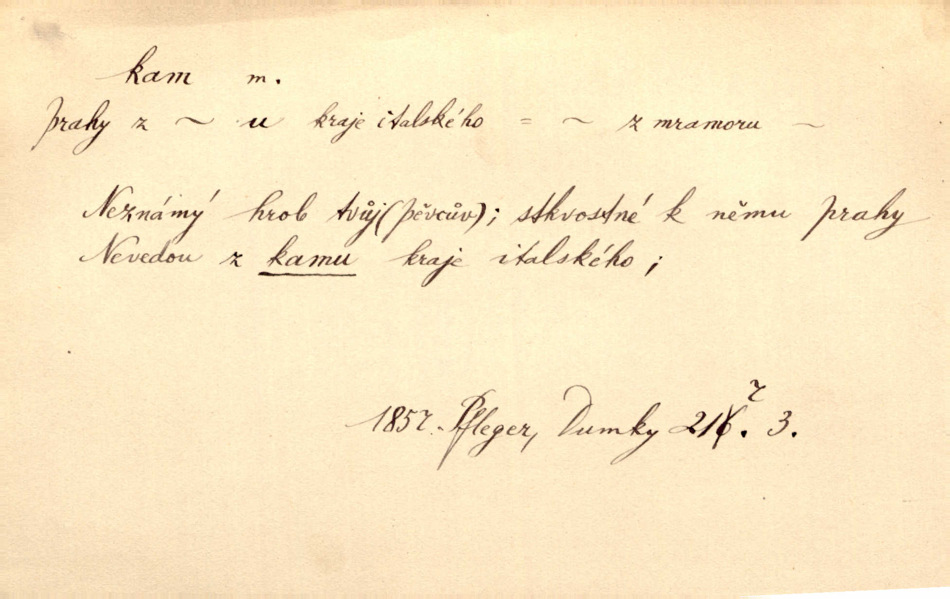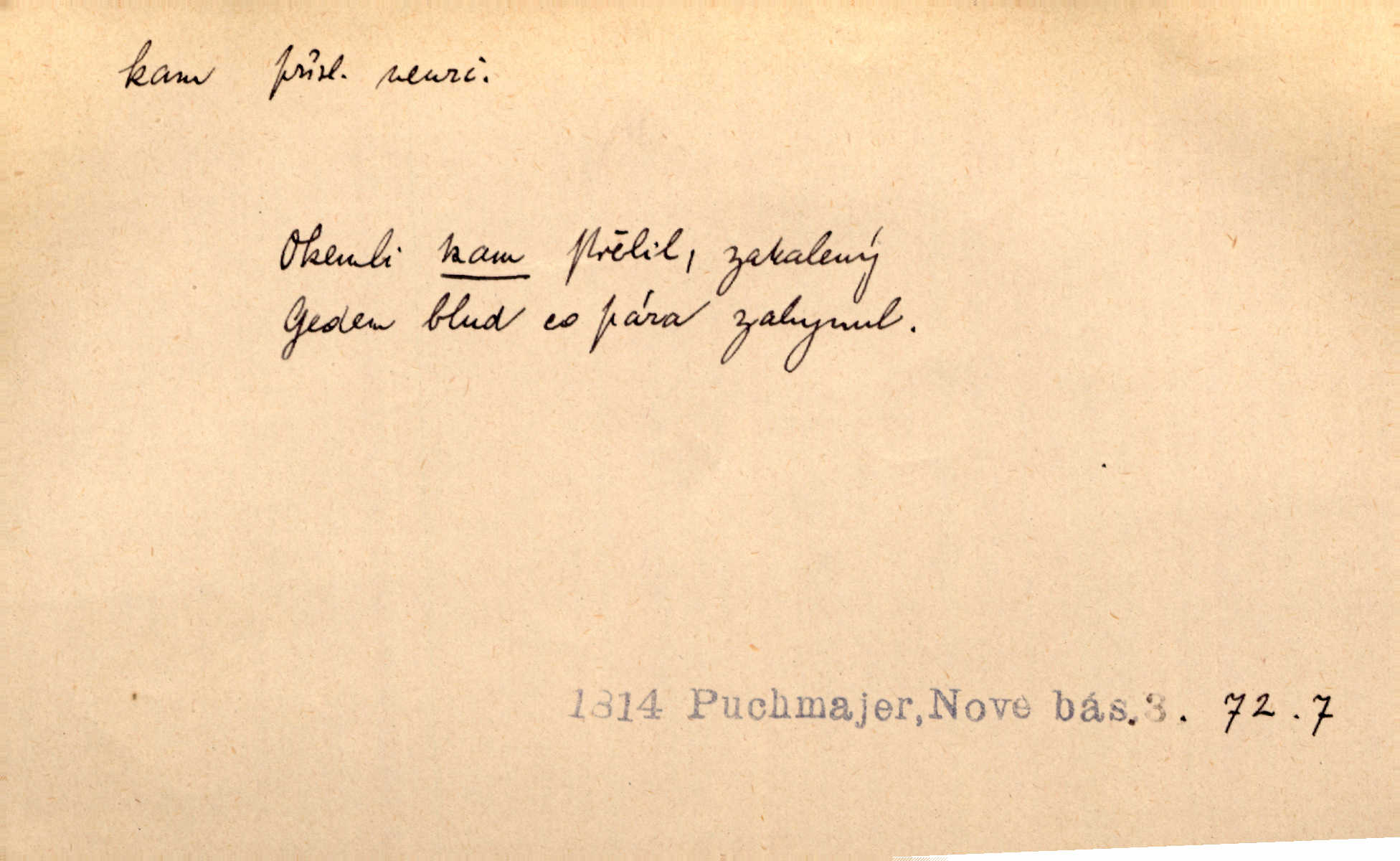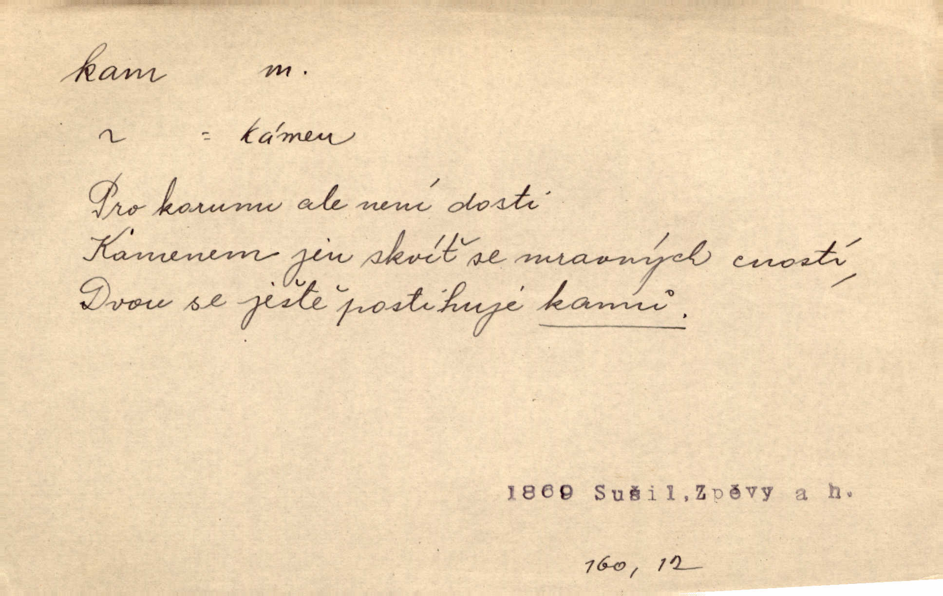 - kam, -u m. bás. kámen. [Hrob,] kde šedý kam a bujná tráva. Durd. Zlato, stříbro, perly, vzácné kamy ohněm sršící. Vrch.