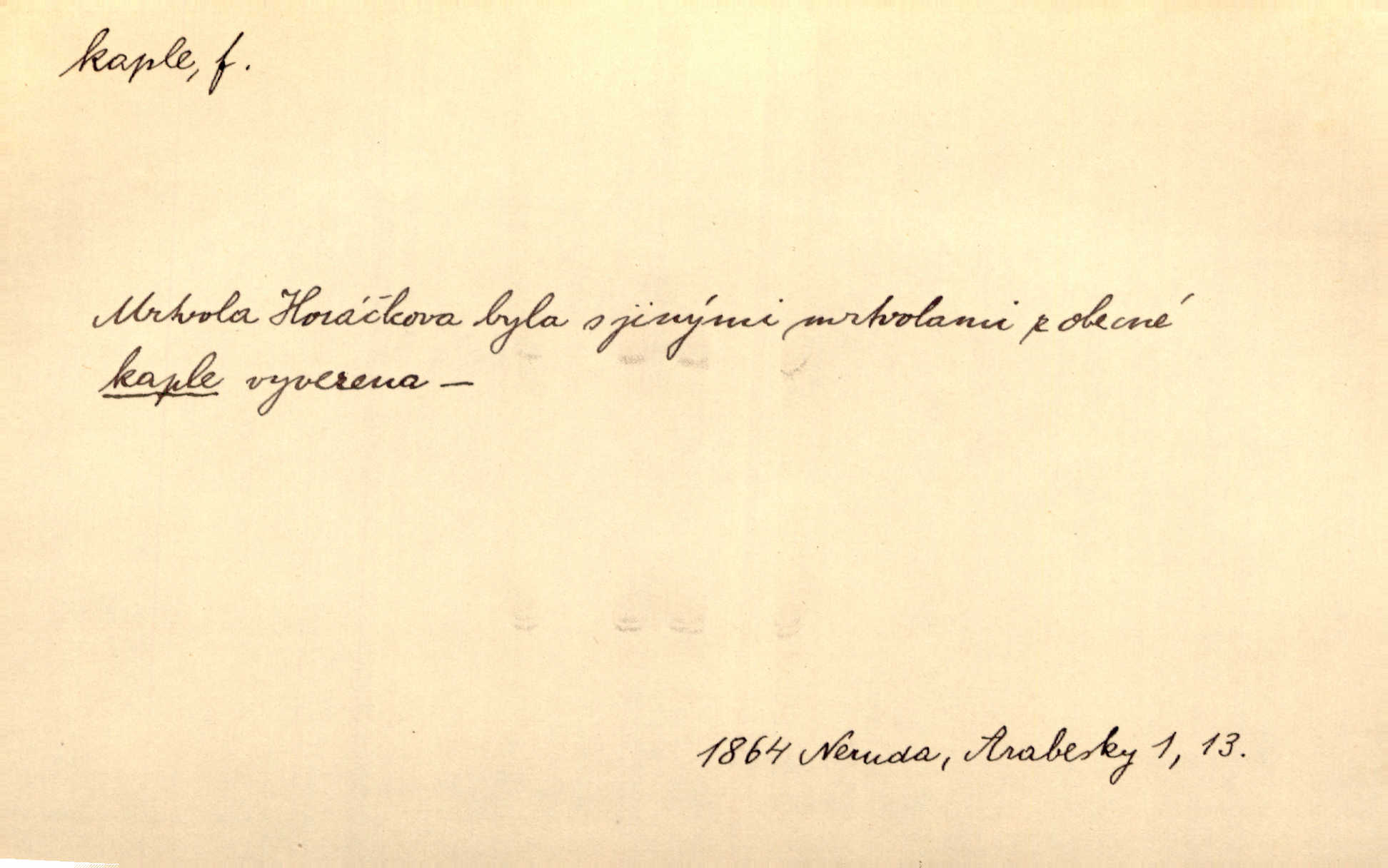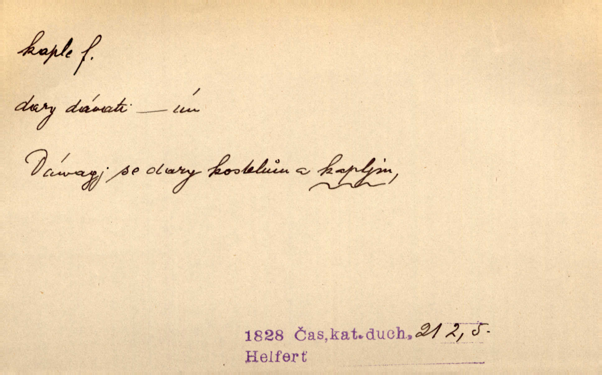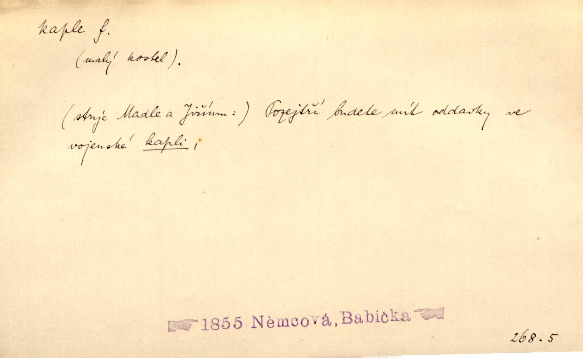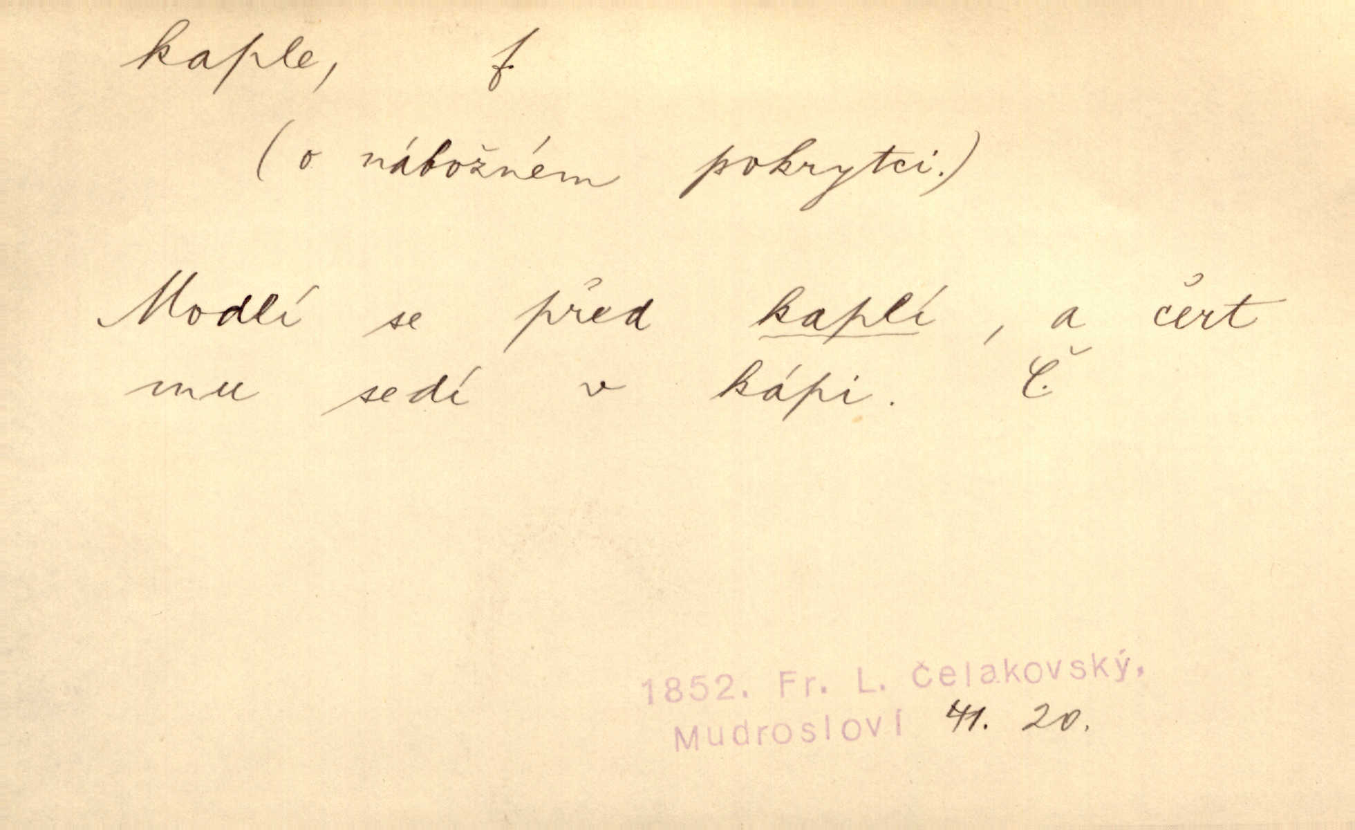 - kaple, -e f. malá svatyně; oddělená postranní část chrámu s oltářem. Hradní kaple. Jir. Zámecká kaple. Jir. Pozejtří budete mít oddavky ve vojenské kapli. Něm. Betlemská kaple v Praze. Kaple sv. Václava v chrámě svatovítském. Když lid do chrámu klášterského se sešel, klečela Maruše v osamělé stolici postranní kaple. Jir. Ten opat v nové kapli svého kostela dal vymalovati poslední soud. Pal. D Obuv. špička boty zvlášť našívaná. Laková kaple.