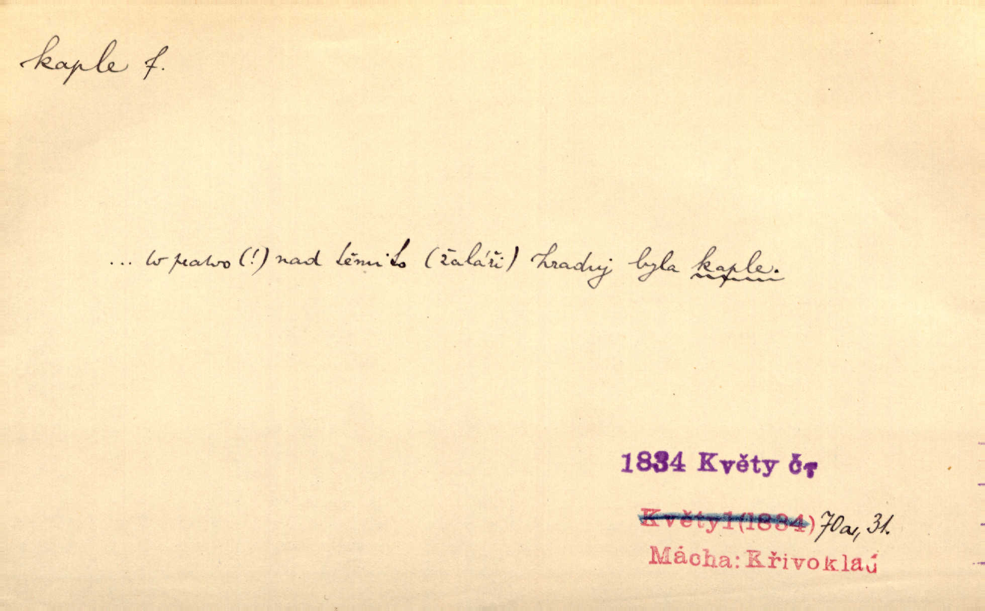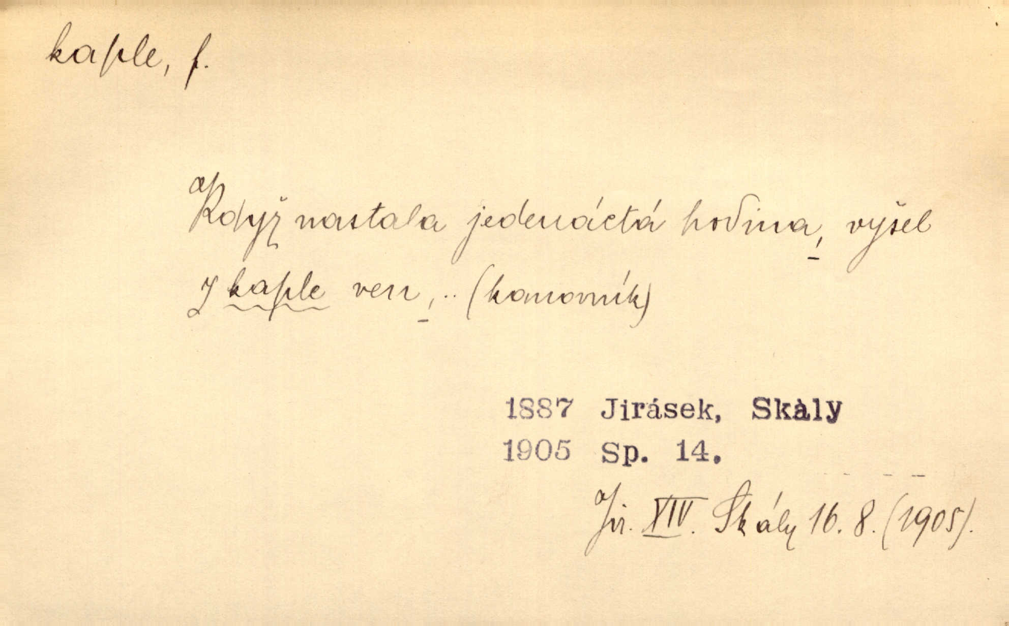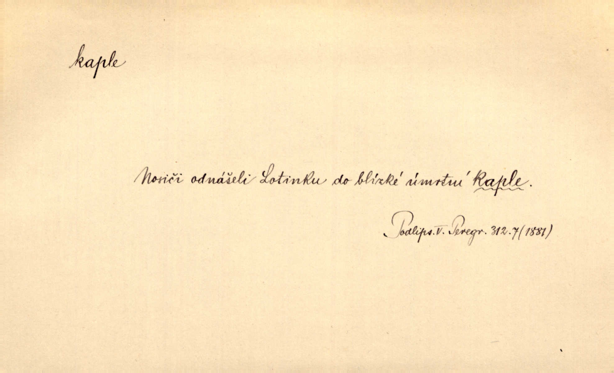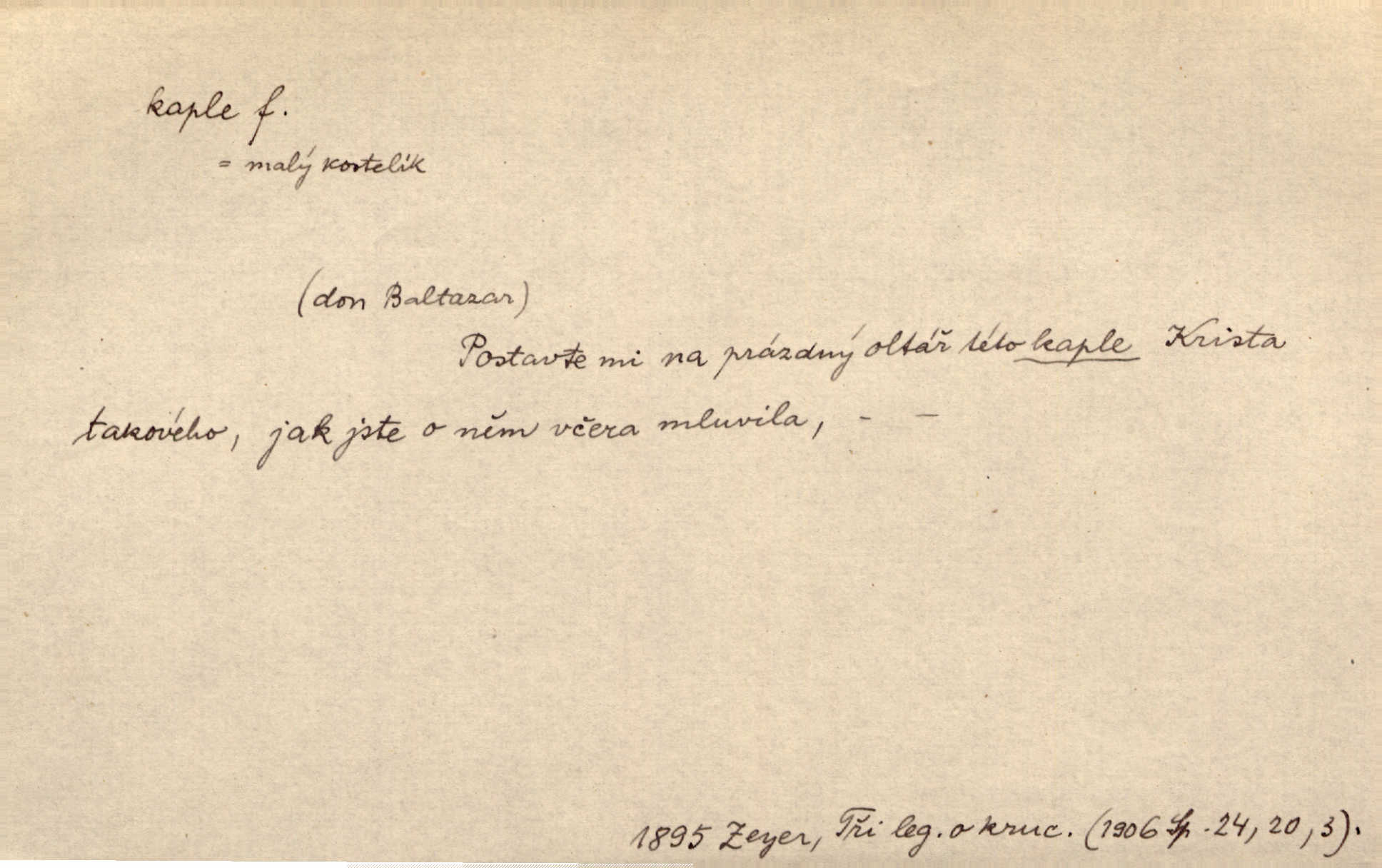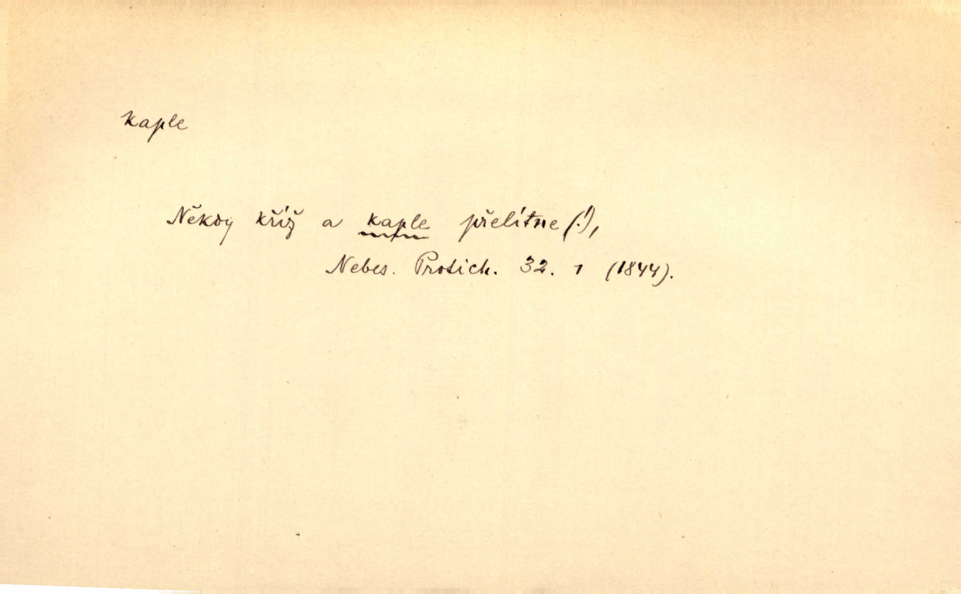 - kaple, -e f. malá svatyně; oddělená postranní část chrámu s oltářem. Hradní kaple. Jir. Zámecká kaple. Jir. Pozejtří budete mít oddavky ve vojenské kapli. Něm. Betlemská kaple v Praze. Kaple sv. Václava v chrámě svatovítském. Když lid do chrámu klášterského se sešel, klečela Maruše v osamělé stolici postranní kaple. Jir. Ten opat v nové kapli svého kostela dal vymalovati poslední soud. Pal. D Obuv. špička boty zvlášť našívaná. Laková kaple.