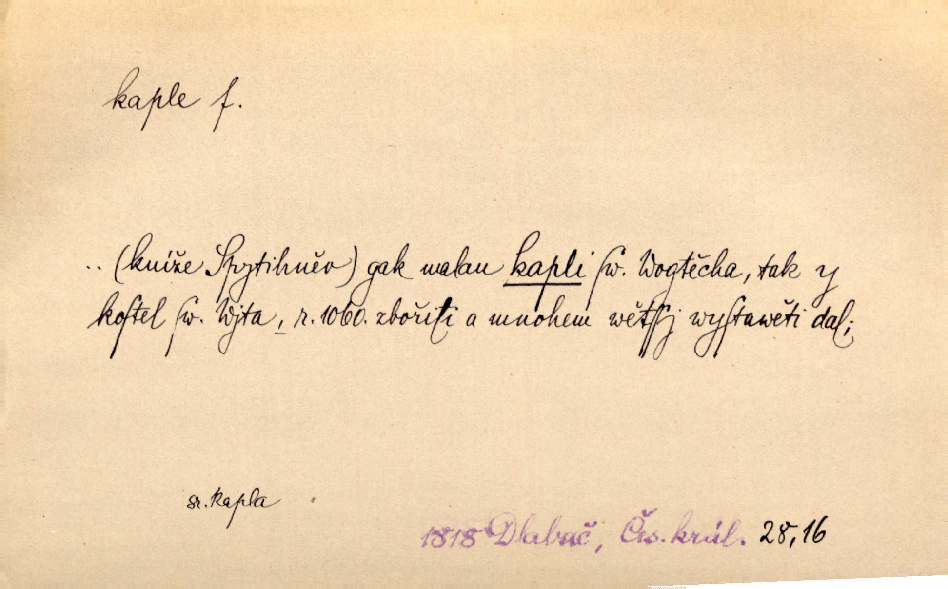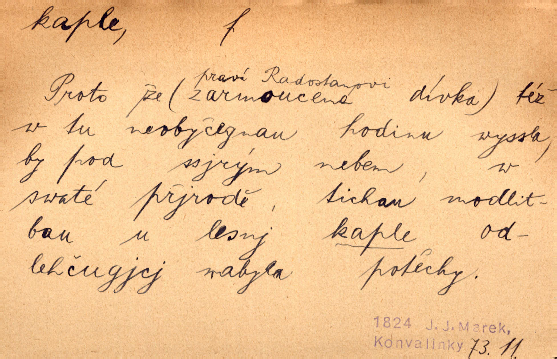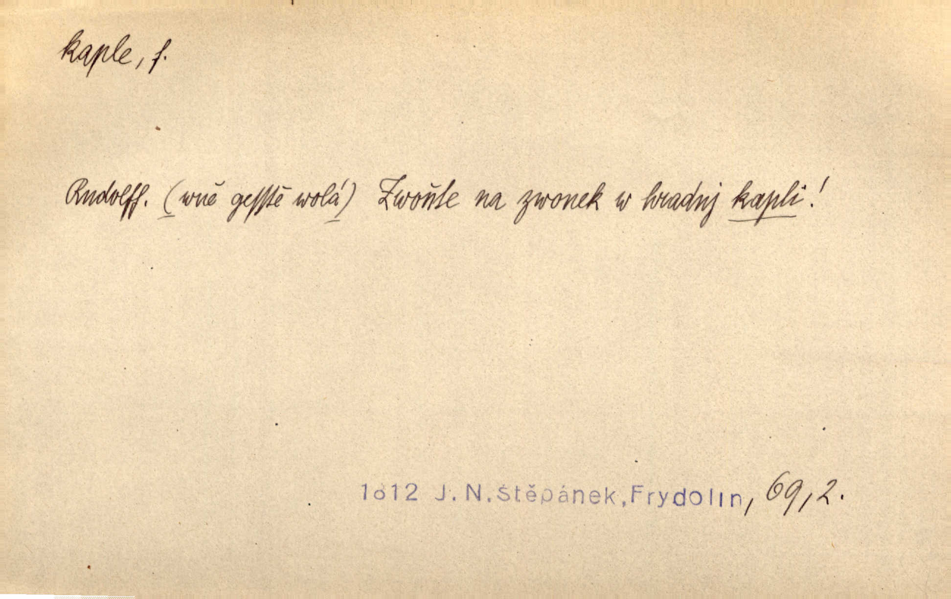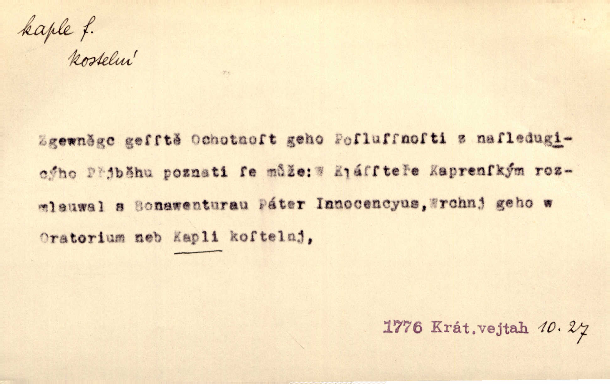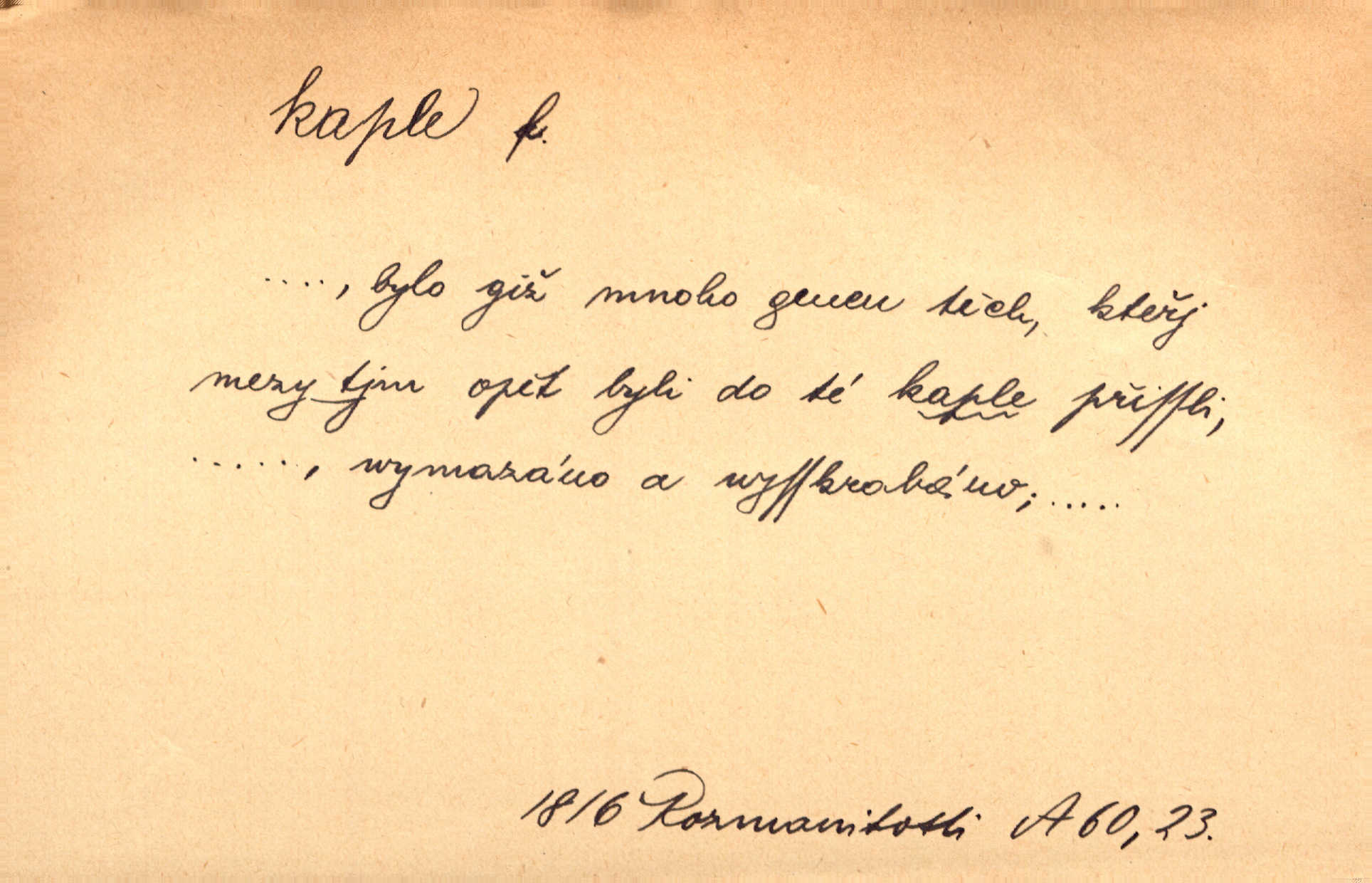 - kaple, -e f. malá svatyně; oddělená postranní část chrámu s oltářem. Hradní kaple. Jir. Zámecká kaple. Jir. Pozejtří budete mít oddavky ve vojenské kapli. Něm. Betlemská kaple v Praze. Kaple sv. Václava v chrámě svatovítském. Když lid do chrámu klášterského se sešel, klečela Maruše v osamělé stolici postranní kaple. Jir. Ten opat v nové kapli svého kostela dal vymalovati poslední soud. Pal. D Obuv. špička boty zvlášť našívaná. Laková kaple.