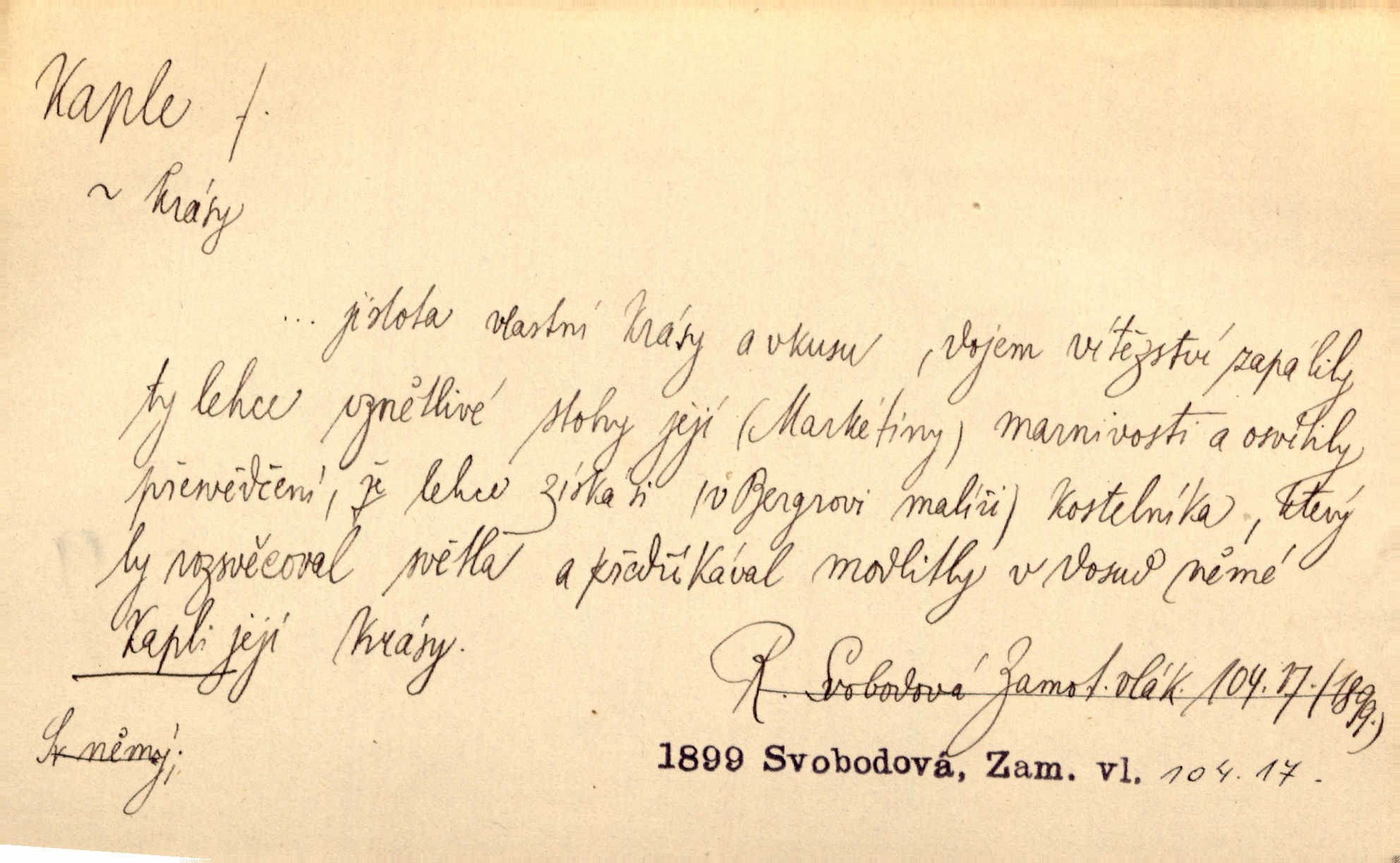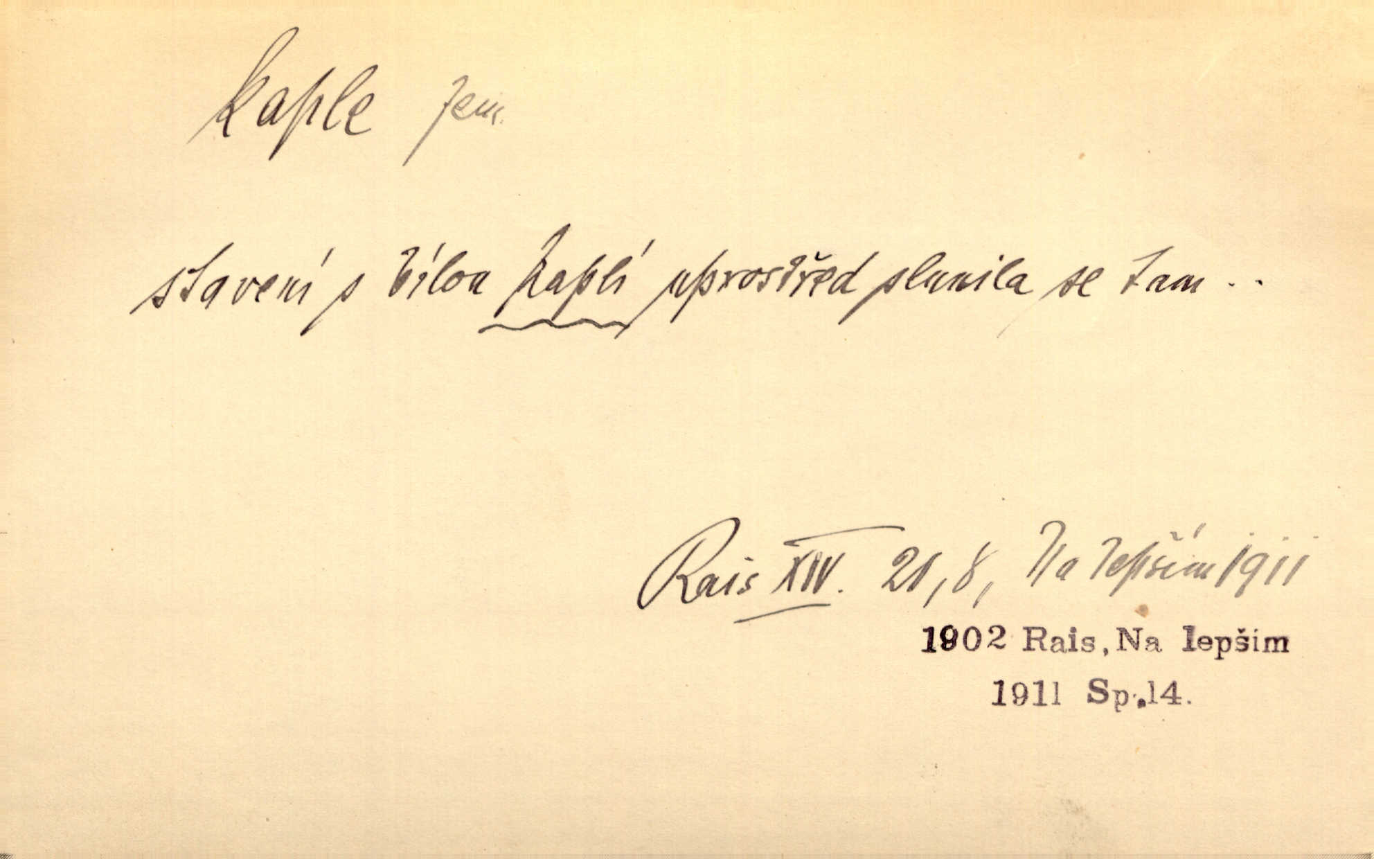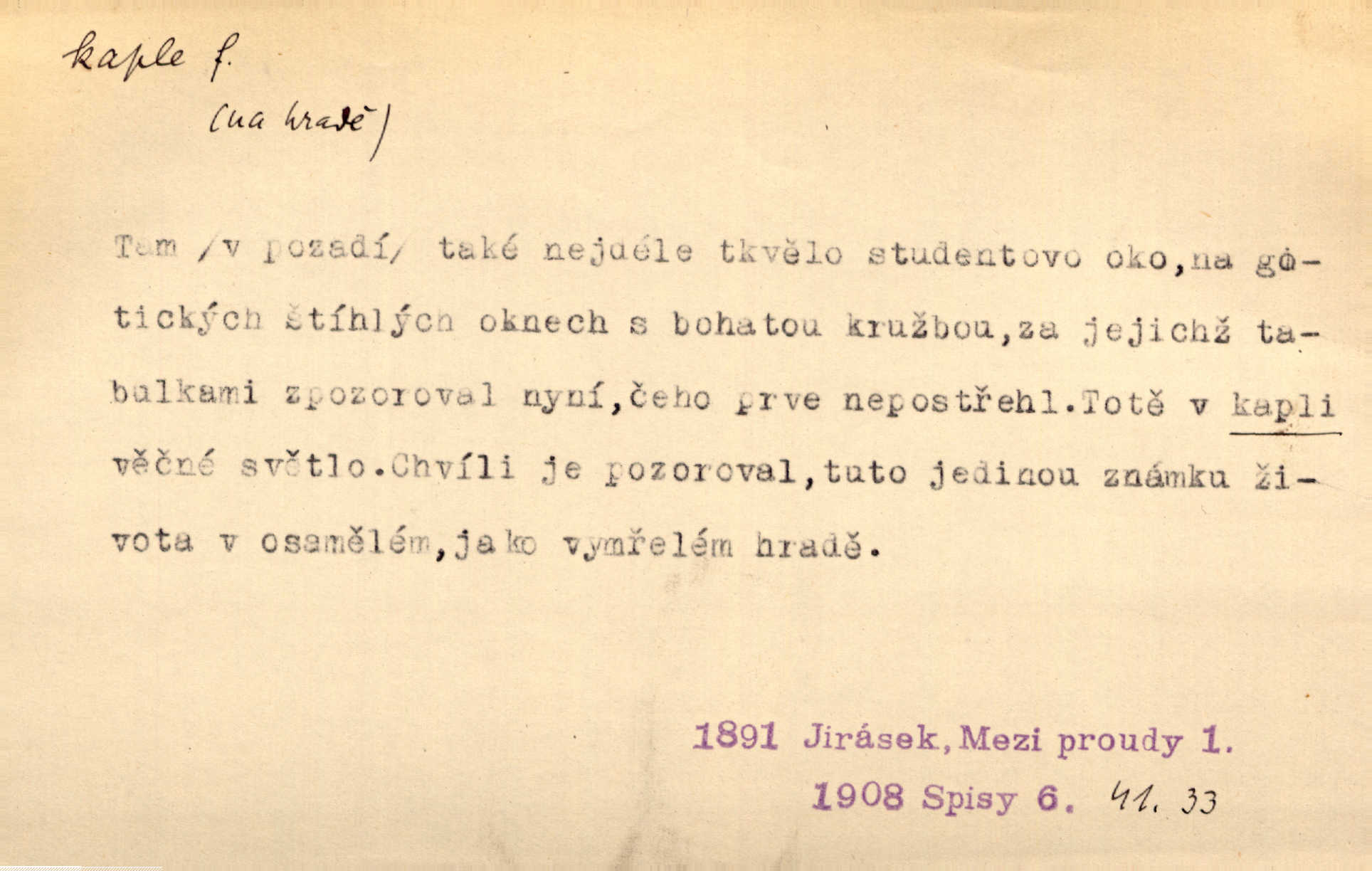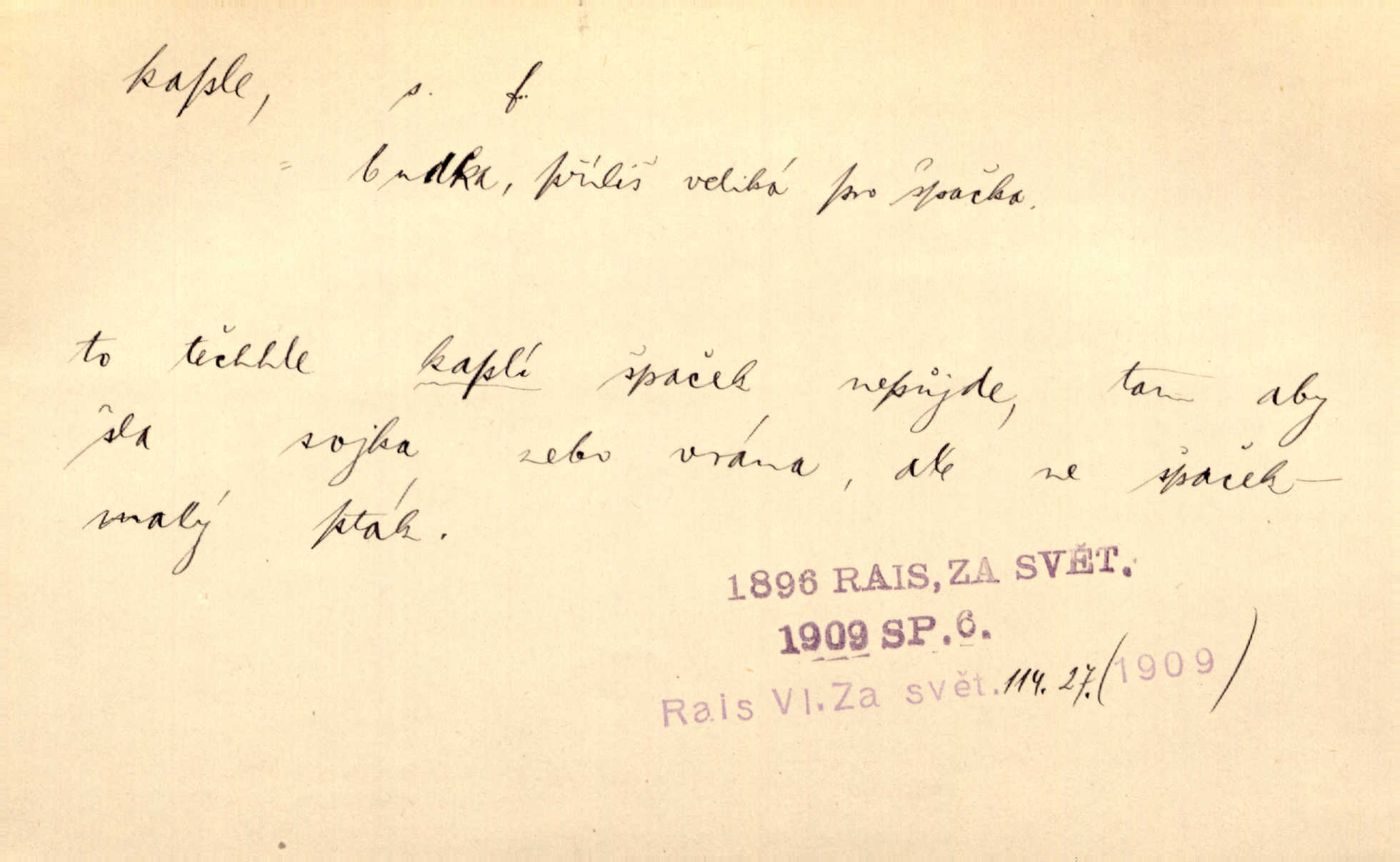 - kaple, -e f. malá svatyně; oddělená postranní část chrámu s oltářem. Hradní kaple. Jir. Zámecká kaple. Jir. Pozejtří budete mít oddavky ve vojenské kapli. Něm. Betlemská kaple v Praze. Kaple sv. Václava v chrámě svatovítském. Když lid do chrámu klášterského se sešel, klečela Maruše v osamělé stolici postranní kaple. Jir. Ten opat v nové kapli svého kostela dal vymalovati poslední soud. Pal. D Obuv. špička boty zvlášť našívaná. Laková kaple.