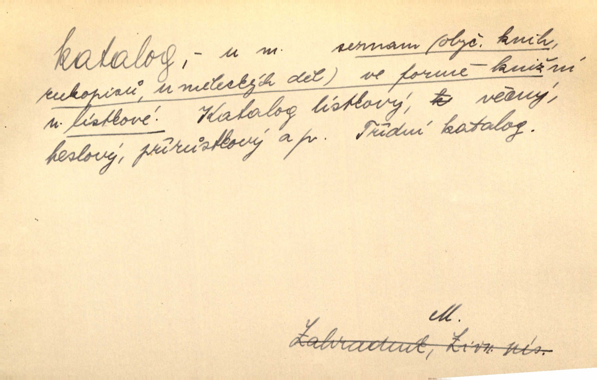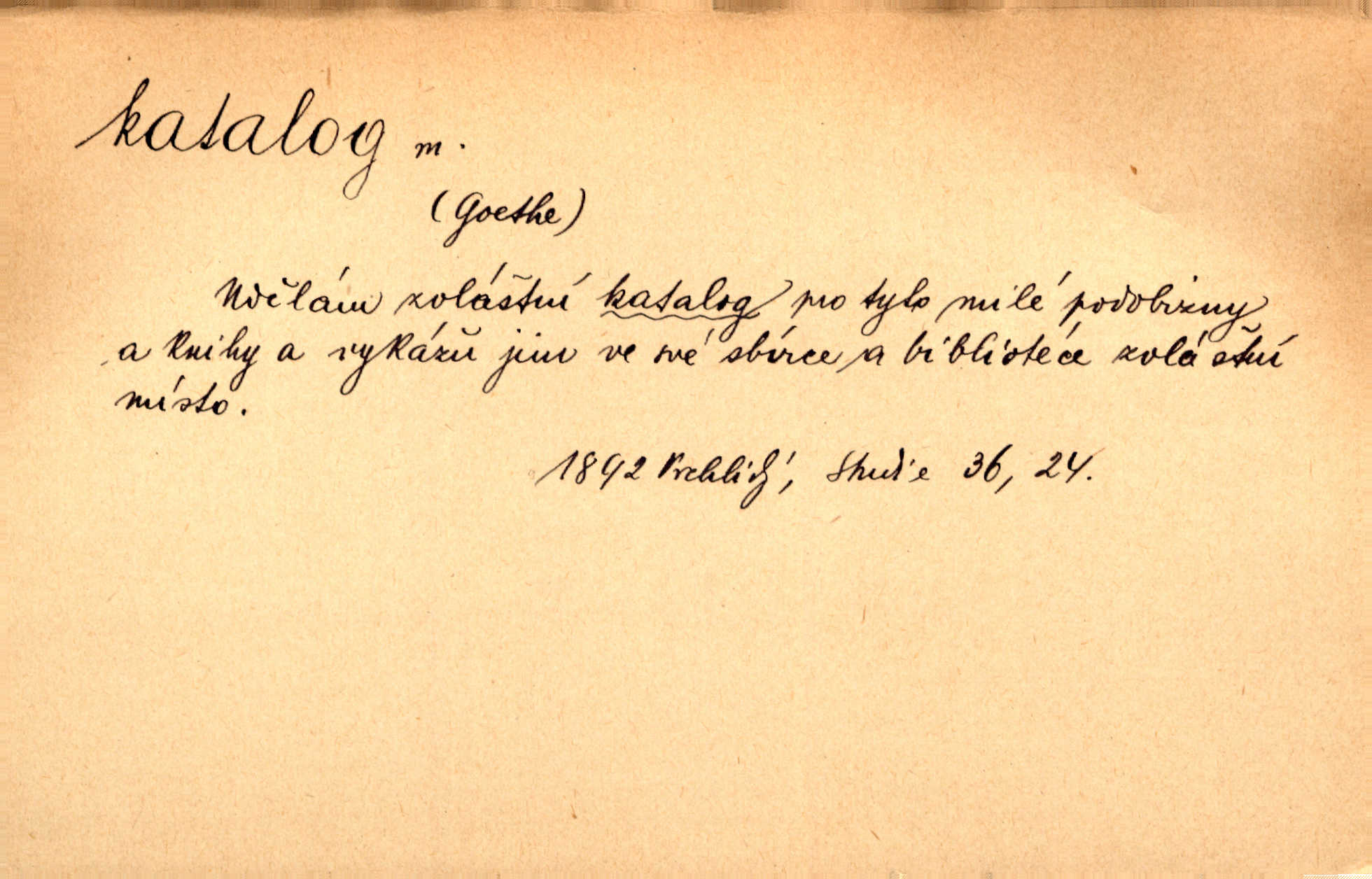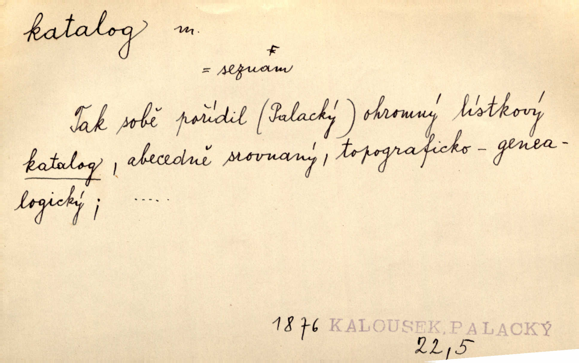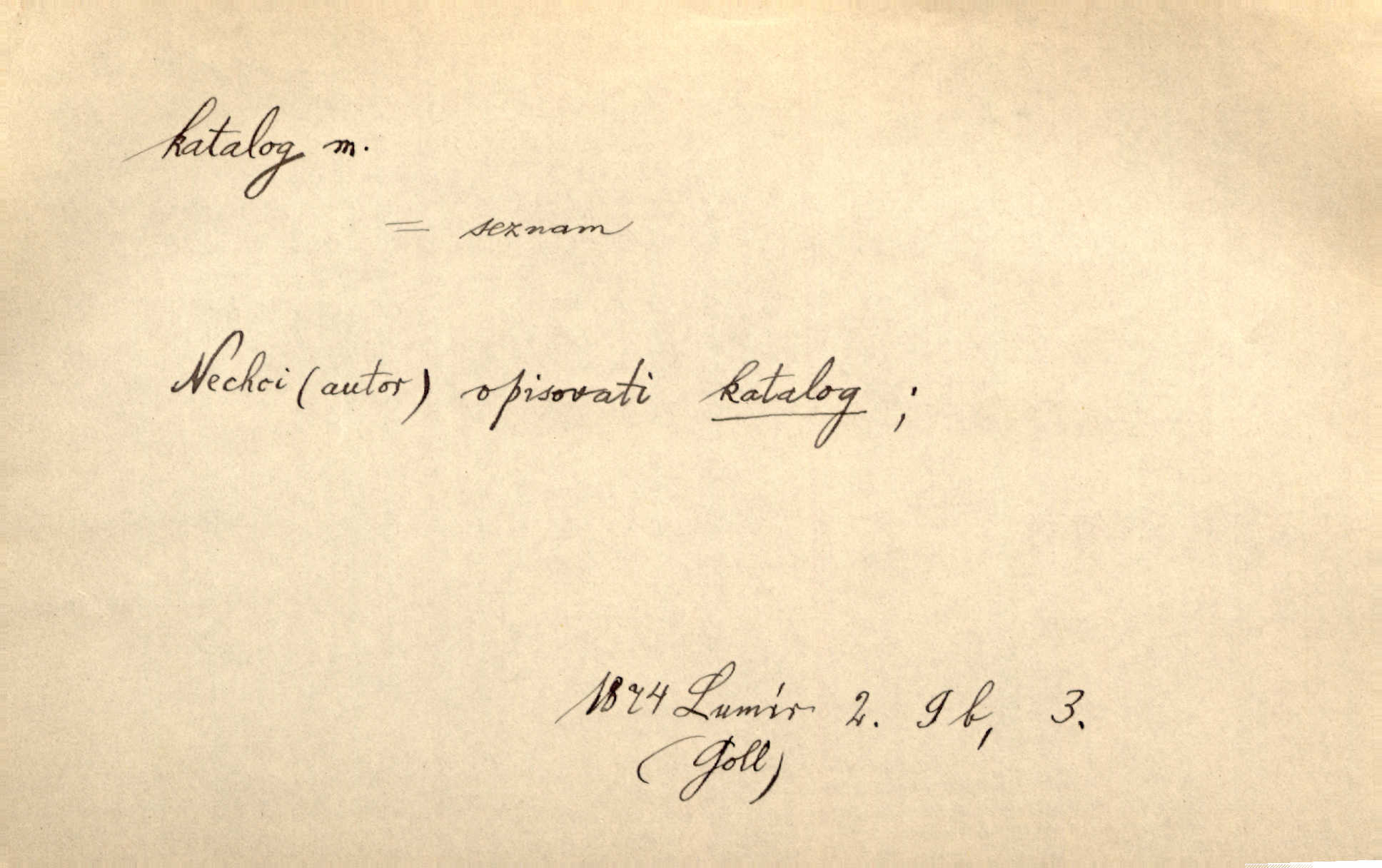 - katalog, -u m. seznam, soupis osob n. předmětů tvořících nějaký celek. Katalog knihovny (lístkový, věcný, heslový, přírůstkový). Katalog rukopisů knihovny musejní. Katalog musea, výstavy přehled vystavovaných předmětů. Tak sobě pořídil [Palacký] ohromný lístkový katalog, abecedně srovnaný, topograficko-genealogický. Kal. Škol. třídní katalog seznam žáků navštěvujících třídu se záznamem jejich prospěchu.