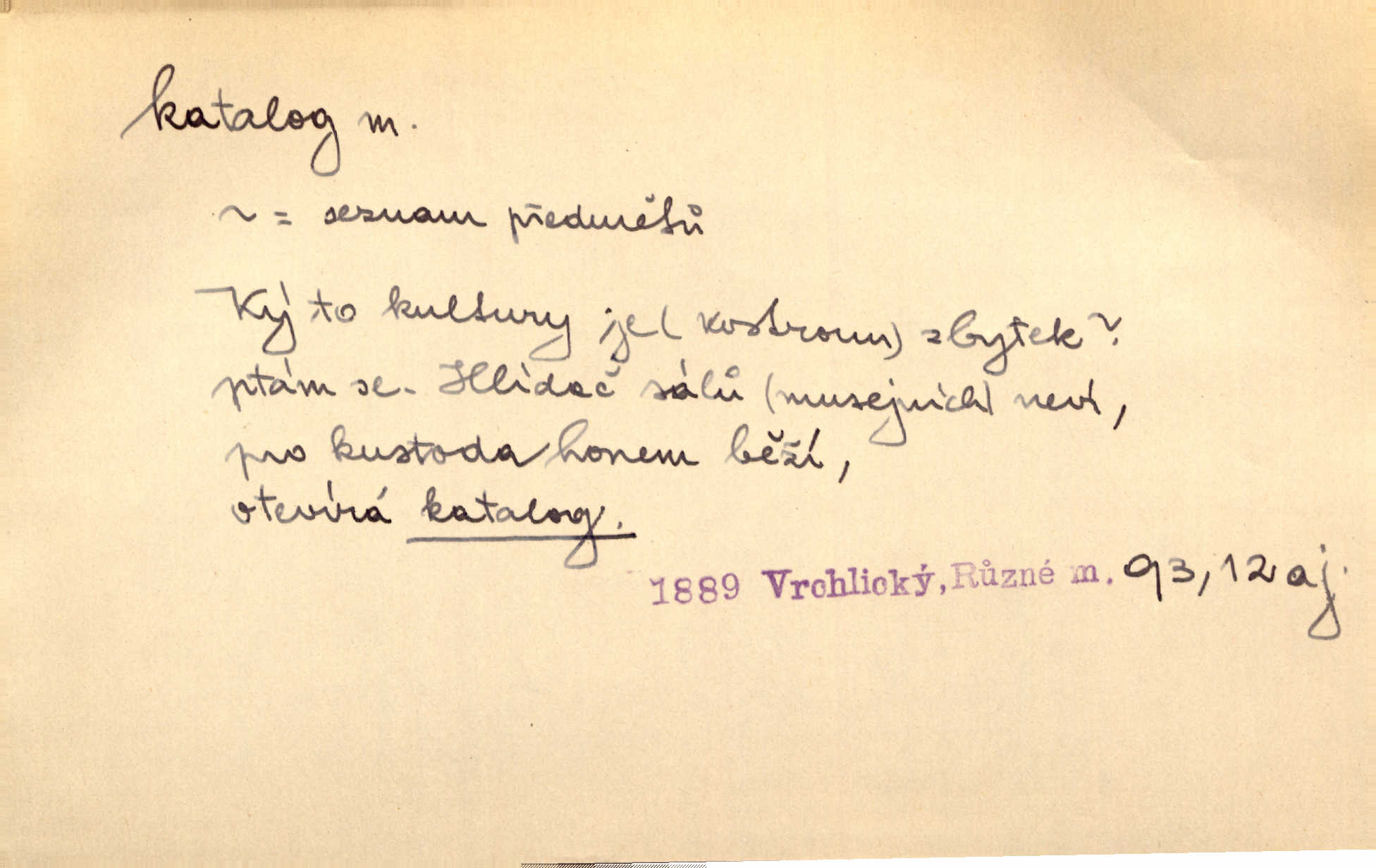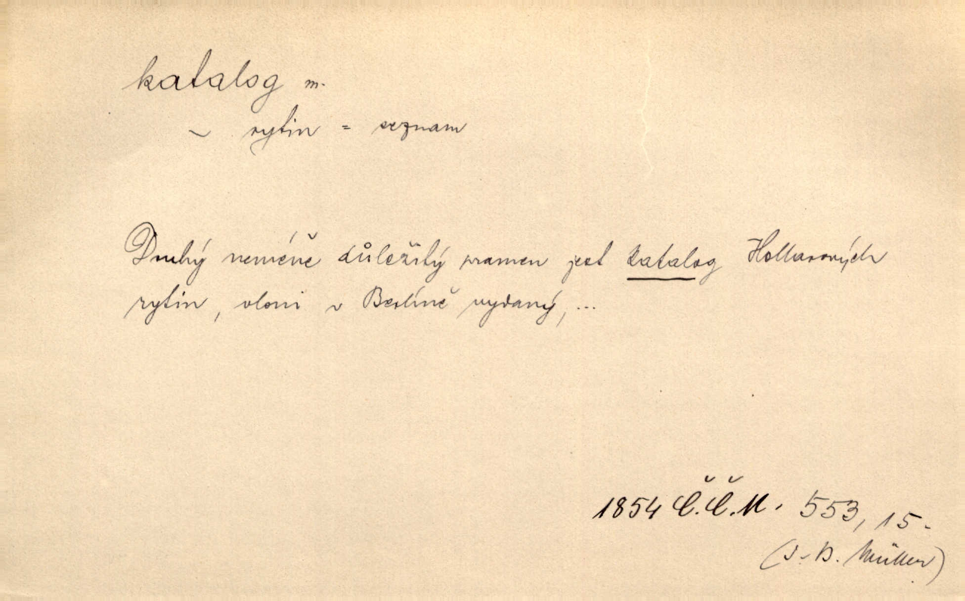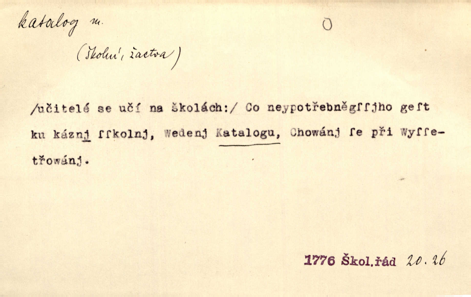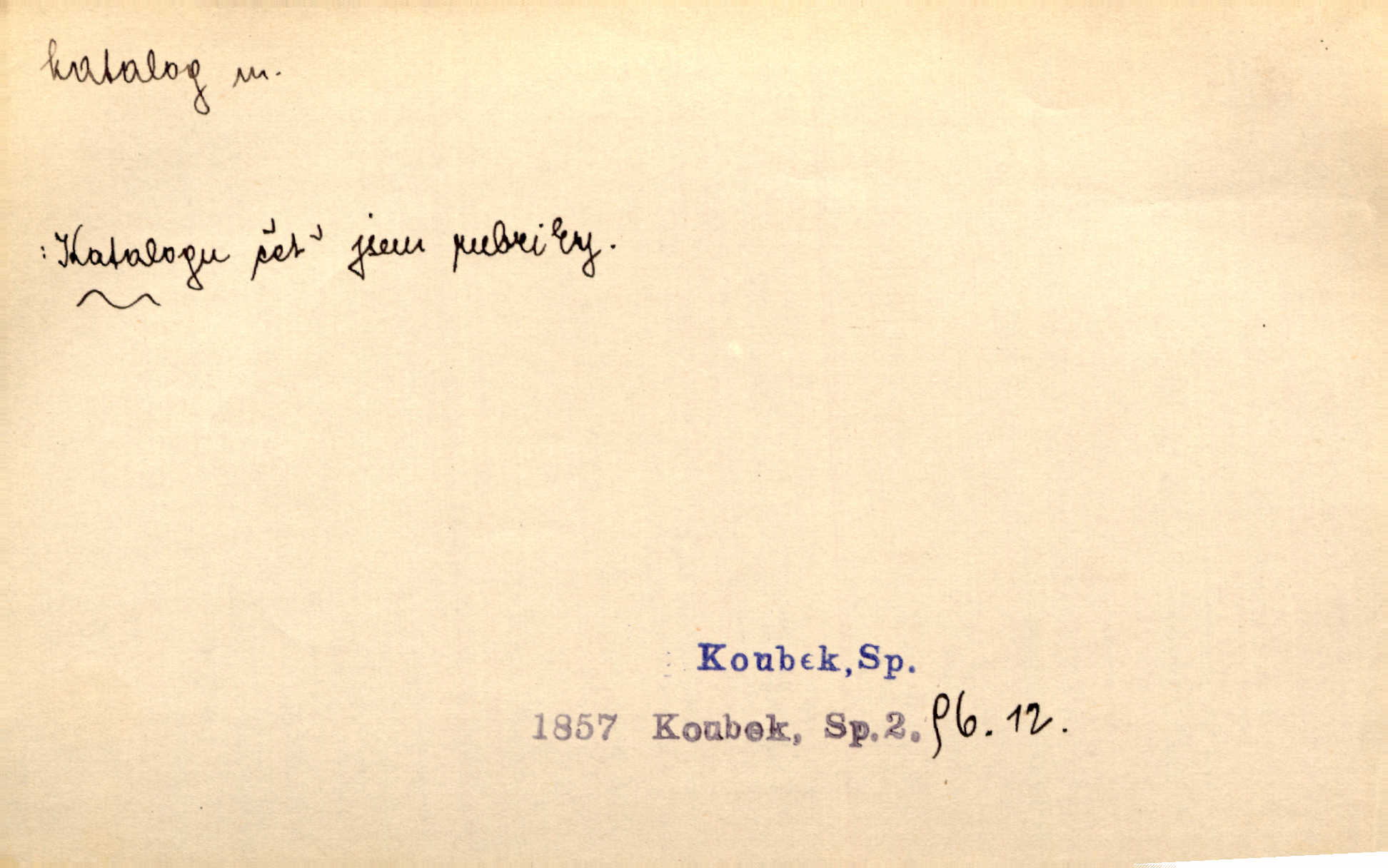 - katalog, -u m. seznam, soupis osob n. předmětů tvořících nějaký celek. Katalog knihovny (lístkový, věcný, heslový, přírůstkový). Katalog rukopisů knihovny musejní. Katalog musea, výstavy přehled vystavovaných předmětů. Tak sobě pořídil [Palacký] ohromný lístkový katalog, abecedně srovnaný, topograficko-genealogický. Kal. Škol. třídní katalog seznam žáků navštěvujících třídu se záznamem jejich prospěchu.