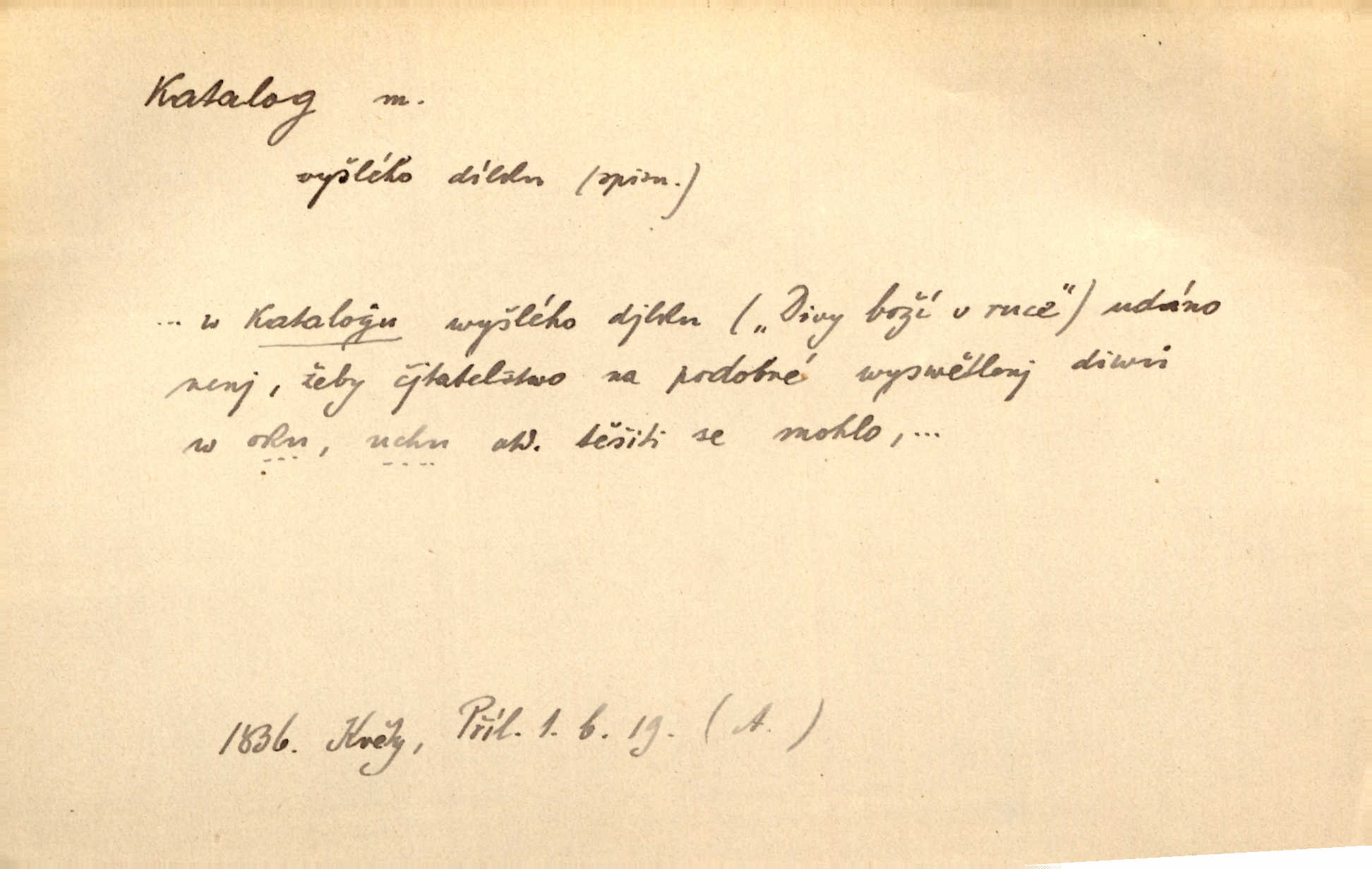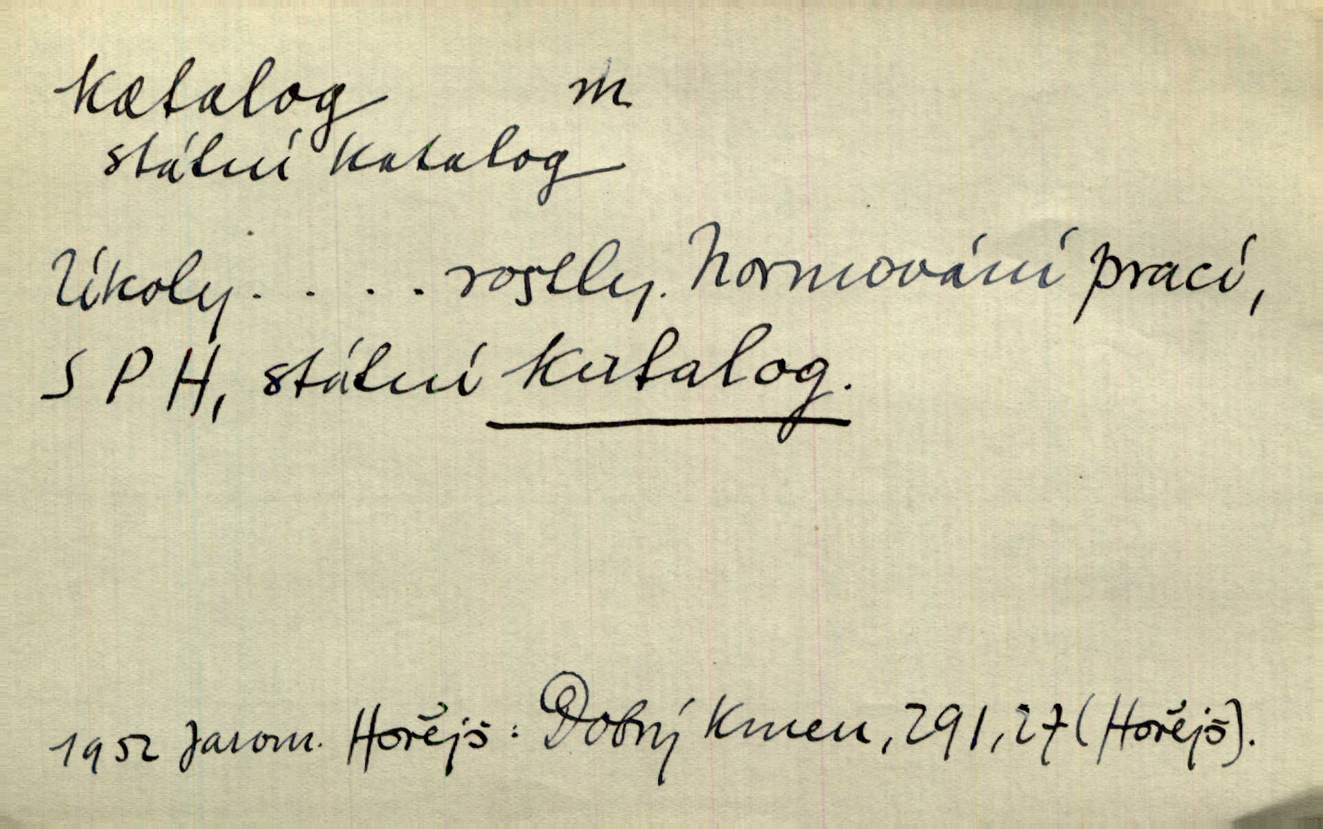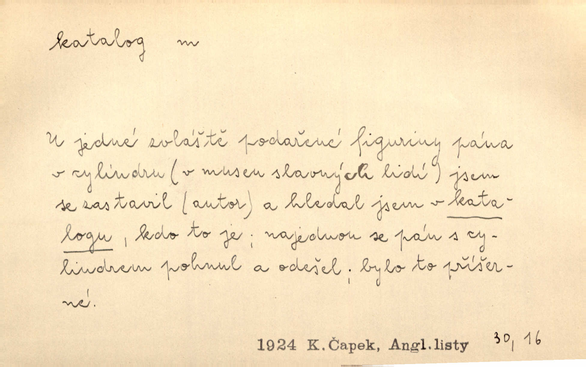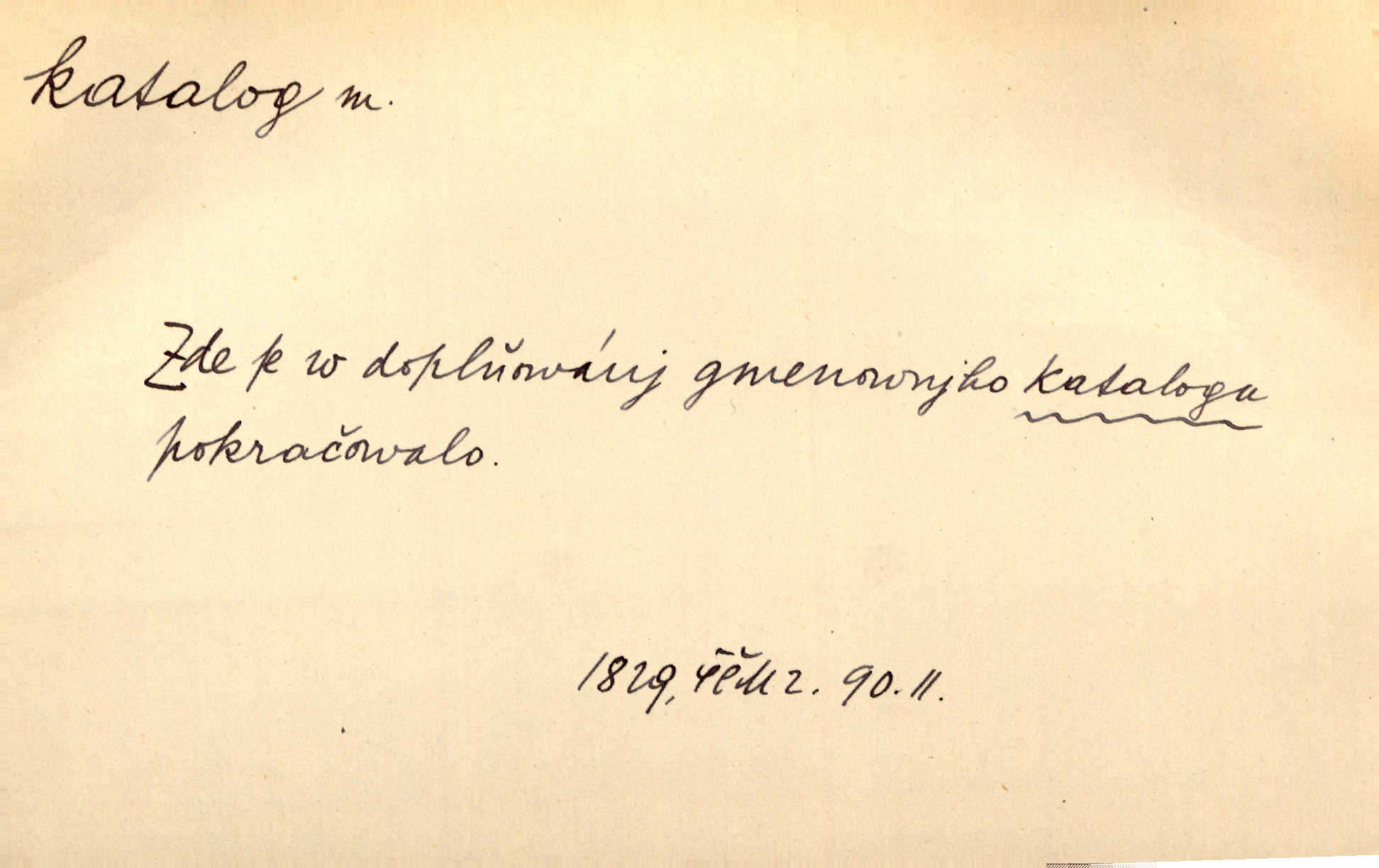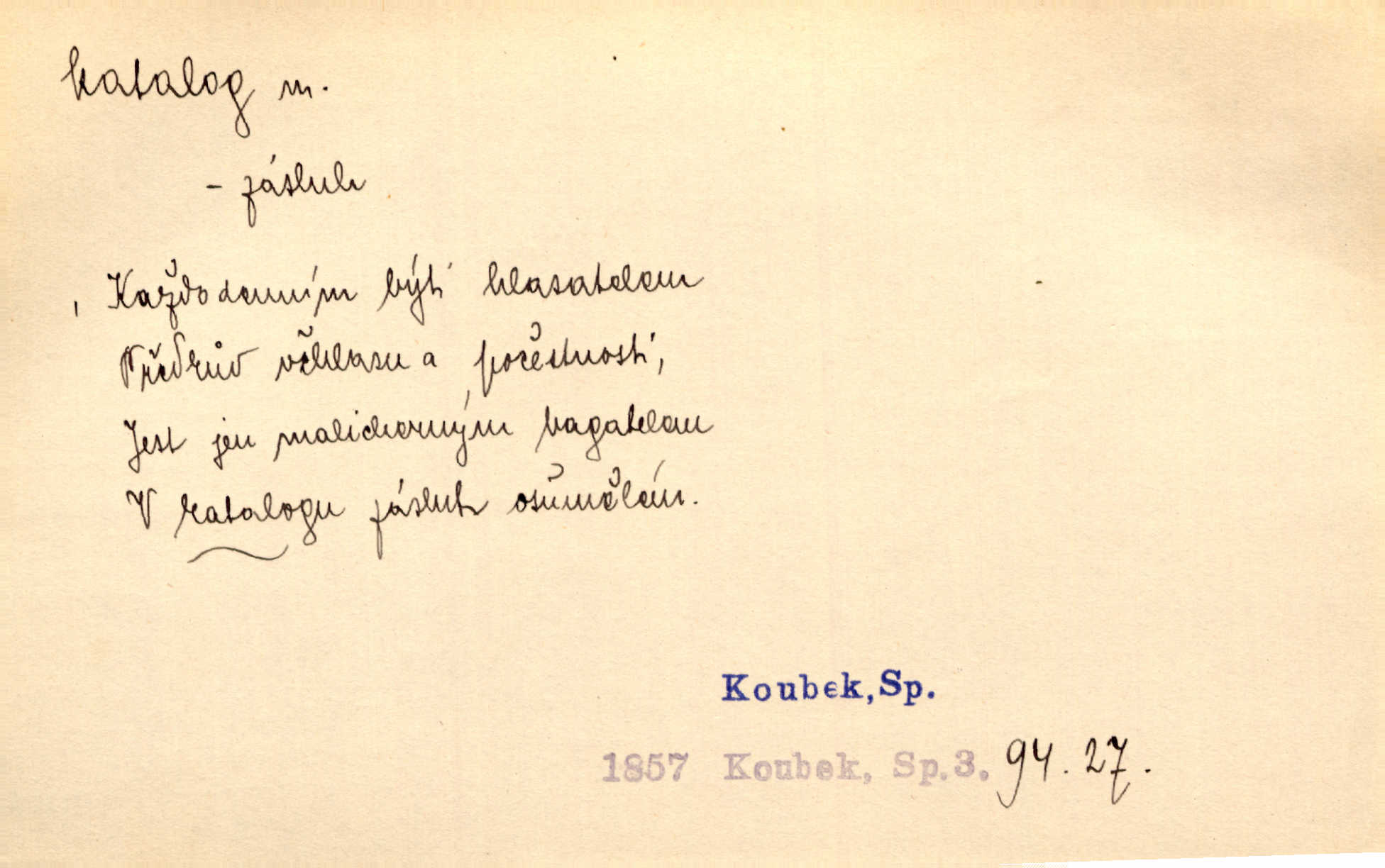 - katalog, -u m. seznam, soupis osob n. předmětů tvořících nějaký celek. Katalog knihovny (lístkový, věcný, heslový, přírůstkový). Katalog rukopisů knihovny musejní. Katalog musea, výstavy přehled vystavovaných předmětů. Tak sobě pořídil [Palacký] ohromný lístkový katalog, abecedně srovnaný, topograficko-genealogický. Kal. Škol. třídní katalog seznam žáků navštěvujících třídu se záznamem jejich prospěchu.