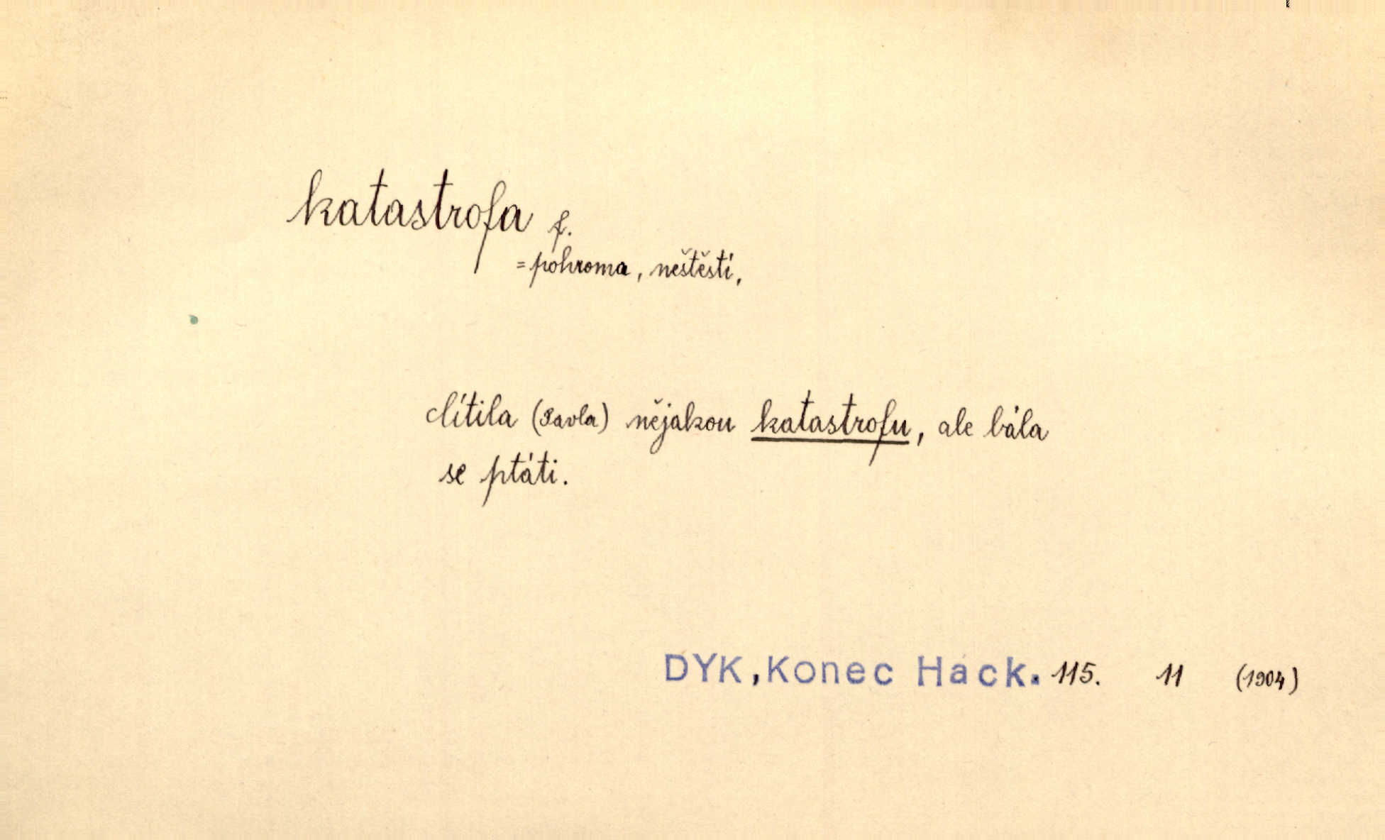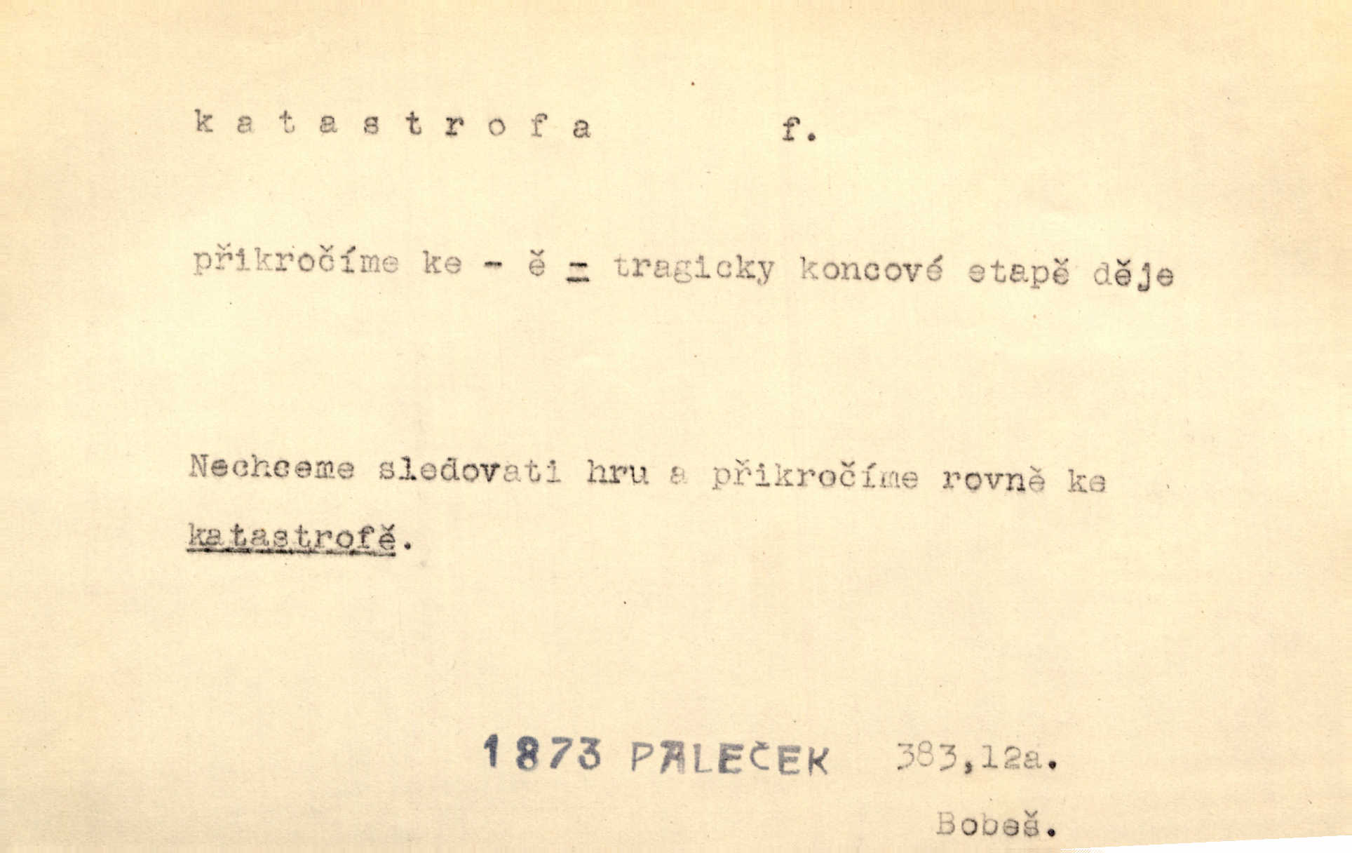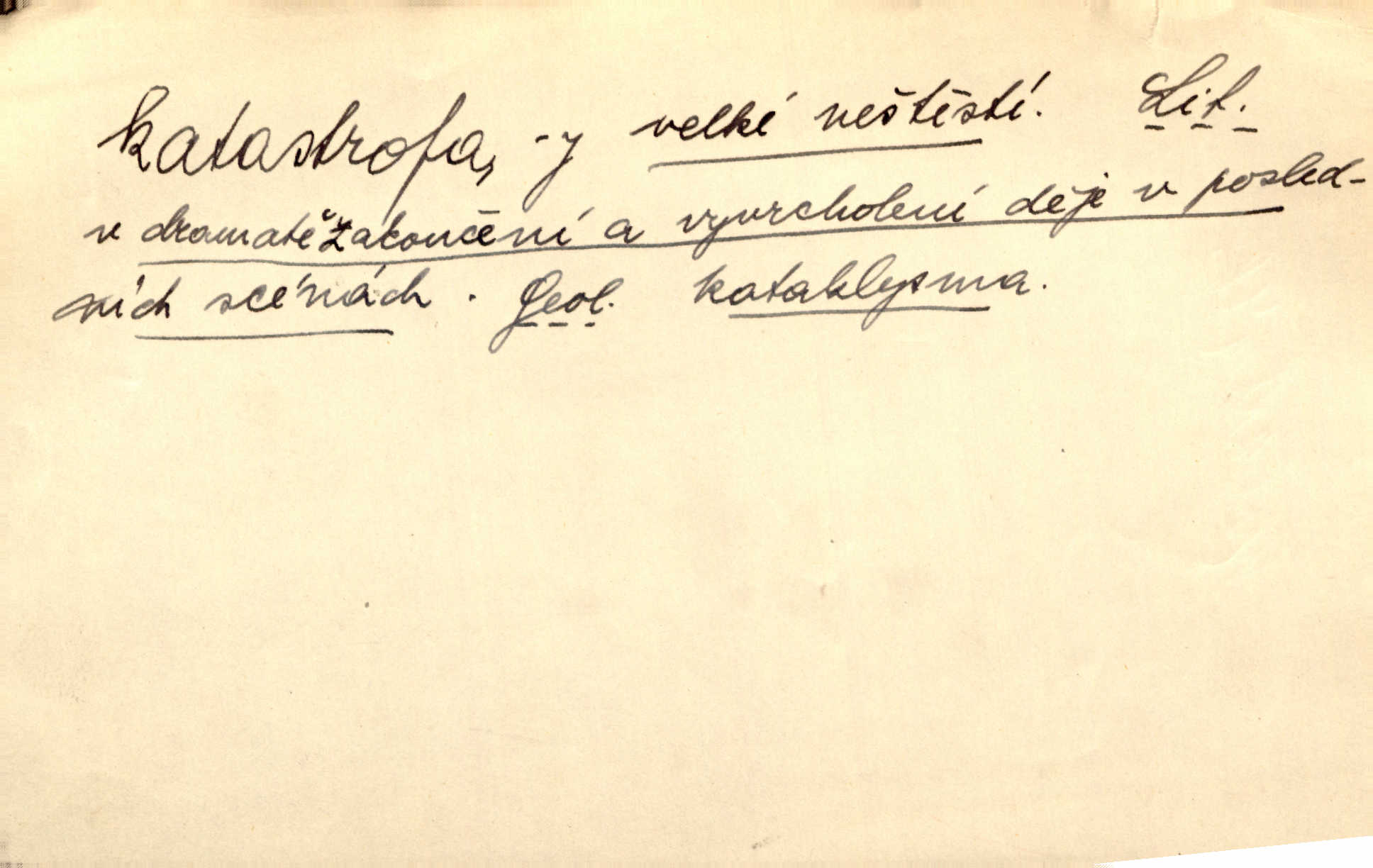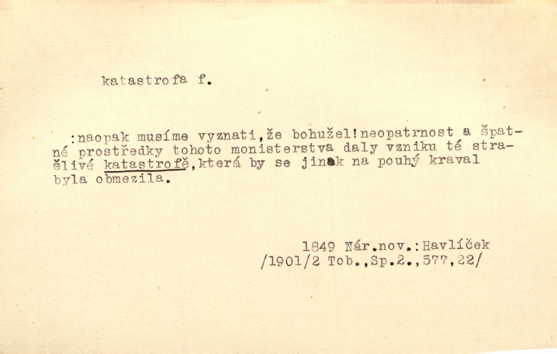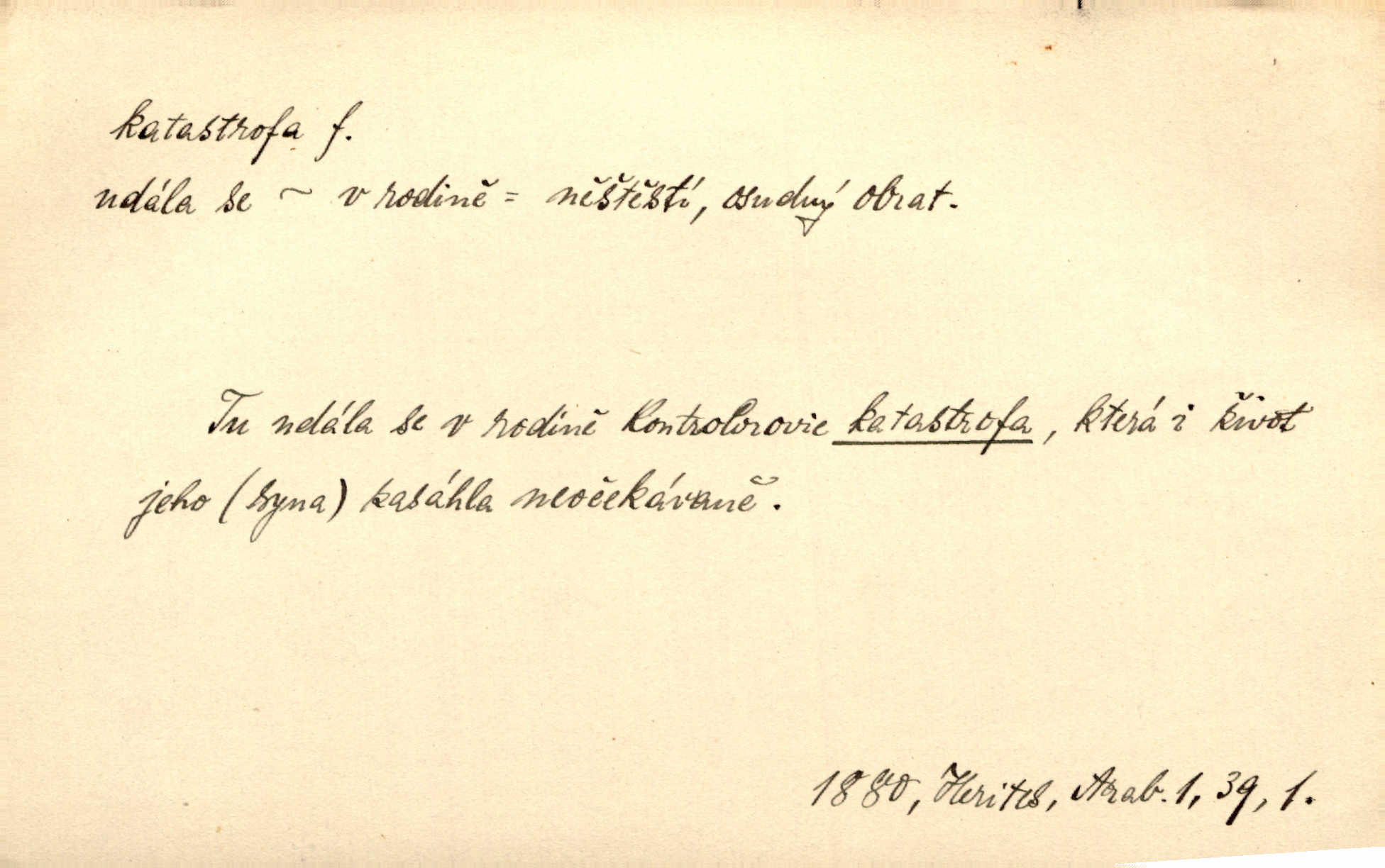 - katastrofa, -y f. velké, náhlé neštěstí, pohroma. Železniční, důlní katastrofa. Katastrofa Bělohorská měla v zápětí svém těžké pohromy pro náš národ. Tomek. Na italské frontě došlo ke katastrofě, která měla v zápětí naprostý rozklad armády. Vrba. A tak postihlo Jeníka několik katastrof. Tři čtyři známky objevily se u jeho jména v zápisnících profesorů. Šrám. Lit. tragické rozuzlení děje v dramatu. Třetí akt s katastrofou i zakončením úplně činí zadost theorii dramatu. Durd.