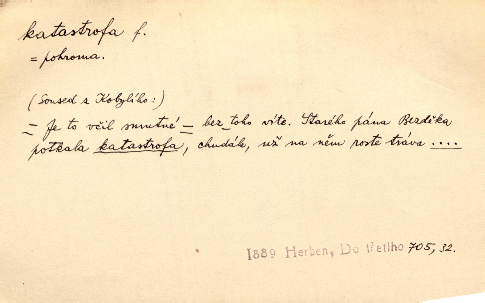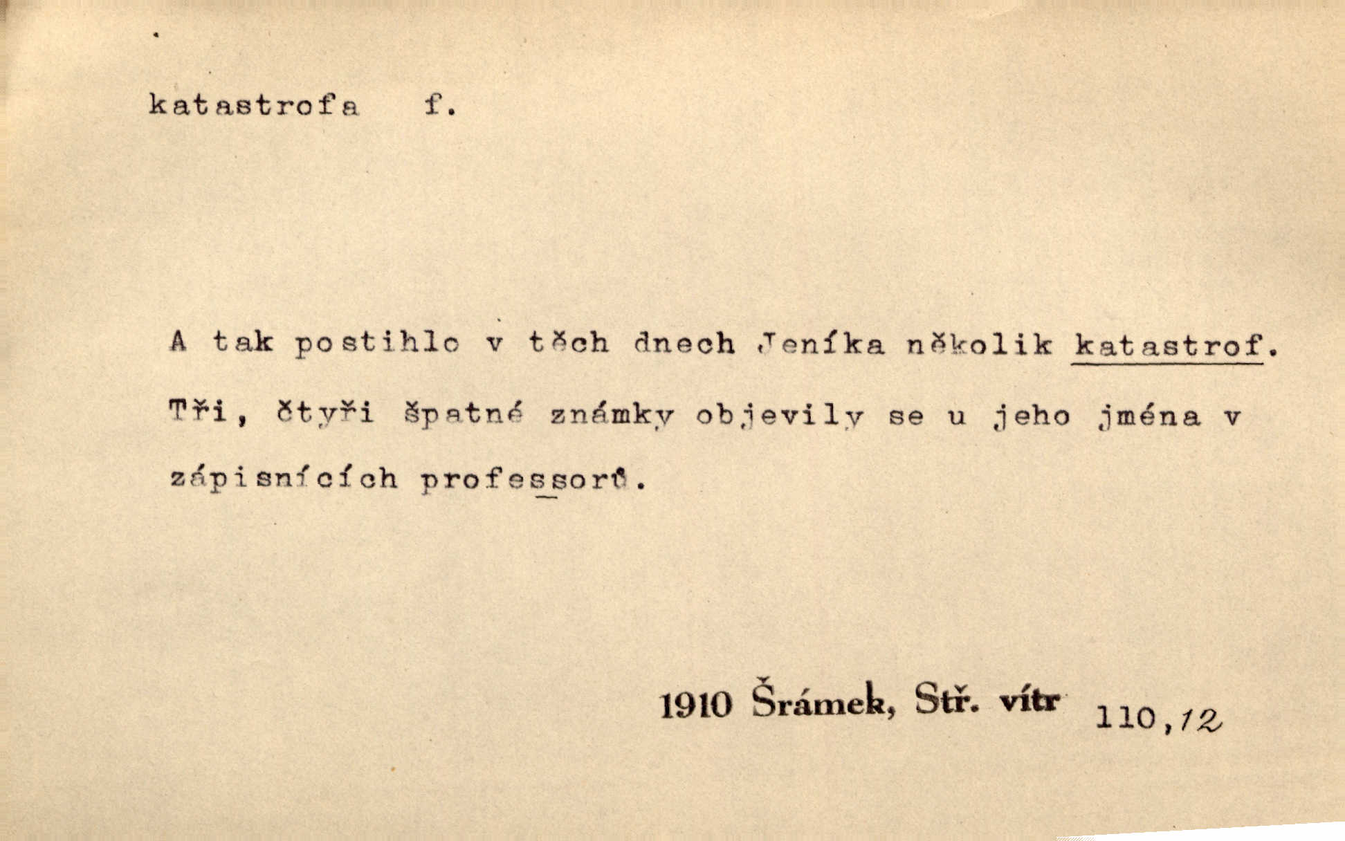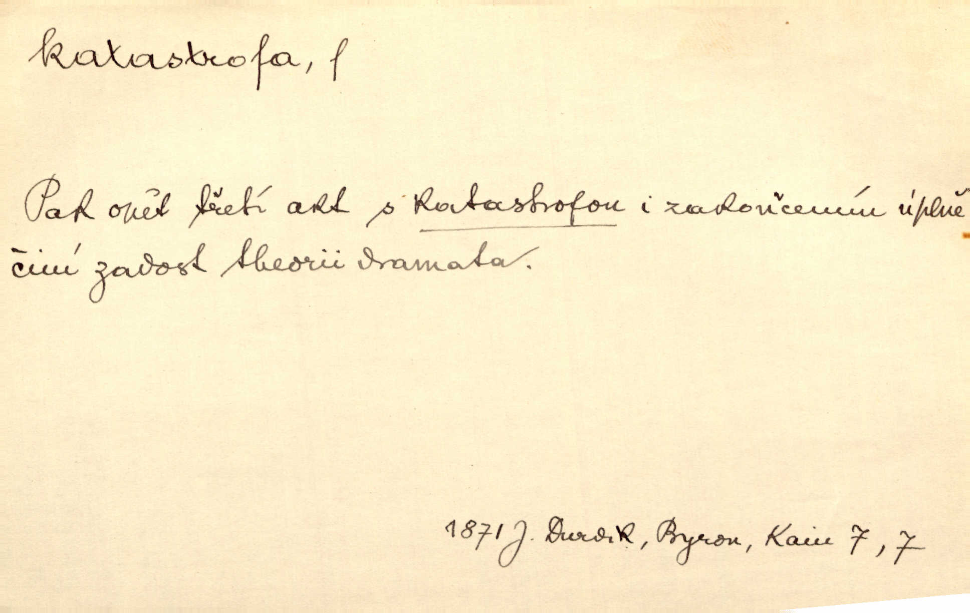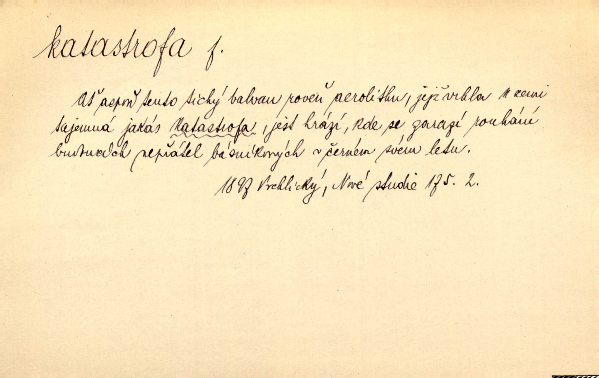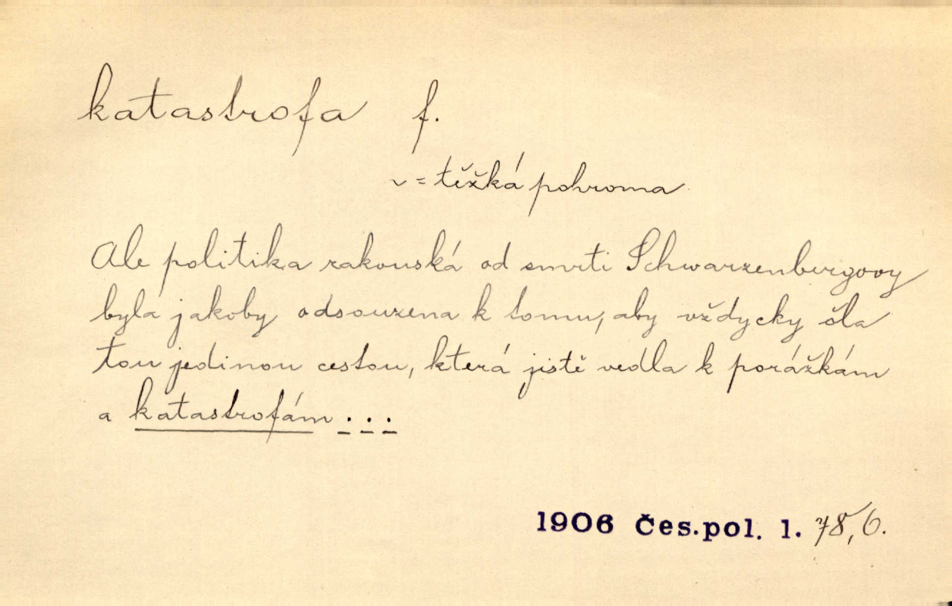 - katastrofa, -y f. velké, náhlé neštěstí, pohroma. Železniční, důlní katastrofa. Katastrofa Bělohorská měla v zápětí svém těžké pohromy pro náš národ. Tomek. Na italské frontě došlo ke katastrofě, která měla v zápětí naprostý rozklad armády. Vrba. A tak postihlo Jeníka několik katastrof. Tři čtyři známky objevily se u jeho jména v zápisnících profesorů. Šrám. Lit. tragické rozuzlení děje v dramatu. Třetí akt s katastrofou i zakončením úplně činí zadost theorii dramatu. Durd.