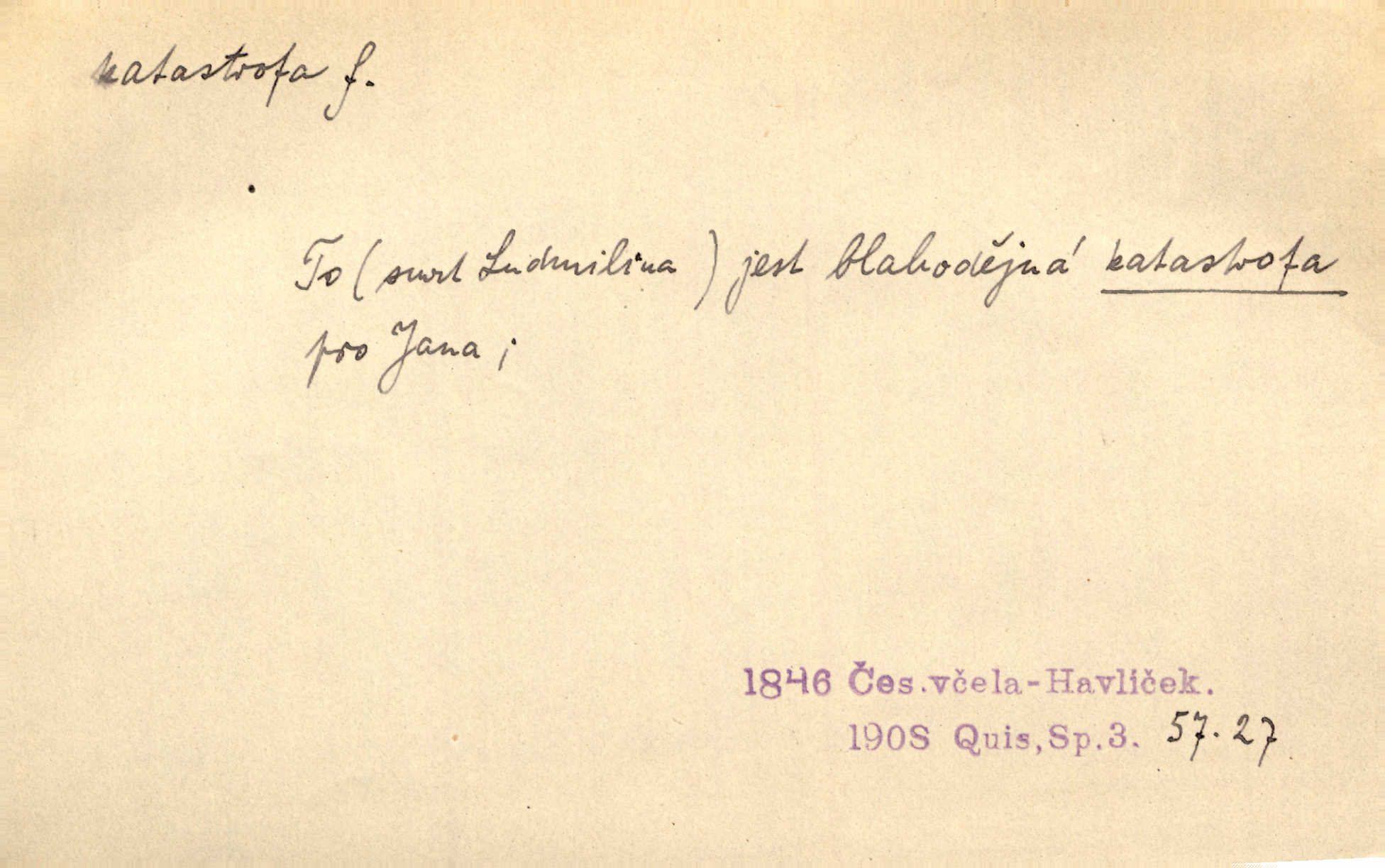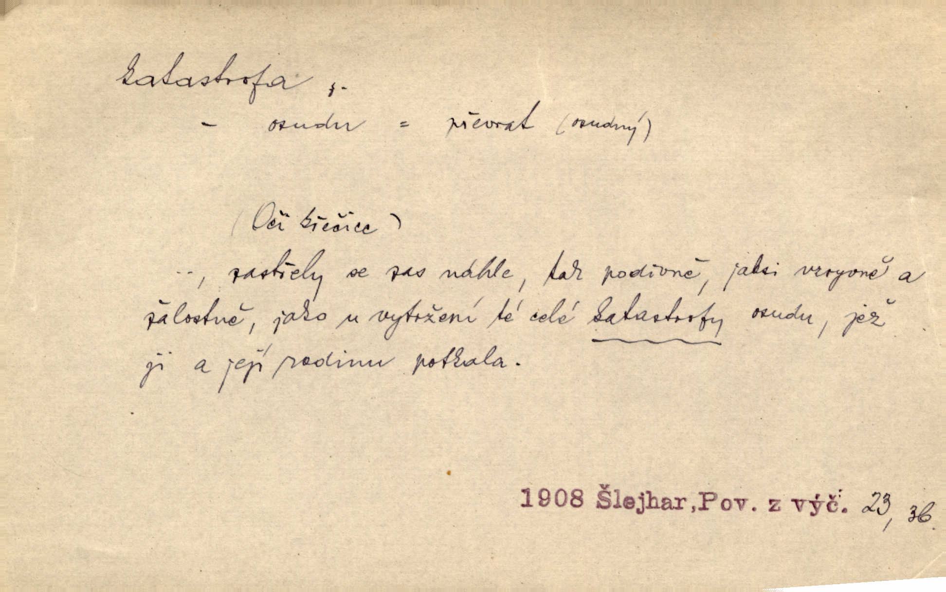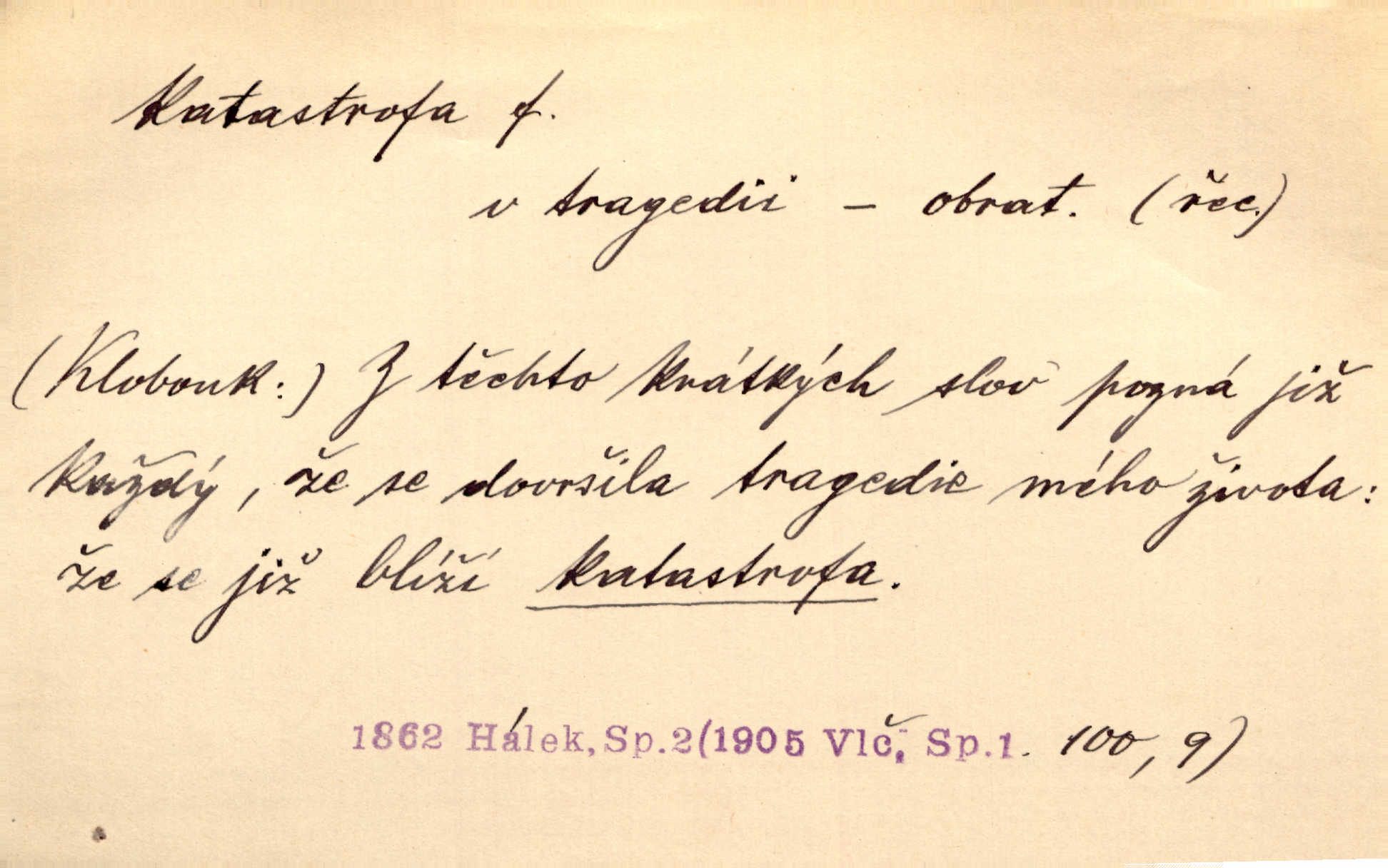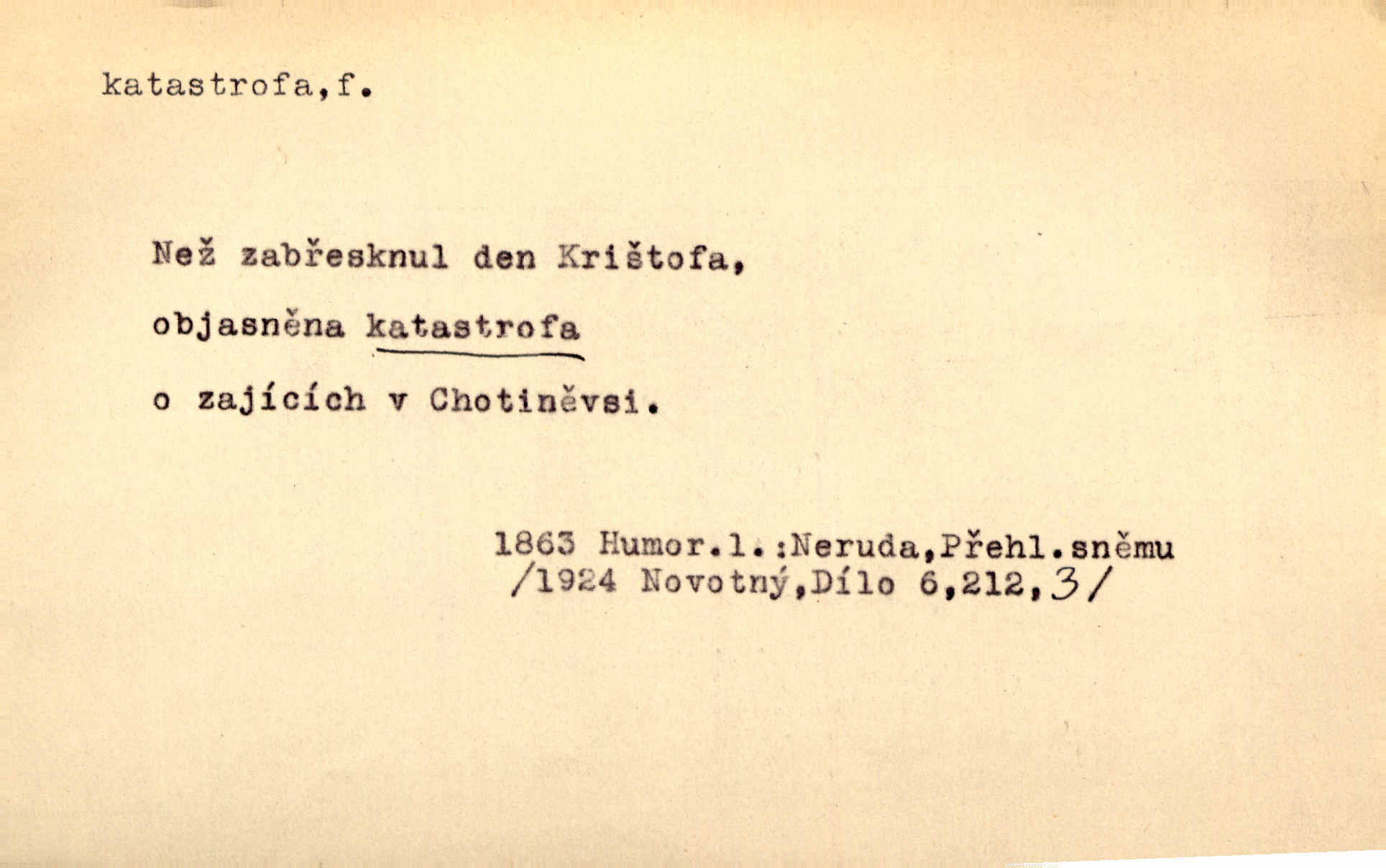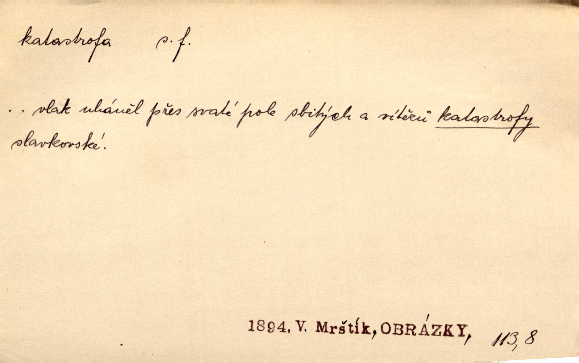 - katastrofa, -y f. velké, náhlé neštěstí, pohroma. Železniční, důlní katastrofa. Katastrofa Bělohorská měla v zápětí svém těžké pohromy pro náš národ. Tomek. Na italské frontě došlo ke katastrofě, která měla v zápětí naprostý rozklad armády. Vrba. A tak postihlo Jeníka několik katastrof. Tři čtyři známky objevily se u jeho jména v zápisnících profesorů. Šrám. Lit. tragické rozuzlení děje v dramatu. Třetí akt s katastrofou i zakončením úplně činí zadost theorii dramatu. Durd.