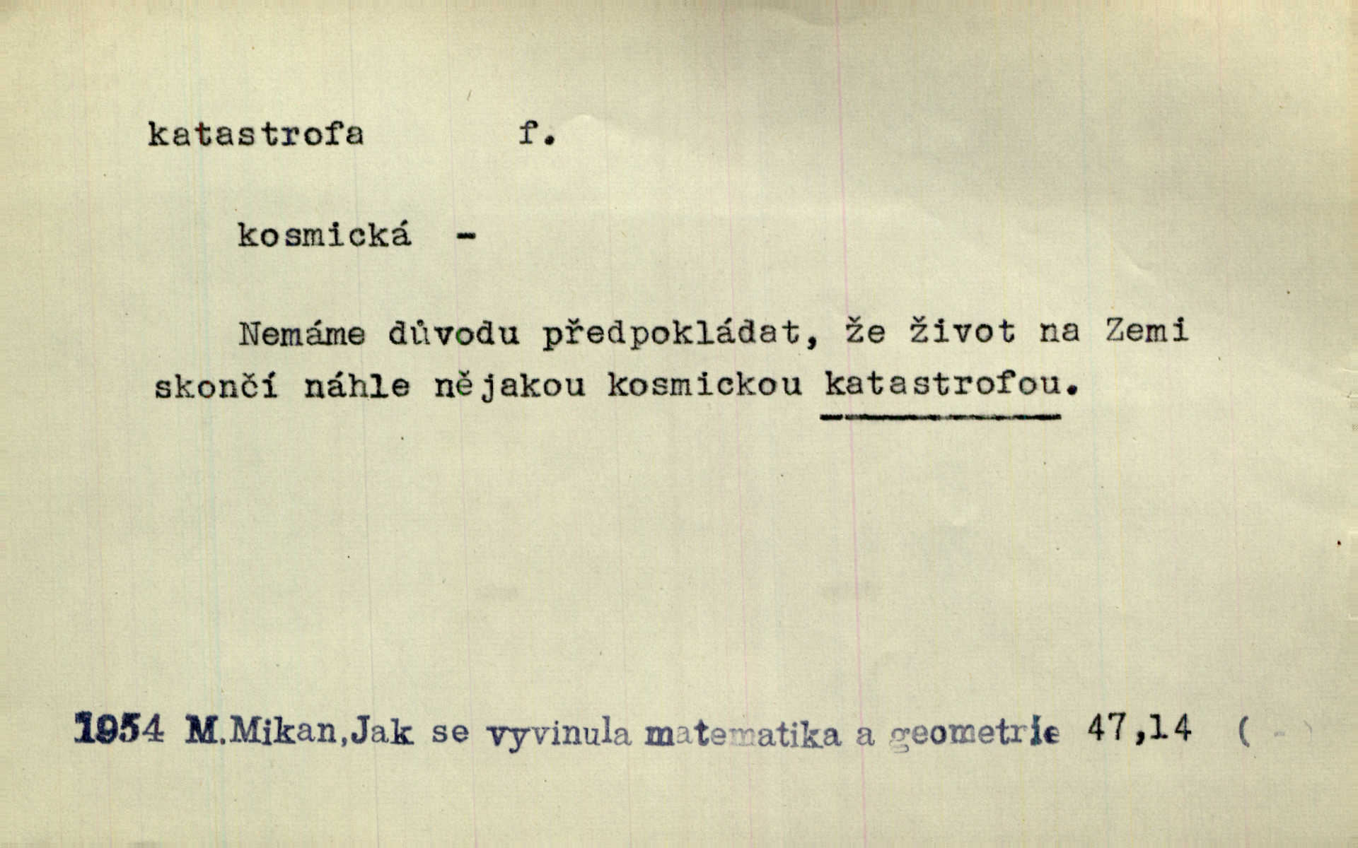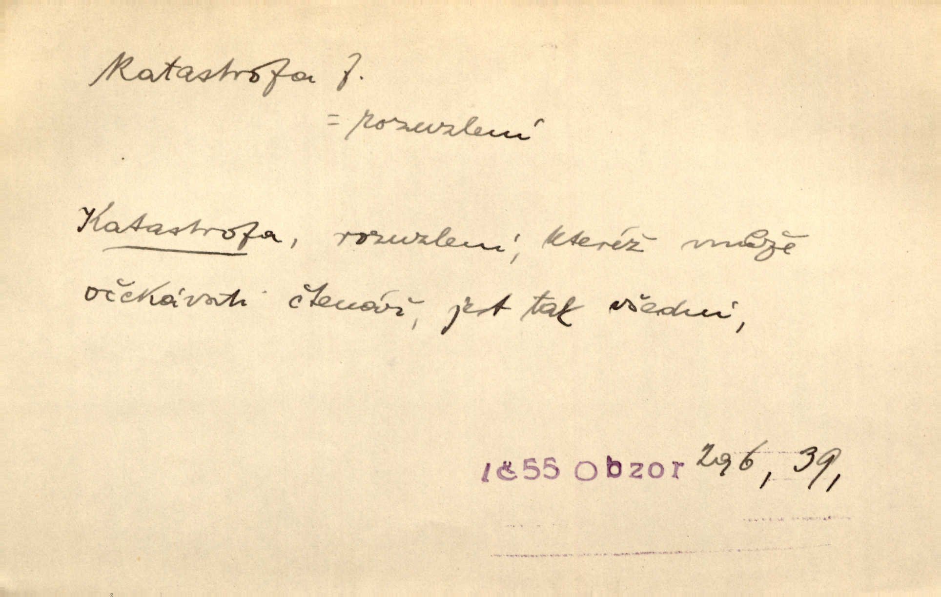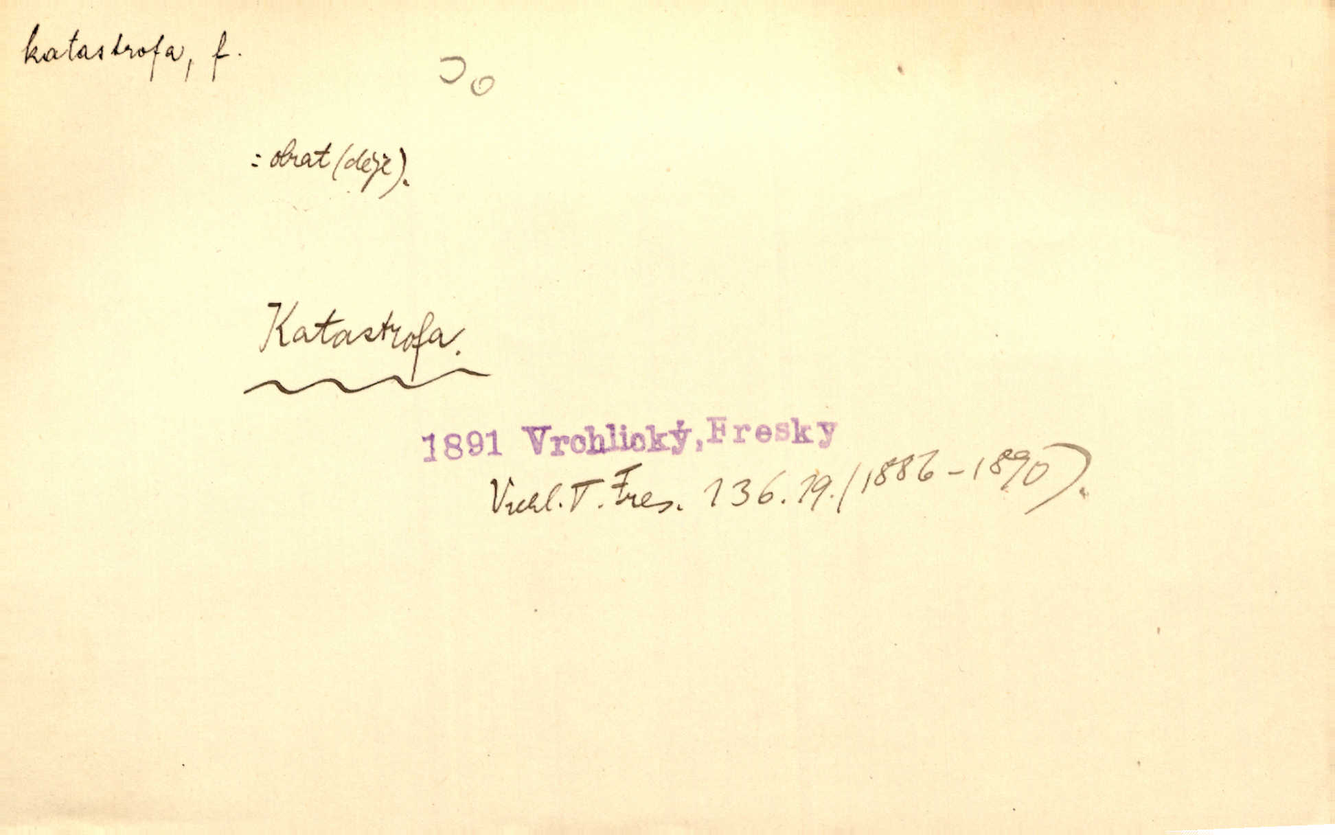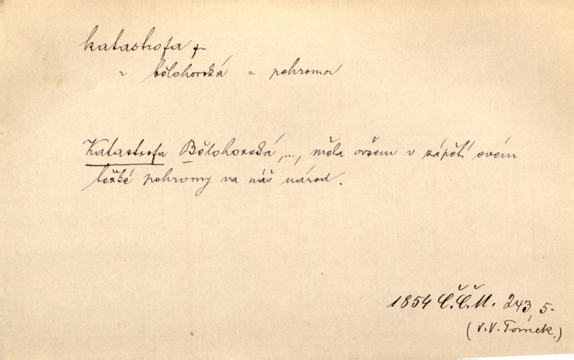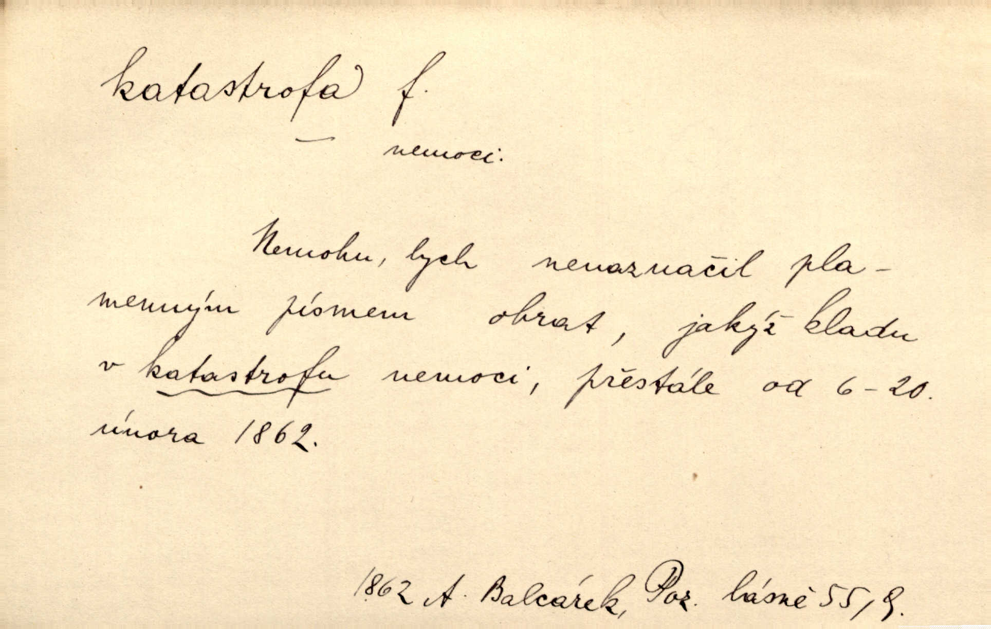 - katastrofa, -y f. velké, náhlé neštěstí, pohroma. Železniční, důlní katastrofa. Katastrofa Bělohorská měla v zápětí svém těžké pohromy pro náš národ. Tomek. Na italské frontě došlo ke katastrofě, která měla v zápětí naprostý rozklad armády. Vrba. A tak postihlo Jeníka několik katastrof. Tři čtyři známky objevily se u jeho jména v zápisnících profesorů. Šrám. Lit. tragické rozuzlení děje v dramatu. Třetí akt s katastrofou i zakončením úplně činí zadost theorii dramatu. Durd.