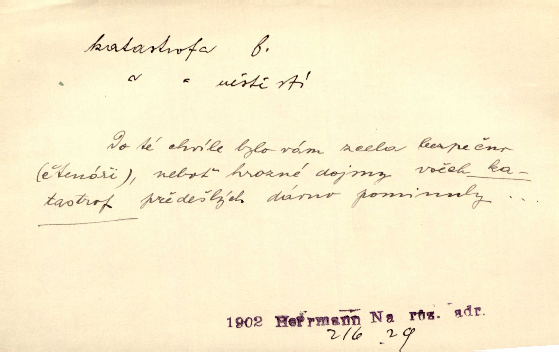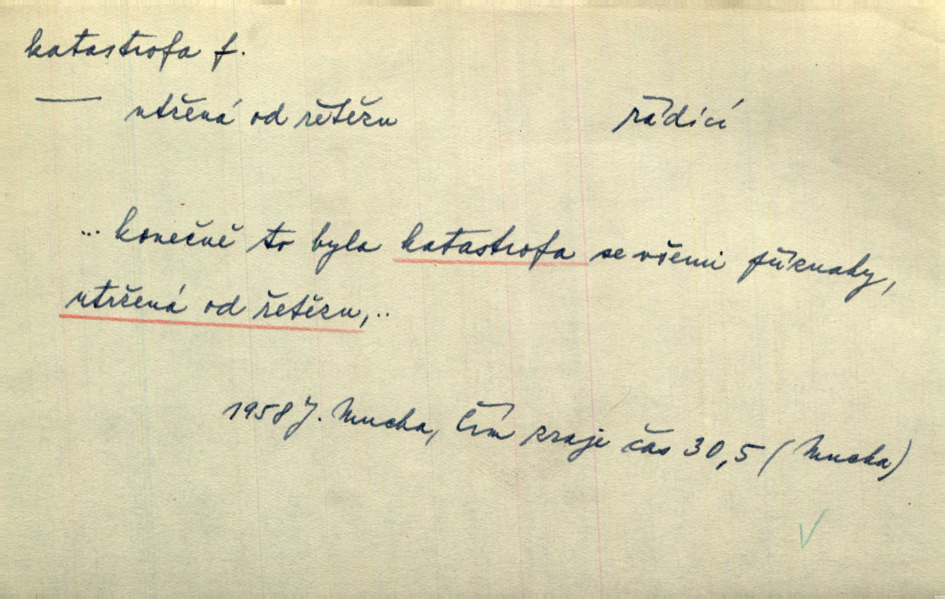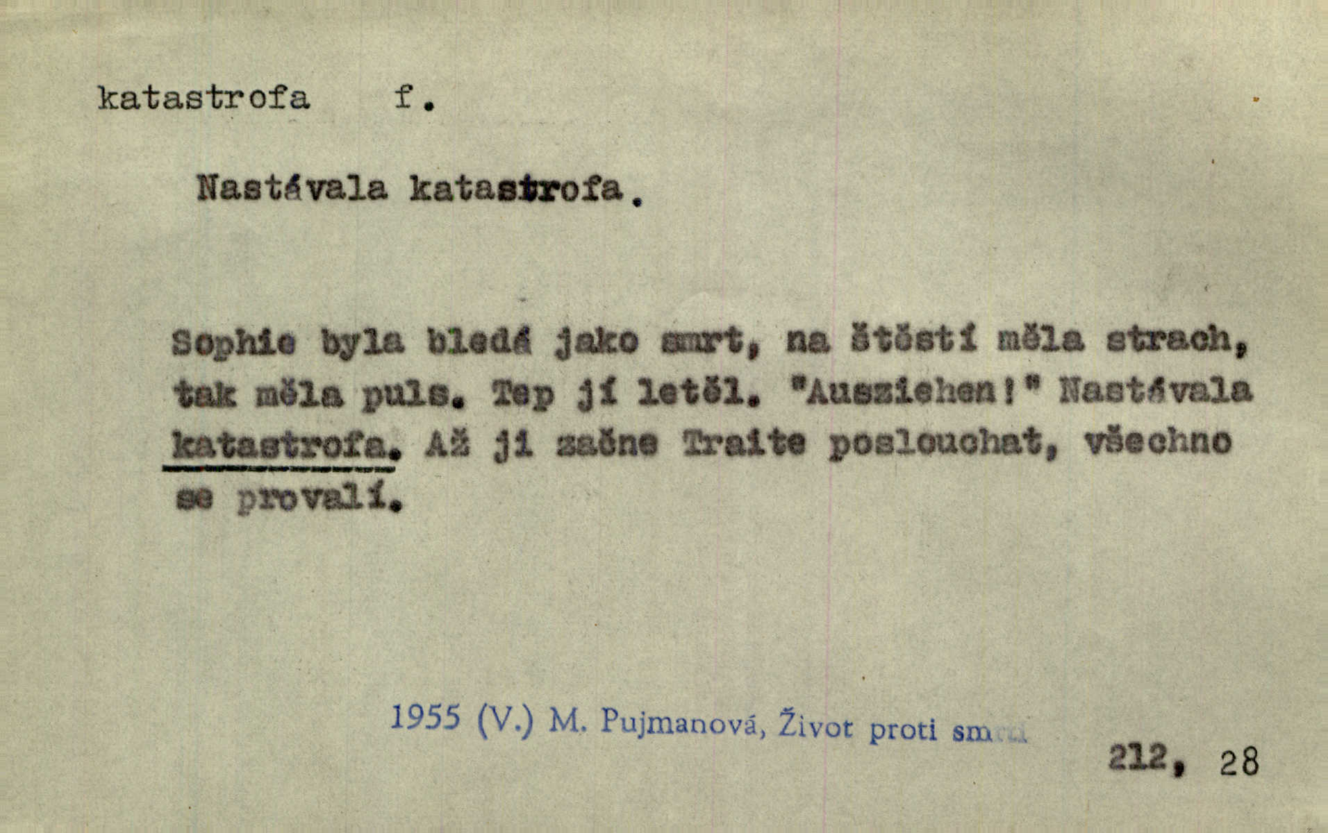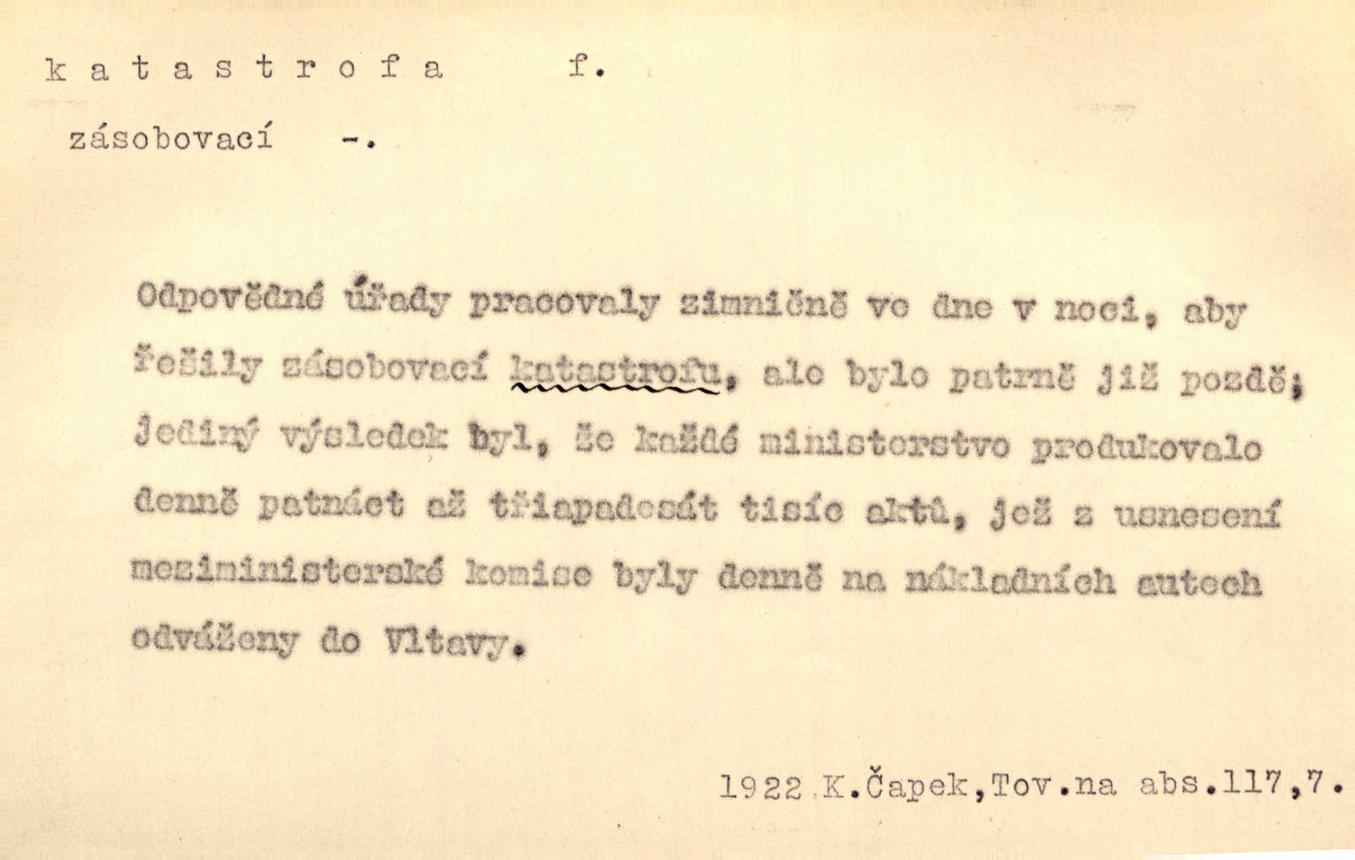 - katastrofa, -y f. velké, náhlé neštěstí, pohroma. Železniční, důlní katastrofa. Katastrofa Bělohorská měla v zápětí svém těžké pohromy pro náš národ. Tomek. Na italské frontě došlo ke katastrofě, která měla v zápětí naprostý rozklad armády. Vrba. A tak postihlo Jeníka několik katastrof. Tři čtyři známky objevily se u jeho jména v zápisnících profesorů. Šrám. Lit. tragické rozuzlení děje v dramatu. Třetí akt s katastrofou i zakončením úplně činí zadost theorii dramatu. Durd.