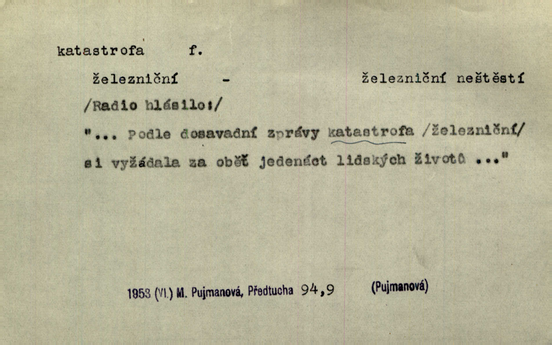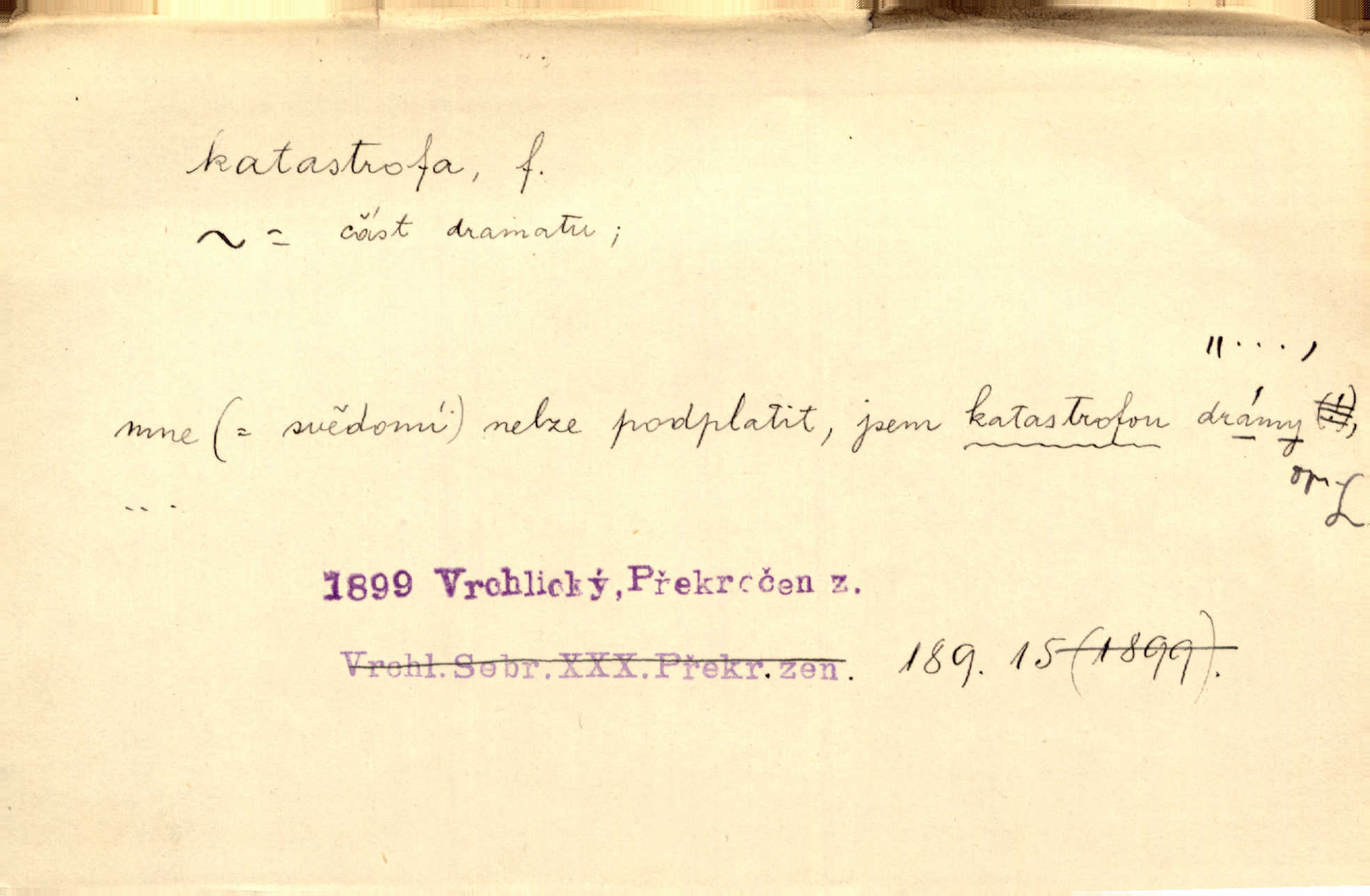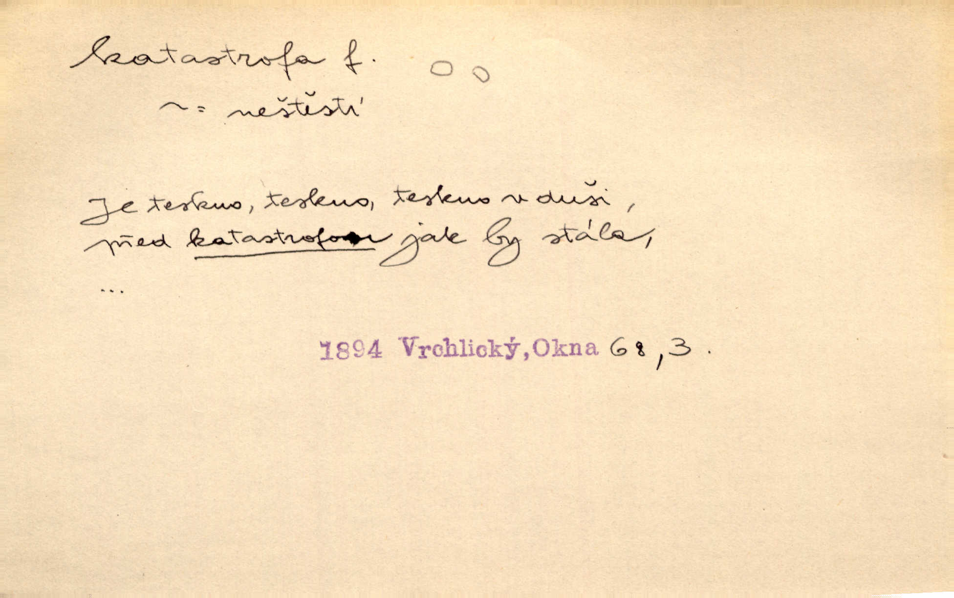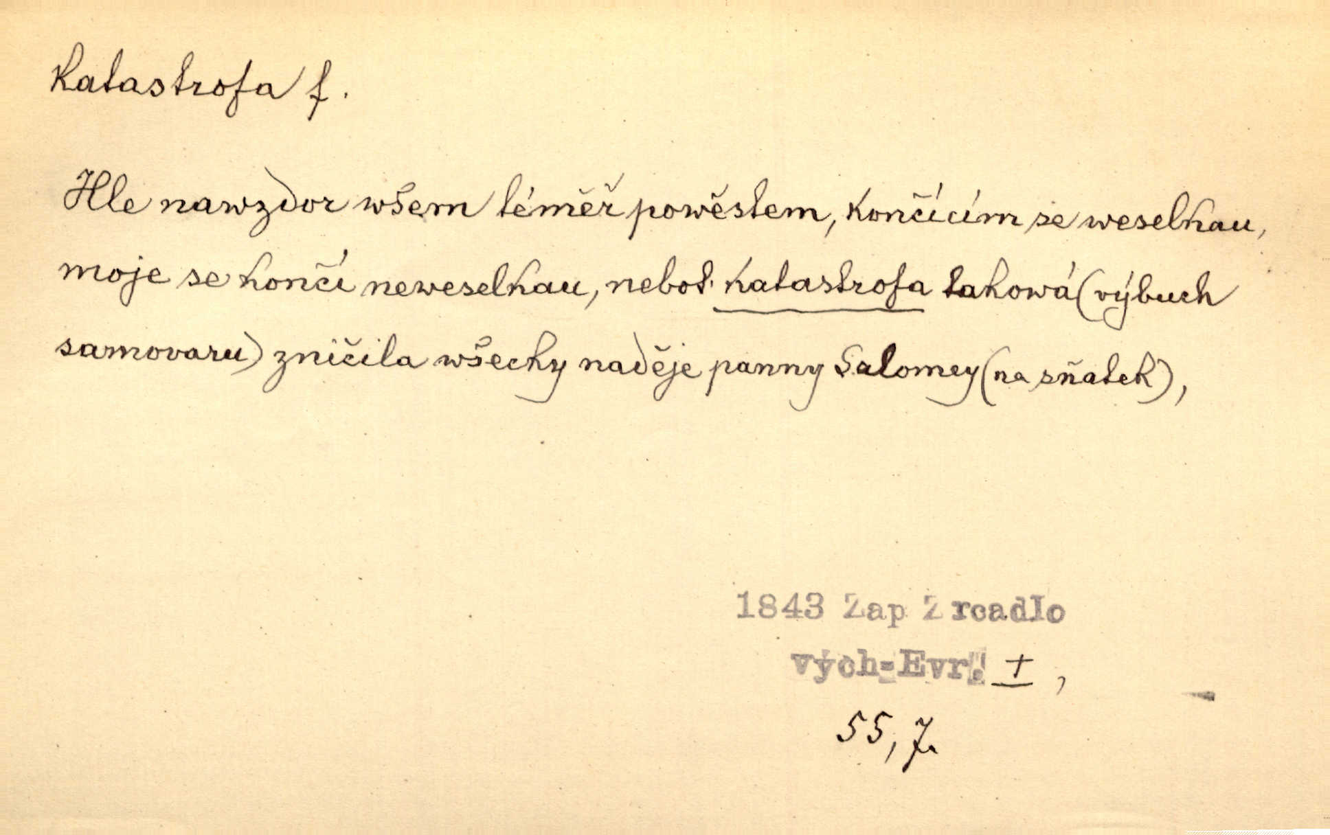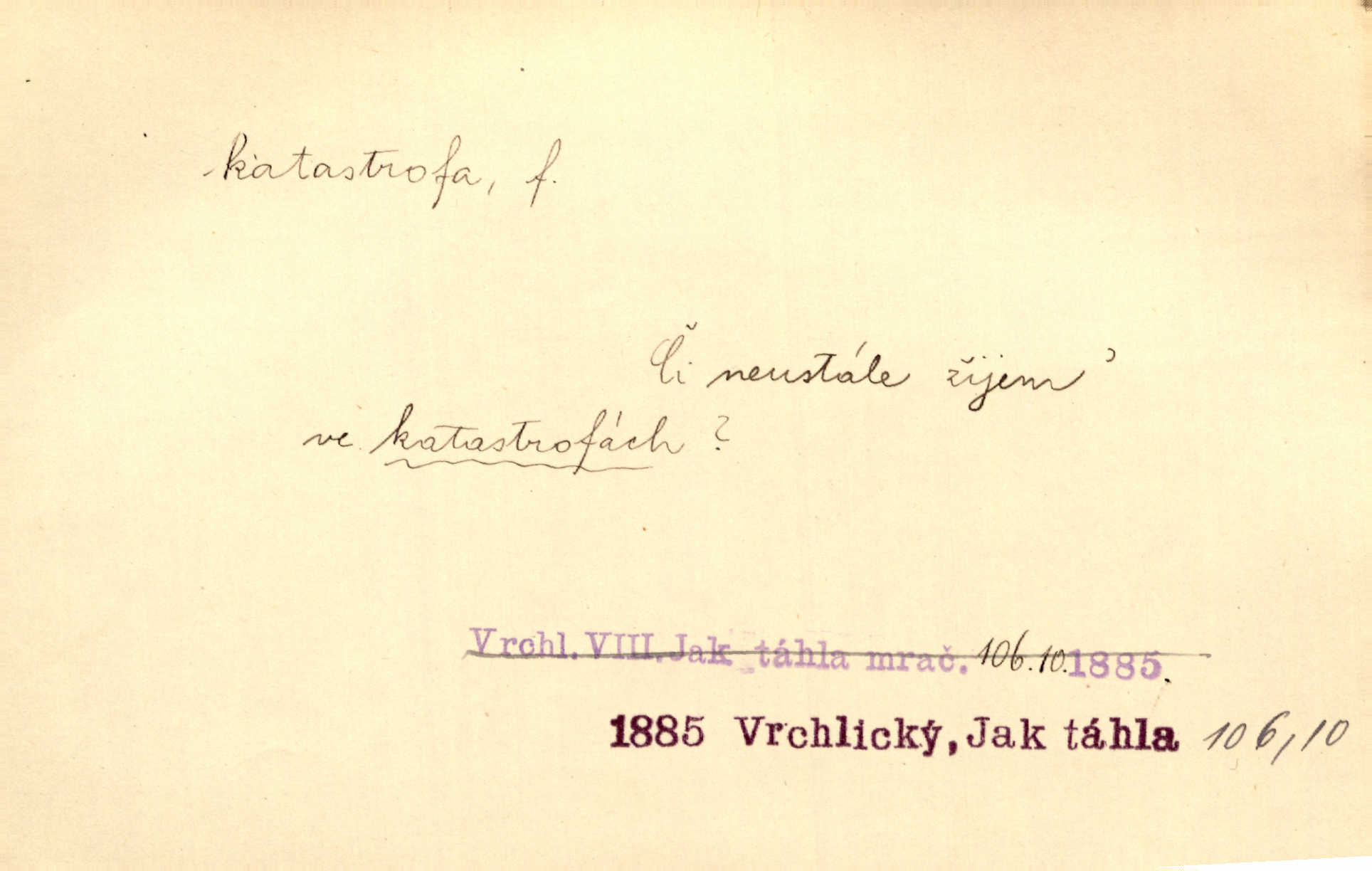 - katastrofa, -y f. velké, náhlé neštěstí, pohroma. Železniční, důlní katastrofa. Katastrofa Bělohorská měla v zápětí svém těžké pohromy pro náš národ. Tomek. Na italské frontě došlo ke katastrofě, která měla v zápětí naprostý rozklad armády. Vrba. A tak postihlo Jeníka několik katastrof. Tři čtyři známky objevily se u jeho jména v zápisnících profesorů. Šrám. Lit. tragické rozuzlení děje v dramatu. Třetí akt s katastrofou i zakončením úplně činí zadost theorii dramatu. Durd.