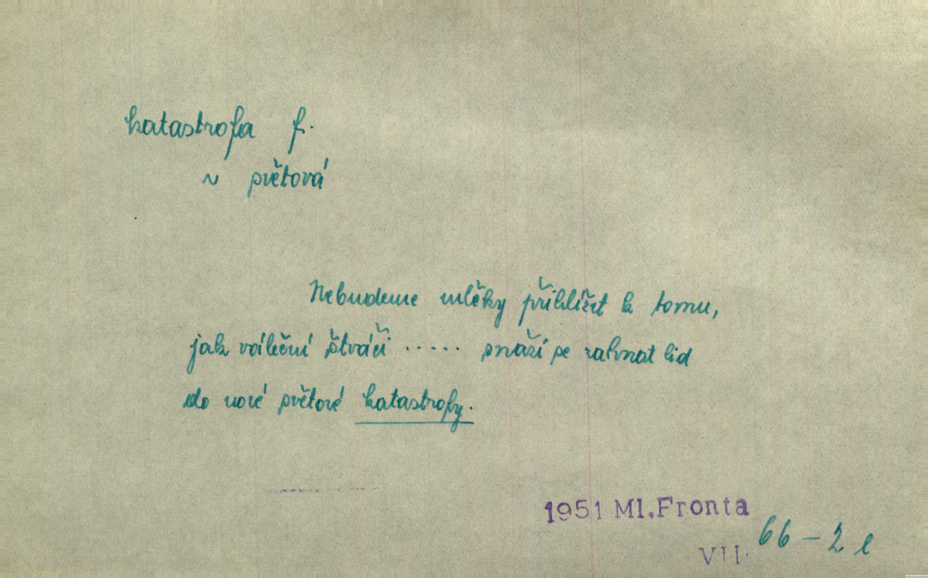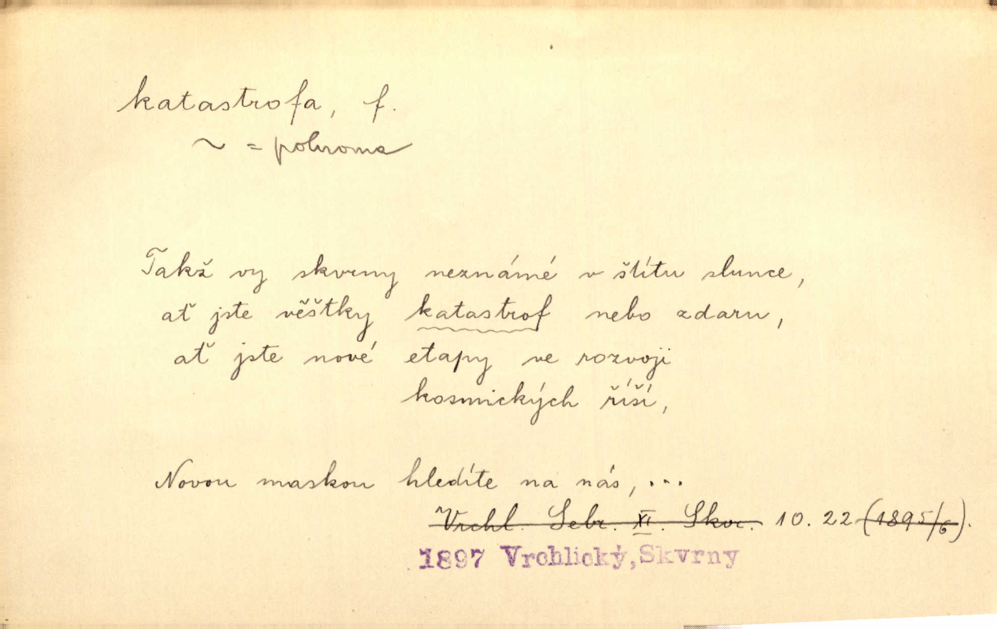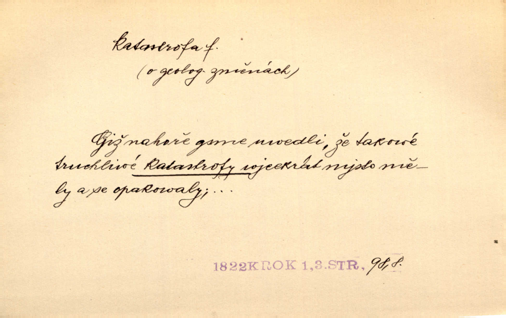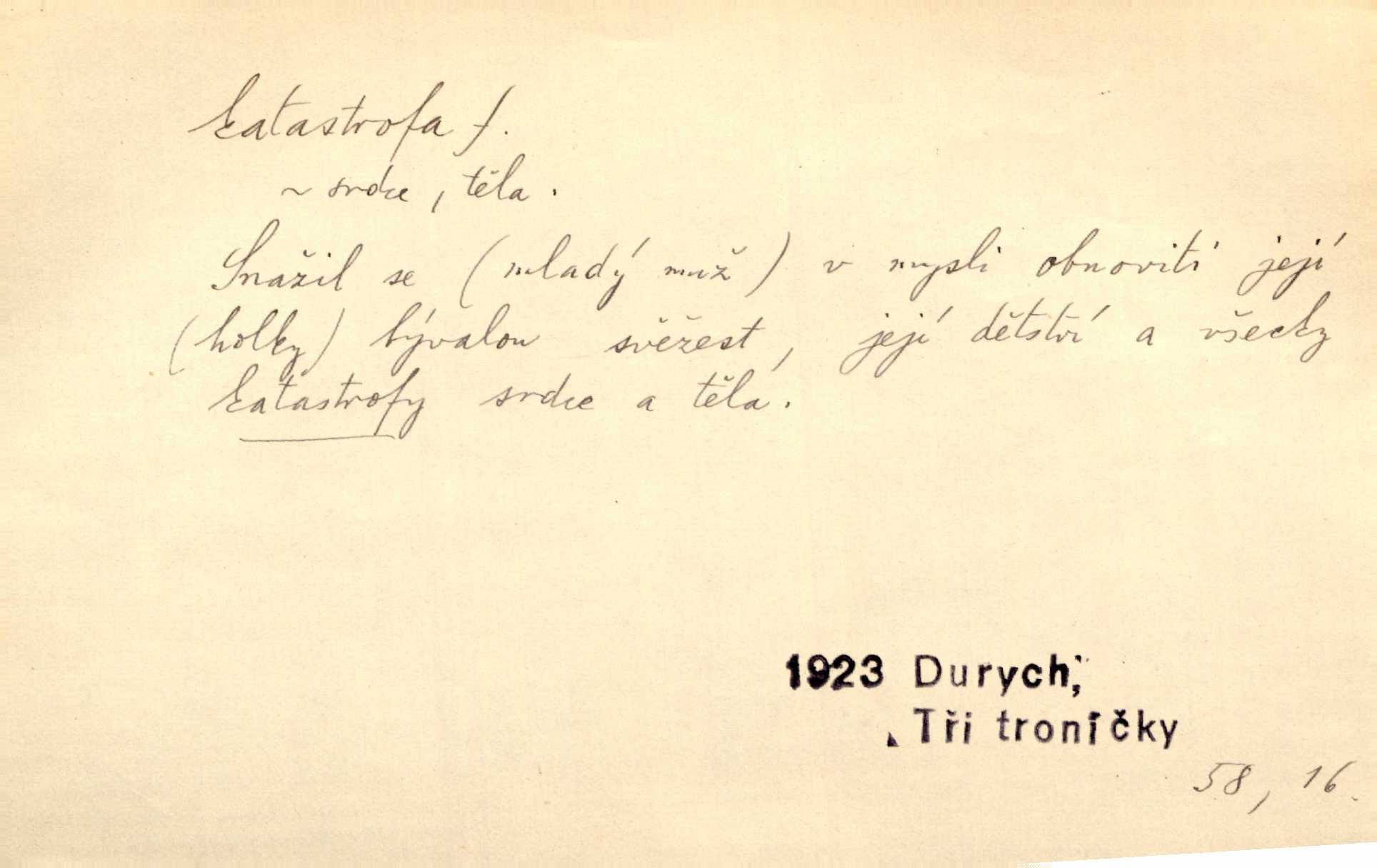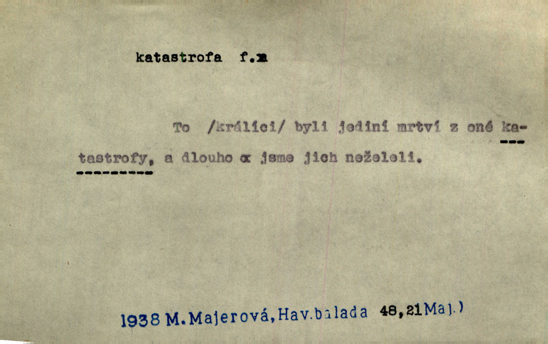 - katastrofa, -y f. velké, náhlé neštěstí, pohroma. Železniční, důlní katastrofa. Katastrofa Bělohorská měla v zápětí svém těžké pohromy pro náš národ. Tomek. Na italské frontě došlo ke katastrofě, která měla v zápětí naprostý rozklad armády. Vrba. A tak postihlo Jeníka několik katastrof. Tři čtyři známky objevily se u jeho jména v zápisnících profesorů. Šrám. Lit. tragické rozuzlení děje v dramatu. Třetí akt s katastrofou i zakončením úplně činí zadost theorii dramatu. Durd.