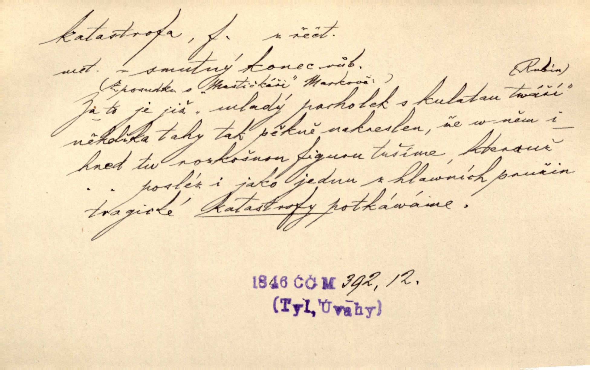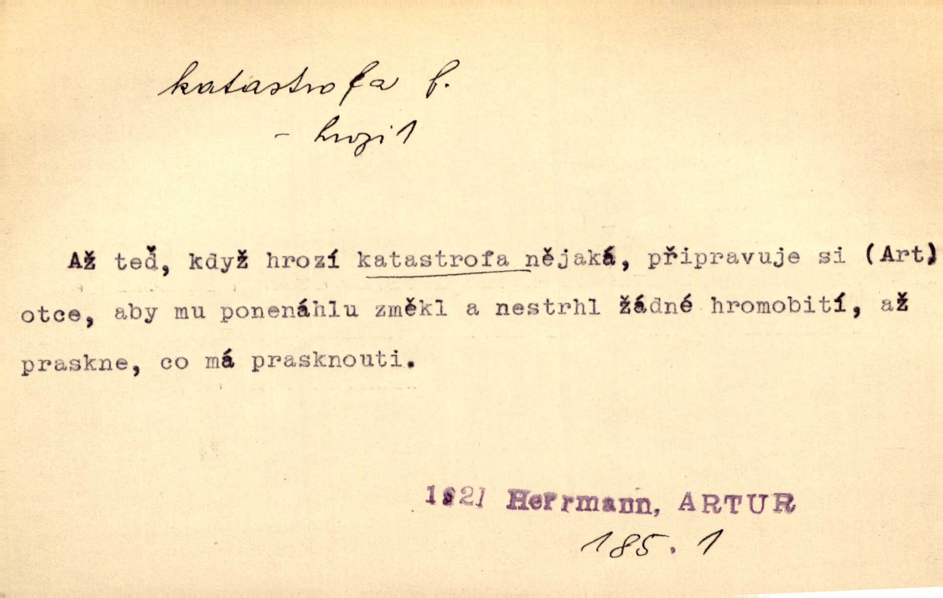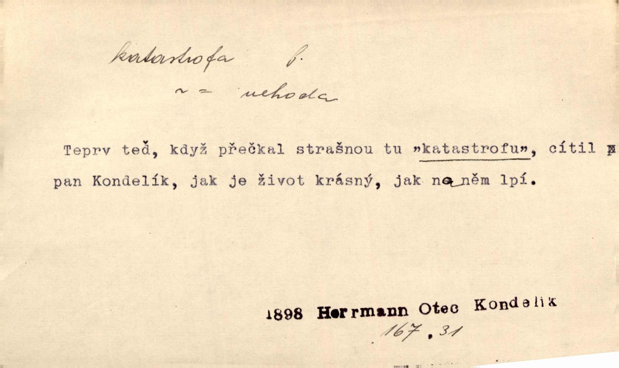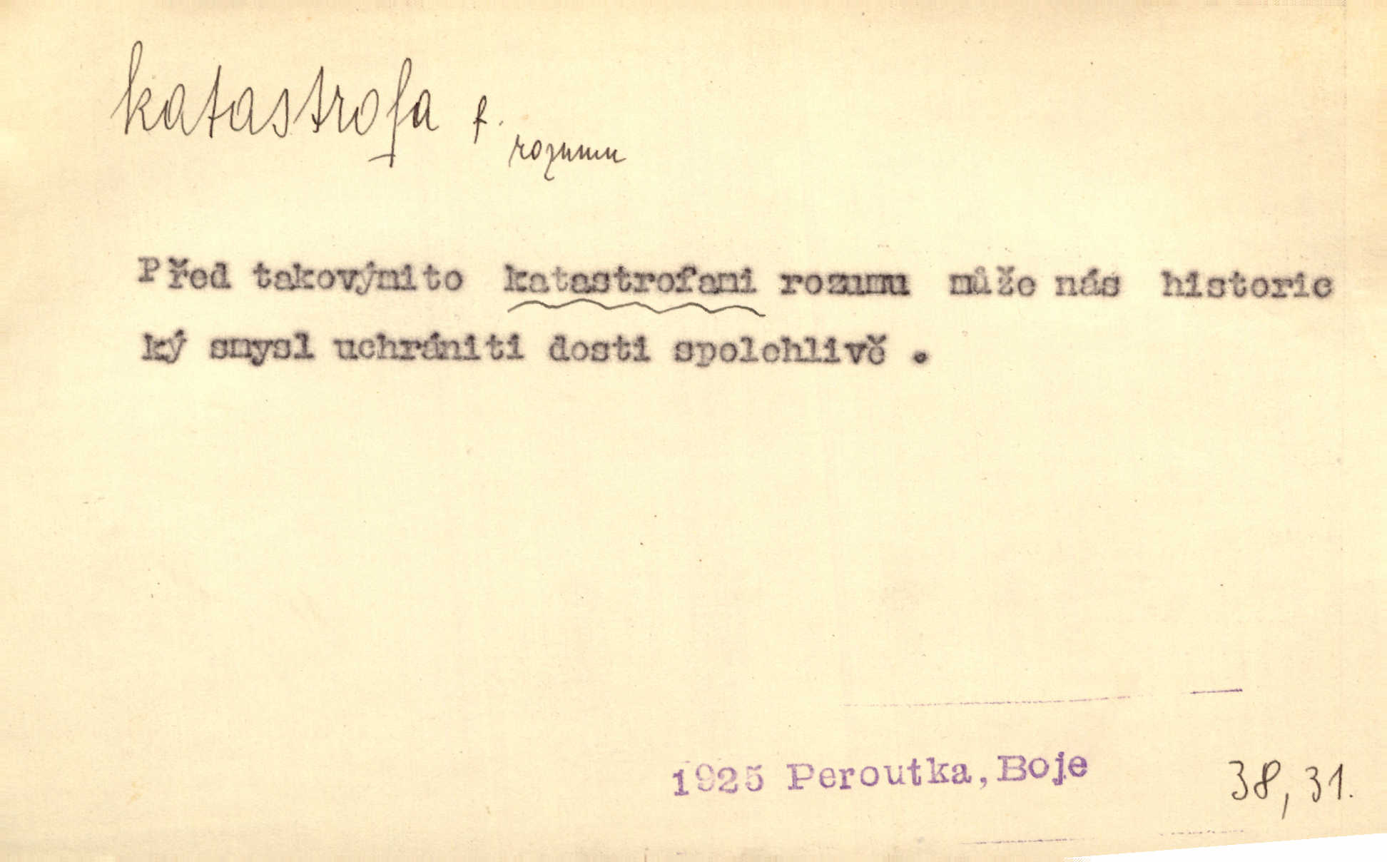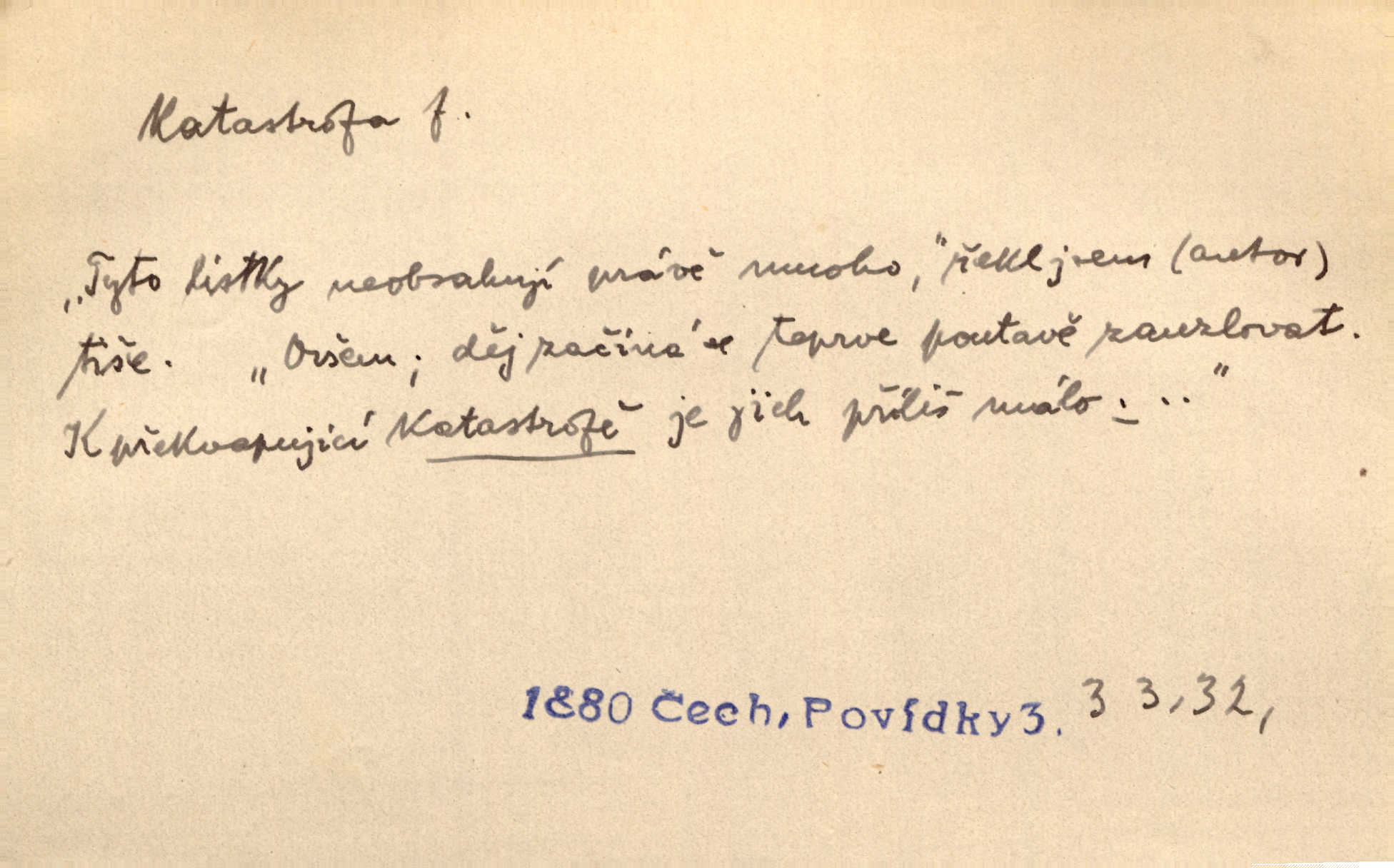 - katastrofa, -y f. velké, náhlé neštěstí, pohroma. Železniční, důlní katastrofa. Katastrofa Bělohorská měla v zápětí svém těžké pohromy pro náš národ. Tomek. Na italské frontě došlo ke katastrofě, která měla v zápětí naprostý rozklad armády. Vrba. A tak postihlo Jeníka několik katastrof. Tři čtyři známky objevily se u jeho jména v zápisnících profesorů. Šrám. Lit. tragické rozuzlení děje v dramatu. Třetí akt s katastrofou i zakončením úplně činí zadost theorii dramatu. Durd.