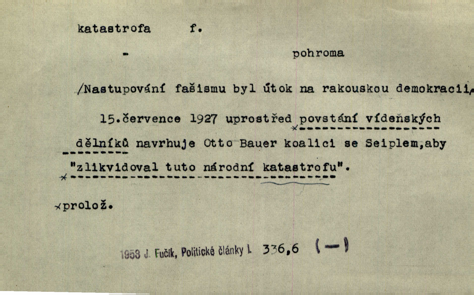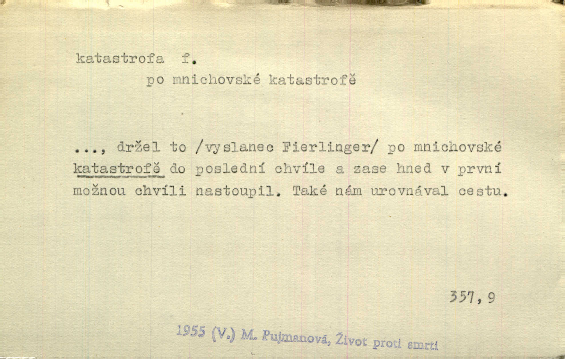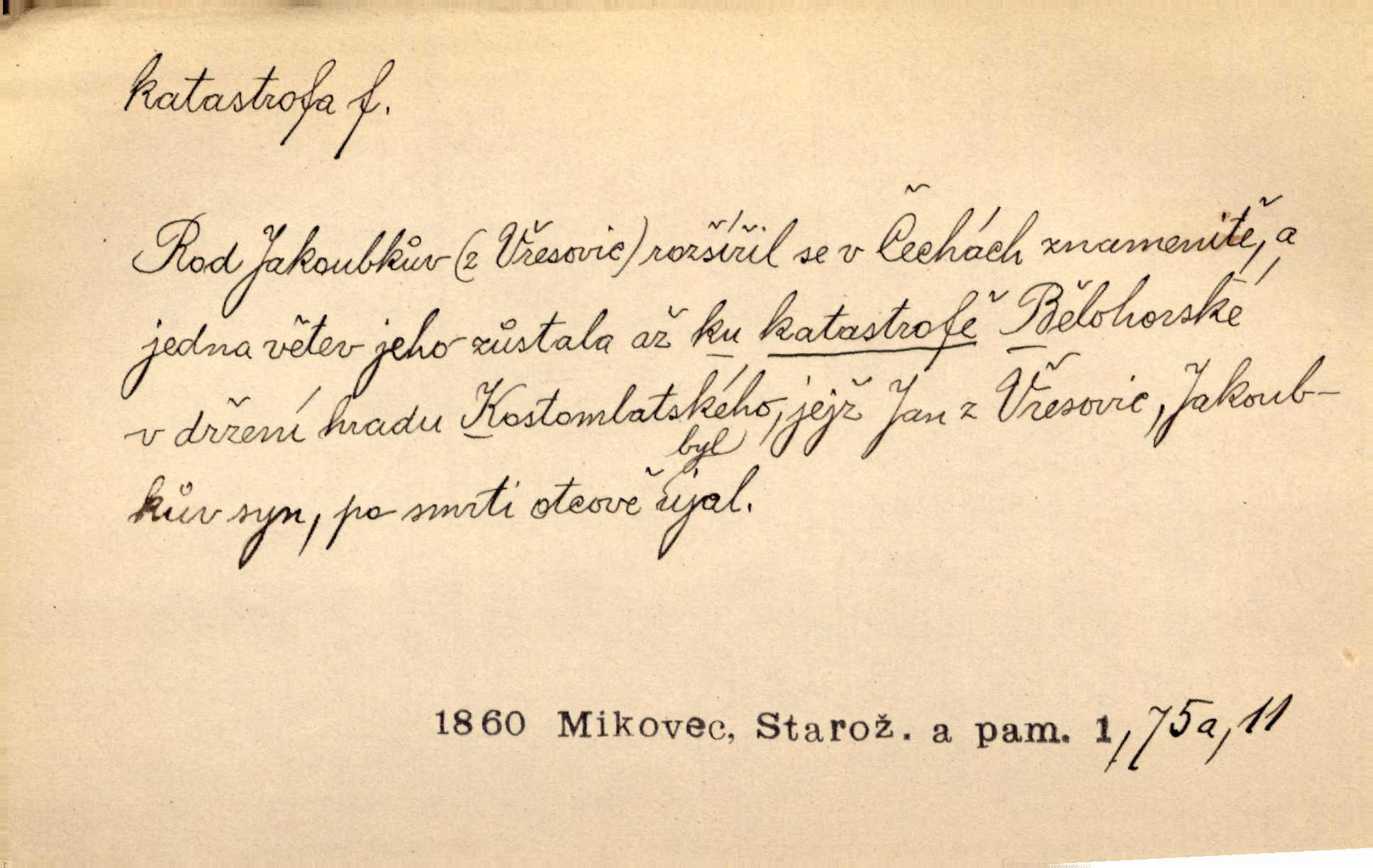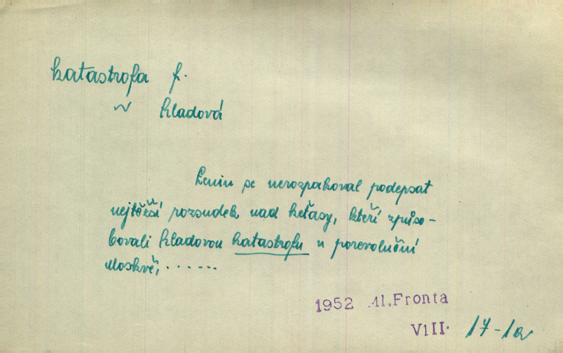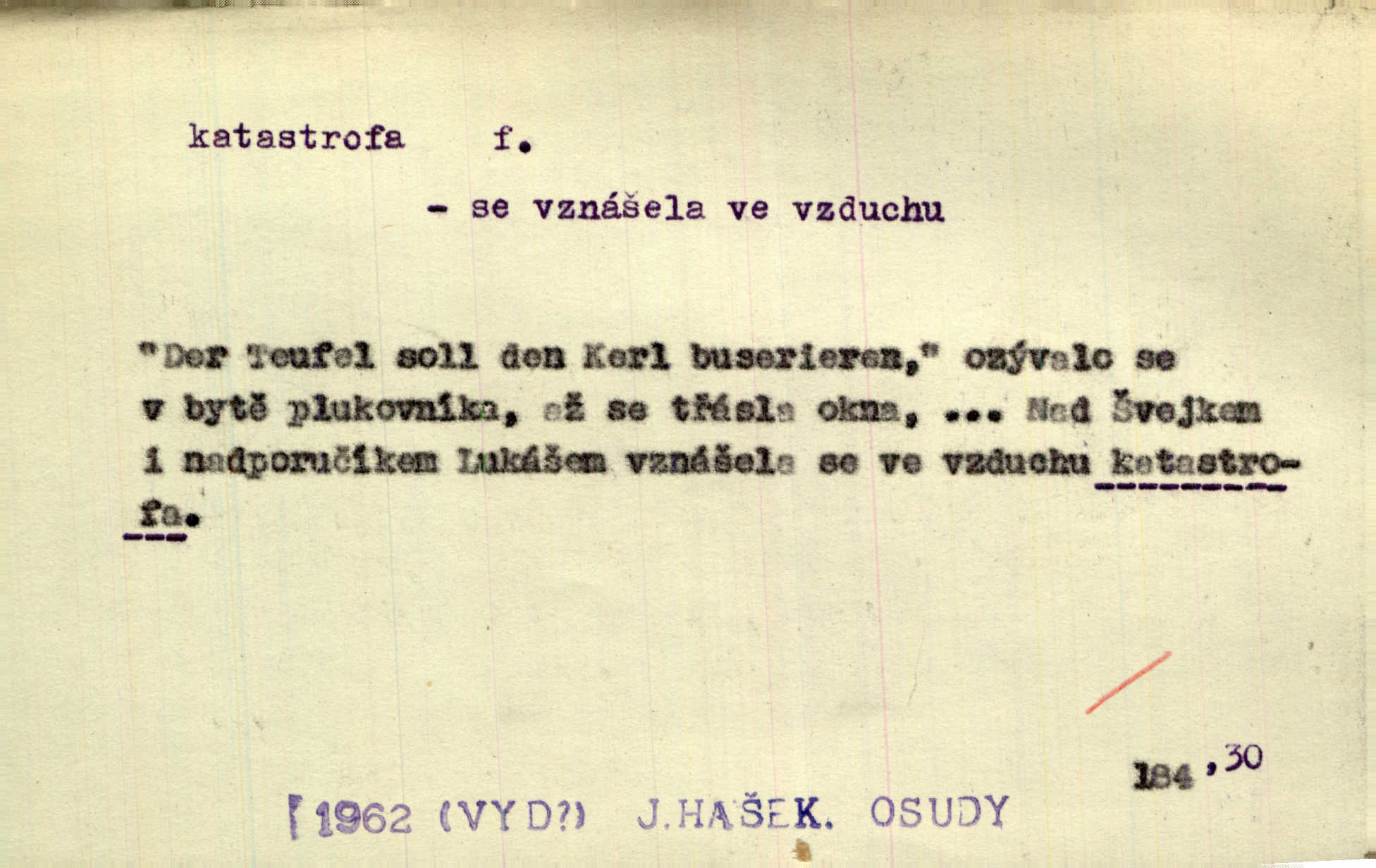 - katastrofa, -y f. velké, náhlé neštěstí, pohroma. Železniční, důlní katastrofa. Katastrofa Bělohorská měla v zápětí svém těžké pohromy pro náš národ. Tomek. Na italské frontě došlo ke katastrofě, která měla v zápětí naprostý rozklad armády. Vrba. A tak postihlo Jeníka několik katastrof. Tři čtyři známky objevily se u jeho jména v zápisnících profesorů. Šrám. Lit. tragické rozuzlení děje v dramatu. Třetí akt s katastrofou i zakončením úplně činí zadost theorii dramatu. Durd.