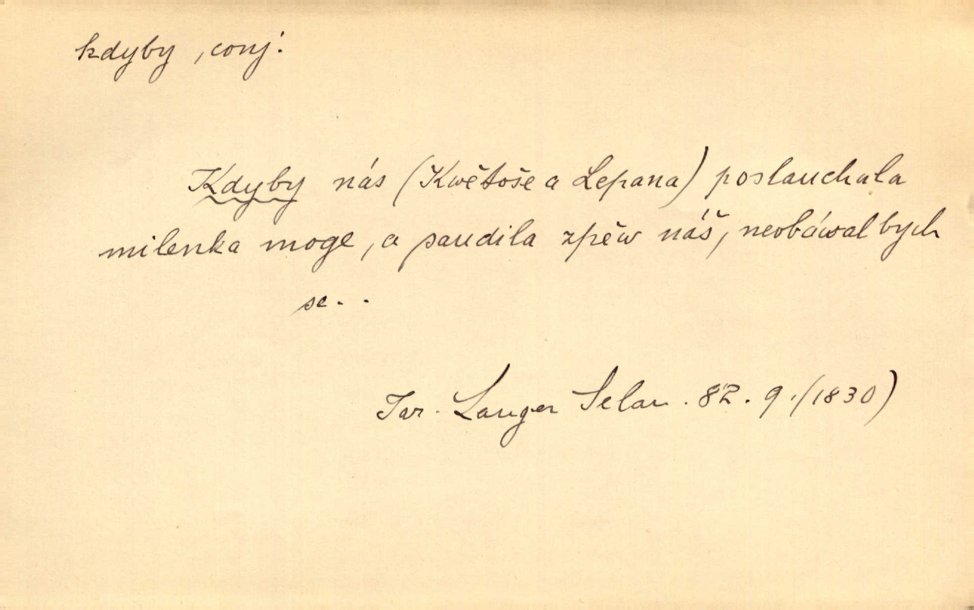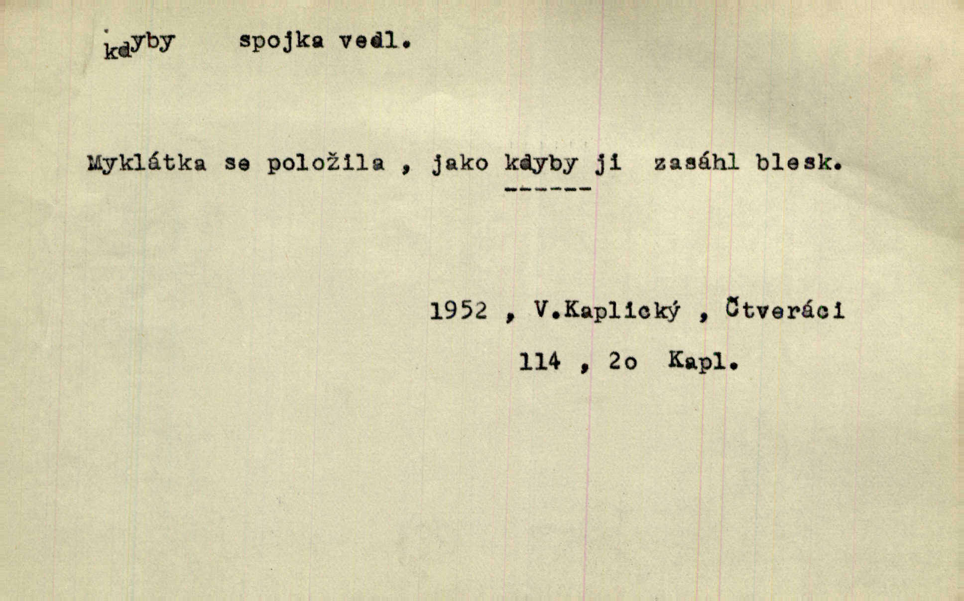 - kdyby sp. (při slovese v 1. os. kdybych, v 2. kdybys, v 3. kdyby, 1. pl. kdybychom, v 4. kdybyste, v 3. kdyby) uvádí věty zvolací vyjadřující možnost nějakého děje. Ó kdybyste věděla, jak já jsem nešťastný! Mácha. Kdybyste ho [syna] byla viděla, kterak byl pěkný jako růže, zrostlý jak panna. Něm. Tady je nevěst až nazbyt, jen kdybyste chtěl. Sab. „Kdyby J. Milost věděla, jak mu plašíš zvěř!“ hrozil žertovně Bernášek. Jir. D uvádí hlavní věty vyjadřující obavy ze splnění n. nesplnění nějaké možnosti. Ale kdyby se probudil — a dlouholi může ještě spáti? — a vyšel ven — nedopouštěj Bůh! Klicp. [Selka má špinavé ruce:] Vždyť se umeju [Sedlák:] Umeju! Kdyby to pustilo! bojím se, že to nepustí. Svob. D uvádí hlavní věty vyjadřující přání po splnění něčeho. Vypukl [doktor] v trpká slova: „Kdybych měl na světě s kým se poradit!“ Podl. Jen kdyby Štěpka byl už co nejdříve zdráv! Pech. I kdyby juž bylo po svadbě. Klicp. Kdyby to Pán Bůh dal! Klicp. D uvádí věty vyjadřující mírný rozkaz. I s vámi je řeč — kdybyste se radši pomodlili, starý jste na to dost! Rais. Kdybyste mi tak ty adresy chtěl dát a nějaké doporučení na zámožnější rodiny zdejší. Mach. Kdybysi raději mlčela! Šmil. „Kdybys byl tak dobrý a dovedl nás k nebožce,“ zase řekla Mezulánice. Rais. „Pánové, jak pak, kdybychom začali?“ Ner. Hnus? Kdybys nemluvil, Antoníne! Čap. Ch. D uvádí děj své věty ve vztah k větě řídící a označuje jej jako žádoucí n. možný. Jak často byla zatoužila, kdyby jí bylo aspoň popřáno bývalo sloužiti mu v poslední jeho hodince. Svět. [Policie] prohledala cesty, skrýše a vesnice, kdyby se tu snad skrývaly podezřelé osoby. Herb. D uvádí vedlejší věty vyjadřující neskutečnou podmínku věty řídící. Kdyby uměl blázen mlčeti, při mudrcích by mohl seděti. Přísl. Kdybych štětcem mistrně vládnouti znala, oslavila bych tě, milá babičko, jinak. Něm. Kdyby nebylo kdyby, nebylo by chyby. Kdyby kdyby nebylo, všecko by dobře bylo. Pořek. Kdyby jsou chyby. Pořek. D kdyby, i kdyby, zř. a kdyby vyjadřuje přípustku, byť i. Taková kráva [cucaná hadem] nedá prý se již doma podojiti, kdyby ji tloukl. Něm. Obec jich [Hrabcovic] nesmí přijat mezi sebe, kdyby co! Herb. Ode dneška ani jednomu [nemocnému] nepomohu, kdybych ho mohla lžicí vody spasiti. Třeb. Bůh chraň, aby viděla [babička]‚ že kdo týrá zbytečně, i kdyby to červíčka bývalo. Něm. A kdybys byl jako Slunce stár, nedomyslíš se konců! Ner. No a kdyby! Ať si vezmou moje špinavé prádlo. Pfleg.