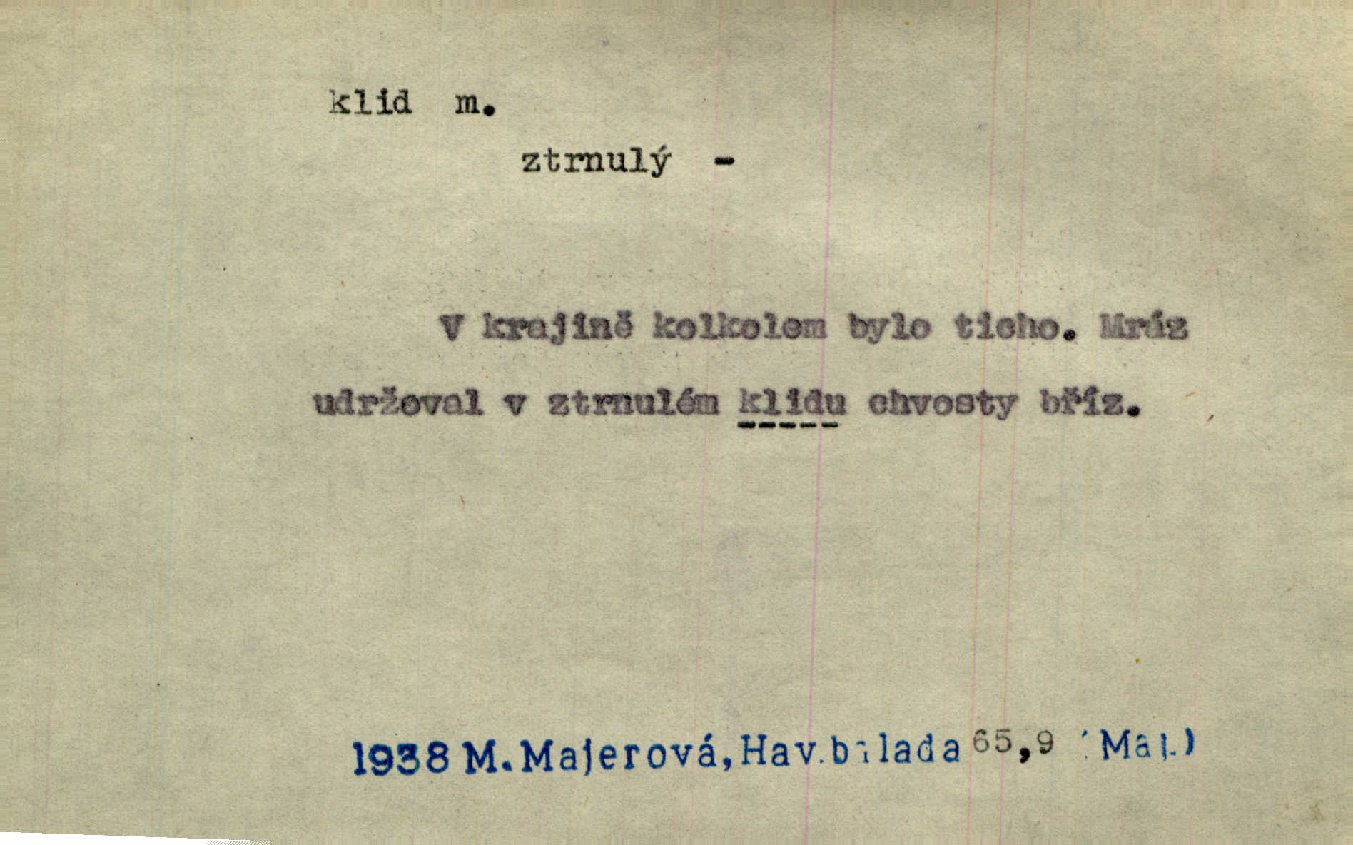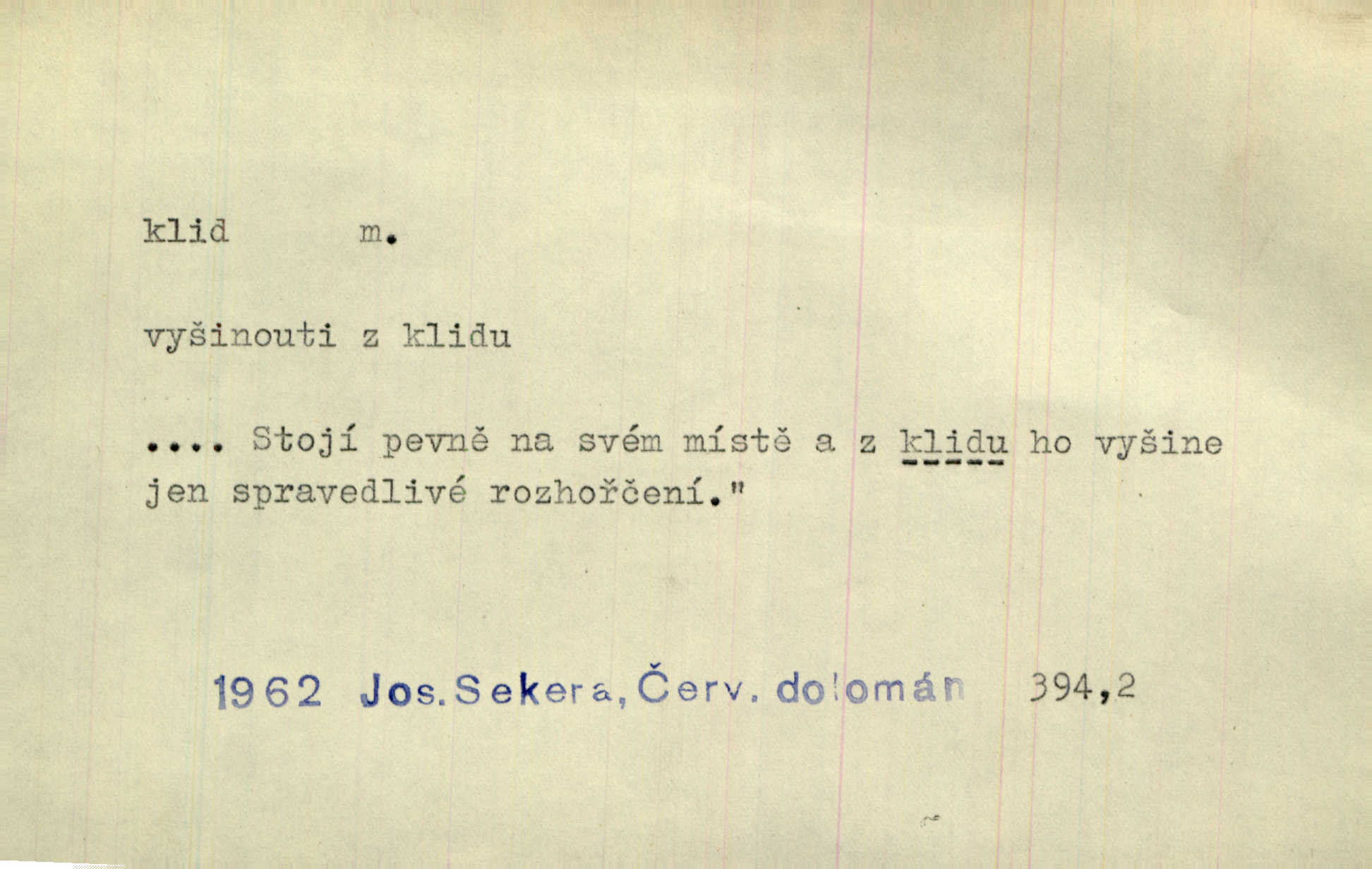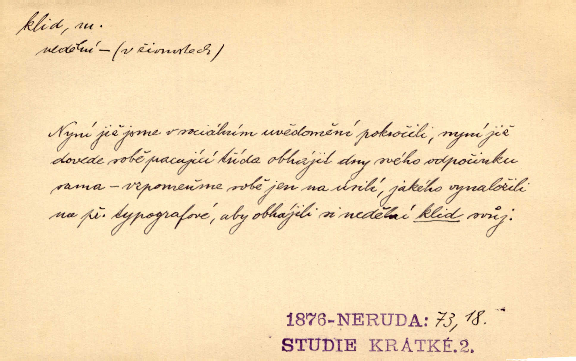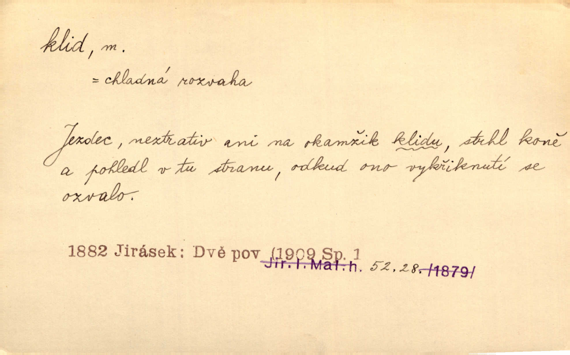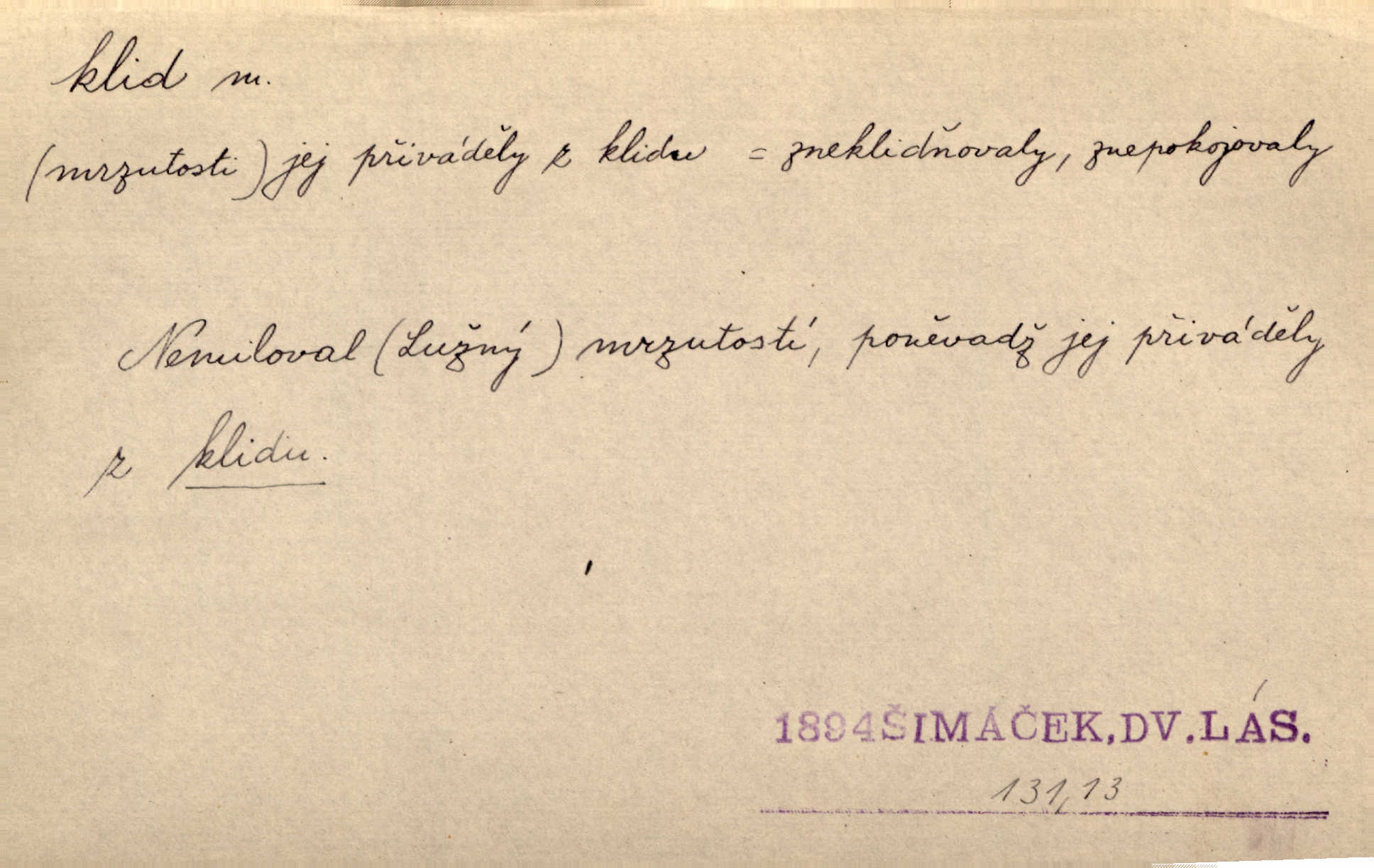 - klid, -u m. nehybnost, nečinnost, odpočinek, pokoj, ticho. Stálý klid bez namáhání se zhnusí každému. Durd. Po jarmarečních dnech nastal v Rakovníce zase klid. Win. Vévoda potřebuje pro jednání s Švédskem a Francií klidu zbraní, rozhodl se pro příměří. Pek. Mluvil s kazatelny proti rušení klidu nedělního. Baar. Noční kolem rozproudil se klid. Mácha. Fys. vlastnost tělesa, že nemění svou polohu (op. pohyb). Úř. klid nedělní a sváteční zákonem upravené zastavení živnostenské práce v určité dny. Práv. klid řízení po dohodnutí sporných stran, aby se ve sporu zatím nepokračovalo. Těl. cvičení na kruzích v klidu (op. v hupu). D klidnost, nevzrušenost, chladná mysl. Nemiloval mrzutostí, poněvadž jej přiváděly z klidu. Šim. Hovořil s největším klidem. Rais. Jezdec, neztrativ ani okamžik klidu, strhl koně. Jir. V nitru jeho se uhostil klid. Jir. Lit. epický klid objektivnost výpravného básníka. Epický klid vládne jeho [Úprkovými] obrazy. V. Mrš. Stoický klid. S klidem Angličana. Us.