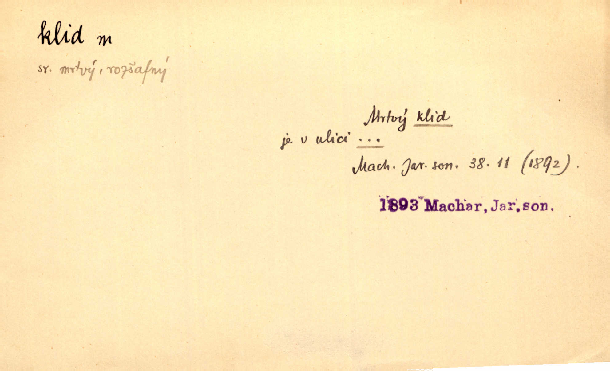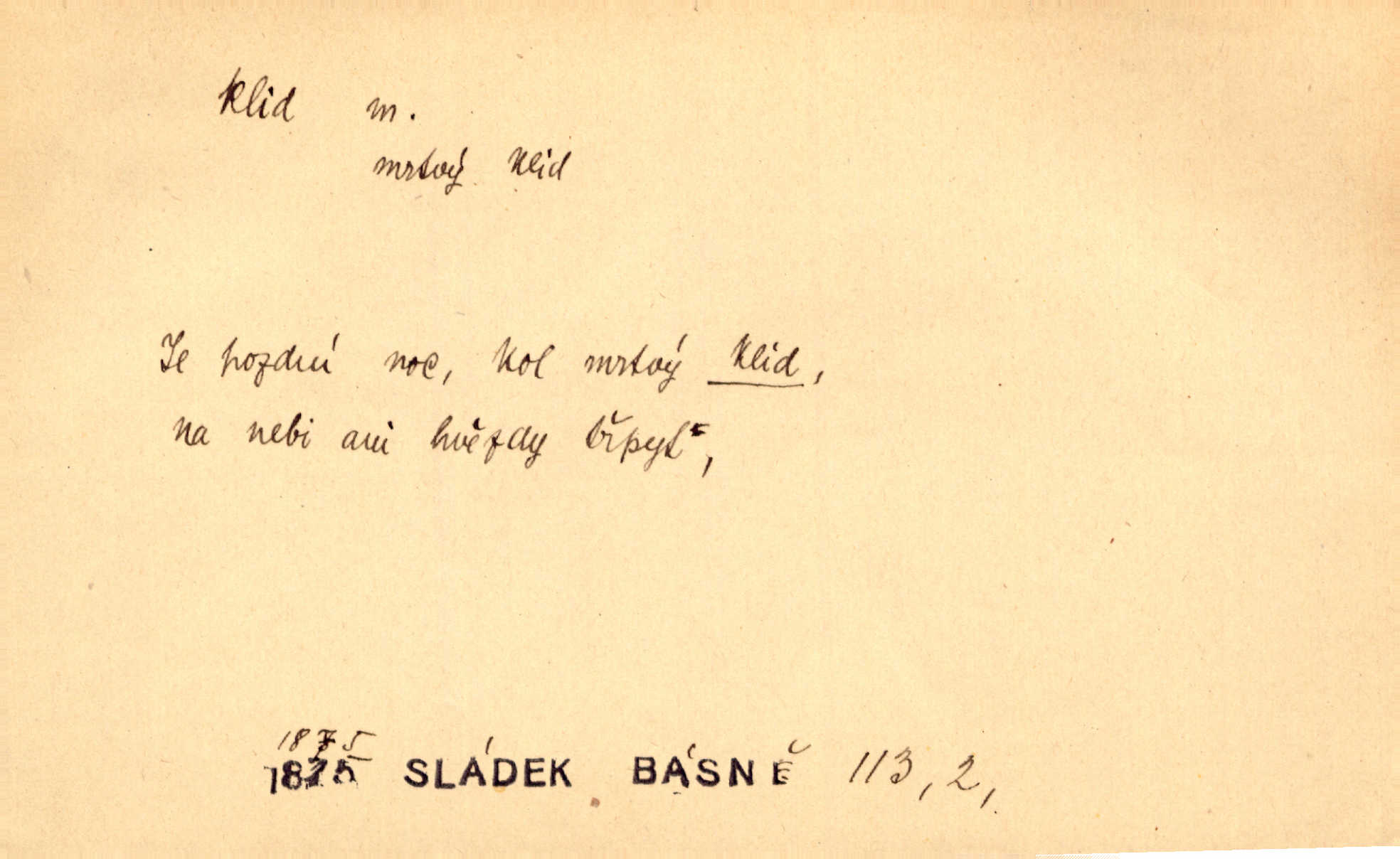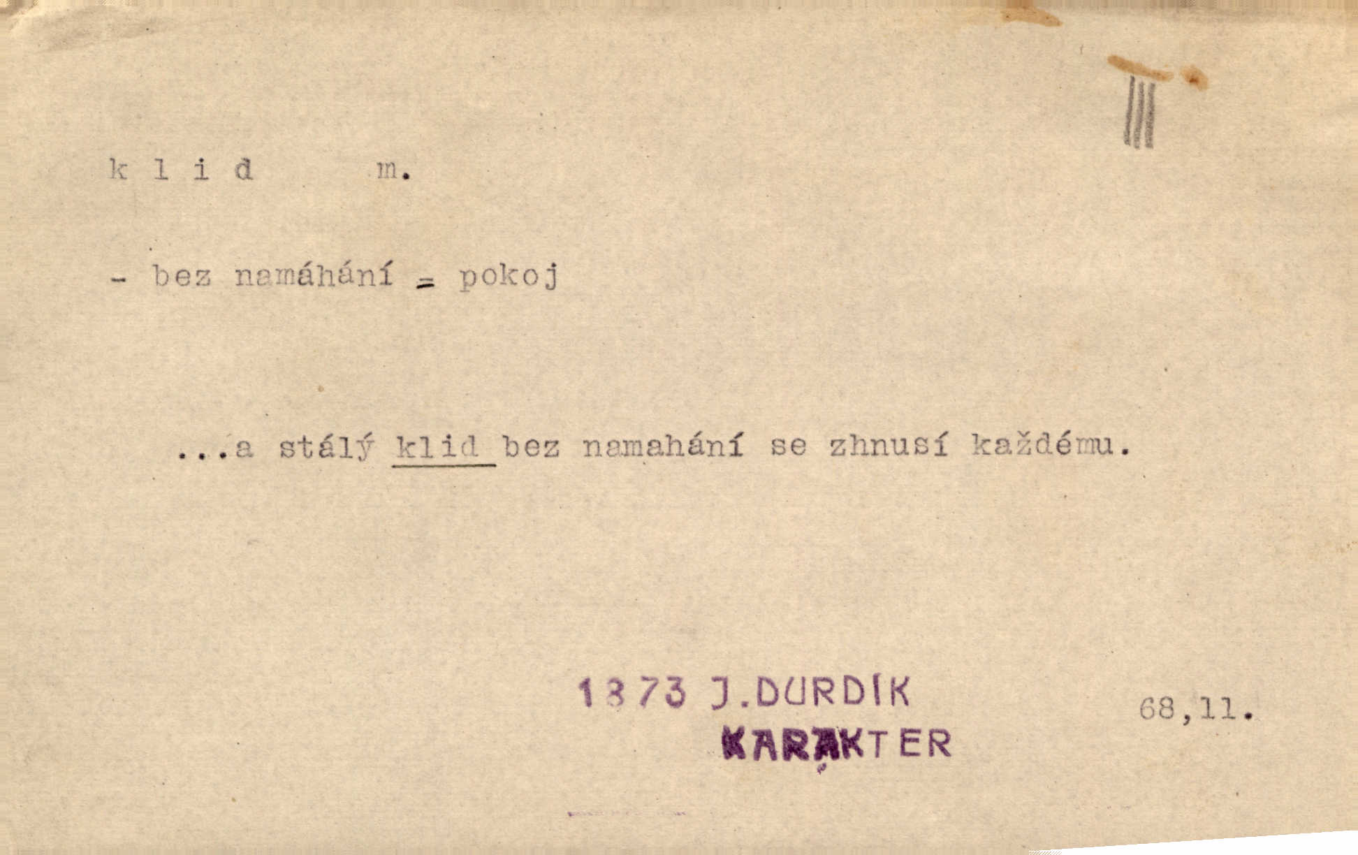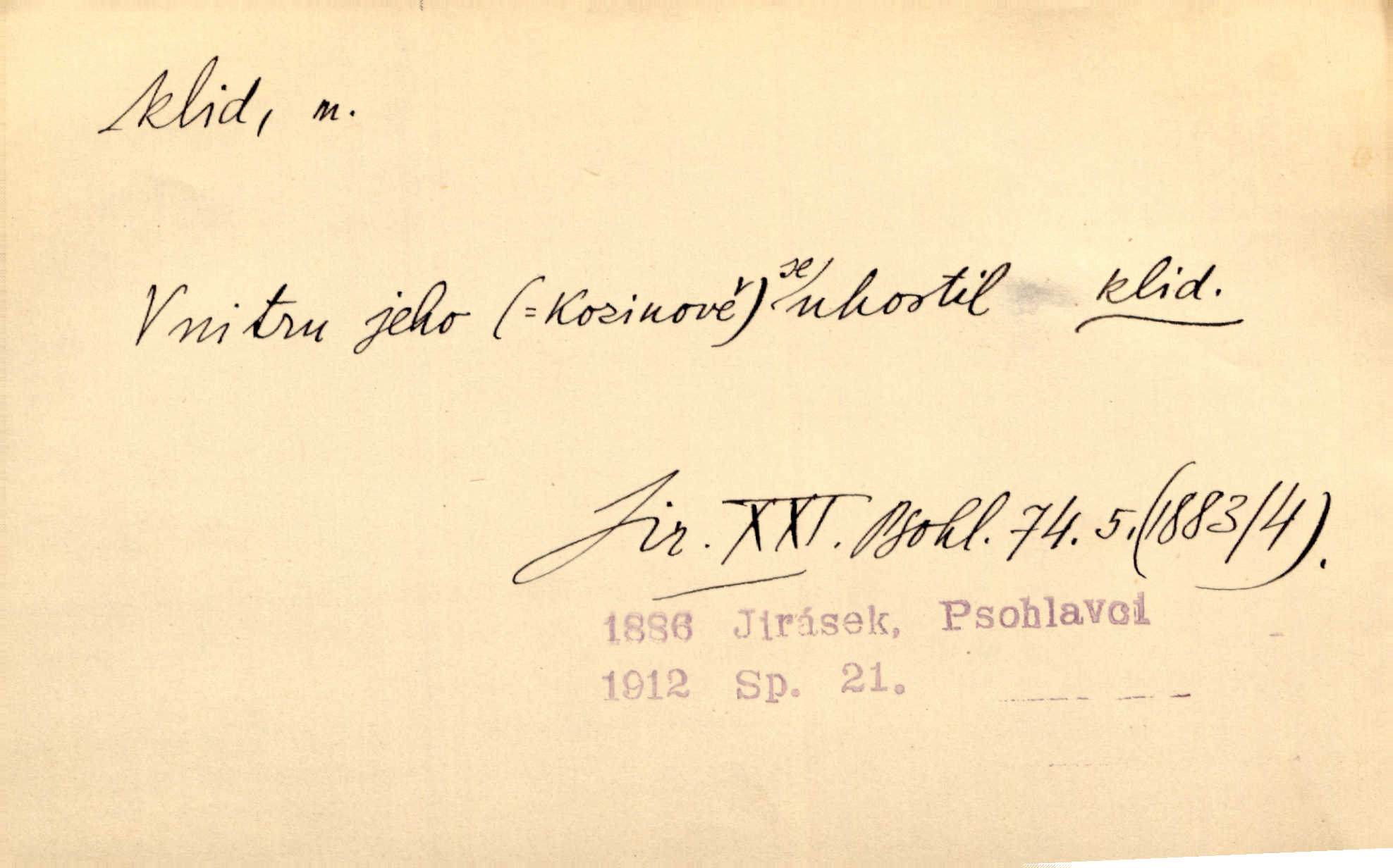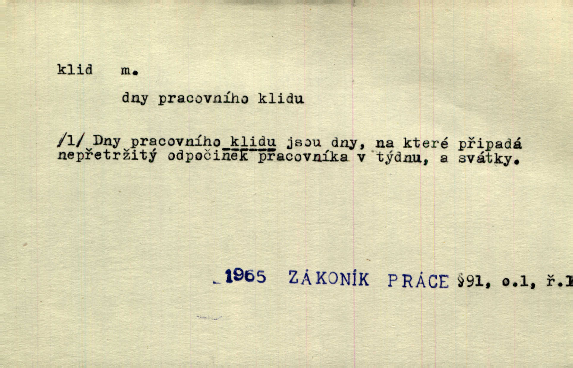 - klid, -u m. nehybnost, nečinnost, odpočinek, pokoj, ticho. Stálý klid bez namáhání se zhnusí každému. Durd. Po jarmarečních dnech nastal v Rakovníce zase klid. Win. Vévoda potřebuje pro jednání s Švédskem a Francií klidu zbraní, rozhodl se pro příměří. Pek. Mluvil s kazatelny proti rušení klidu nedělního. Baar. Noční kolem rozproudil se klid. Mácha. Fys. vlastnost tělesa, že nemění svou polohu (op. pohyb). Úř. klid nedělní a sváteční zákonem upravené zastavení živnostenské práce v určité dny. Práv. klid řízení po dohodnutí sporných stran, aby se ve sporu zatím nepokračovalo. Těl. cvičení na kruzích v klidu (op. v hupu). D klidnost, nevzrušenost, chladná mysl. Nemiloval mrzutostí, poněvadž jej přiváděly z klidu. Šim. Hovořil s největším klidem. Rais. Jezdec, neztrativ ani okamžik klidu, strhl koně. Jir. V nitru jeho se uhostil klid. Jir. Lit. epický klid objektivnost výpravného básníka. Epický klid vládne jeho [Úprkovými] obrazy. V. Mrš. Stoický klid. S klidem Angličana. Us.