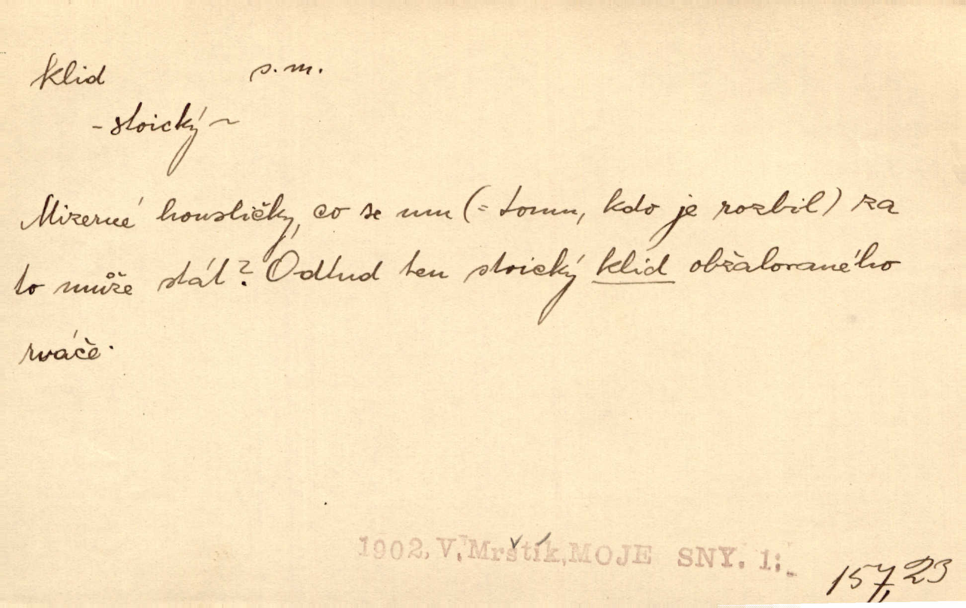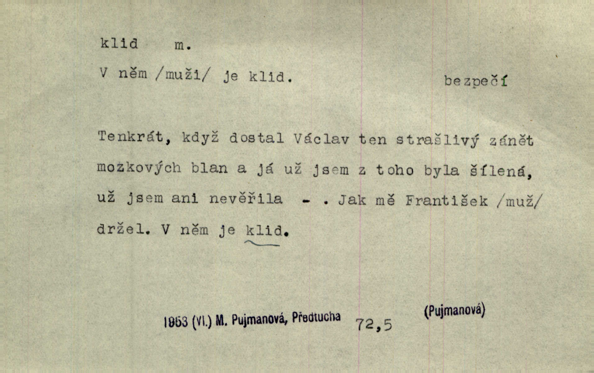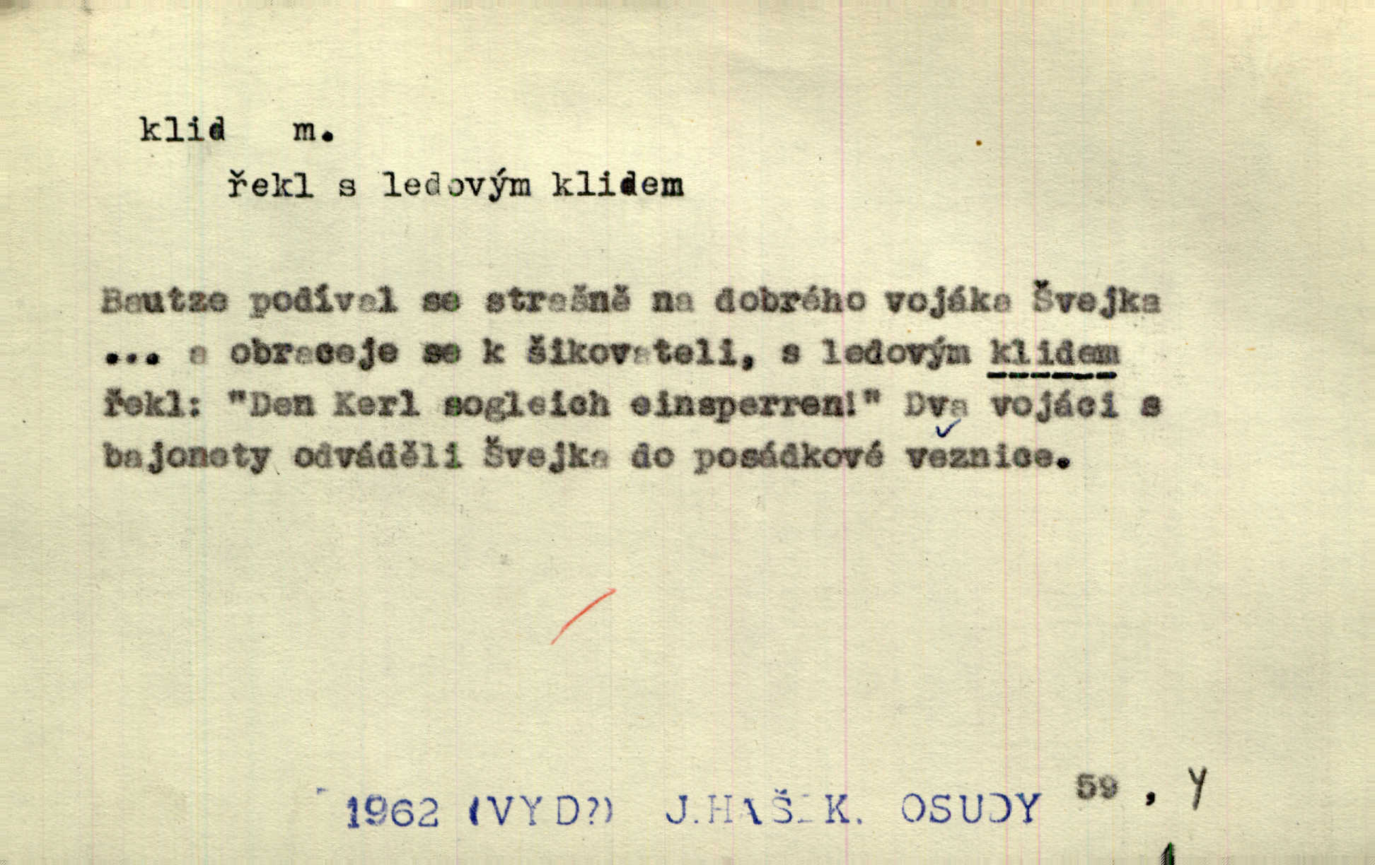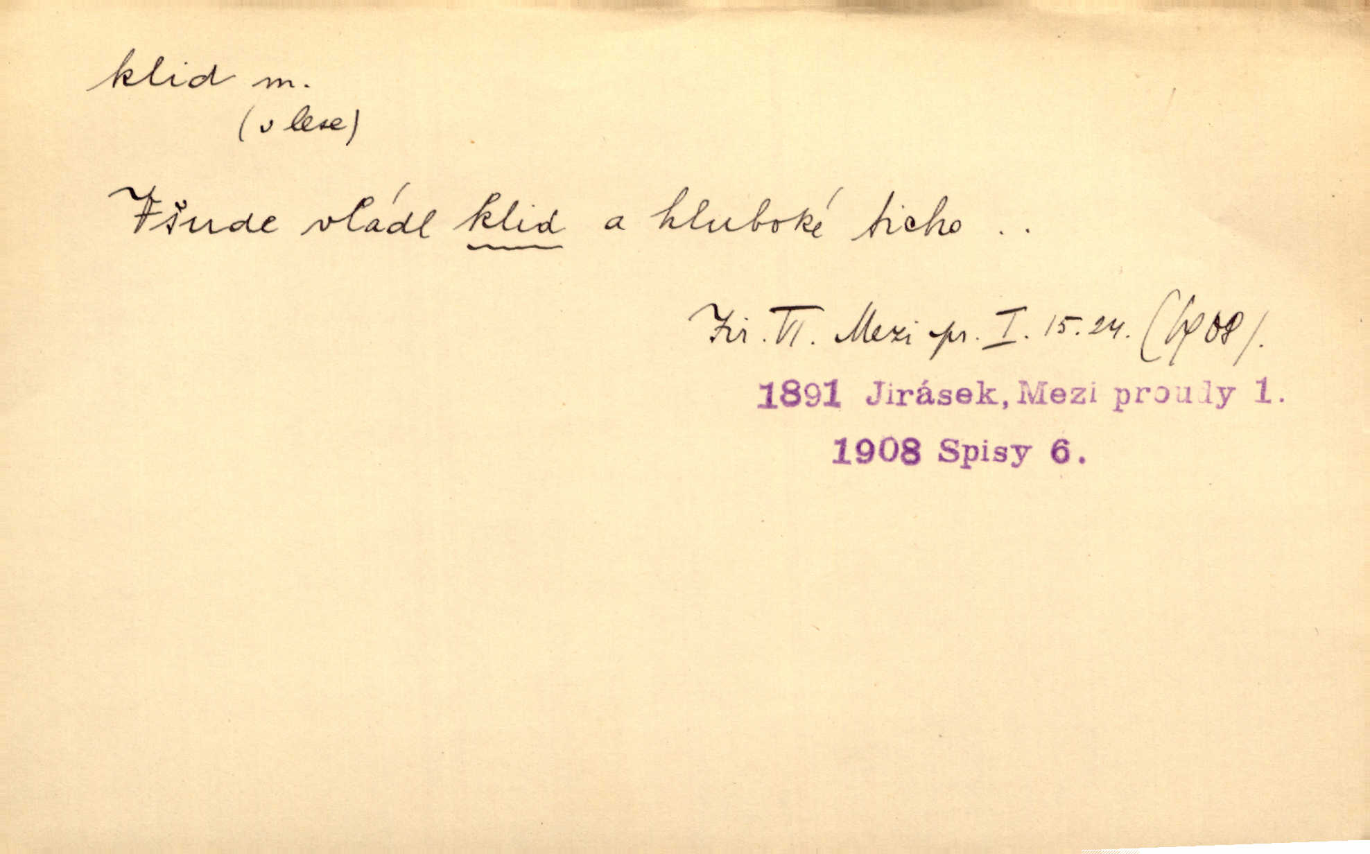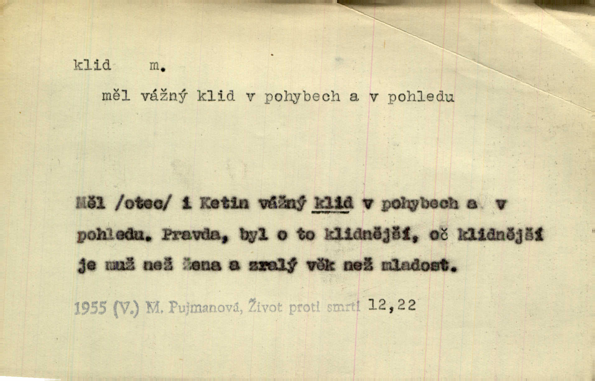 - klid, -u m. nehybnost, nečinnost, odpočinek, pokoj, ticho. Stálý klid bez namáhání se zhnusí každému. Durd. Po jarmarečních dnech nastal v Rakovníce zase klid. Win. Vévoda potřebuje pro jednání s Švédskem a Francií klidu zbraní, rozhodl se pro příměří. Pek. Mluvil s kazatelny proti rušení klidu nedělního. Baar. Noční kolem rozproudil se klid. Mácha. Fys. vlastnost tělesa, že nemění svou polohu (op. pohyb). Úř. klid nedělní a sváteční zákonem upravené zastavení živnostenské práce v určité dny. Práv. klid řízení po dohodnutí sporných stran, aby se ve sporu zatím nepokračovalo. Těl. cvičení na kruzích v klidu (op. v hupu). D klidnost, nevzrušenost, chladná mysl. Nemiloval mrzutostí, poněvadž jej přiváděly z klidu. Šim. Hovořil s největším klidem. Rais. Jezdec, neztrativ ani okamžik klidu, strhl koně. Jir. V nitru jeho se uhostil klid. Jir. Lit. epický klid objektivnost výpravného básníka. Epický klid vládne jeho [Úprkovými] obrazy. V. Mrš. Stoický klid. S klidem Angličana. Us.