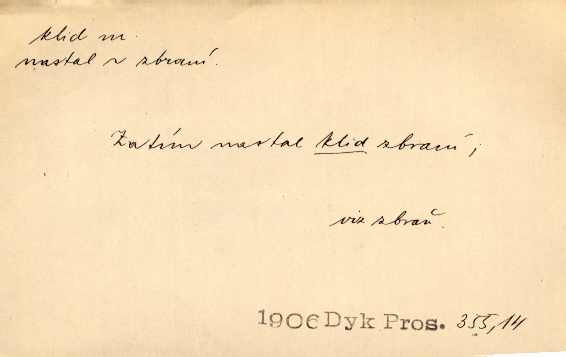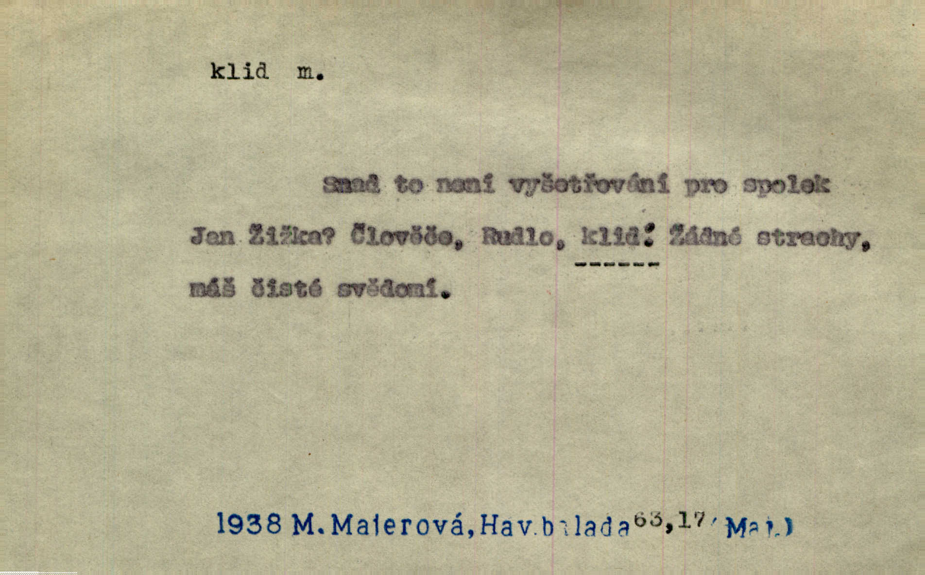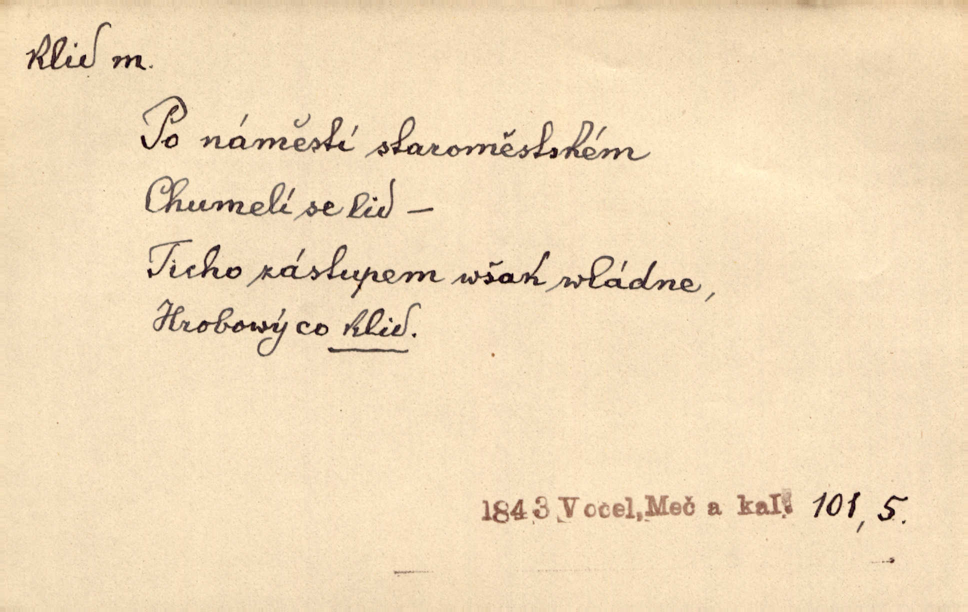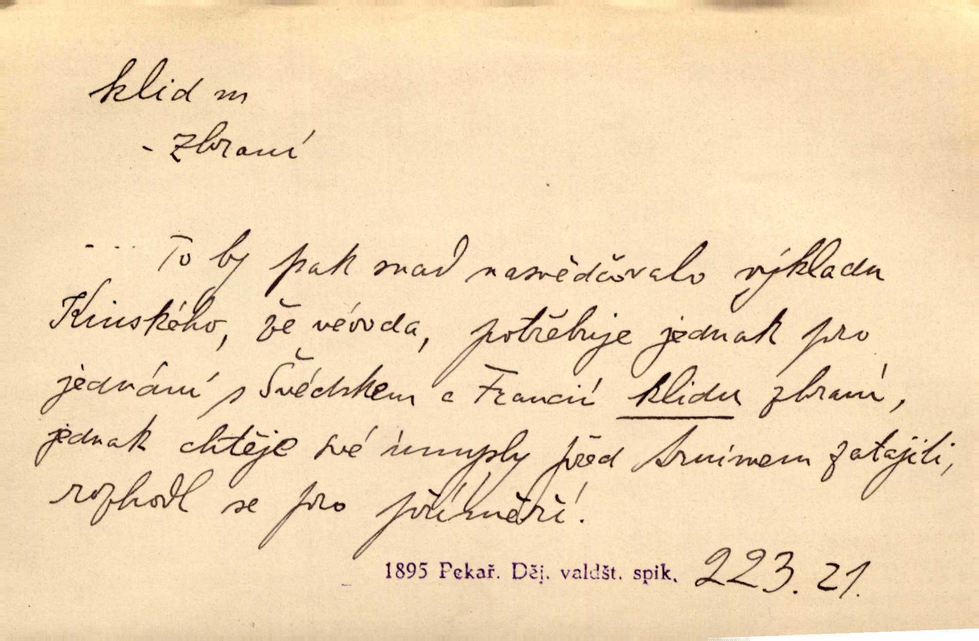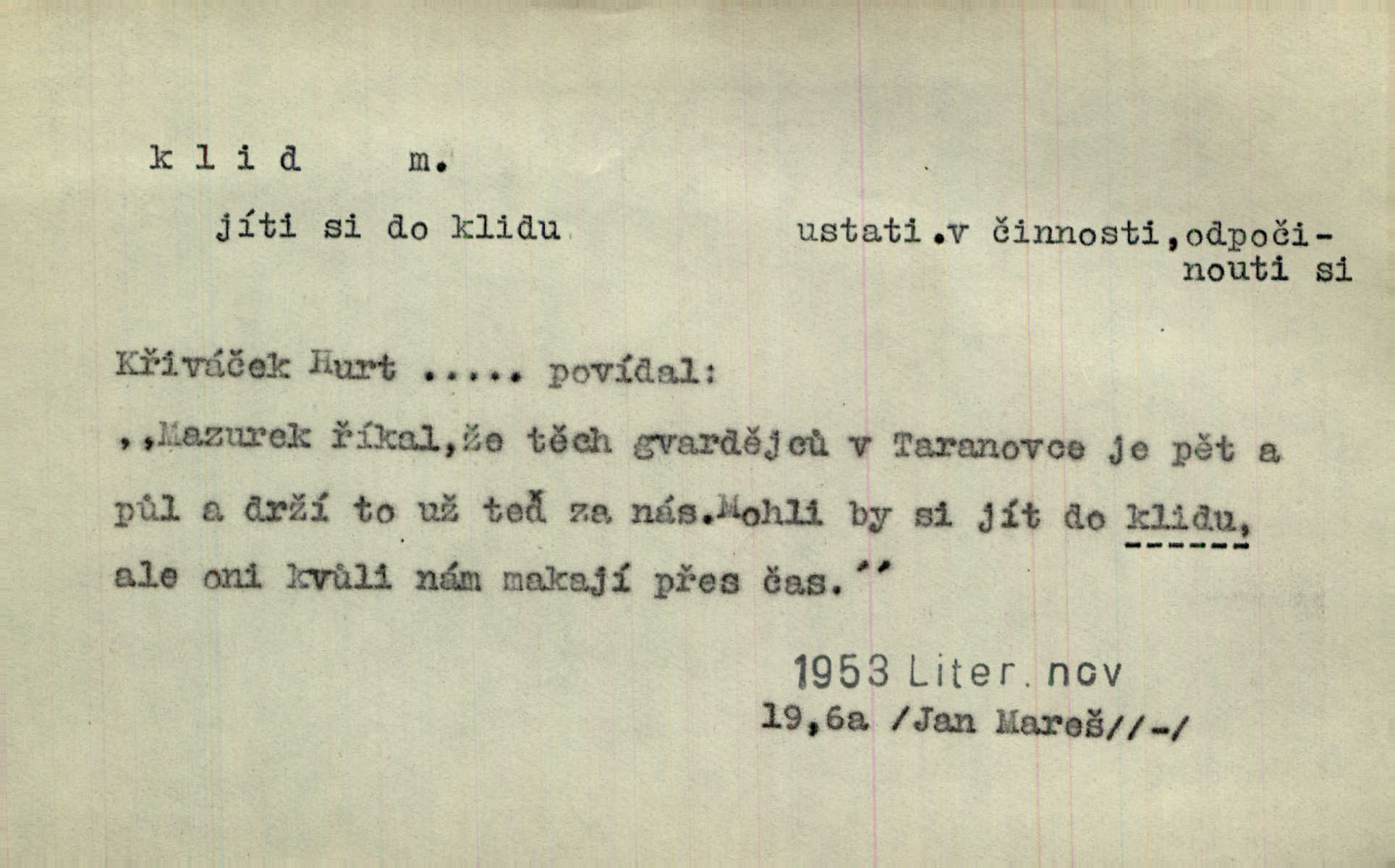 - klid, -u m. nehybnost, nečinnost, odpočinek, pokoj, ticho. Stálý klid bez namáhání se zhnusí každému. Durd. Po jarmarečních dnech nastal v Rakovníce zase klid. Win. Vévoda potřebuje pro jednání s Švédskem a Francií klidu zbraní, rozhodl se pro příměří. Pek. Mluvil s kazatelny proti rušení klidu nedělního. Baar. Noční kolem rozproudil se klid. Mácha. Fys. vlastnost tělesa, že nemění svou polohu (op. pohyb). Úř. klid nedělní a sváteční zákonem upravené zastavení živnostenské práce v určité dny. Práv. klid řízení po dohodnutí sporných stran, aby se ve sporu zatím nepokračovalo. Těl. cvičení na kruzích v klidu (op. v hupu). D klidnost, nevzrušenost, chladná mysl. Nemiloval mrzutostí, poněvadž jej přiváděly z klidu. Šim. Hovořil s největším klidem. Rais. Jezdec, neztrativ ani okamžik klidu, strhl koně. Jir. V nitru jeho se uhostil klid. Jir. Lit. epický klid objektivnost výpravného básníka. Epický klid vládne jeho [Úprkovými] obrazy. V. Mrš. Stoický klid. S klidem Angličana. Us.
