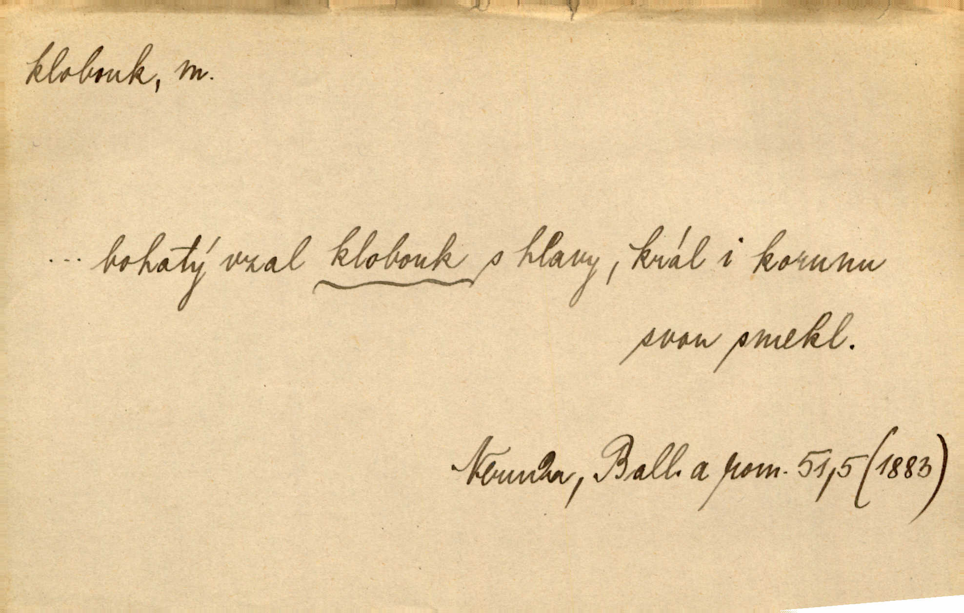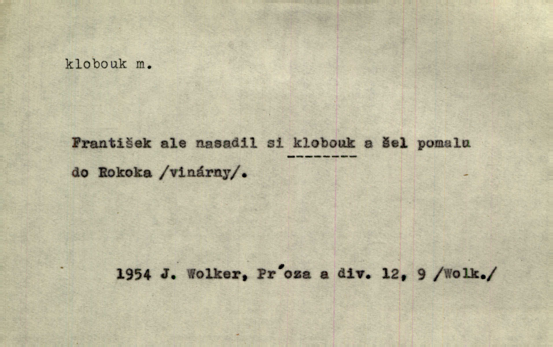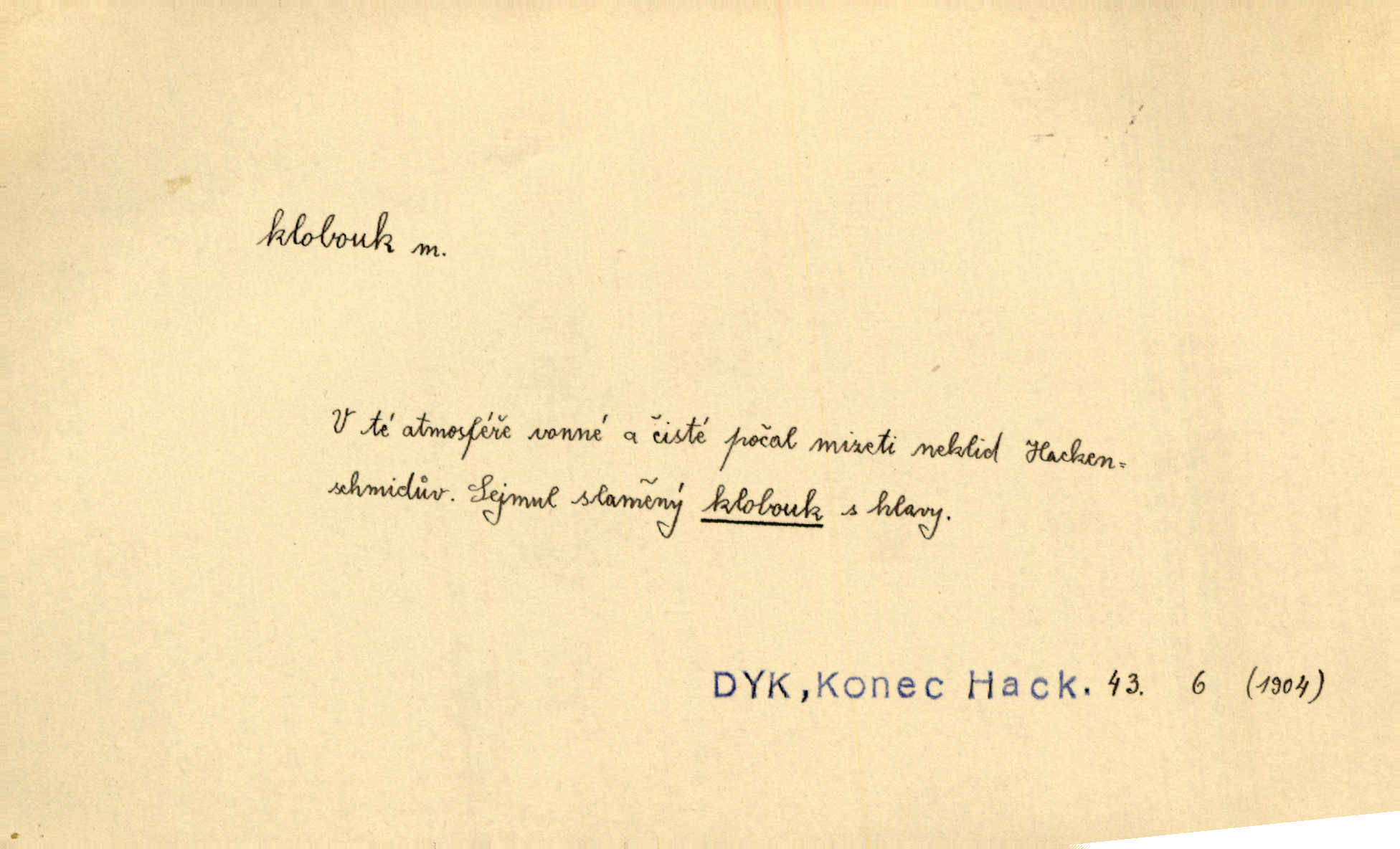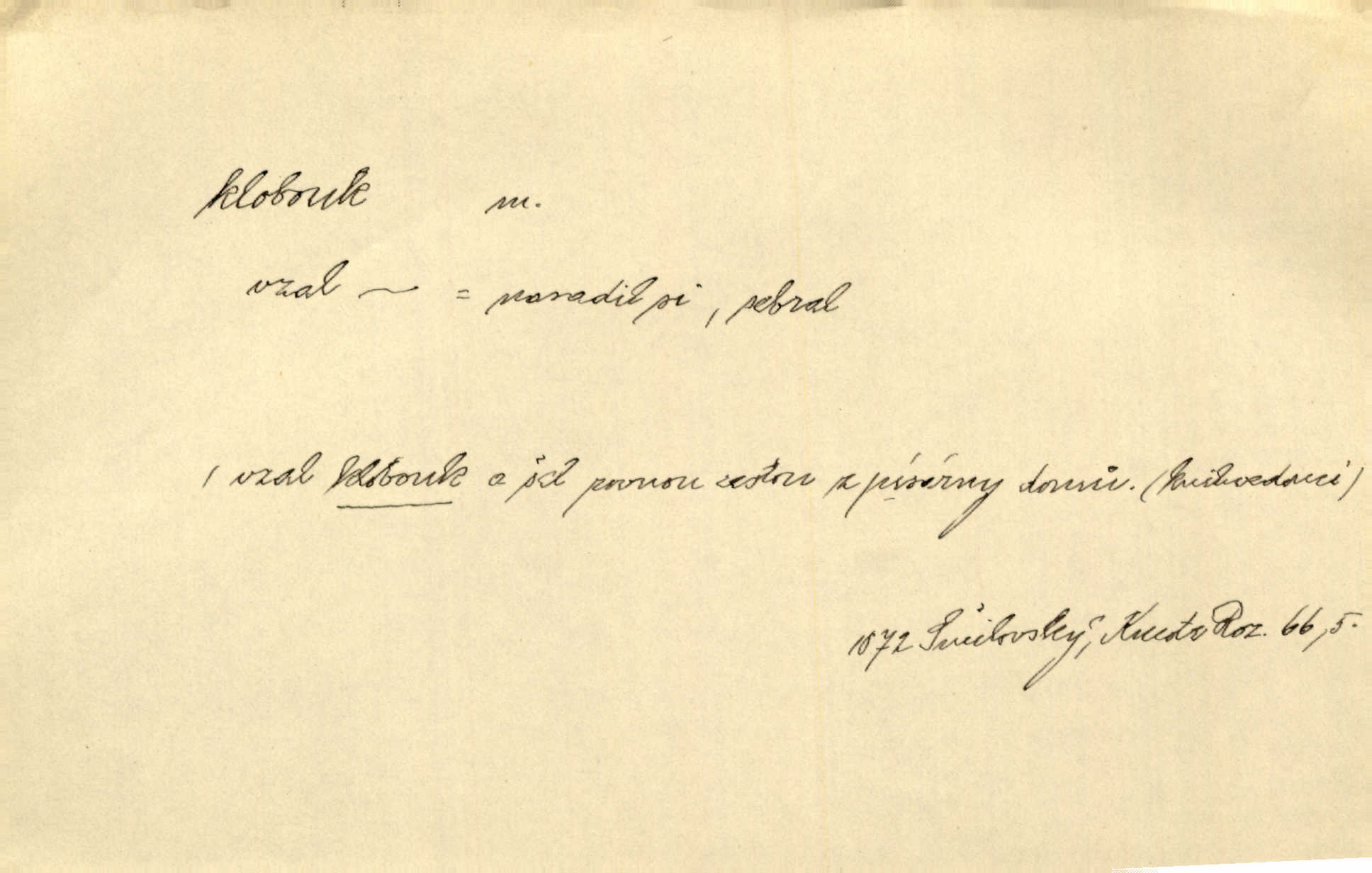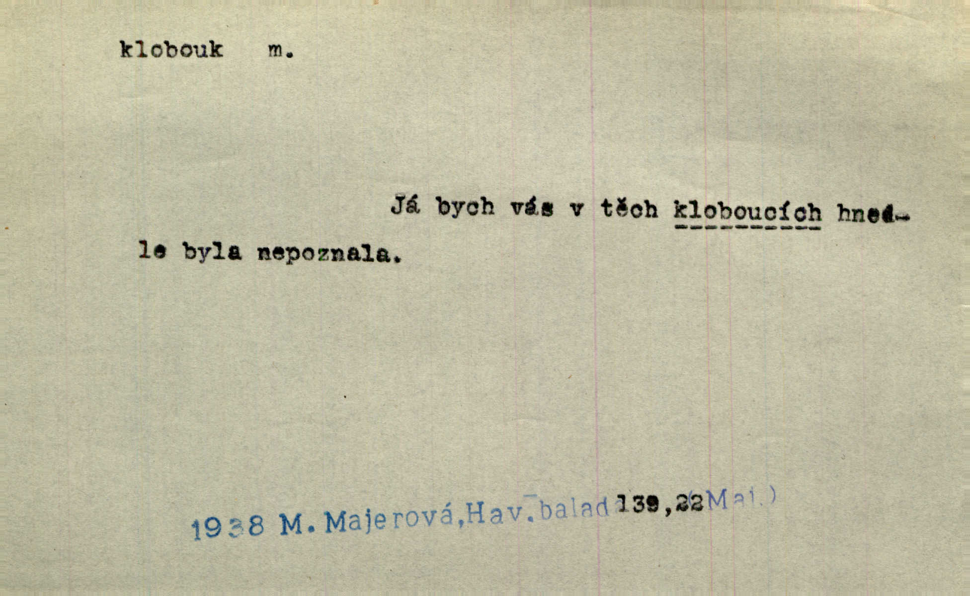 - klobouk, -u m. u mužů pokrývka hlavy z tužší látky (plsti, slámy a p.) se střechou; u žen jakákoli tužší pokrývka hlavy. I pod ošumělým kloboukem moudrá hlava bývá. Přísl. Husté vlasy hrnuly se zpod klobouka. Šmil. Klobouk měl hluboko do očí vtlačený. Štěp. [Služka:] Já teď budu nosit klobouky. Baar. Měla klobouk jako slepičí kukaň. Jir. Každý, kdo mimo jde, snímá před ním klobouk uctivě ho pozdravuje. Šmil. [Člověk zdvořilý] div kloboukem svým nezametl chodníku přede mnou. Kam. Tvrdý, černý klobouk s dírkou. V. Mrš. Měkký, plstěný, slaměný klobouk. Zelený myslivecký klobouk. Pfleg. Kulatý slovanský klobouk opíral se mu o levé ucho. Kun. Mohs získat snadno klobouk admirála státi se admirálem. Mach. [Řím] zdráhá se uděliti mu klobouk kardinálský hodnost kardinálskou. Mach. Arch. Ti officiálové chodí pod kloboukem a umějí leccos latině blektati nosí klobouk značící universitní hodnost. Win. O nepodajnou řečtinu a latinu rozbily se hrdé naděje v doktorský klobouk. Čech. [Důstojníci měli] černé klobouky třírohé, zlatem premované. Jir. Na hlavě měl dvourohý klobouk, jako loď. Klicp. Starý soused v klobouku na tři facky. Jir. Nerozumím modnímu střihu, mívám na sobě pomačkanou náprsenku, na kraji roztřepané manšety, klobouk na čtyři facky. Klost. [Ve Švédsku po smrti Karla XII.] usilovala šlechtická strana bojovná, t. zv. strana klobouků, o odvetu proti Rusku. Bidlo. Arch. Nový šalíř a dva železné klobouky druh přilbic. Jir. Mysl. Na lov nosil se sokol opatřený kuklí či kloboukem. A. Břez. Ustál. spoj. [Hercův výkon] vymáhá prostě úctu. Říká se tomu běžnou frásí: klobouk dolů! Čas. Nebudu se ani rmoutit, dám si klobouk na stranu. Rub. Pro jednu pannu klobouk na stranu netrápiti se a býti vesel. Pořek. Už měl trochu za kloboukem byl podnapilý. Herb. [Tkanička] maje již pod kloboukem, pořád se mezi ně [rozvaděné hosty] pletl v hlavě. Jir. Pod kloboukem mu strašilo mátl se na rozumu. Paleč. [Čtenář tohoto nesmyslu] nesoudil by nic jinak, než že brusičovi [oprávci jazyka] straší pod kloboukem nemá všech pět pohromadě. Kos. Však se to na dlouze neutají pod kloboukem neudrží v tajnosti. Obzor. Má vrchního pod kloboukem pro všechny případy zajištěna, v hrsti. Herb. Je to [intelektuálové] materiál velmi různorodý, který je těžko dostati pod jeden klobouk zorganisovati do jedné politické strany. Přít. Lepší hrst jistoty, než klobouk naděje mnoho. Tomsa. Úřad mu spadl jako hruška do klobouka dostalo se mu ho bez vlastního přičinění, náhodou. Herb. Svou duchovní svobodu může si dát za klobouk nic mu není platná. Přít. D věc tvarem podobná klobouku. Klobouk cukru homole. Vysoká čepice na způsob cukrového klobouku. Kram. [U kupce] pod skleněným kloboukem ukryt jest sýr poklopem. Prav. D vrchní část něčeho. Klobouk hutní peci, kovářské výhně. Tech. druh uzávěrky destilačních přístrojů, kapsle, kalota. Horn. železný klobouk oxydované pásmo rudných ložisek. Vin. (při kvašení vína) shluk pevných součástek matolin usazující se na povrchu kapaliny. Bot. část plodnice hub rouškatých. Červený klobouk muchomůrky. Pfleg.
