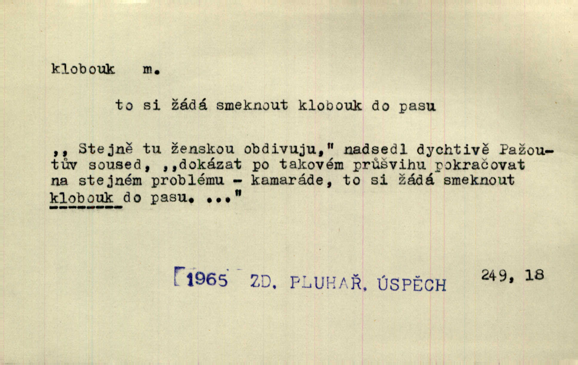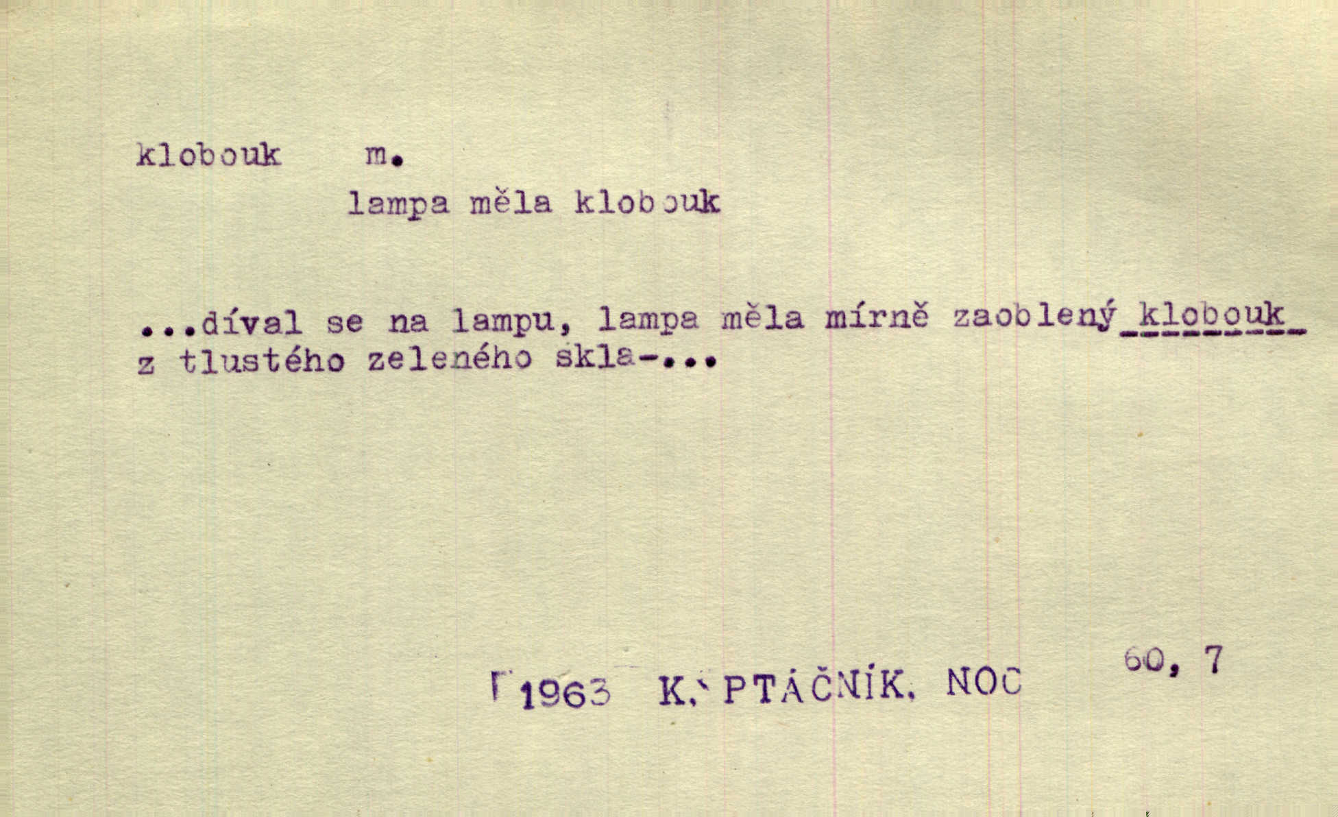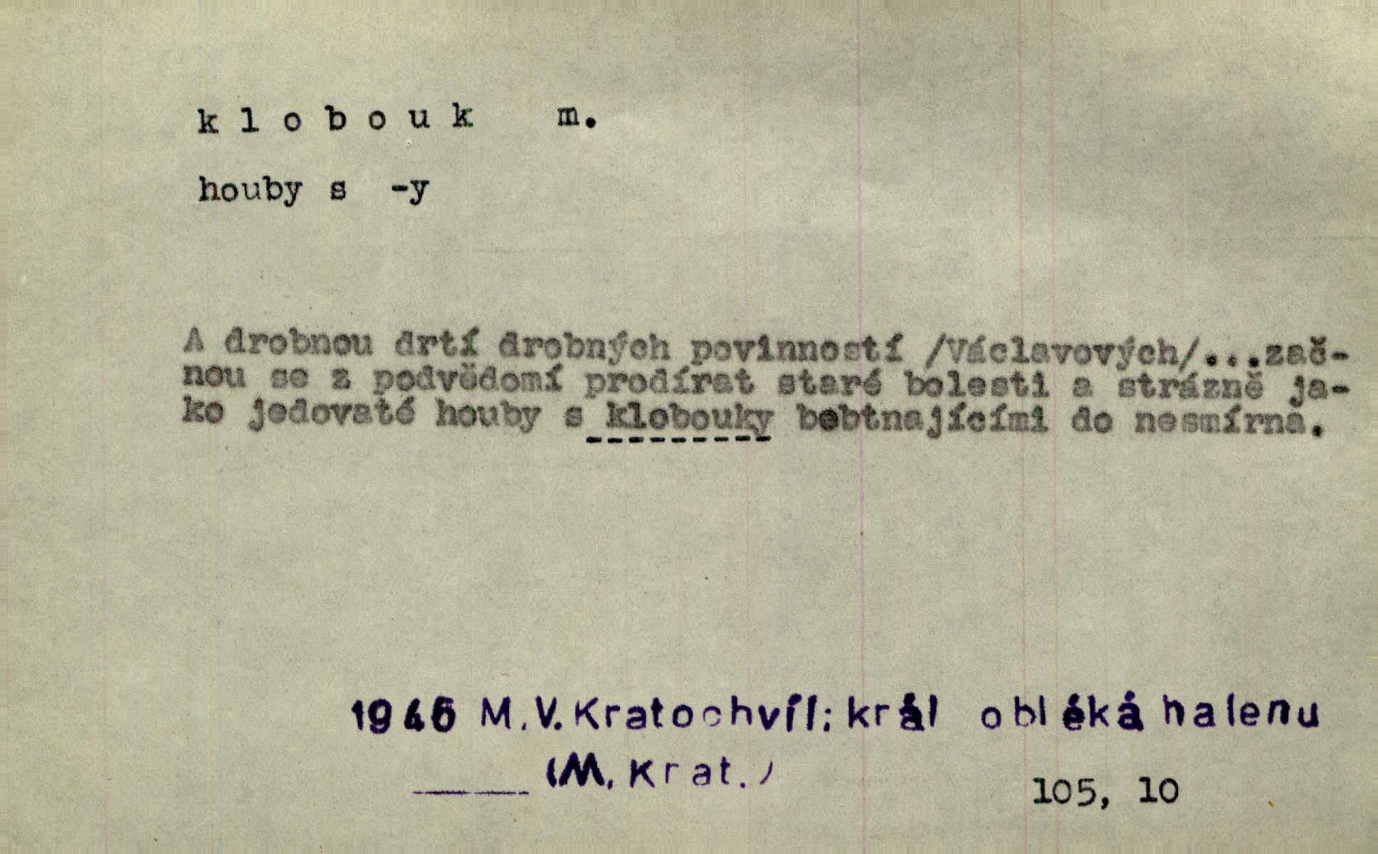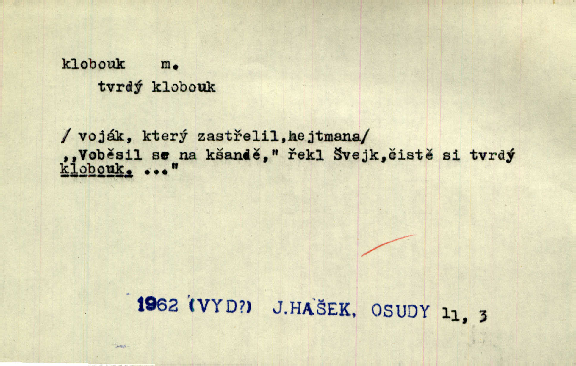 - klobouk, -u m. u mužů pokrývka hlavy z tužší látky (plsti, slámy a p.) se střechou; u žen jakákoli tužší pokrývka hlavy. I pod ošumělým kloboukem moudrá hlava bývá. Přísl. Husté vlasy hrnuly se zpod klobouka. Šmil. Klobouk měl hluboko do očí vtlačený. Štěp. [Služka:] Já teď budu nosit klobouky. Baar. Měla klobouk jako slepičí kukaň. Jir. Každý, kdo mimo jde, snímá před ním klobouk uctivě ho pozdravuje. Šmil. [Člověk zdvořilý] div kloboukem svým nezametl chodníku přede mnou. Kam. Tvrdý, černý klobouk s dírkou. V. Mrš. Měkký, plstěný, slaměný klobouk. Zelený myslivecký klobouk. Pfleg. Kulatý slovanský klobouk opíral se mu o levé ucho. Kun. Mohs získat snadno klobouk admirála státi se admirálem. Mach. [Řím] zdráhá se uděliti mu klobouk kardinálský hodnost kardinálskou. Mach. Arch. Ti officiálové chodí pod kloboukem a umějí leccos latině blektati nosí klobouk značící universitní hodnost. Win. O nepodajnou řečtinu a latinu rozbily se hrdé naděje v doktorský klobouk. Čech. [Důstojníci měli] černé klobouky třírohé, zlatem premované. Jir. Na hlavě měl dvourohý klobouk, jako loď. Klicp. Starý soused v klobouku na tři facky. Jir. Nerozumím modnímu střihu, mívám na sobě pomačkanou náprsenku, na kraji roztřepané manšety, klobouk na čtyři facky. Klost. [Ve Švédsku po smrti Karla XII.] usilovala šlechtická strana bojovná, t. zv. strana klobouků, o odvetu proti Rusku. Bidlo. Arch. Nový šalíř a dva železné klobouky druh přilbic. Jir. Mysl. Na lov nosil se sokol opatřený kuklí či kloboukem. A. Břez. Ustál. spoj. [Hercův výkon] vymáhá prostě úctu. Říká se tomu běžnou frásí: klobouk dolů! Čas. Nebudu se ani rmoutit, dám si klobouk na stranu. Rub. Pro jednu pannu klobouk na stranu netrápiti se a býti vesel. Pořek. Už měl trochu za kloboukem byl podnapilý. Herb. [Tkanička] maje již pod kloboukem, pořád se mezi ně [rozvaděné hosty] pletl v hlavě. Jir. Pod kloboukem mu strašilo mátl se na rozumu. Paleč. [Čtenář tohoto nesmyslu] nesoudil by nic jinak, než že brusičovi [oprávci jazyka] straší pod kloboukem nemá všech pět pohromadě. Kos. Však se to na dlouze neutají pod kloboukem neudrží v tajnosti. Obzor. Má vrchního pod kloboukem pro všechny případy zajištěna, v hrsti. Herb. Je to [intelektuálové] materiál velmi různorodý, který je těžko dostati pod jeden klobouk zorganisovati do jedné politické strany. Přít. Lepší hrst jistoty, než klobouk naděje mnoho. Tomsa. Úřad mu spadl jako hruška do klobouka dostalo se mu ho bez vlastního přičinění, náhodou. Herb. Svou duchovní svobodu může si dát za klobouk nic mu není platná. Přít. D věc tvarem podobná klobouku. Klobouk cukru homole. Vysoká čepice na způsob cukrového klobouku. Kram. [U kupce] pod skleněným kloboukem ukryt jest sýr poklopem. Prav. D vrchní část něčeho. Klobouk hutní peci, kovářské výhně. Tech. druh uzávěrky destilačních přístrojů, kapsle, kalota. Horn. železný klobouk oxydované pásmo rudných ložisek. Vin. (při kvašení vína) shluk pevných součástek matolin usazující se na povrchu kapaliny. Bot. část plodnice hub rouškatých. Červený klobouk muchomůrky. Pfleg.
