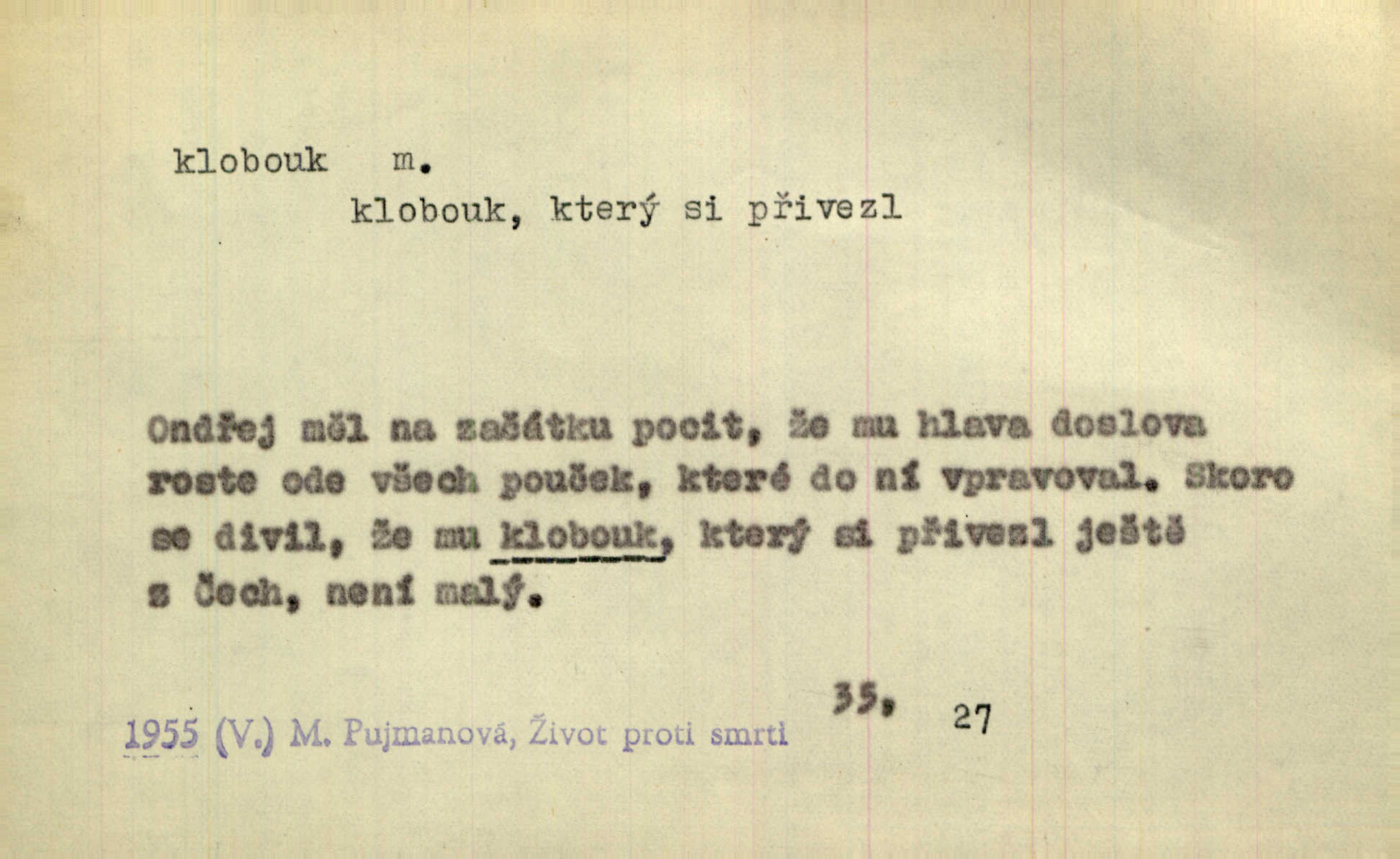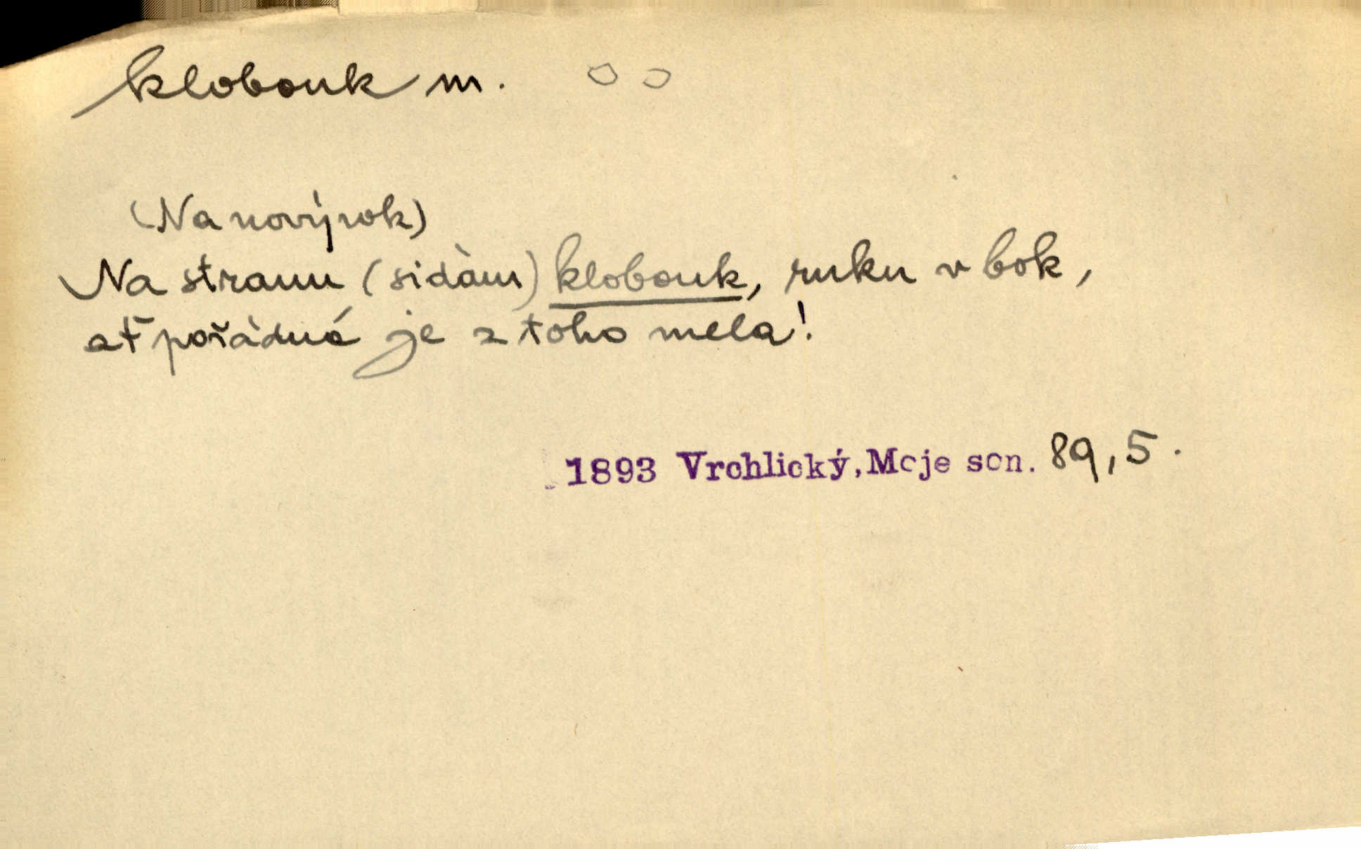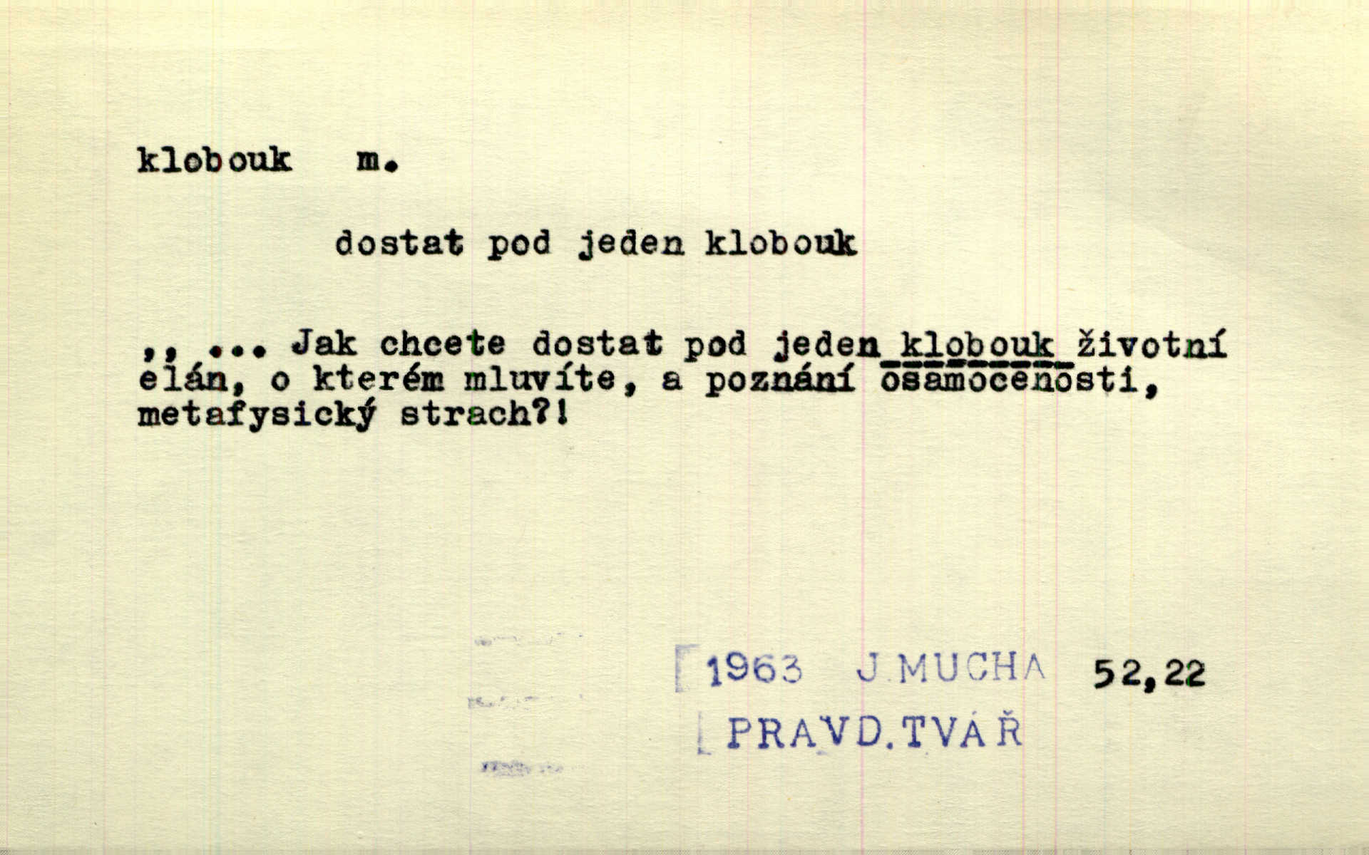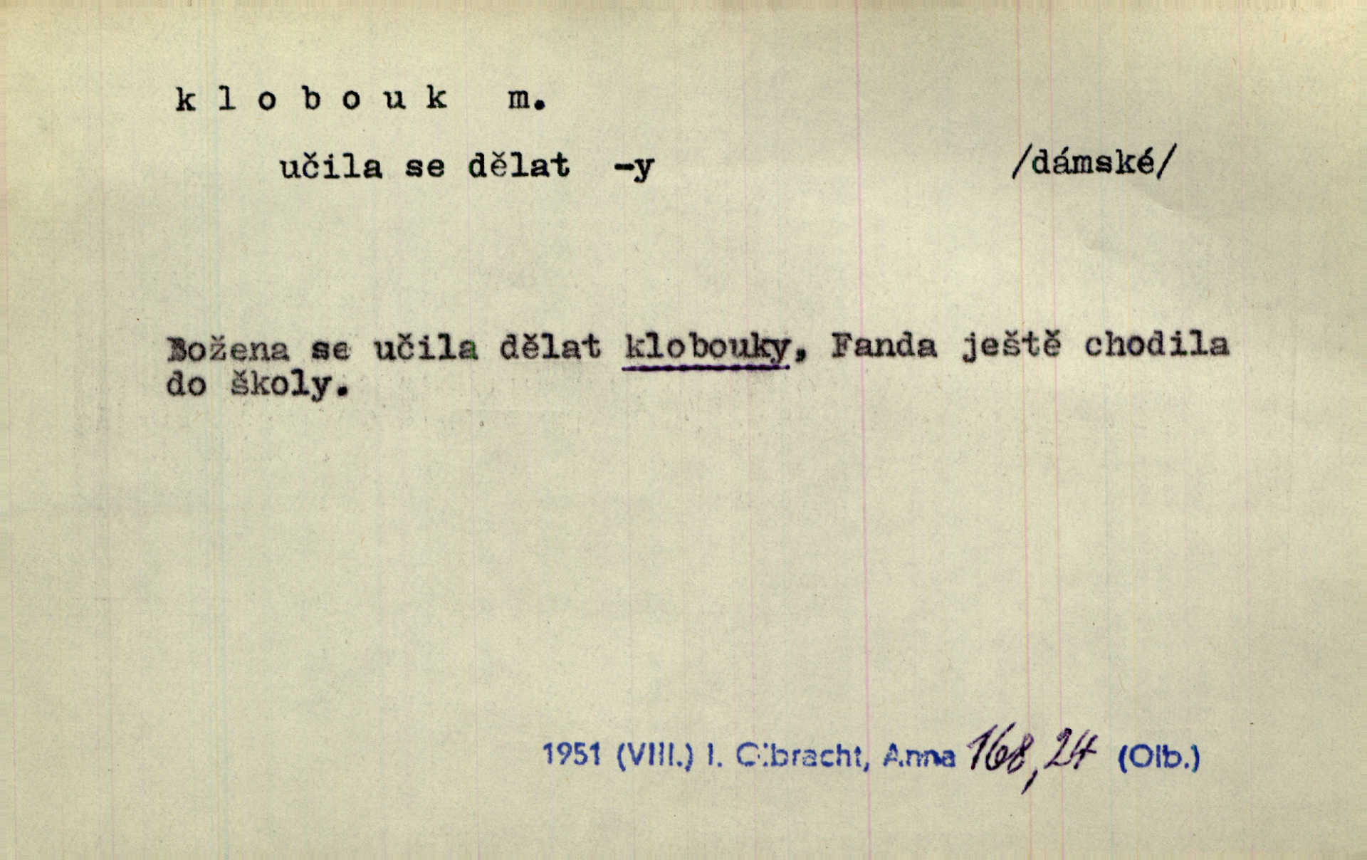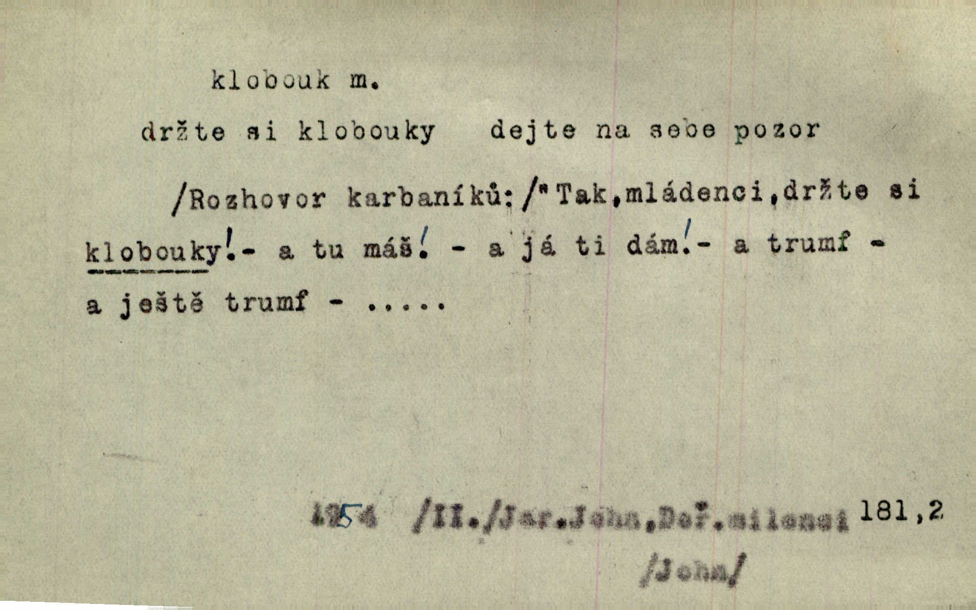 - klobouk, -u m. u mužů pokrývka hlavy z tužší látky (plsti, slámy a p.) se střechou; u žen jakákoli tužší pokrývka hlavy. I pod ošumělým kloboukem moudrá hlava bývá. Přísl. Husté vlasy hrnuly se zpod klobouka. Šmil. Klobouk měl hluboko do očí vtlačený. Štěp. [Služka:] Já teď budu nosit klobouky. Baar. Měla klobouk jako slepičí kukaň. Jir. Každý, kdo mimo jde, snímá před ním klobouk uctivě ho pozdravuje. Šmil. [Člověk zdvořilý] div kloboukem svým nezametl chodníku přede mnou. Kam. Tvrdý, černý klobouk s dírkou. V. Mrš. Měkký, plstěný, slaměný klobouk. Zelený myslivecký klobouk. Pfleg. Kulatý slovanský klobouk opíral se mu o levé ucho. Kun. Mohs získat snadno klobouk admirála státi se admirálem. Mach. [Řím] zdráhá se uděliti mu klobouk kardinálský hodnost kardinálskou. Mach. Arch. Ti officiálové chodí pod kloboukem a umějí leccos latině blektati nosí klobouk značící universitní hodnost. Win. O nepodajnou řečtinu a latinu rozbily se hrdé naděje v doktorský klobouk. Čech. [Důstojníci měli] černé klobouky třírohé, zlatem premované. Jir. Na hlavě měl dvourohý klobouk, jako loď. Klicp. Starý soused v klobouku na tři facky. Jir. Nerozumím modnímu střihu, mívám na sobě pomačkanou náprsenku, na kraji roztřepané manšety, klobouk na čtyři facky. Klost. [Ve Švédsku po smrti Karla XII.] usilovala šlechtická strana bojovná, t. zv. strana klobouků, o odvetu proti Rusku. Bidlo. Arch. Nový šalíř a dva železné klobouky druh přilbic. Jir. Mysl. Na lov nosil se sokol opatřený kuklí či kloboukem. A. Břez. Ustál. spoj. [Hercův výkon] vymáhá prostě úctu. Říká se tomu běžnou frásí: klobouk dolů! Čas. Nebudu se ani rmoutit, dám si klobouk na stranu. Rub. Pro jednu pannu klobouk na stranu netrápiti se a býti vesel. Pořek. Už měl trochu za kloboukem byl podnapilý. Herb. [Tkanička] maje již pod kloboukem, pořád se mezi ně [rozvaděné hosty] pletl v hlavě. Jir. Pod kloboukem mu strašilo mátl se na rozumu. Paleč. [Čtenář tohoto nesmyslu] nesoudil by nic jinak, než že brusičovi [oprávci jazyka] straší pod kloboukem nemá všech pět pohromadě. Kos. Však se to na dlouze neutají pod kloboukem neudrží v tajnosti. Obzor. Má vrchního pod kloboukem pro všechny případy zajištěna, v hrsti. Herb. Je to [intelektuálové] materiál velmi různorodý, který je těžko dostati pod jeden klobouk zorganisovati do jedné politické strany. Přít. Lepší hrst jistoty, než klobouk naděje mnoho. Tomsa. Úřad mu spadl jako hruška do klobouka dostalo se mu ho bez vlastního přičinění, náhodou. Herb. Svou duchovní svobodu může si dát za klobouk nic mu není platná. Přít. D věc tvarem podobná klobouku. Klobouk cukru homole. Vysoká čepice na způsob cukrového klobouku. Kram. [U kupce] pod skleněným kloboukem ukryt jest sýr poklopem. Prav. D vrchní část něčeho. Klobouk hutní peci, kovářské výhně. Tech. druh uzávěrky destilačních přístrojů, kapsle, kalota. Horn. železný klobouk oxydované pásmo rudných ložisek. Vin. (při kvašení vína) shluk pevných součástek matolin usazující se na povrchu kapaliny. Bot. část plodnice hub rouškatých. Červený klobouk muchomůrky. Pfleg.