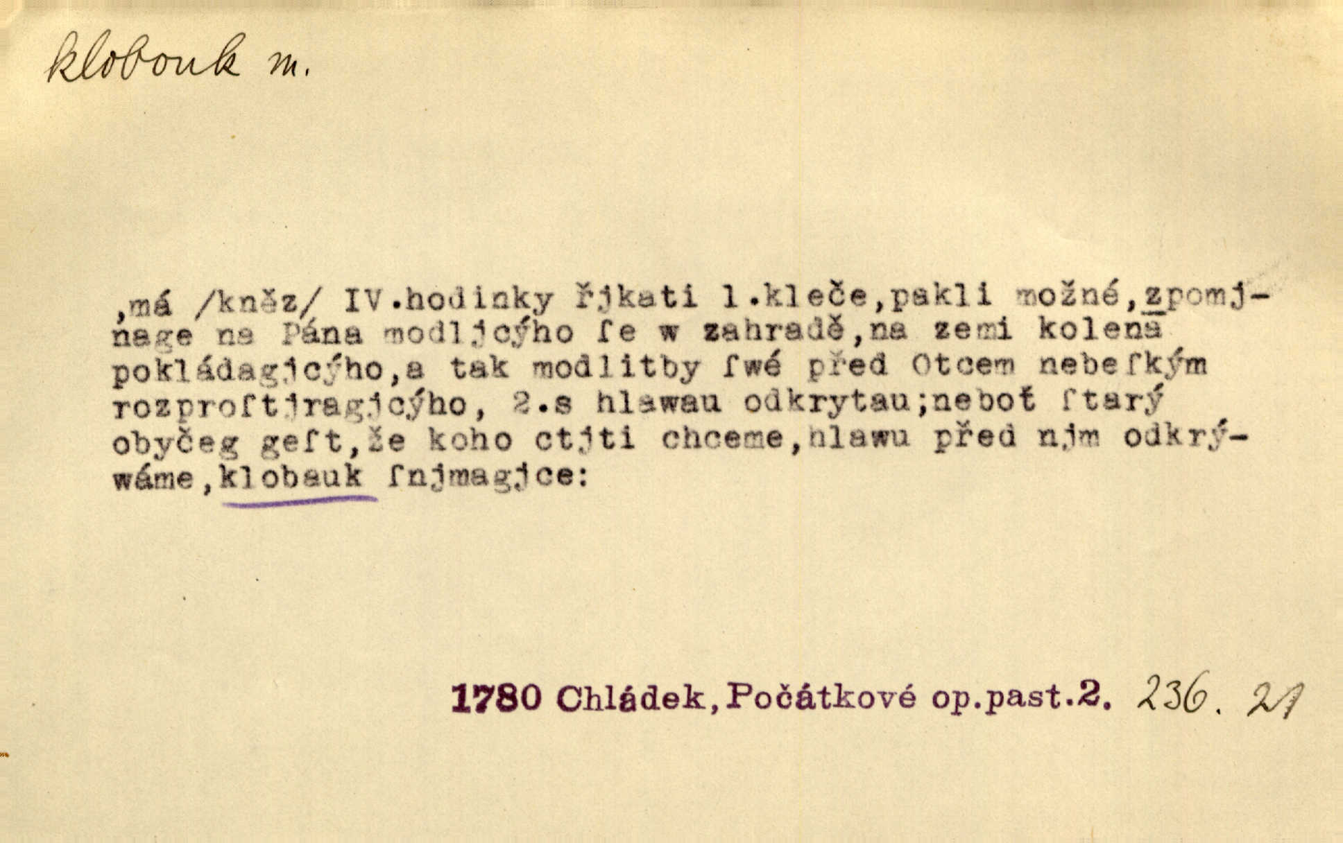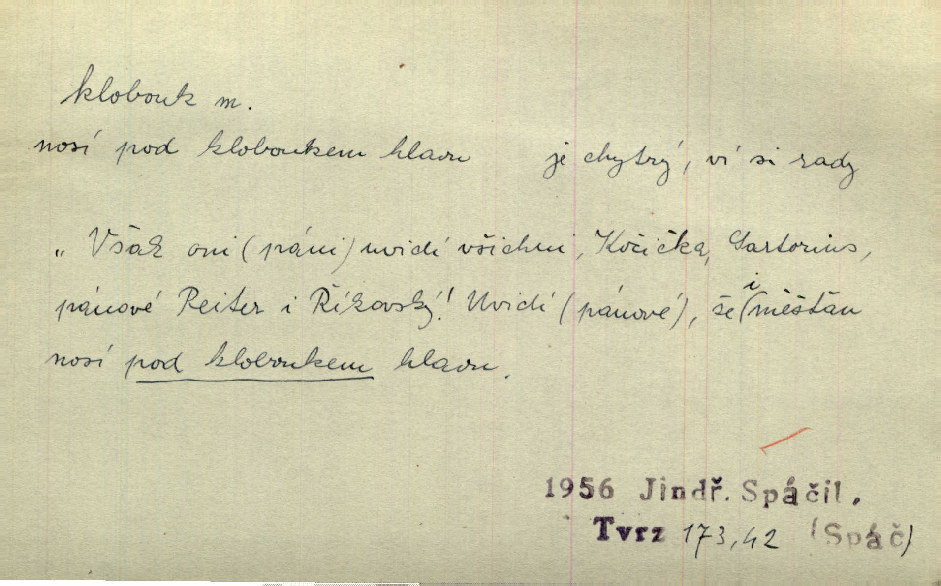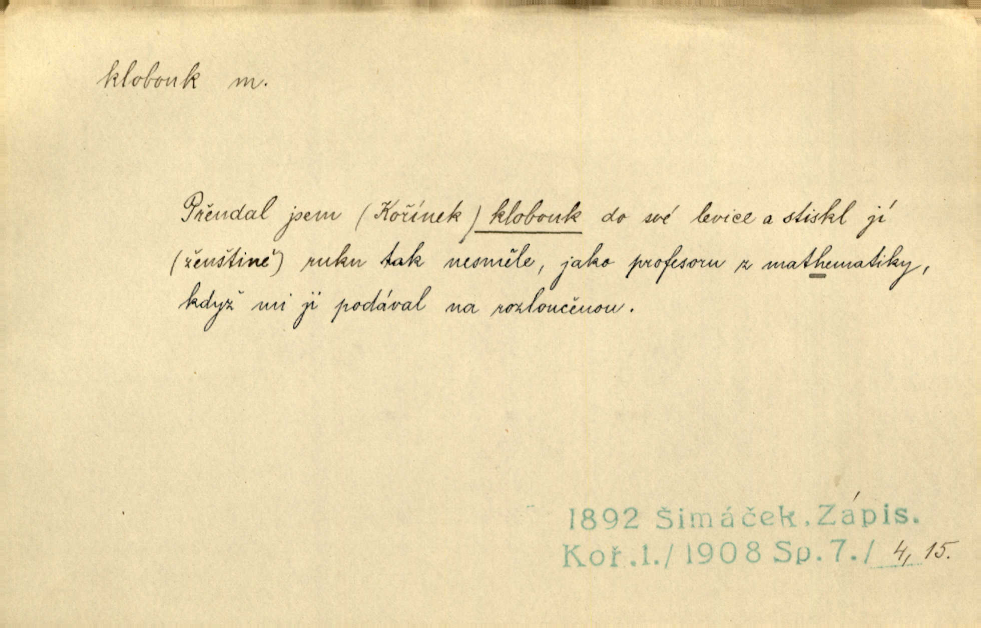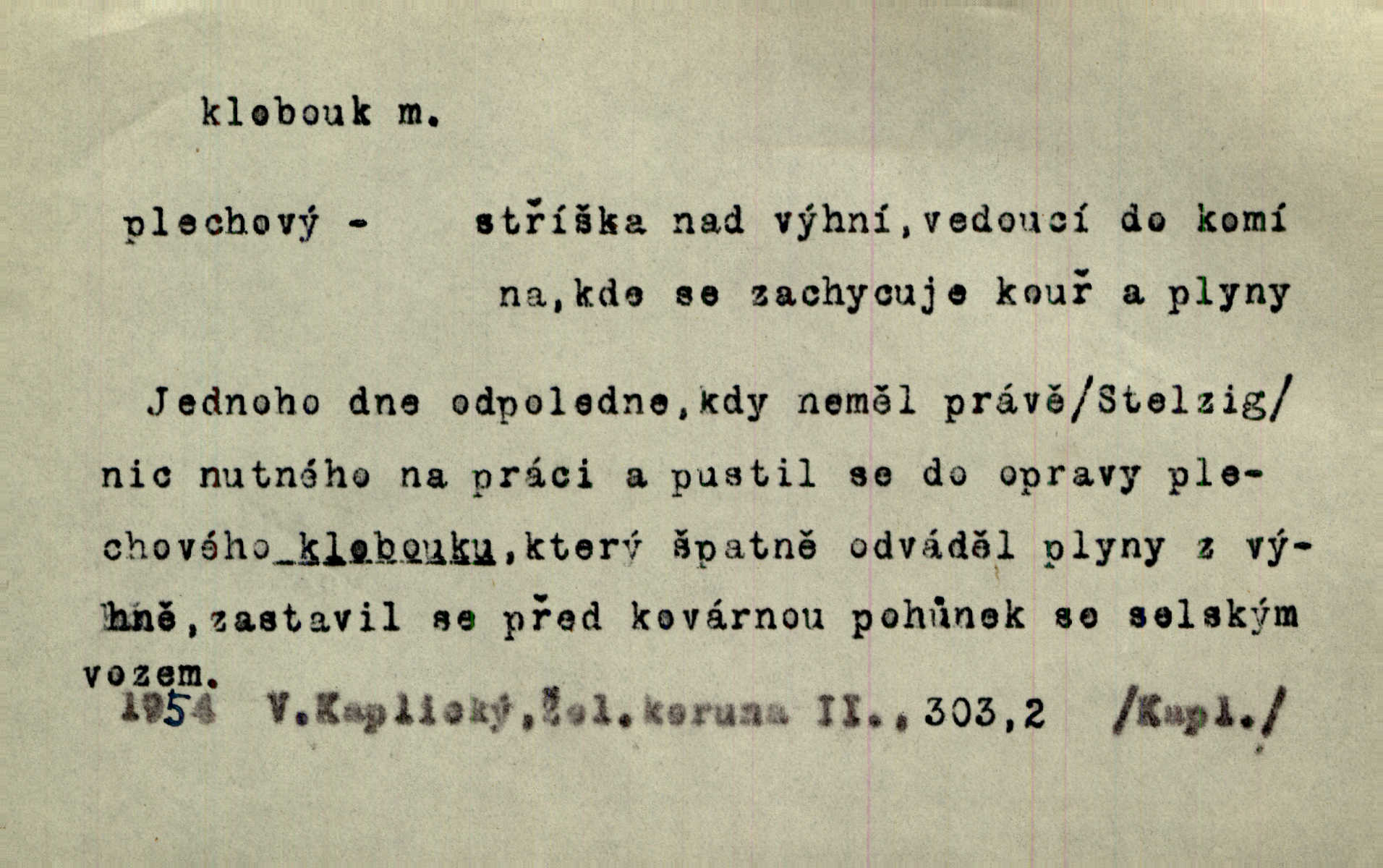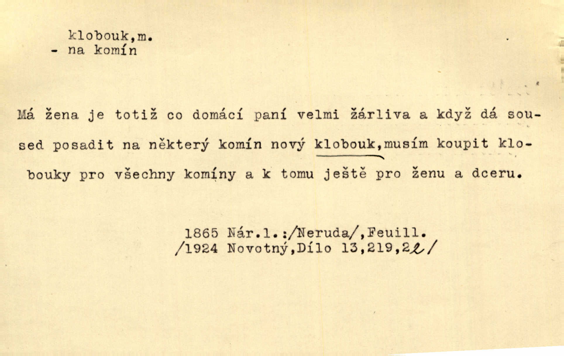 - klobouk, -u m. u mužů pokrývka hlavy z tužší látky (plsti, slámy a p.) se střechou; u žen jakákoli tužší pokrývka hlavy. I pod ošumělým kloboukem moudrá hlava bývá. Přísl. Husté vlasy hrnuly se zpod klobouka. Šmil. Klobouk měl hluboko do očí vtlačený. Štěp. [Služka:] Já teď budu nosit klobouky. Baar. Měla klobouk jako slepičí kukaň. Jir. Každý, kdo mimo jde, snímá před ním klobouk uctivě ho pozdravuje. Šmil. [Člověk zdvořilý] div kloboukem svým nezametl chodníku přede mnou. Kam. Tvrdý, černý klobouk s dírkou. V. Mrš. Měkký, plstěný, slaměný klobouk. Zelený myslivecký klobouk. Pfleg. Kulatý slovanský klobouk opíral se mu o levé ucho. Kun. Mohs získat snadno klobouk admirála státi se admirálem. Mach. [Řím] zdráhá se uděliti mu klobouk kardinálský hodnost kardinálskou. Mach. Arch. Ti officiálové chodí pod kloboukem a umějí leccos latině blektati nosí klobouk značící universitní hodnost. Win. O nepodajnou řečtinu a latinu rozbily se hrdé naděje v doktorský klobouk. Čech. [Důstojníci měli] černé klobouky třírohé, zlatem premované. Jir. Na hlavě měl dvourohý klobouk, jako loď. Klicp. Starý soused v klobouku na tři facky. Jir. Nerozumím modnímu střihu, mívám na sobě pomačkanou náprsenku, na kraji roztřepané manšety, klobouk na čtyři facky. Klost. [Ve Švédsku po smrti Karla XII.] usilovala šlechtická strana bojovná, t. zv. strana klobouků, o odvetu proti Rusku. Bidlo. Arch. Nový šalíř a dva železné klobouky druh přilbic. Jir. Mysl. Na lov nosil se sokol opatřený kuklí či kloboukem. A. Břez. Ustál. spoj. [Hercův výkon] vymáhá prostě úctu. Říká se tomu běžnou frásí: klobouk dolů! Čas. Nebudu se ani rmoutit, dám si klobouk na stranu. Rub. Pro jednu pannu klobouk na stranu netrápiti se a býti vesel. Pořek. Už měl trochu za kloboukem byl podnapilý. Herb. [Tkanička] maje již pod kloboukem, pořád se mezi ně [rozvaděné hosty] pletl v hlavě. Jir. Pod kloboukem mu strašilo mátl se na rozumu. Paleč. [Čtenář tohoto nesmyslu] nesoudil by nic jinak, než že brusičovi [oprávci jazyka] straší pod kloboukem nemá všech pět pohromadě. Kos. Však se to na dlouze neutají pod kloboukem neudrží v tajnosti. Obzor. Má vrchního pod kloboukem pro všechny případy zajištěna, v hrsti. Herb. Je to [intelektuálové] materiál velmi různorodý, který je těžko dostati pod jeden klobouk zorganisovati do jedné politické strany. Přít. Lepší hrst jistoty, než klobouk naděje mnoho. Tomsa. Úřad mu spadl jako hruška do klobouka dostalo se mu ho bez vlastního přičinění, náhodou. Herb. Svou duchovní svobodu může si dát za klobouk nic mu není platná. Přít. D věc tvarem podobná klobouku. Klobouk cukru homole. Vysoká čepice na způsob cukrového klobouku. Kram. [U kupce] pod skleněným kloboukem ukryt jest sýr poklopem. Prav. D vrchní část něčeho. Klobouk hutní peci, kovářské výhně. Tech. druh uzávěrky destilačních přístrojů, kapsle, kalota. Horn. železný klobouk oxydované pásmo rudných ložisek. Vin. (při kvašení vína) shluk pevných součástek matolin usazující se na povrchu kapaliny. Bot. část plodnice hub rouškatých. Červený klobouk muchomůrky. Pfleg.