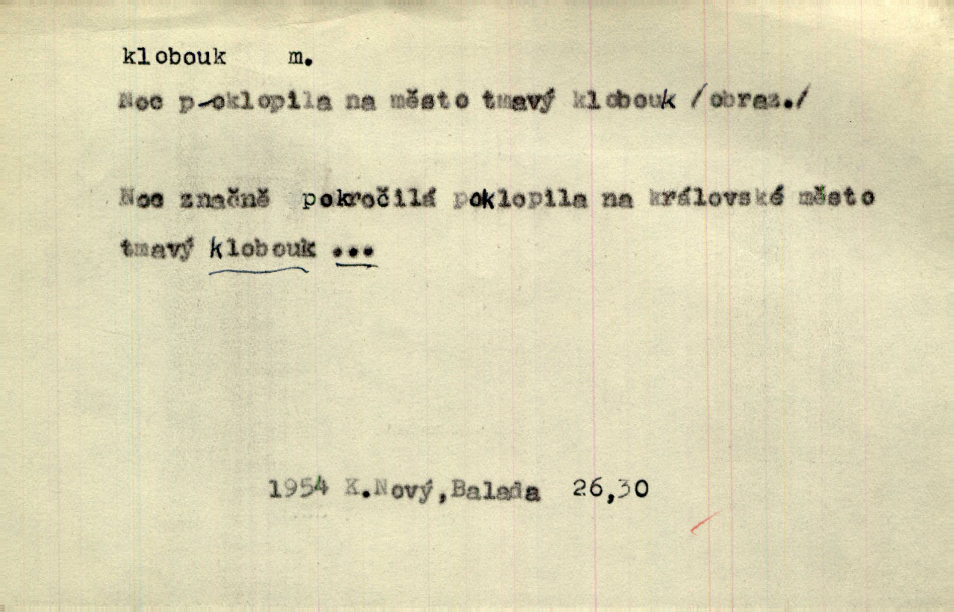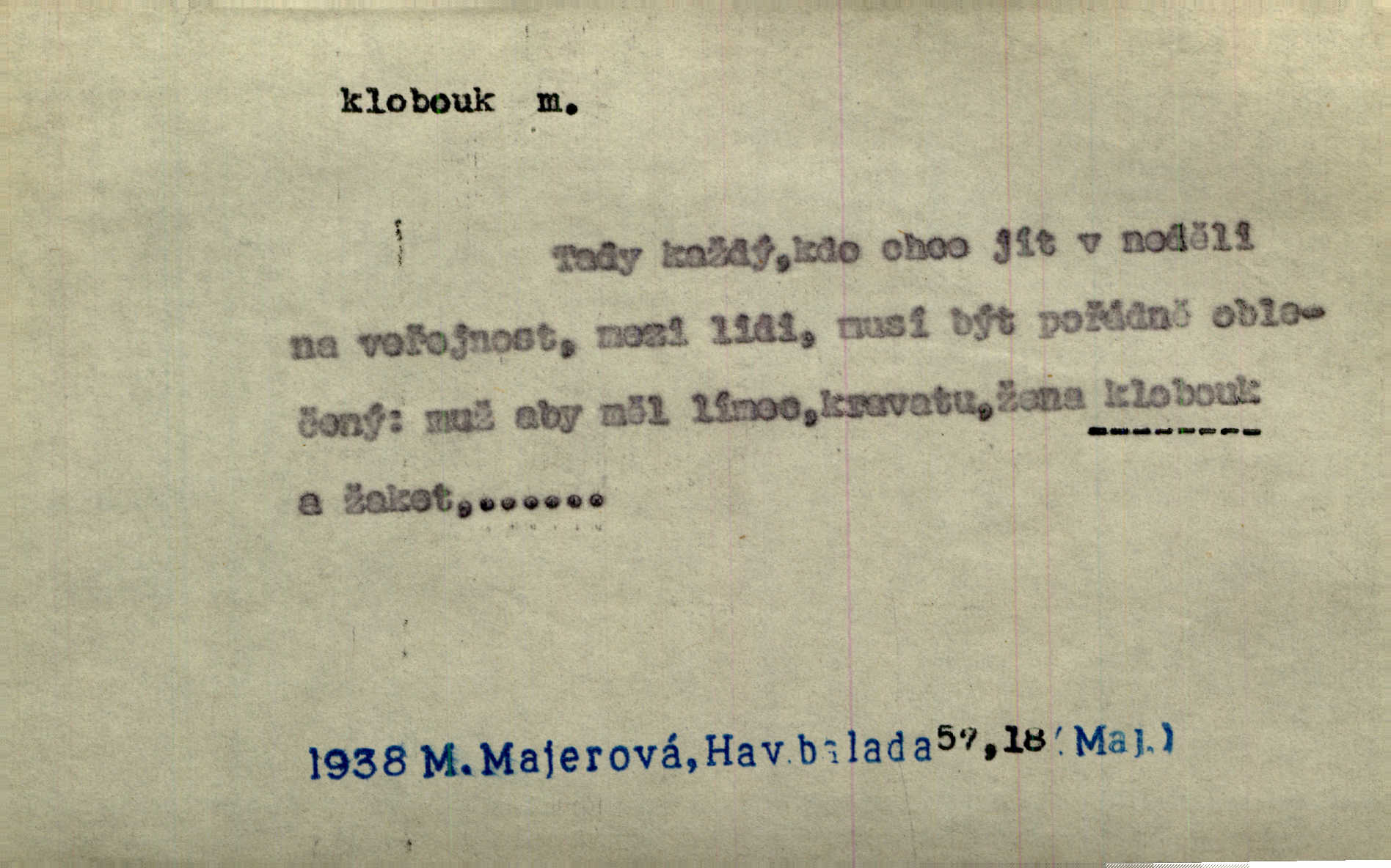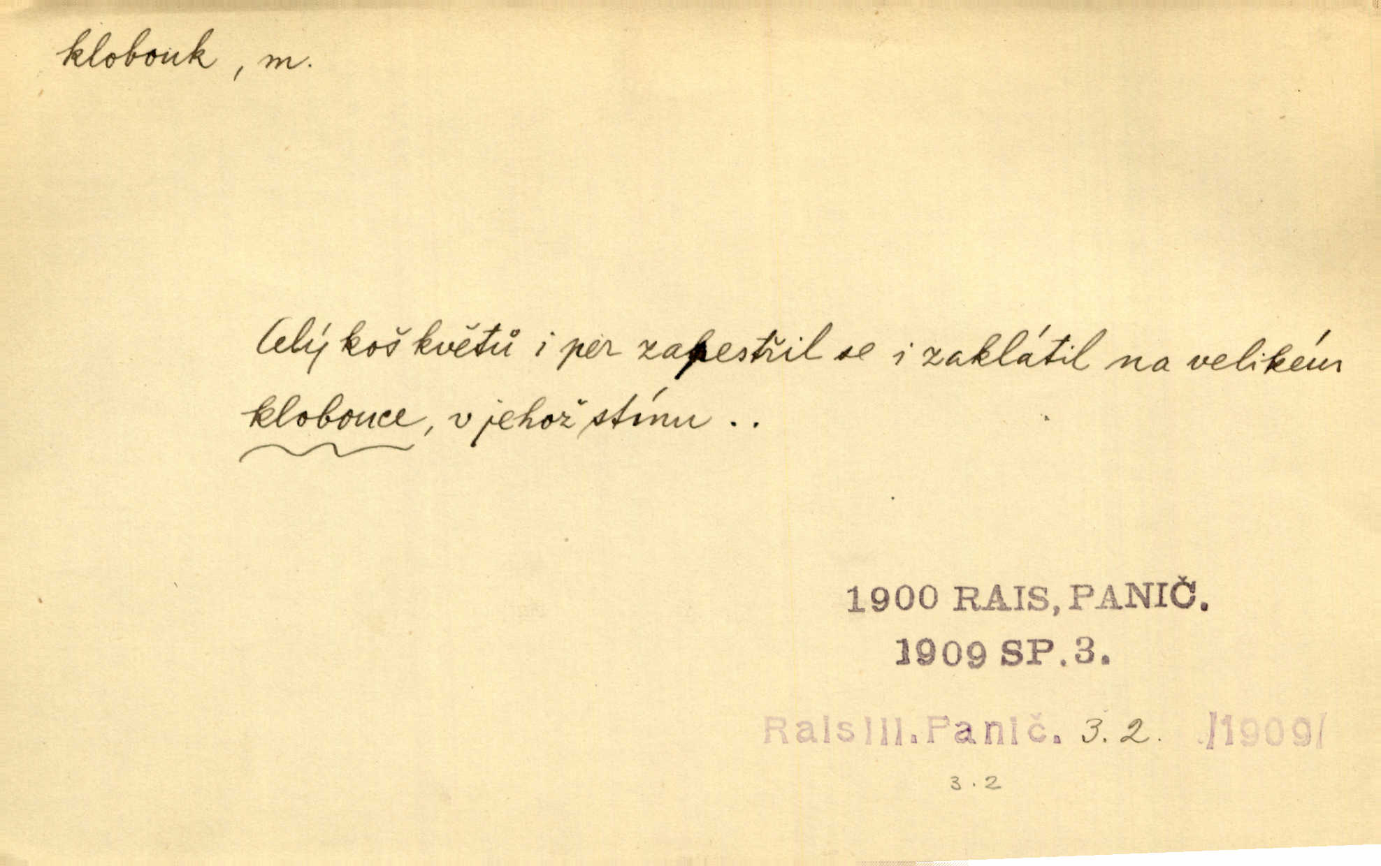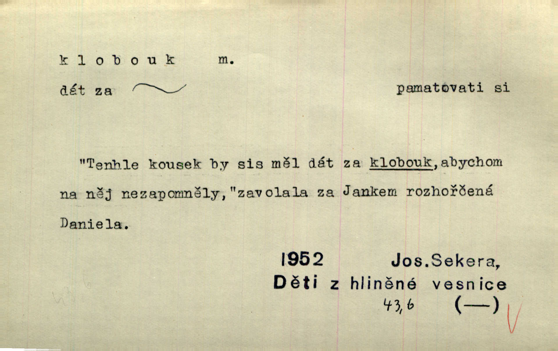 - klobouk, -u m. u mužů pokrývka hlavy z tužší látky (plsti, slámy a p.) se střechou; u žen jakákoli tužší pokrývka hlavy. I pod ošumělým kloboukem moudrá hlava bývá. Přísl. Husté vlasy hrnuly se zpod klobouka. Šmil. Klobouk měl hluboko do očí vtlačený. Štěp. [Služka:] Já teď budu nosit klobouky. Baar. Měla klobouk jako slepičí kukaň. Jir. Každý, kdo mimo jde, snímá před ním klobouk uctivě ho pozdravuje. Šmil. [Člověk zdvořilý] div kloboukem svým nezametl chodníku přede mnou. Kam. Tvrdý, černý klobouk s dírkou. V. Mrš. Měkký, plstěný, slaměný klobouk. Zelený myslivecký klobouk. Pfleg. Kulatý slovanský klobouk opíral se mu o levé ucho. Kun. Mohs získat snadno klobouk admirála státi se admirálem. Mach. [Řím] zdráhá se uděliti mu klobouk kardinálský hodnost kardinálskou. Mach. Arch. Ti officiálové chodí pod kloboukem a umějí leccos latině blektati nosí klobouk značící universitní hodnost. Win. O nepodajnou řečtinu a latinu rozbily se hrdé naděje v doktorský klobouk. Čech. [Důstojníci měli] černé klobouky třírohé, zlatem premované. Jir. Na hlavě měl dvourohý klobouk, jako loď. Klicp. Starý soused v klobouku na tři facky. Jir. Nerozumím modnímu střihu, mívám na sobě pomačkanou náprsenku, na kraji roztřepané manšety, klobouk na čtyři facky. Klost. [Ve Švédsku po smrti Karla XII.] usilovala šlechtická strana bojovná, t. zv. strana klobouků, o odvetu proti Rusku. Bidlo. Arch. Nový šalíř a dva železné klobouky druh přilbic. Jir. Mysl. Na lov nosil se sokol opatřený kuklí či kloboukem. A. Břez. Ustál. spoj. [Hercův výkon] vymáhá prostě úctu. Říká se tomu běžnou frásí: klobouk dolů! Čas. Nebudu se ani rmoutit, dám si klobouk na stranu. Rub. Pro jednu pannu klobouk na stranu netrápiti se a býti vesel. Pořek. Už měl trochu za kloboukem byl podnapilý. Herb. [Tkanička] maje již pod kloboukem, pořád se mezi ně [rozvaděné hosty] pletl v hlavě. Jir. Pod kloboukem mu strašilo mátl se na rozumu. Paleč. [Čtenář tohoto nesmyslu] nesoudil by nic jinak, než že brusičovi [oprávci jazyka] straší pod kloboukem nemá všech pět pohromadě. Kos. Však se to na dlouze neutají pod kloboukem neudrží v tajnosti. Obzor. Má vrchního pod kloboukem pro všechny případy zajištěna, v hrsti. Herb. Je to [intelektuálové] materiál velmi různorodý, který je těžko dostati pod jeden klobouk zorganisovati do jedné politické strany. Přít. Lepší hrst jistoty, než klobouk naděje mnoho. Tomsa. Úřad mu spadl jako hruška do klobouka dostalo se mu ho bez vlastního přičinění, náhodou. Herb. Svou duchovní svobodu může si dát za klobouk nic mu není platná. Přít. D věc tvarem podobná klobouku. Klobouk cukru homole. Vysoká čepice na způsob cukrového klobouku. Kram. [U kupce] pod skleněným kloboukem ukryt jest sýr poklopem. Prav. D vrchní část něčeho. Klobouk hutní peci, kovářské výhně. Tech. druh uzávěrky destilačních přístrojů, kapsle, kalota. Horn. železný klobouk oxydované pásmo rudných ložisek. Vin. (při kvašení vína) shluk pevných součástek matolin usazující se na povrchu kapaliny. Bot. část plodnice hub rouškatých. Červený klobouk muchomůrky. Pfleg.