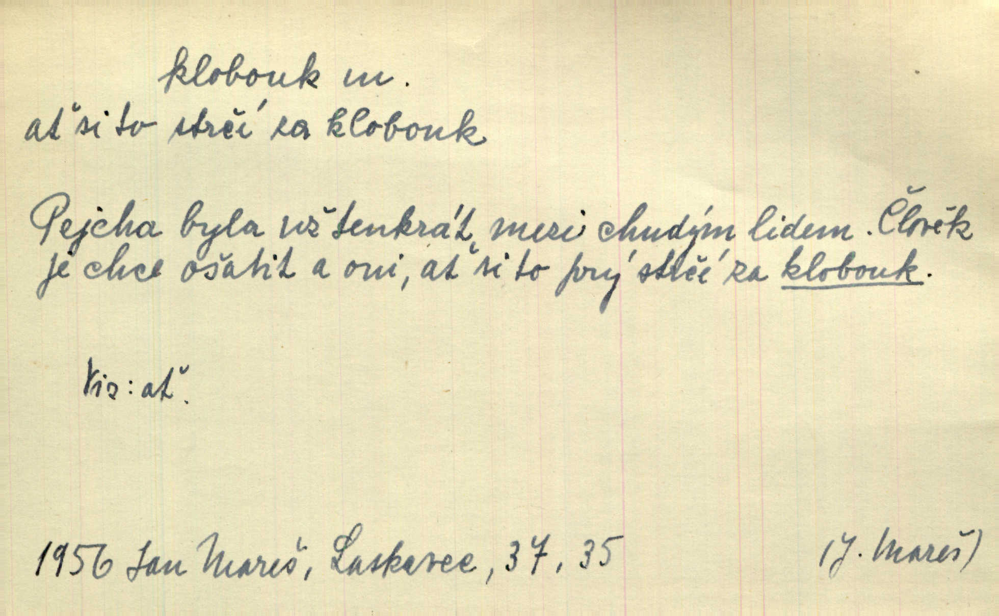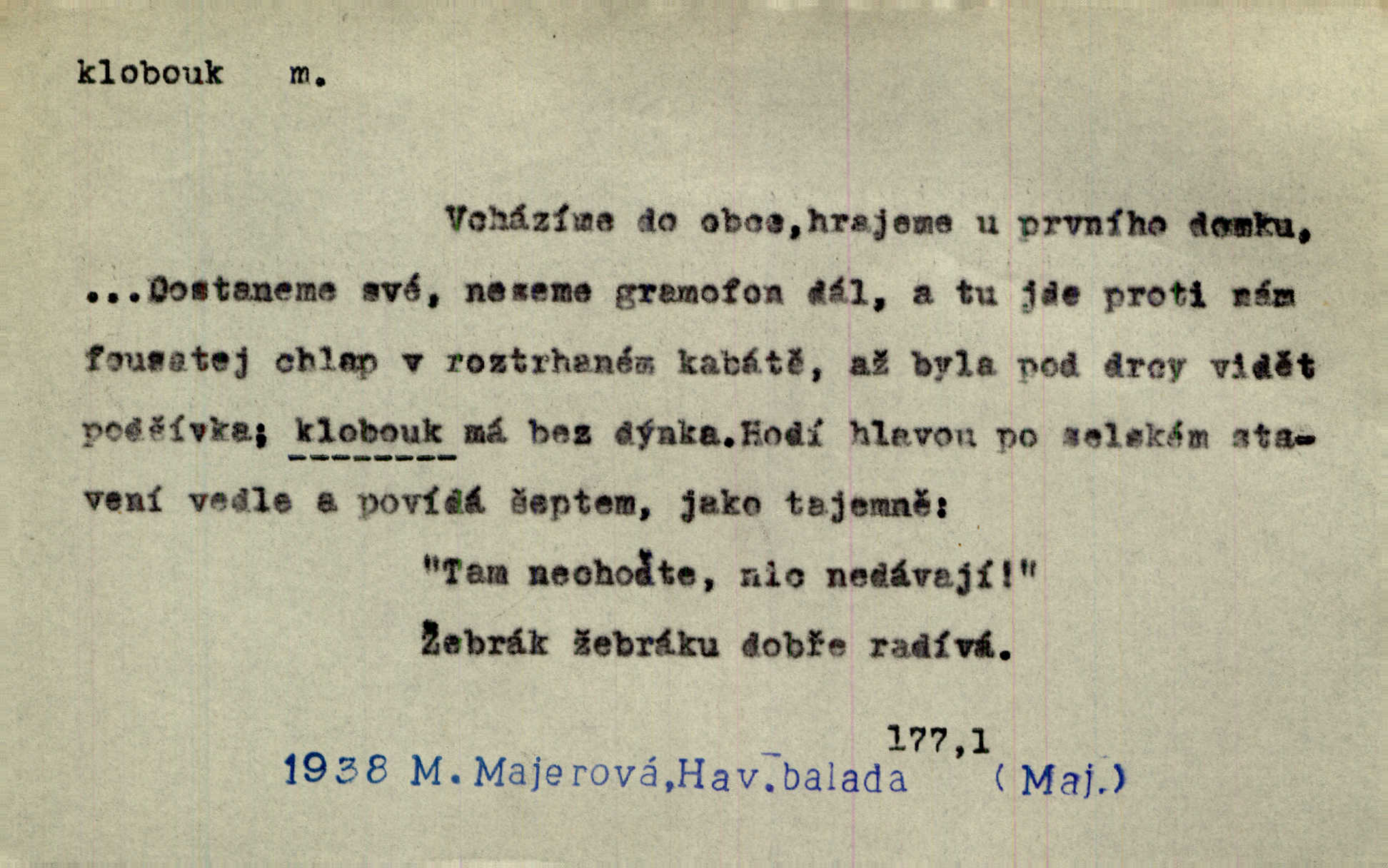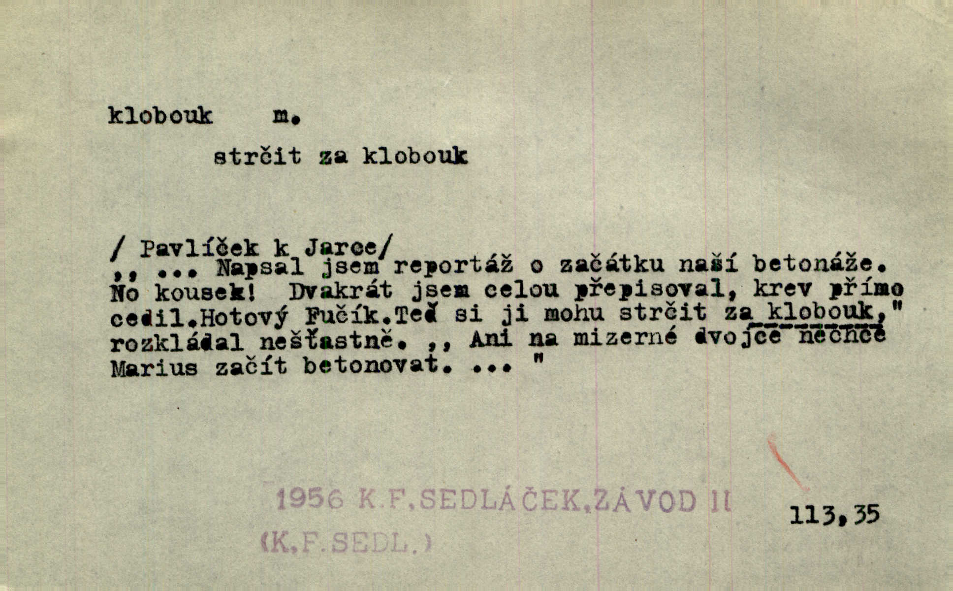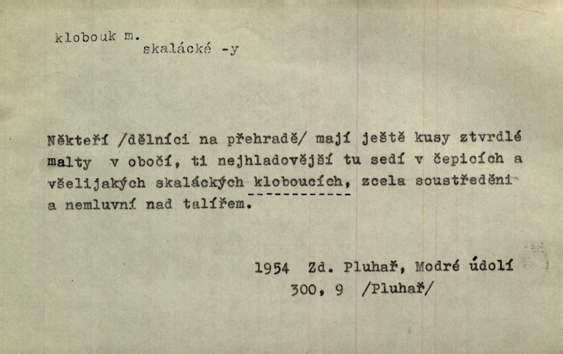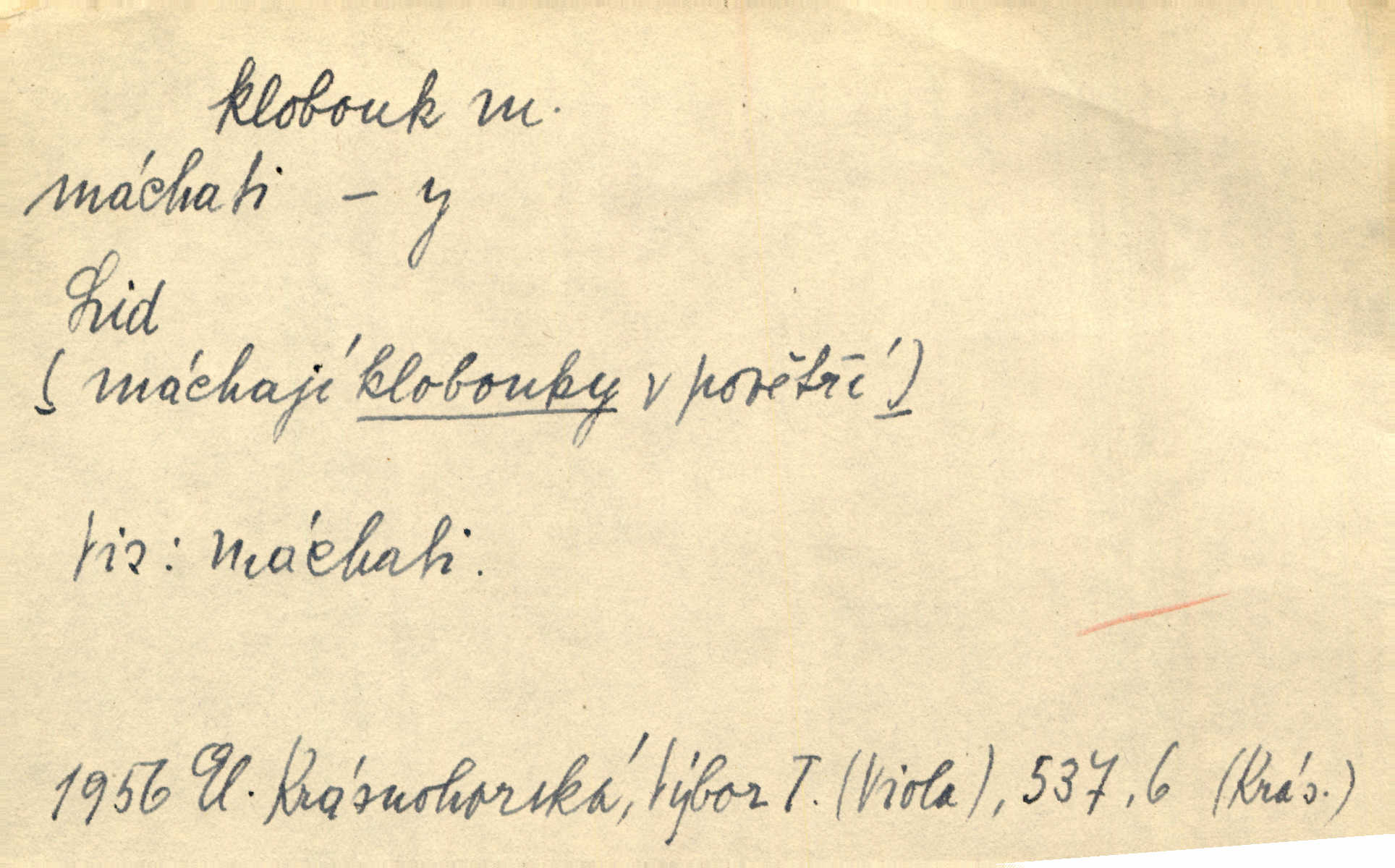 - klobouk, -u m. u mužů pokrývka hlavy z tužší látky (plsti, slámy a p.) se střechou; u žen jakákoli tužší pokrývka hlavy. I pod ošumělým kloboukem moudrá hlava bývá. Přísl. Husté vlasy hrnuly se zpod klobouka. Šmil. Klobouk měl hluboko do očí vtlačený. Štěp. [Služka:] Já teď budu nosit klobouky. Baar. Měla klobouk jako slepičí kukaň. Jir. Každý, kdo mimo jde, snímá před ním klobouk uctivě ho pozdravuje. Šmil. [Člověk zdvořilý] div kloboukem svým nezametl chodníku přede mnou. Kam. Tvrdý, černý klobouk s dírkou. V. Mrš. Měkký, plstěný, slaměný klobouk. Zelený myslivecký klobouk. Pfleg. Kulatý slovanský klobouk opíral se mu o levé ucho. Kun. Mohs získat snadno klobouk admirála státi se admirálem. Mach. [Řím] zdráhá se uděliti mu klobouk kardinálský hodnost kardinálskou. Mach. Arch. Ti officiálové chodí pod kloboukem a umějí leccos latině blektati nosí klobouk značící universitní hodnost. Win. O nepodajnou řečtinu a latinu rozbily se hrdé naděje v doktorský klobouk. Čech. [Důstojníci měli] černé klobouky třírohé, zlatem premované. Jir. Na hlavě měl dvourohý klobouk, jako loď. Klicp. Starý soused v klobouku na tři facky. Jir. Nerozumím modnímu střihu, mívám na sobě pomačkanou náprsenku, na kraji roztřepané manšety, klobouk na čtyři facky. Klost. [Ve Švédsku po smrti Karla XII.] usilovala šlechtická strana bojovná, t. zv. strana klobouků, o odvetu proti Rusku. Bidlo. Arch. Nový šalíř a dva železné klobouky druh přilbic. Jir. Mysl. Na lov nosil se sokol opatřený kuklí či kloboukem. A. Břez. Ustál. spoj. [Hercův výkon] vymáhá prostě úctu. Říká se tomu běžnou frásí: klobouk dolů! Čas. Nebudu se ani rmoutit, dám si klobouk na stranu. Rub. Pro jednu pannu klobouk na stranu netrápiti se a býti vesel. Pořek. Už měl trochu za kloboukem byl podnapilý. Herb. [Tkanička] maje již pod kloboukem, pořád se mezi ně [rozvaděné hosty] pletl v hlavě. Jir. Pod kloboukem mu strašilo mátl se na rozumu. Paleč. [Čtenář tohoto nesmyslu] nesoudil by nic jinak, než že brusičovi [oprávci jazyka] straší pod kloboukem nemá všech pět pohromadě. Kos. Však se to na dlouze neutají pod kloboukem neudrží v tajnosti. Obzor. Má vrchního pod kloboukem pro všechny případy zajištěna, v hrsti. Herb. Je to [intelektuálové] materiál velmi různorodý, který je těžko dostati pod jeden klobouk zorganisovati do jedné politické strany. Přít. Lepší hrst jistoty, než klobouk naděje mnoho. Tomsa. Úřad mu spadl jako hruška do klobouka dostalo se mu ho bez vlastního přičinění, náhodou. Herb. Svou duchovní svobodu může si dát za klobouk nic mu není platná. Přít. D věc tvarem podobná klobouku. Klobouk cukru homole. Vysoká čepice na způsob cukrového klobouku. Kram. [U kupce] pod skleněným kloboukem ukryt jest sýr poklopem. Prav. D vrchní část něčeho. Klobouk hutní peci, kovářské výhně. Tech. druh uzávěrky destilačních přístrojů, kapsle, kalota. Horn. železný klobouk oxydované pásmo rudných ložisek. Vin. (při kvašení vína) shluk pevných součástek matolin usazující se na povrchu kapaliny. Bot. část plodnice hub rouškatých. Červený klobouk muchomůrky. Pfleg.