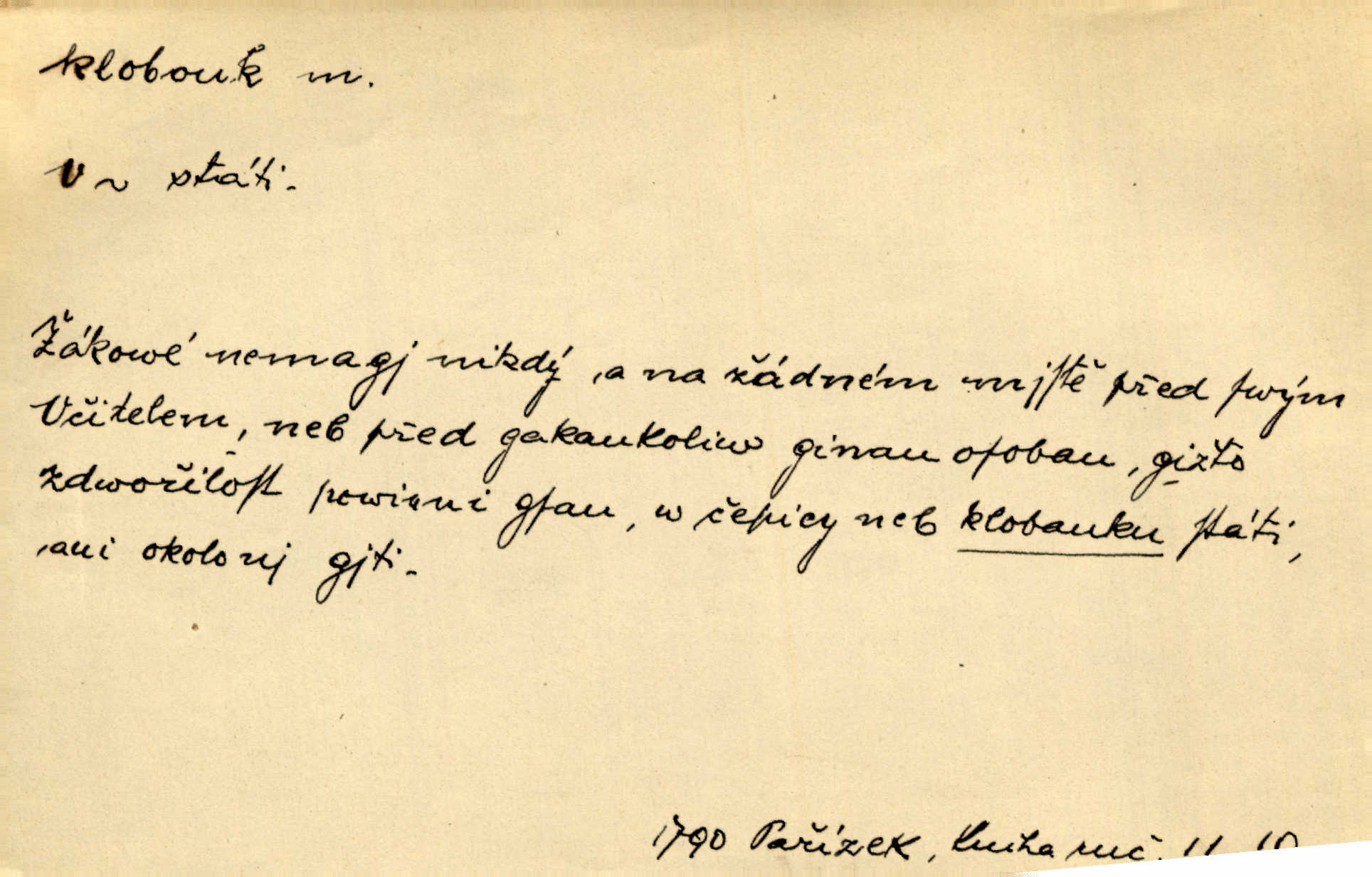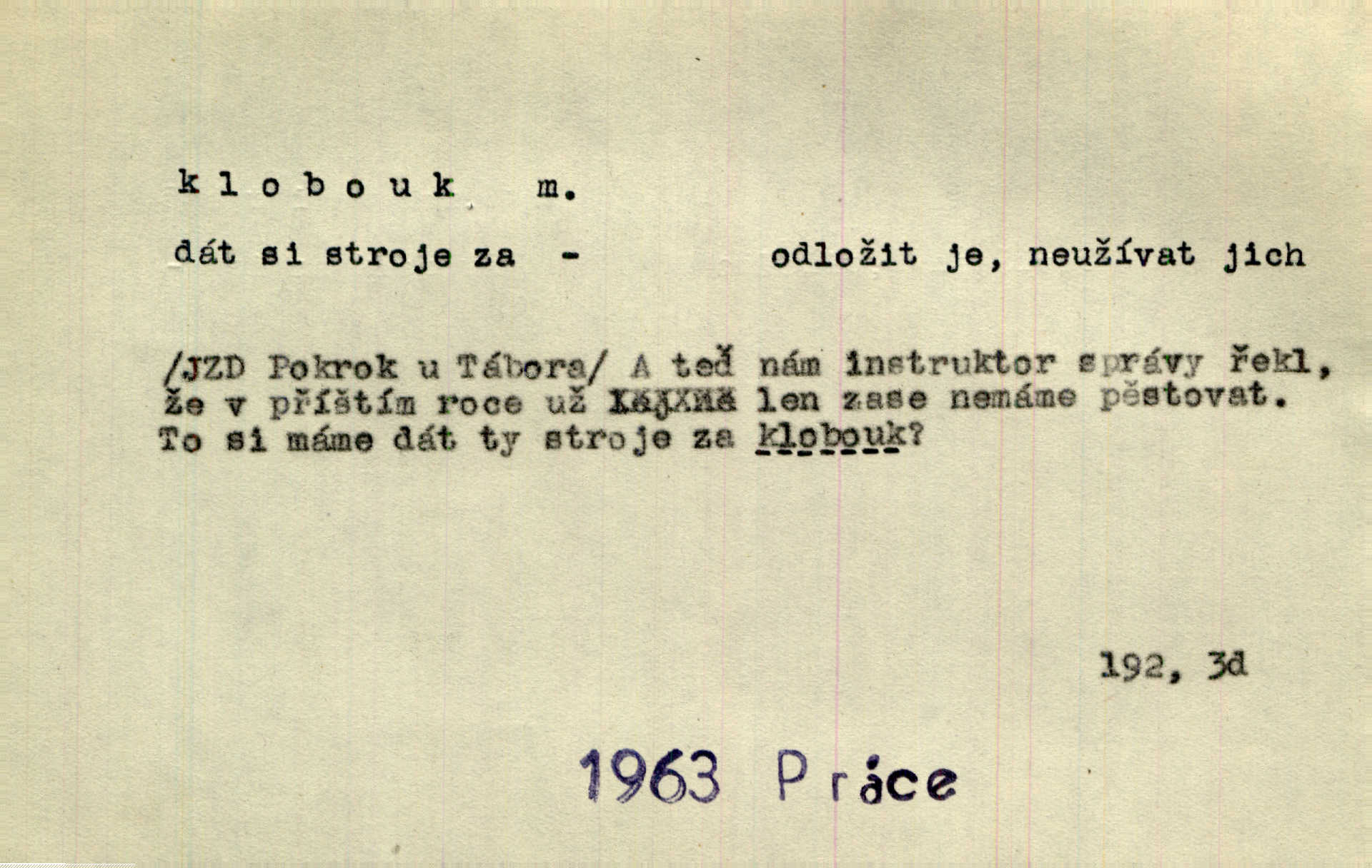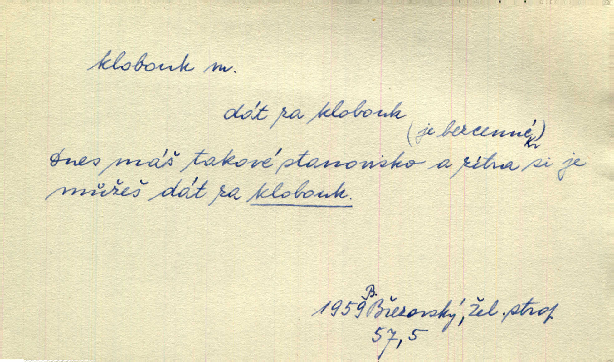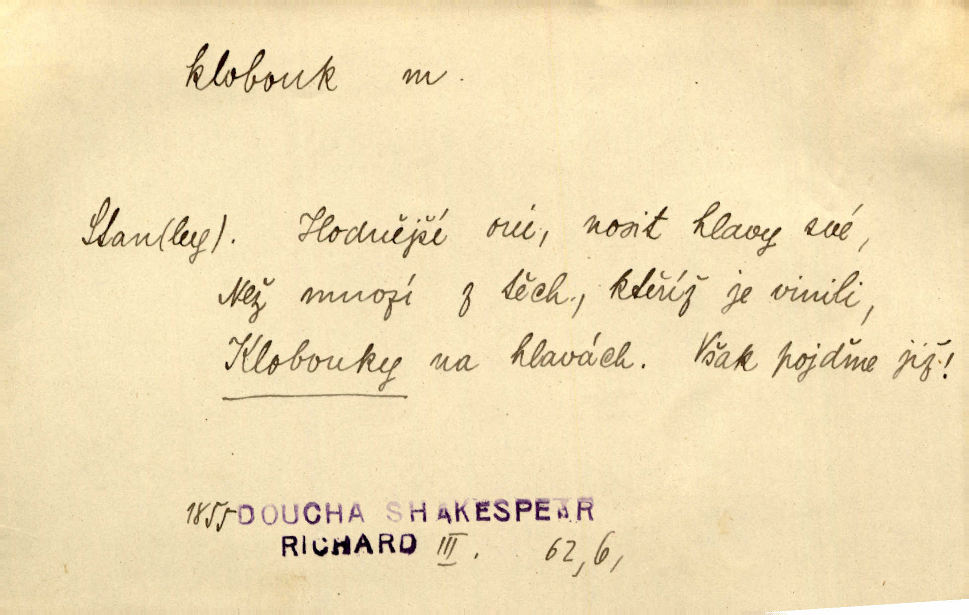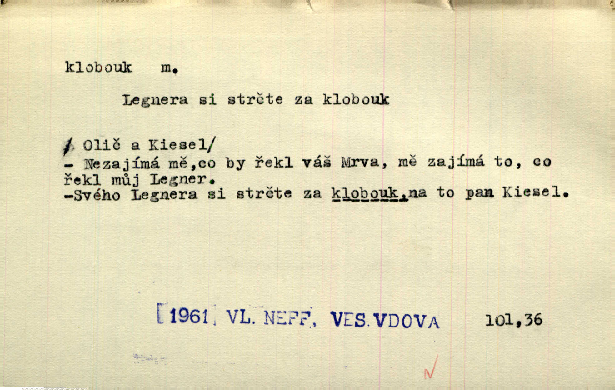 - klobouk, -u m. u mužů pokrývka hlavy z tužší látky (plsti, slámy a p.) se střechou; u žen jakákoli tužší pokrývka hlavy. I pod ošumělým kloboukem moudrá hlava bývá. Přísl. Husté vlasy hrnuly se zpod klobouka. Šmil. Klobouk měl hluboko do očí vtlačený. Štěp. [Služka:] Já teď budu nosit klobouky. Baar. Měla klobouk jako slepičí kukaň. Jir. Každý, kdo mimo jde, snímá před ním klobouk uctivě ho pozdravuje. Šmil. [Člověk zdvořilý] div kloboukem svým nezametl chodníku přede mnou. Kam. Tvrdý, černý klobouk s dírkou. V. Mrš. Měkký, plstěný, slaměný klobouk. Zelený myslivecký klobouk. Pfleg. Kulatý slovanský klobouk opíral se mu o levé ucho. Kun. Mohs získat snadno klobouk admirála státi se admirálem. Mach. [Řím] zdráhá se uděliti mu klobouk kardinálský hodnost kardinálskou. Mach. Arch. Ti officiálové chodí pod kloboukem a umějí leccos latině blektati nosí klobouk značící universitní hodnost. Win. O nepodajnou řečtinu a latinu rozbily se hrdé naděje v doktorský klobouk. Čech. [Důstojníci měli] černé klobouky třírohé, zlatem premované. Jir. Na hlavě měl dvourohý klobouk, jako loď. Klicp. Starý soused v klobouku na tři facky. Jir. Nerozumím modnímu střihu, mívám na sobě pomačkanou náprsenku, na kraji roztřepané manšety, klobouk na čtyři facky. Klost. [Ve Švédsku po smrti Karla XII.] usilovala šlechtická strana bojovná, t. zv. strana klobouků, o odvetu proti Rusku. Bidlo. Arch. Nový šalíř a dva železné klobouky druh přilbic. Jir. Mysl. Na lov nosil se sokol opatřený kuklí či kloboukem. A. Břez. Ustál. spoj. [Hercův výkon] vymáhá prostě úctu. Říká se tomu běžnou frásí: klobouk dolů! Čas. Nebudu se ani rmoutit, dám si klobouk na stranu. Rub. Pro jednu pannu klobouk na stranu netrápiti se a býti vesel. Pořek. Už měl trochu za kloboukem byl podnapilý. Herb. [Tkanička] maje již pod kloboukem, pořád se mezi ně [rozvaděné hosty] pletl v hlavě. Jir. Pod kloboukem mu strašilo mátl se na rozumu. Paleč. [Čtenář tohoto nesmyslu] nesoudil by nic jinak, než že brusičovi [oprávci jazyka] straší pod kloboukem nemá všech pět pohromadě. Kos. Však se to na dlouze neutají pod kloboukem neudrží v tajnosti. Obzor. Má vrchního pod kloboukem pro všechny případy zajištěna, v hrsti. Herb. Je to [intelektuálové] materiál velmi různorodý, který je těžko dostati pod jeden klobouk zorganisovati do jedné politické strany. Přít. Lepší hrst jistoty, než klobouk naděje mnoho. Tomsa. Úřad mu spadl jako hruška do klobouka dostalo se mu ho bez vlastního přičinění, náhodou. Herb. Svou duchovní svobodu může si dát za klobouk nic mu není platná. Přít. D věc tvarem podobná klobouku. Klobouk cukru homole. Vysoká čepice na způsob cukrového klobouku. Kram. [U kupce] pod skleněným kloboukem ukryt jest sýr poklopem. Prav. D vrchní část něčeho. Klobouk hutní peci, kovářské výhně. Tech. druh uzávěrky destilačních přístrojů, kapsle, kalota. Horn. železný klobouk oxydované pásmo rudných ložisek. Vin. (při kvašení vína) shluk pevných součástek matolin usazující se na povrchu kapaliny. Bot. část plodnice hub rouškatých. Červený klobouk muchomůrky. Pfleg.