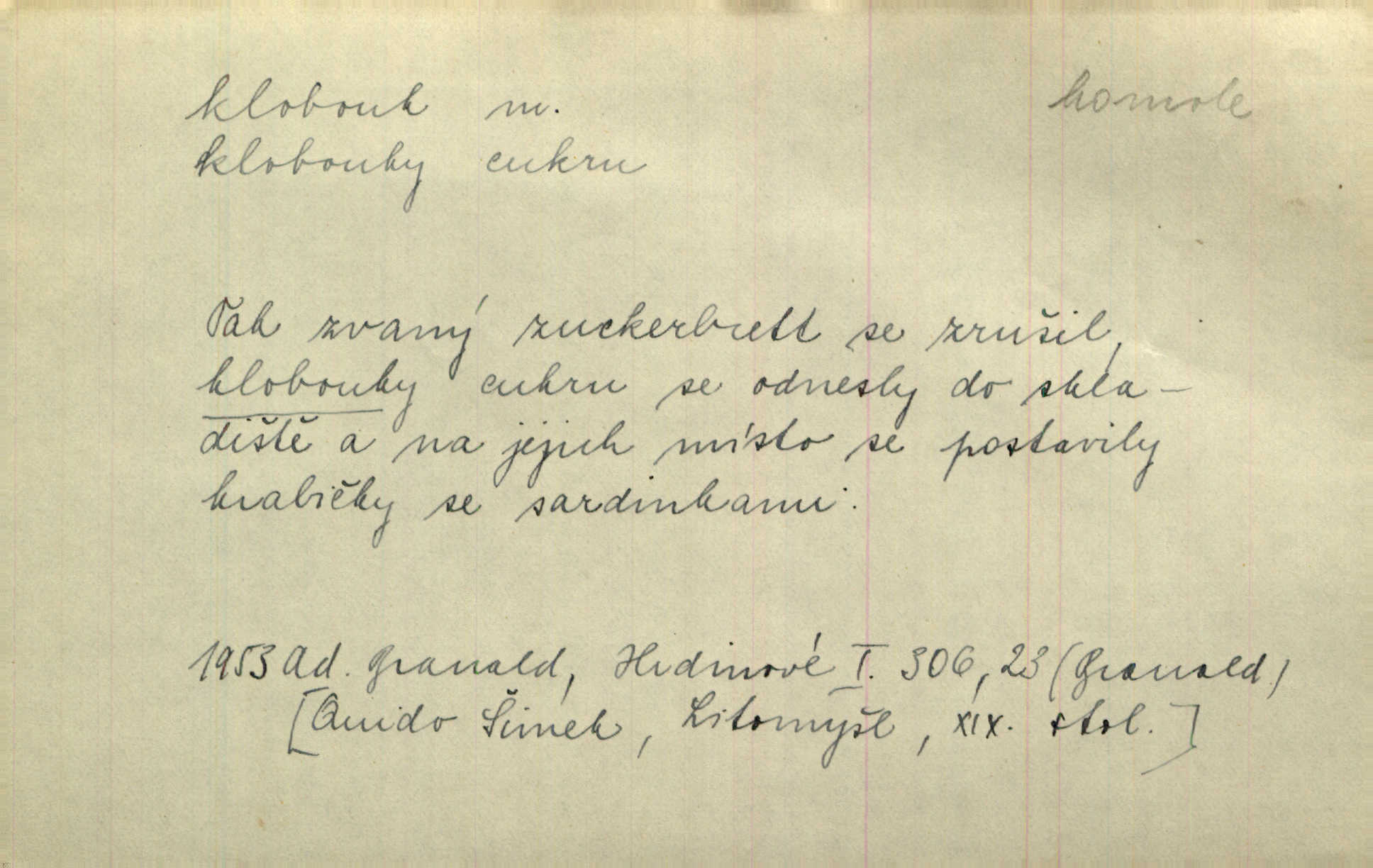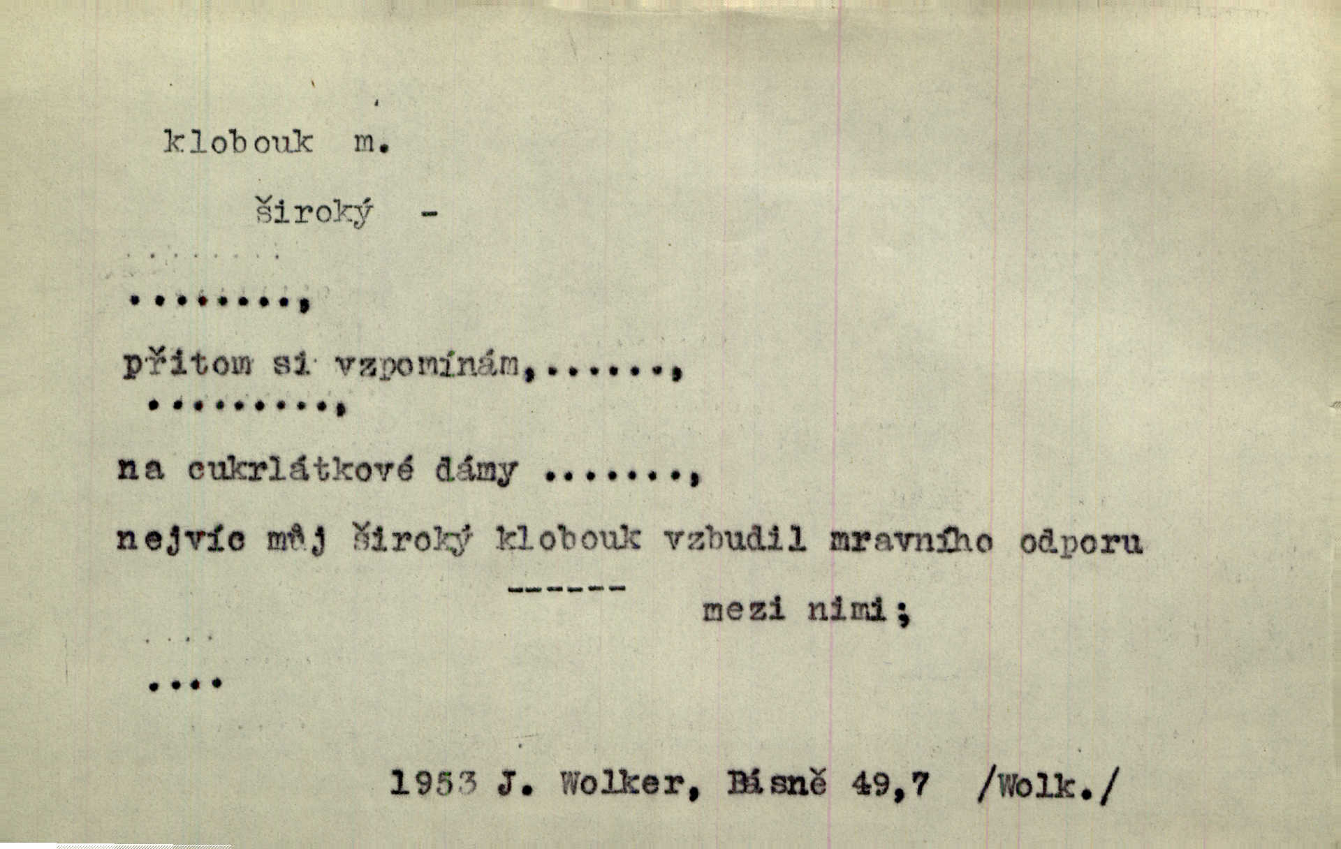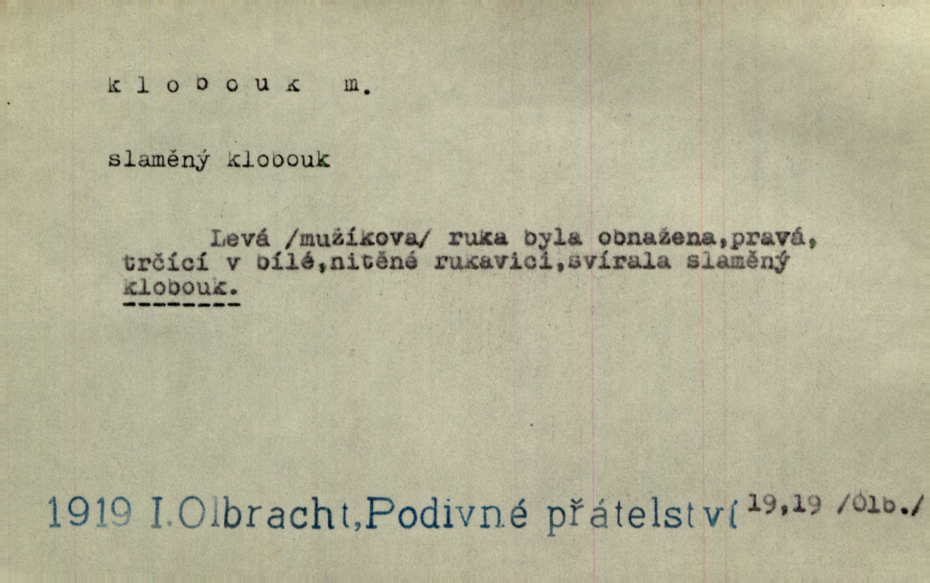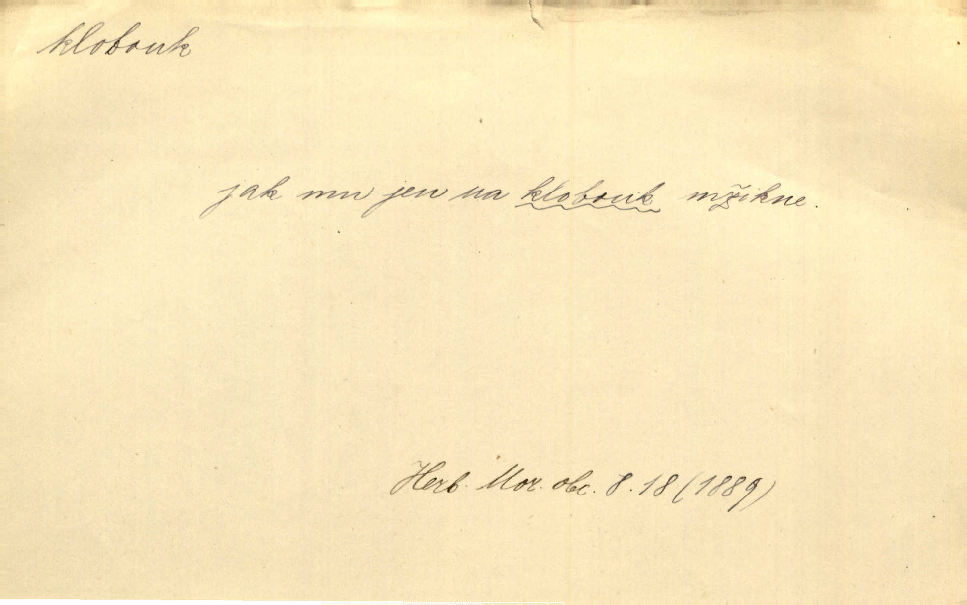 - klobouk, -u m. u mužů pokrývka hlavy z tužší látky (plsti, slámy a p.) se střechou; u žen jakákoli tužší pokrývka hlavy. I pod ošumělým kloboukem moudrá hlava bývá. Přísl. Husté vlasy hrnuly se zpod klobouka. Šmil. Klobouk měl hluboko do očí vtlačený. Štěp. [Služka:] Já teď budu nosit klobouky. Baar. Měla klobouk jako slepičí kukaň. Jir. Každý, kdo mimo jde, snímá před ním klobouk uctivě ho pozdravuje. Šmil. [Člověk zdvořilý] div kloboukem svým nezametl chodníku přede mnou. Kam. Tvrdý, černý klobouk s dírkou. V. Mrš. Měkký, plstěný, slaměný klobouk. Zelený myslivecký klobouk. Pfleg. Kulatý slovanský klobouk opíral se mu o levé ucho. Kun. Mohs získat snadno klobouk admirála státi se admirálem. Mach. [Řím] zdráhá se uděliti mu klobouk kardinálský hodnost kardinálskou. Mach. Arch. Ti officiálové chodí pod kloboukem a umějí leccos latině blektati nosí klobouk značící universitní hodnost. Win. O nepodajnou řečtinu a latinu rozbily se hrdé naděje v doktorský klobouk. Čech. [Důstojníci měli] černé klobouky třírohé, zlatem premované. Jir. Na hlavě měl dvourohý klobouk, jako loď. Klicp. Starý soused v klobouku na tři facky. Jir. Nerozumím modnímu střihu, mívám na sobě pomačkanou náprsenku, na kraji roztřepané manšety, klobouk na čtyři facky. Klost. [Ve Švédsku po smrti Karla XII.] usilovala šlechtická strana bojovná, t. zv. strana klobouků, o odvetu proti Rusku. Bidlo. Arch. Nový šalíř a dva železné klobouky druh přilbic. Jir. Mysl. Na lov nosil se sokol opatřený kuklí či kloboukem. A. Břez. Ustál. spoj. [Hercův výkon] vymáhá prostě úctu. Říká se tomu běžnou frásí: klobouk dolů! Čas. Nebudu se ani rmoutit, dám si klobouk na stranu. Rub. Pro jednu pannu klobouk na stranu netrápiti se a býti vesel. Pořek. Už měl trochu za kloboukem byl podnapilý. Herb. [Tkanička] maje již pod kloboukem, pořád se mezi ně [rozvaděné hosty] pletl v hlavě. Jir. Pod kloboukem mu strašilo mátl se na rozumu. Paleč. [Čtenář tohoto nesmyslu] nesoudil by nic jinak, než že brusičovi [oprávci jazyka] straší pod kloboukem nemá všech pět pohromadě. Kos. Však se to na dlouze neutají pod kloboukem neudrží v tajnosti. Obzor. Má vrchního pod kloboukem pro všechny případy zajištěna, v hrsti. Herb. Je to [intelektuálové] materiál velmi různorodý, který je těžko dostati pod jeden klobouk zorganisovati do jedné politické strany. Přít. Lepší hrst jistoty, než klobouk naděje mnoho. Tomsa. Úřad mu spadl jako hruška do klobouka dostalo se mu ho bez vlastního přičinění, náhodou. Herb. Svou duchovní svobodu může si dát za klobouk nic mu není platná. Přít. D věc tvarem podobná klobouku. Klobouk cukru homole. Vysoká čepice na způsob cukrového klobouku. Kram. [U kupce] pod skleněným kloboukem ukryt jest sýr poklopem. Prav. D vrchní část něčeho. Klobouk hutní peci, kovářské výhně. Tech. druh uzávěrky destilačních přístrojů, kapsle, kalota. Horn. železný klobouk oxydované pásmo rudných ložisek. Vin. (při kvašení vína) shluk pevných součástek matolin usazující se na povrchu kapaliny. Bot. část plodnice hub rouškatých. Červený klobouk muchomůrky. Pfleg.