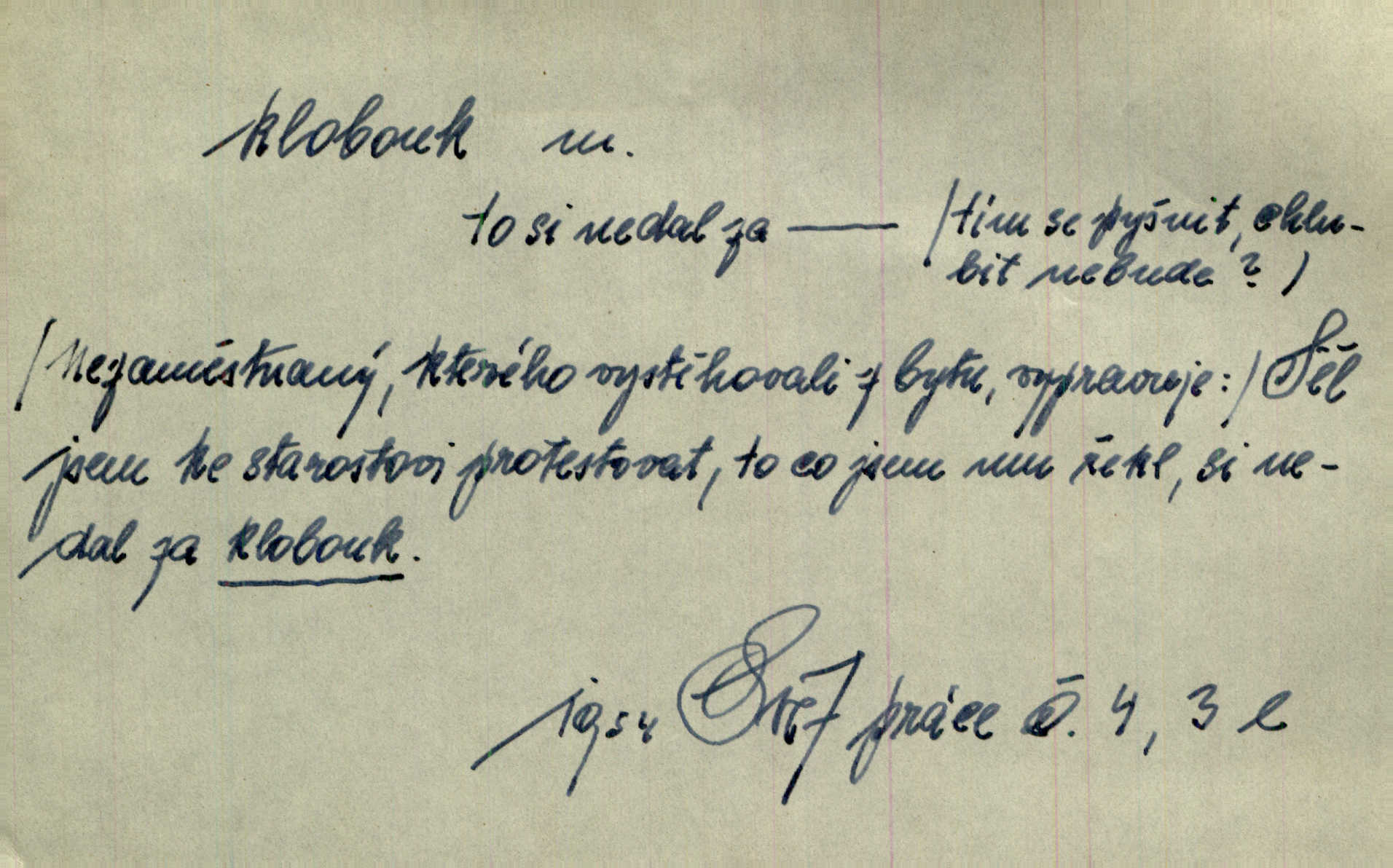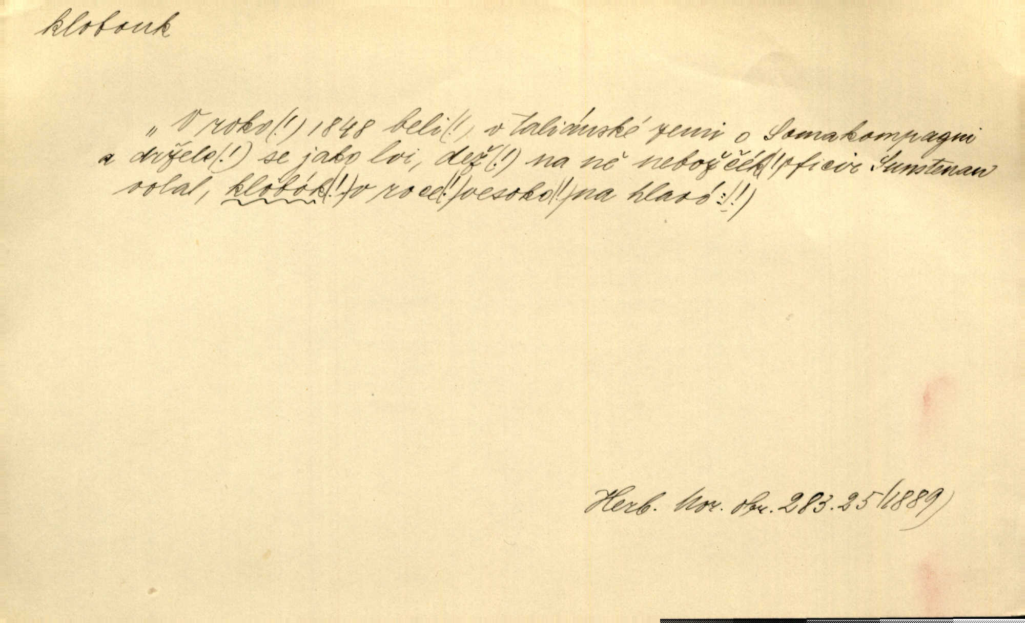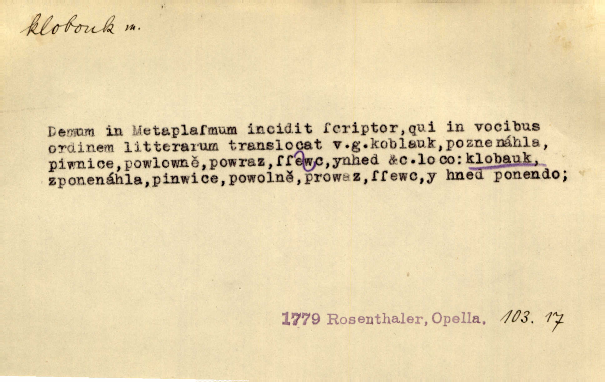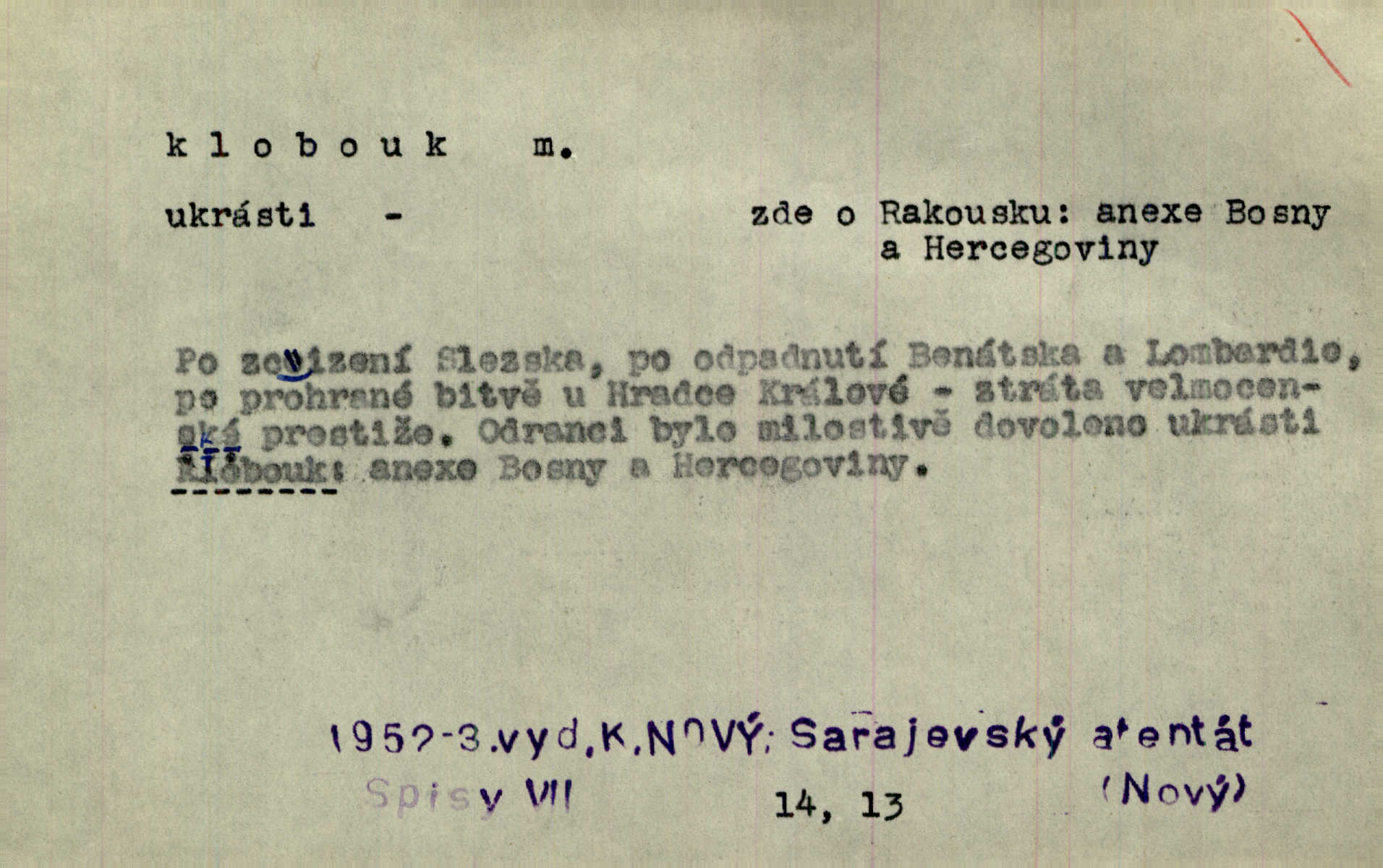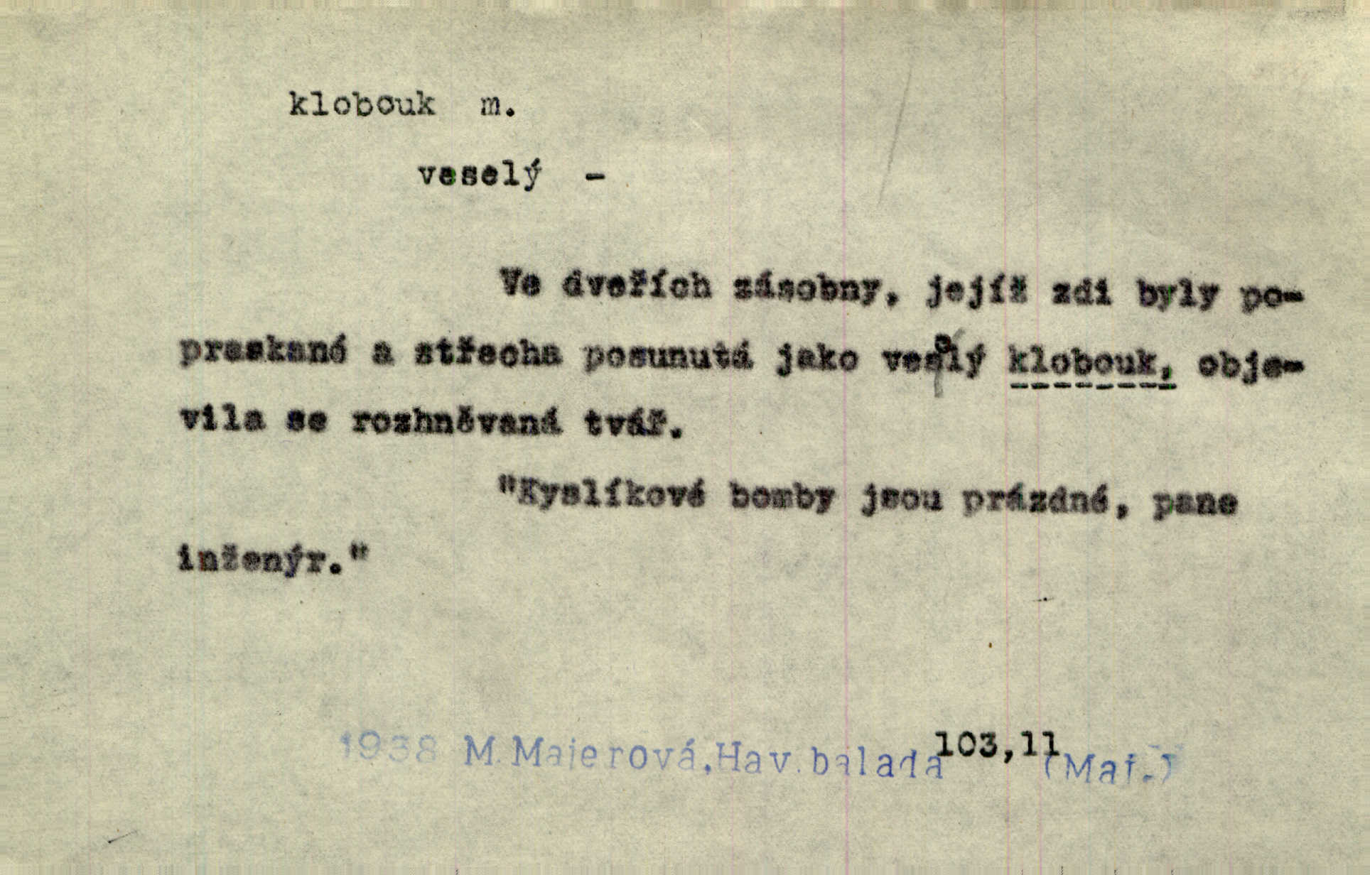 - klobouk, -u m. u mužů pokrývka hlavy z tužší látky (plsti, slámy a p.) se střechou; u žen jakákoli tužší pokrývka hlavy. I pod ošumělým kloboukem moudrá hlava bývá. Přísl. Husté vlasy hrnuly se zpod klobouka. Šmil. Klobouk měl hluboko do očí vtlačený. Štěp. [Služka:] Já teď budu nosit klobouky. Baar. Měla klobouk jako slepičí kukaň. Jir. Každý, kdo mimo jde, snímá před ním klobouk uctivě ho pozdravuje. Šmil. [Člověk zdvořilý] div kloboukem svým nezametl chodníku přede mnou. Kam. Tvrdý, černý klobouk s dírkou. V. Mrš. Měkký, plstěný, slaměný klobouk. Zelený myslivecký klobouk. Pfleg. Kulatý slovanský klobouk opíral se mu o levé ucho. Kun. Mohs získat snadno klobouk admirála státi se admirálem. Mach. [Řím] zdráhá se uděliti mu klobouk kardinálský hodnost kardinálskou. Mach. Arch. Ti officiálové chodí pod kloboukem a umějí leccos latině blektati nosí klobouk značící universitní hodnost. Win. O nepodajnou řečtinu a latinu rozbily se hrdé naděje v doktorský klobouk. Čech. [Důstojníci měli] černé klobouky třírohé, zlatem premované. Jir. Na hlavě měl dvourohý klobouk, jako loď. Klicp. Starý soused v klobouku na tři facky. Jir. Nerozumím modnímu střihu, mívám na sobě pomačkanou náprsenku, na kraji roztřepané manšety, klobouk na čtyři facky. Klost. [Ve Švédsku po smrti Karla XII.] usilovala šlechtická strana bojovná, t. zv. strana klobouků, o odvetu proti Rusku. Bidlo. Arch. Nový šalíř a dva železné klobouky druh přilbic. Jir. Mysl. Na lov nosil se sokol opatřený kuklí či kloboukem. A. Břez. Ustál. spoj. [Hercův výkon] vymáhá prostě úctu. Říká se tomu běžnou frásí: klobouk dolů! Čas. Nebudu se ani rmoutit, dám si klobouk na stranu. Rub. Pro jednu pannu klobouk na stranu netrápiti se a býti vesel. Pořek. Už měl trochu za kloboukem byl podnapilý. Herb. [Tkanička] maje již pod kloboukem, pořád se mezi ně [rozvaděné hosty] pletl v hlavě. Jir. Pod kloboukem mu strašilo mátl se na rozumu. Paleč. [Čtenář tohoto nesmyslu] nesoudil by nic jinak, než že brusičovi [oprávci jazyka] straší pod kloboukem nemá všech pět pohromadě. Kos. Však se to na dlouze neutají pod kloboukem neudrží v tajnosti. Obzor. Má vrchního pod kloboukem pro všechny případy zajištěna, v hrsti. Herb. Je to [intelektuálové] materiál velmi různorodý, který je těžko dostati pod jeden klobouk zorganisovati do jedné politické strany. Přít. Lepší hrst jistoty, než klobouk naděje mnoho. Tomsa. Úřad mu spadl jako hruška do klobouka dostalo se mu ho bez vlastního přičinění, náhodou. Herb. Svou duchovní svobodu může si dát za klobouk nic mu není platná. Přít. D věc tvarem podobná klobouku. Klobouk cukru homole. Vysoká čepice na způsob cukrového klobouku. Kram. [U kupce] pod skleněným kloboukem ukryt jest sýr poklopem. Prav. D vrchní část něčeho. Klobouk hutní peci, kovářské výhně. Tech. druh uzávěrky destilačních přístrojů, kapsle, kalota. Horn. železný klobouk oxydované pásmo rudných ložisek. Vin. (při kvašení vína) shluk pevných součástek matolin usazující se na povrchu kapaliny. Bot. část plodnice hub rouškatých. Červený klobouk muchomůrky. Pfleg.