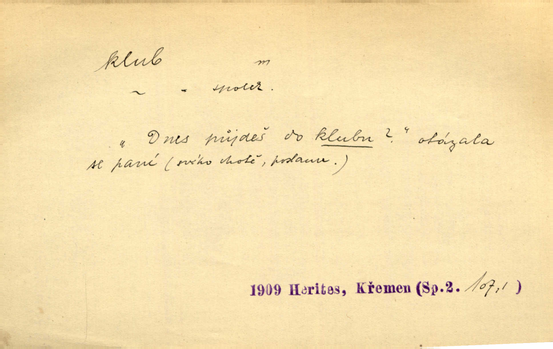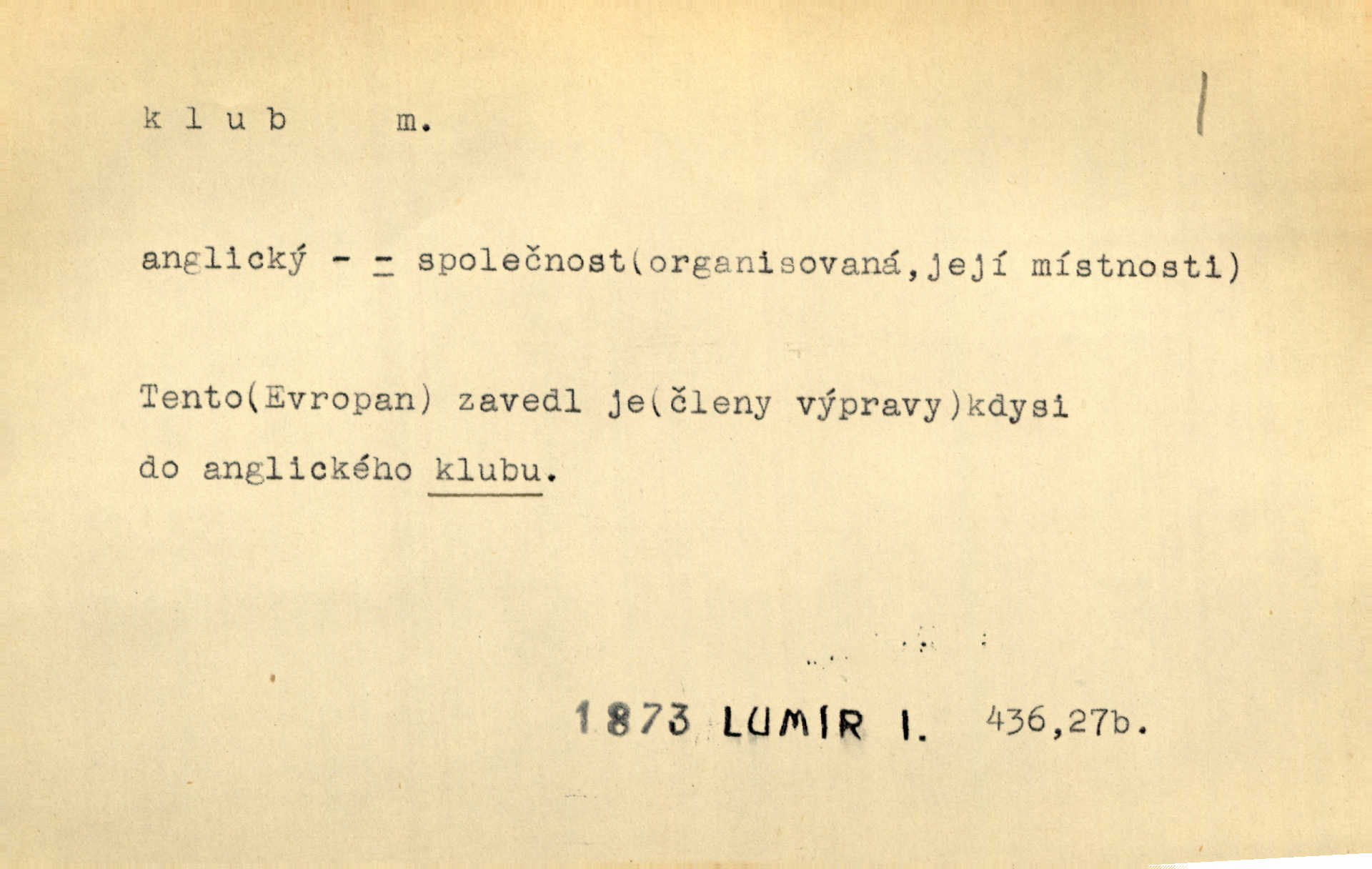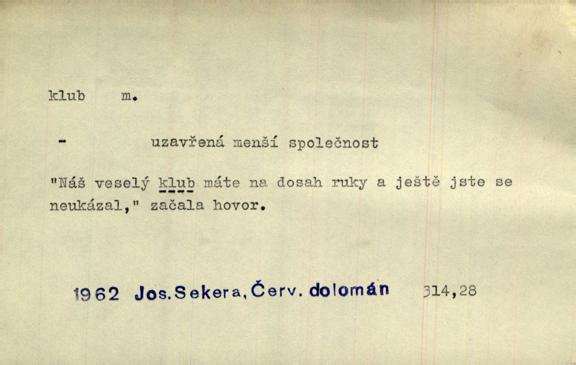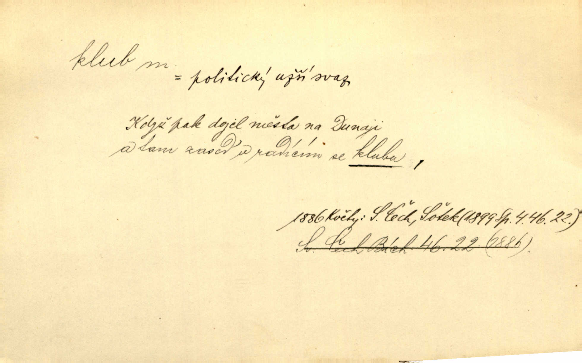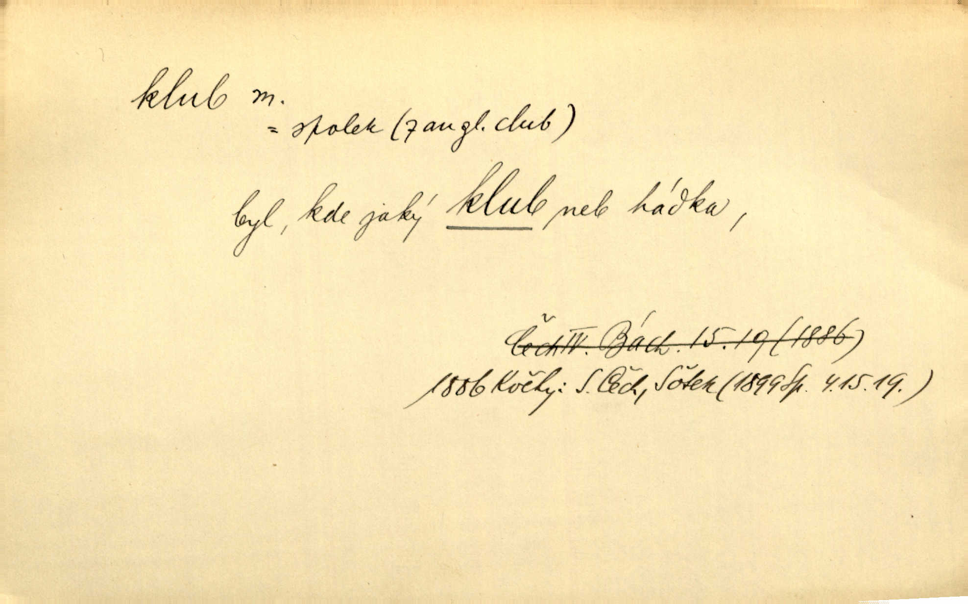 - klub, -u m. uzavřená společnost, zvl. menší, vybranější n. mající i společenský účel (k zábavě, sportu, pěstění literatury, politiky a p.): sdružení, spolek. Vypravovala obsah jakési jednoaktovky, kterou hráli na Vinohradech v soukromém klubu dam. V. Mrš. V klubu poslanců českých panovala nezkalená svornost. Grégr. Společenský klub. Klub čsl. turistů. Klub moderních filologů. Evropský literární klub.
