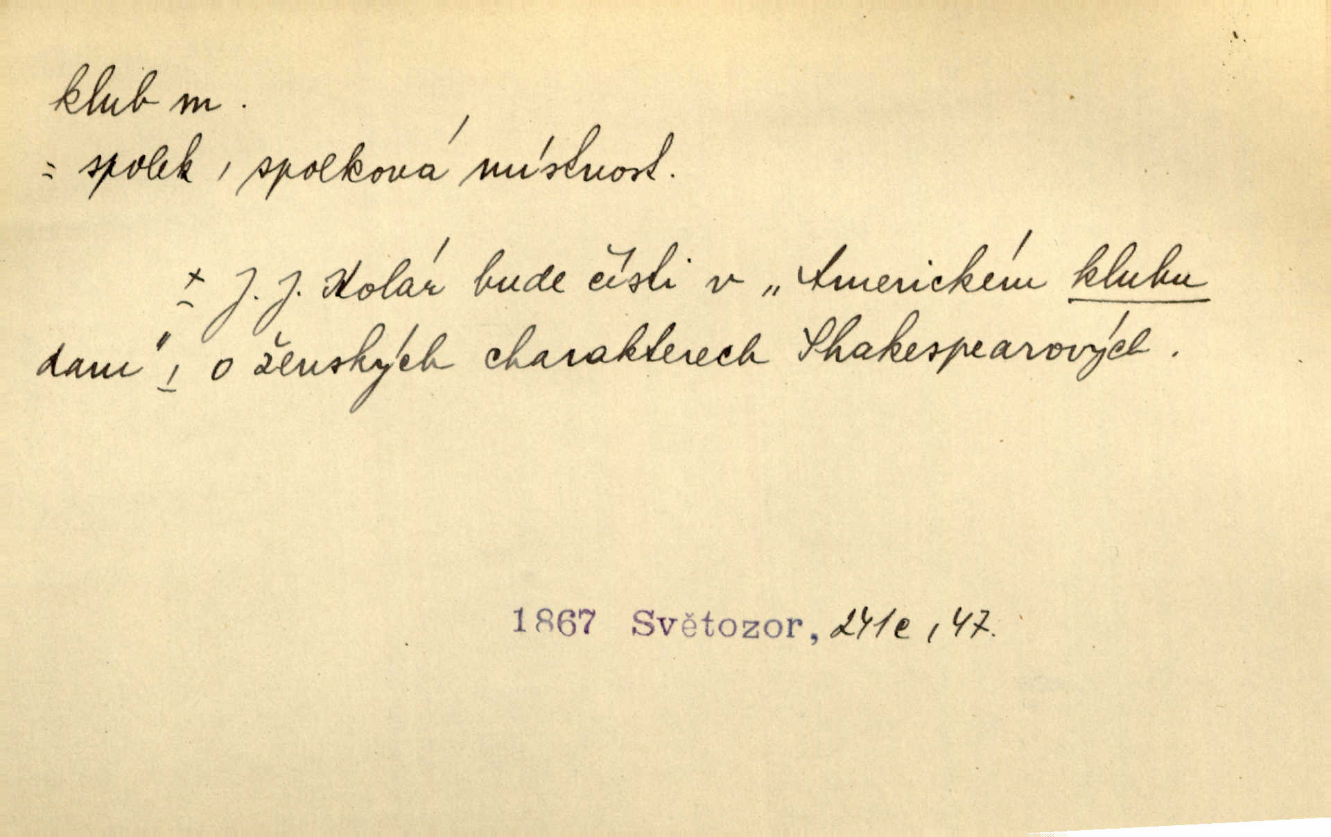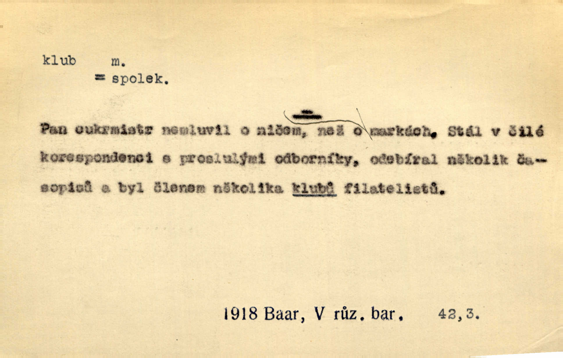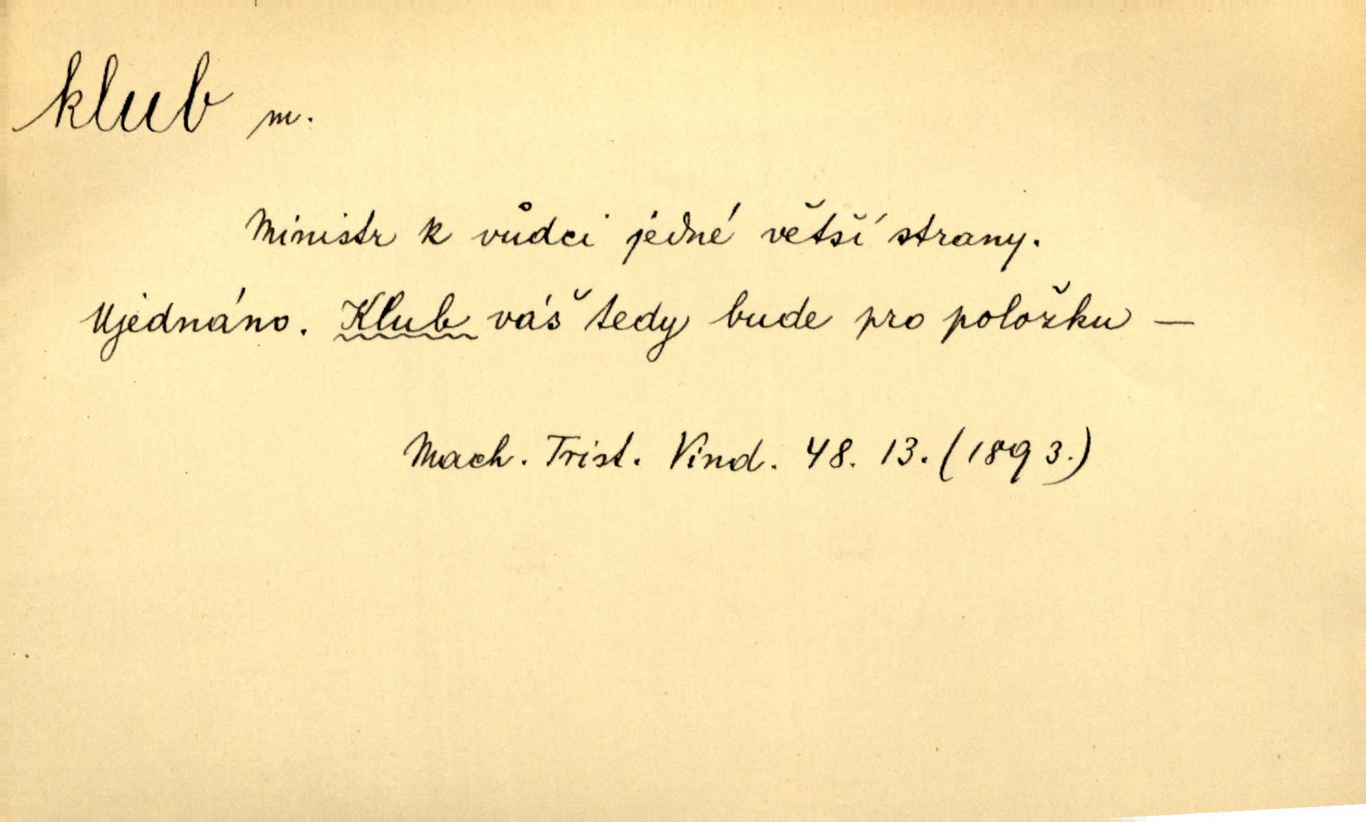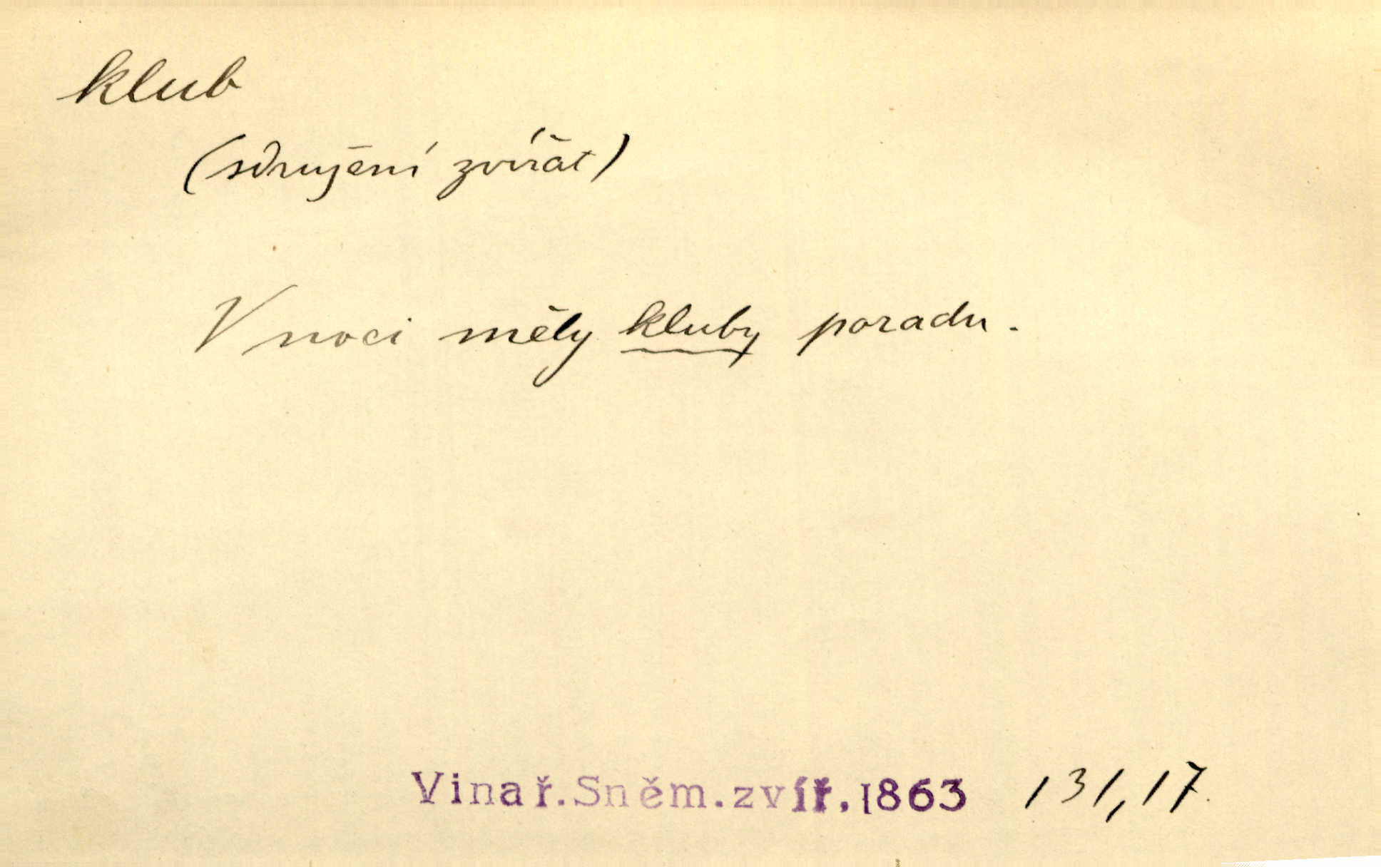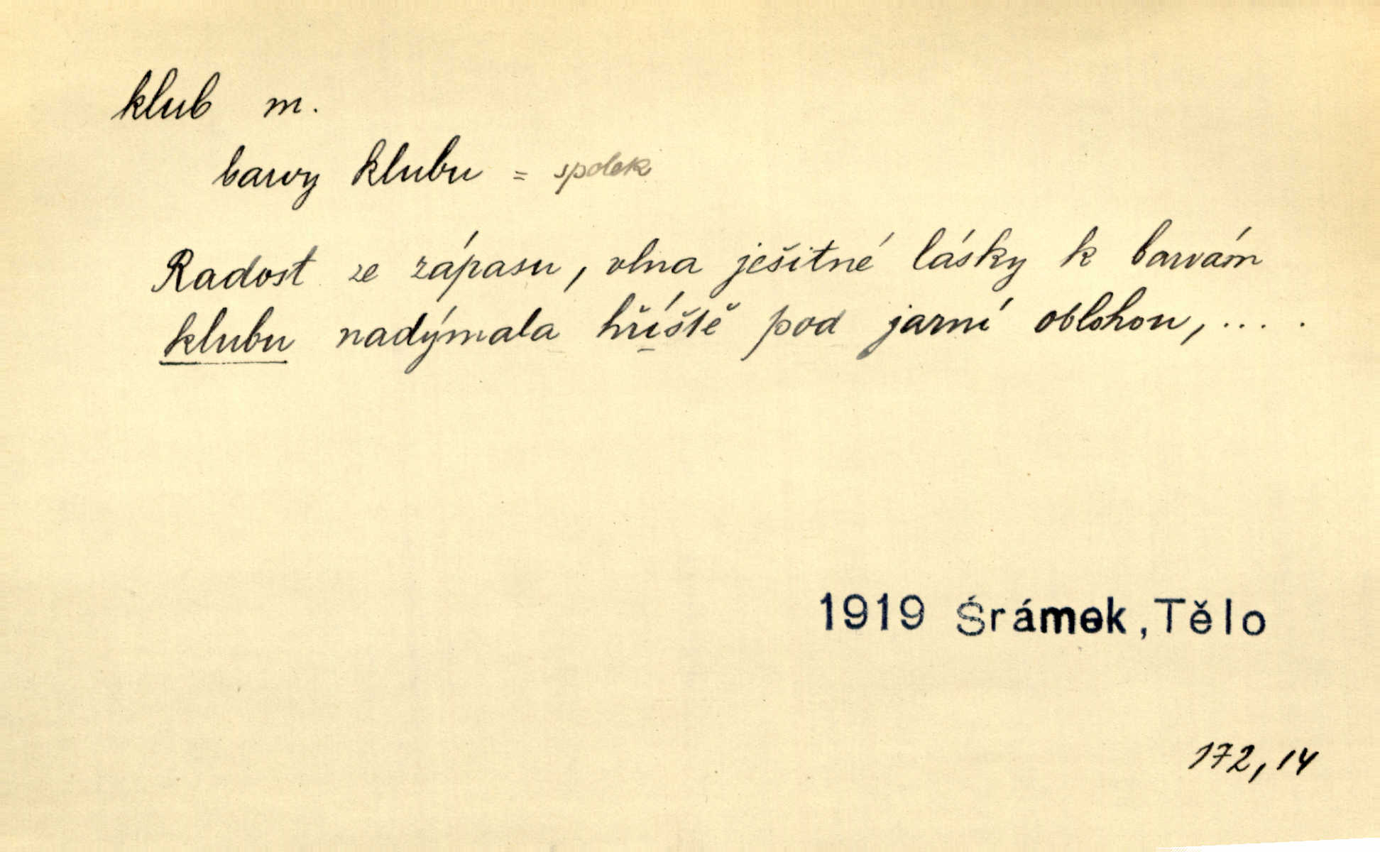 - klub, -u m. uzavřená společnost, zvl. menší, vybranější n. mající i společenský účel (k zábavě, sportu, pěstění literatury, politiky a p.): sdružení, spolek. Vypravovala obsah jakési jednoaktovky, kterou hráli na Vinohradech v soukromém klubu dam. V. Mrš. V klubu poslanců českých panovala nezkalená svornost. Grégr. Společenský klub. Klub čsl. turistů. Klub moderních filologů. Evropský literární klub.
