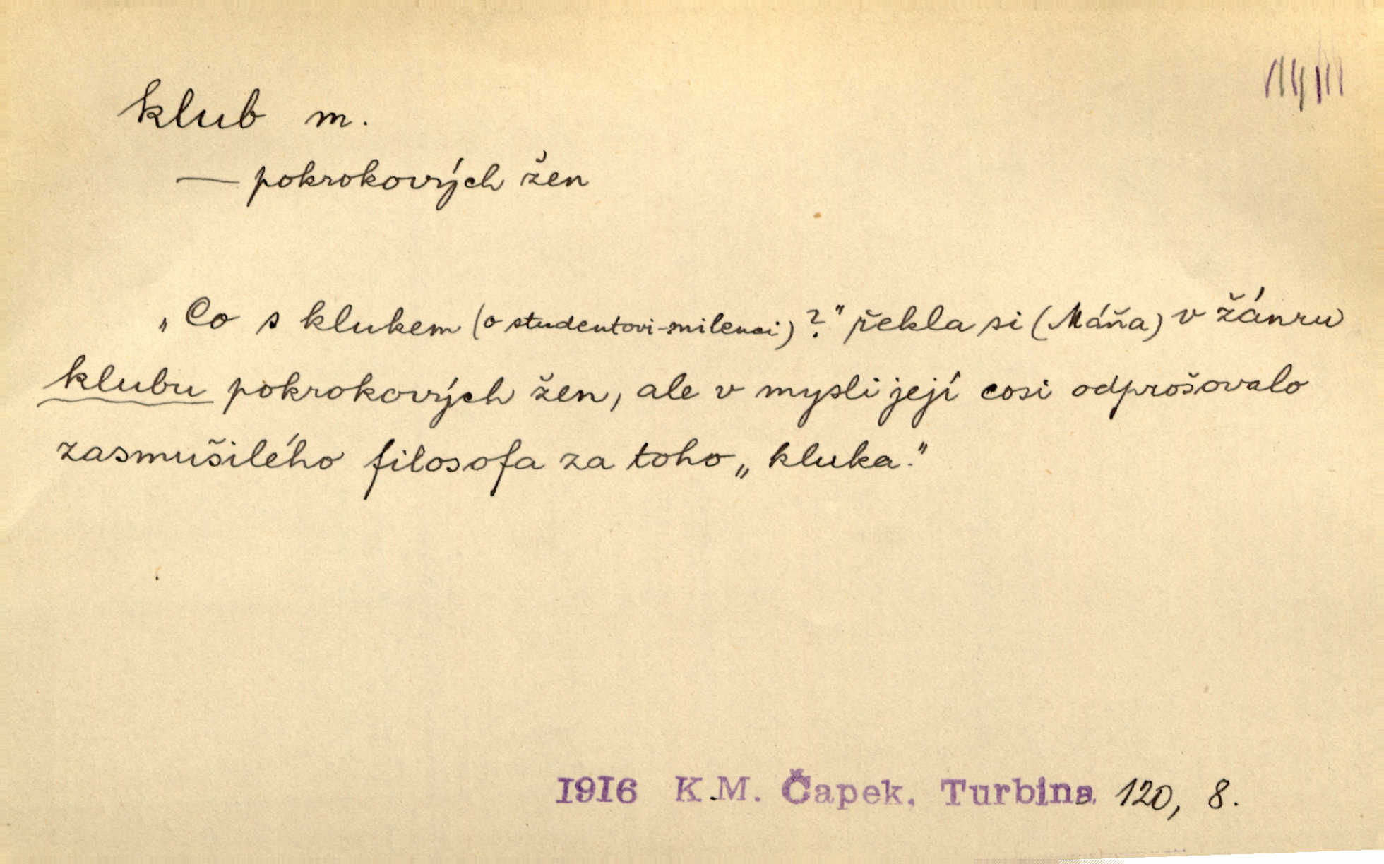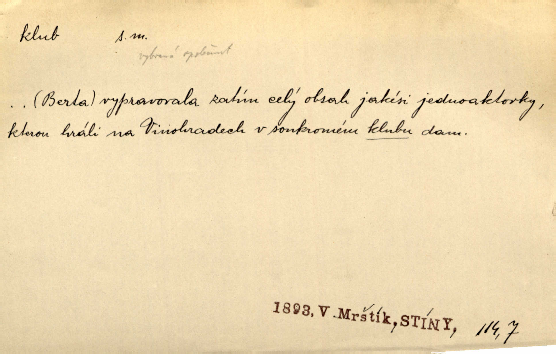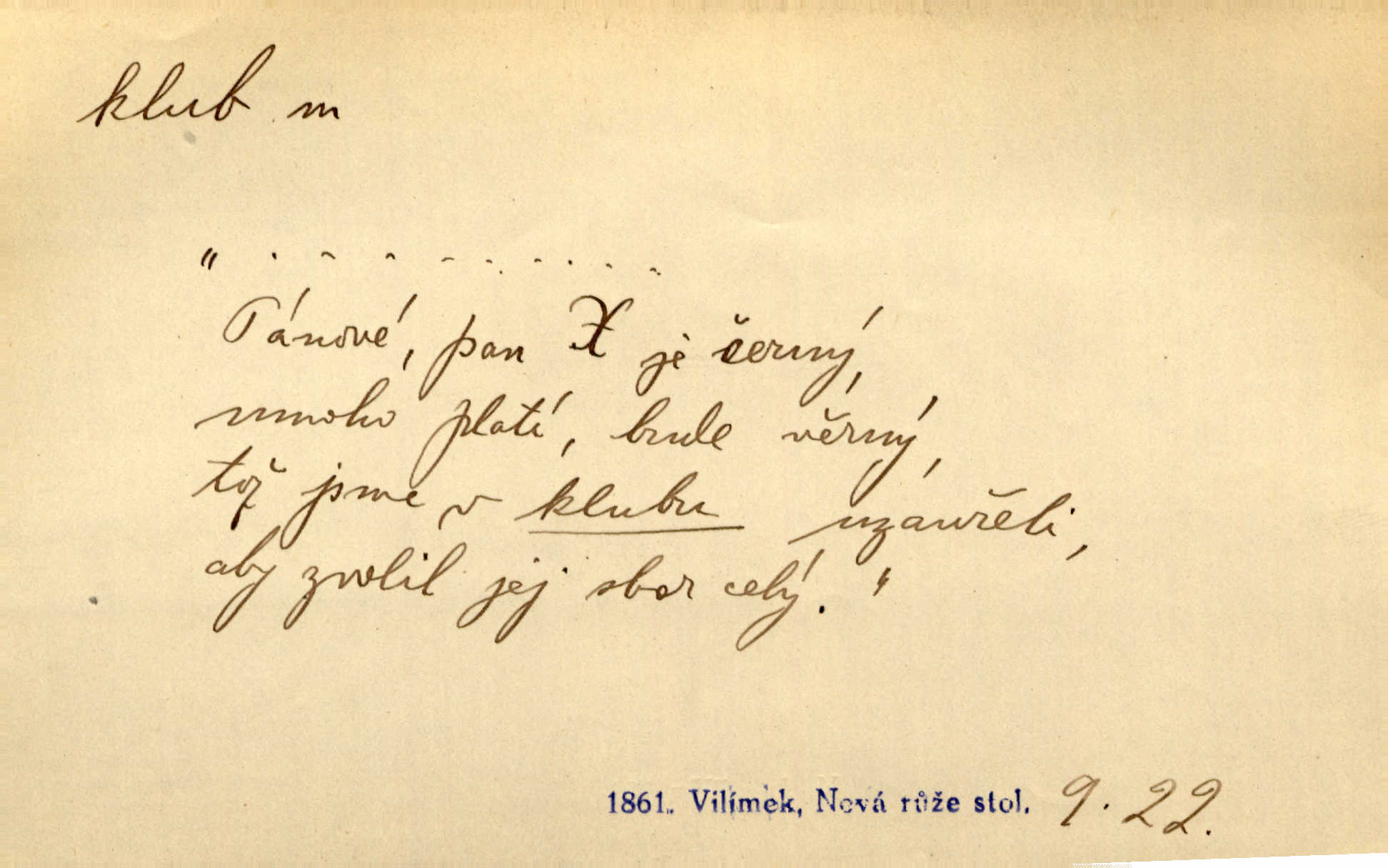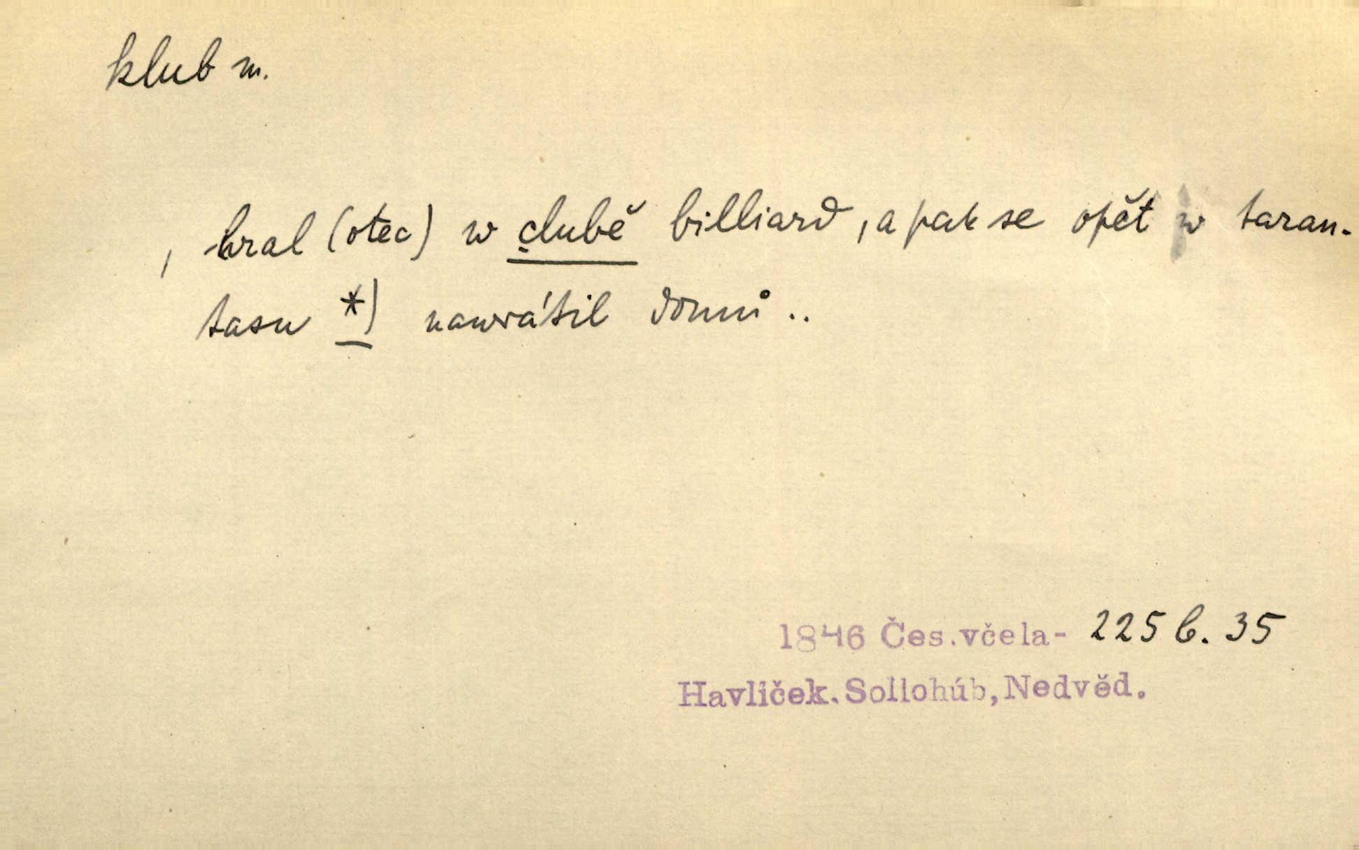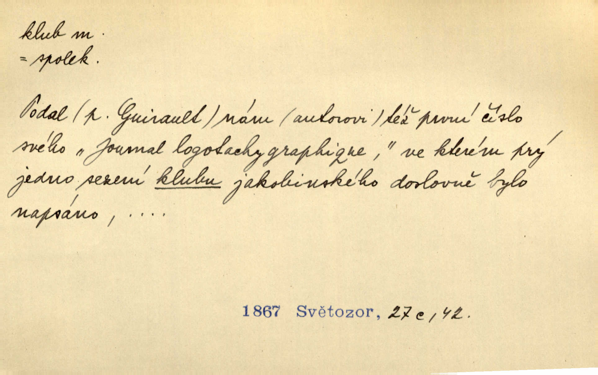 - klub, -u m. uzavřená společnost, zvl. menší, vybranější n. mající i společenský účel (k zábavě, sportu, pěstění literatury, politiky a p.): sdružení, spolek. Vypravovala obsah jakési jednoaktovky, kterou hráli na Vinohradech v soukromém klubu dam. V. Mrš. V klubu poslanců českých panovala nezkalená svornost. Grégr. Společenský klub. Klub čsl. turistů. Klub moderních filologů. Evropský literární klub.