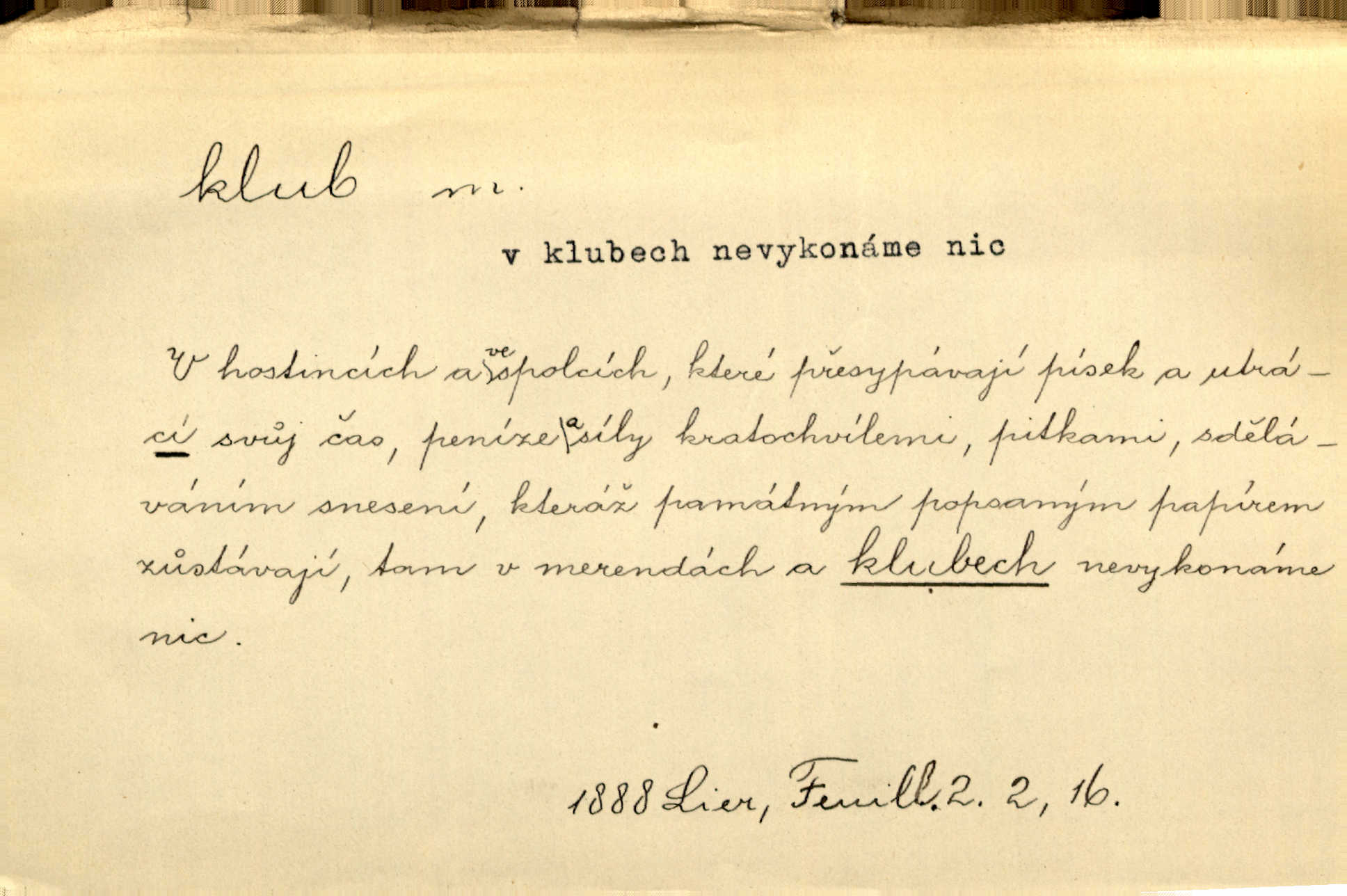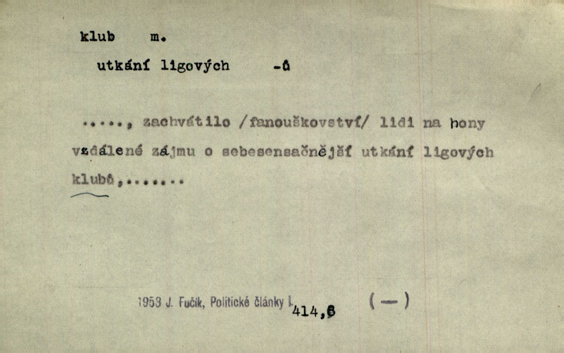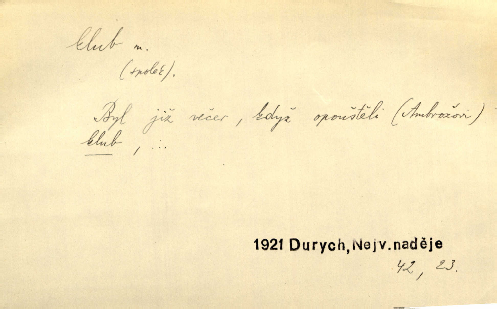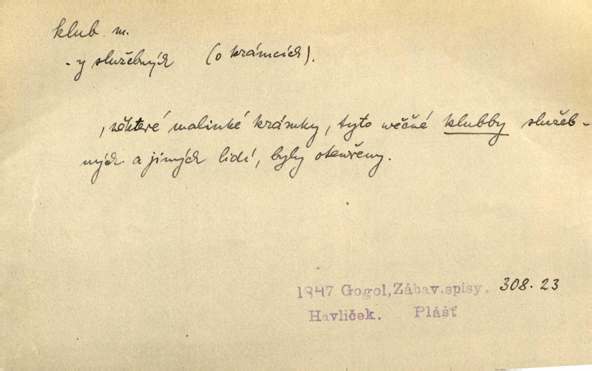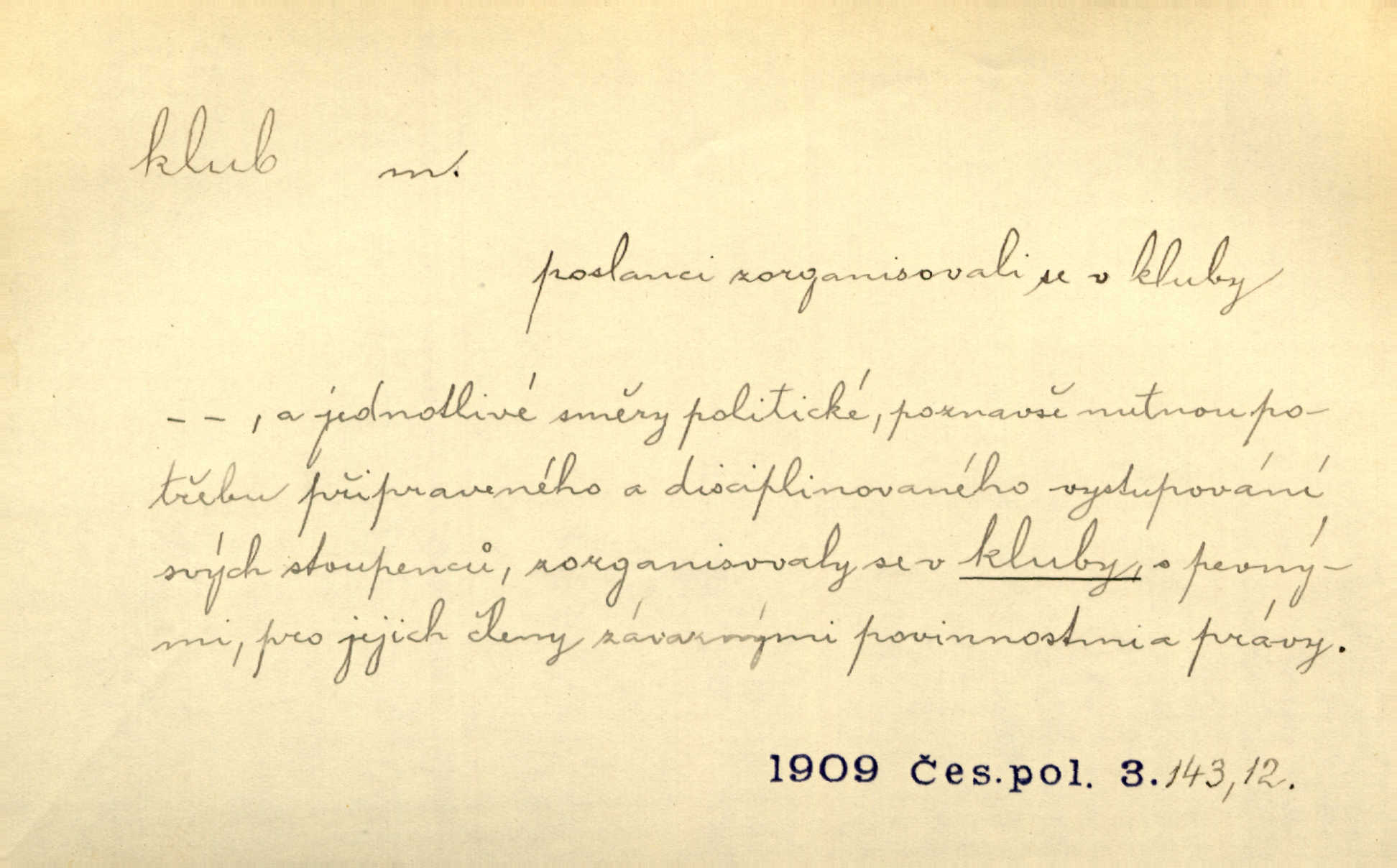 - klub, -u m. uzavřená společnost, zvl. menší, vybranější n. mající i společenský účel (k zábavě, sportu, pěstění literatury, politiky a p.): sdružení, spolek. Vypravovala obsah jakési jednoaktovky, kterou hráli na Vinohradech v soukromém klubu dam. V. Mrš. V klubu poslanců českých panovala nezkalená svornost. Grégr. Společenský klub. Klub čsl. turistů. Klub moderních filologů. Evropský literární klub.