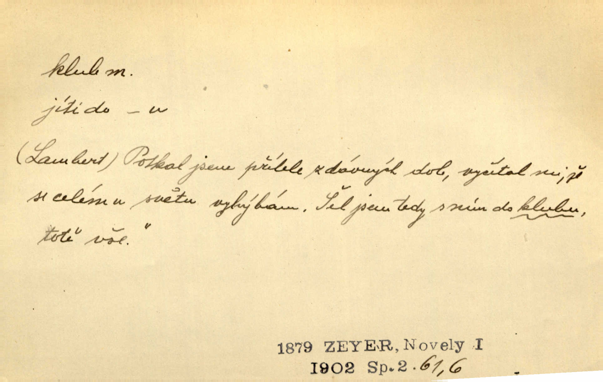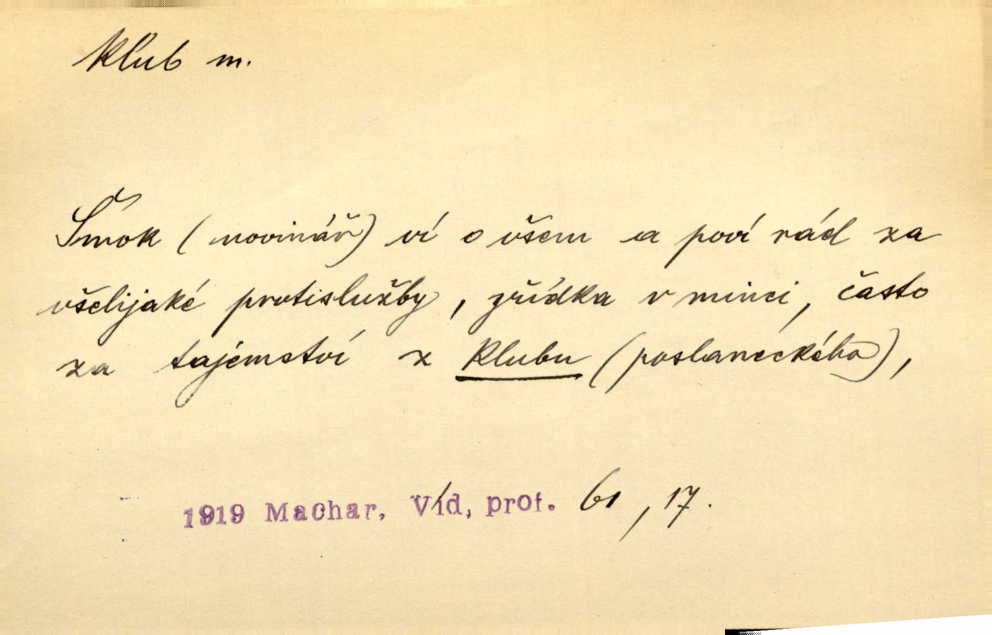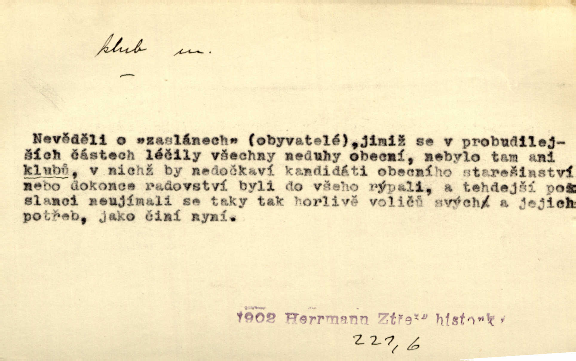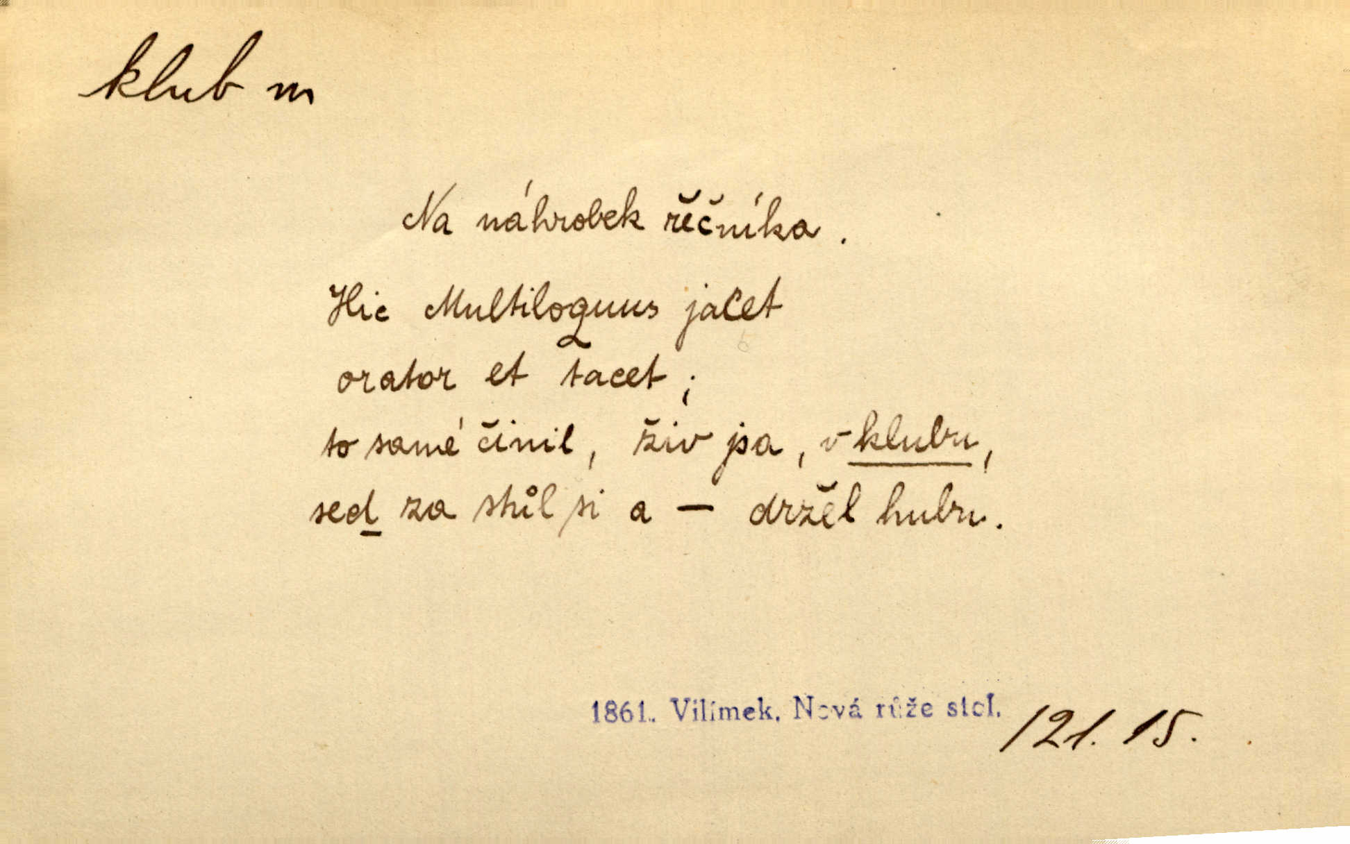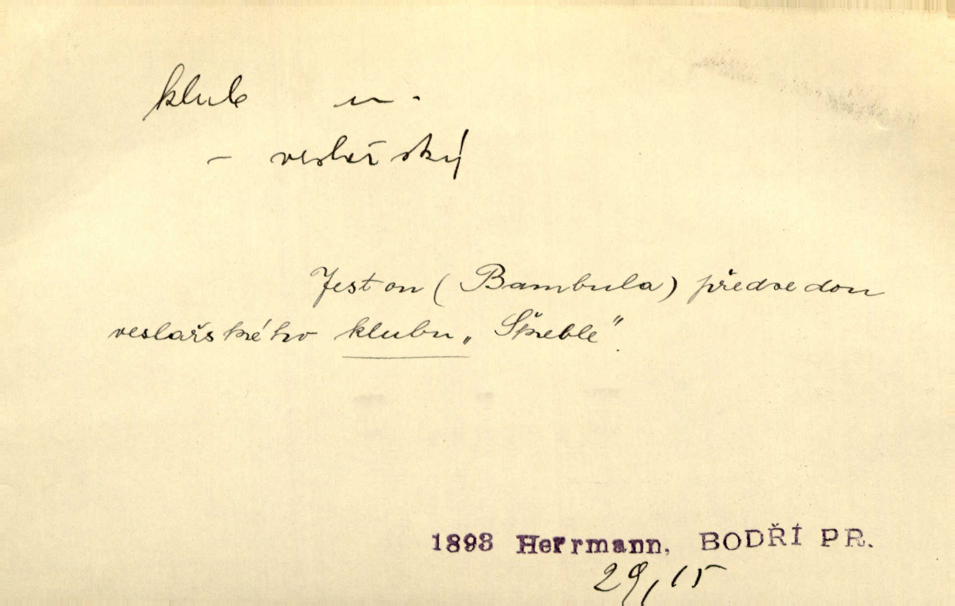 - klub, -u m. uzavřená společnost, zvl. menší, vybranější n. mající i společenský účel (k zábavě, sportu, pěstění literatury, politiky a p.): sdružení, spolek. Vypravovala obsah jakési jednoaktovky, kterou hráli na Vinohradech v soukromém klubu dam. V. Mrš. V klubu poslanců českých panovala nezkalená svornost. Grégr. Společenský klub. Klub čsl. turistů. Klub moderních filologů. Evropský literární klub.
