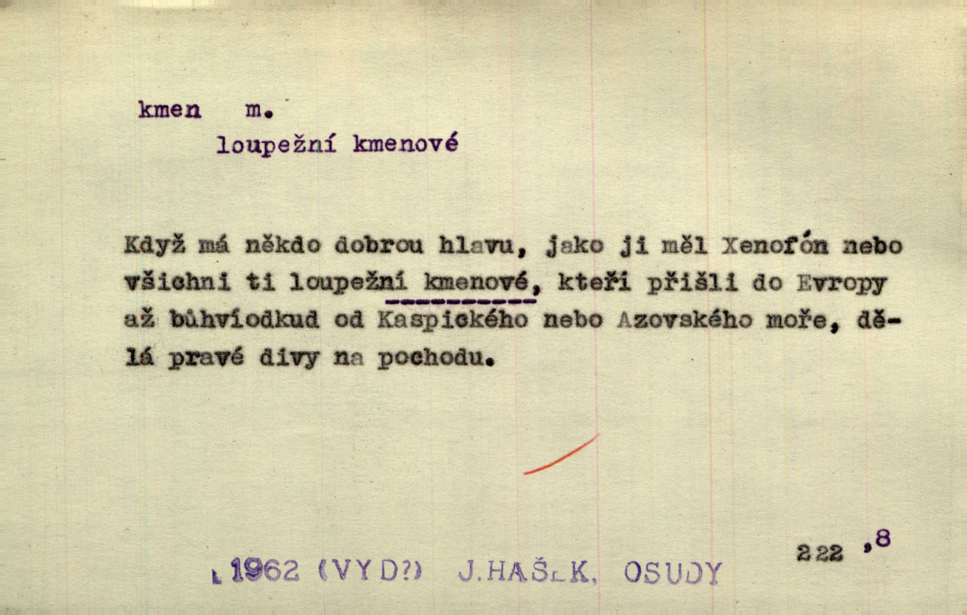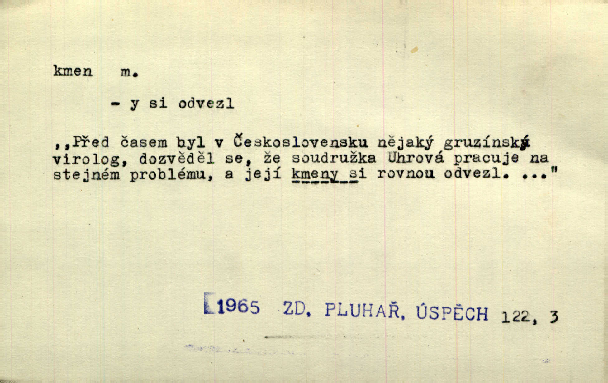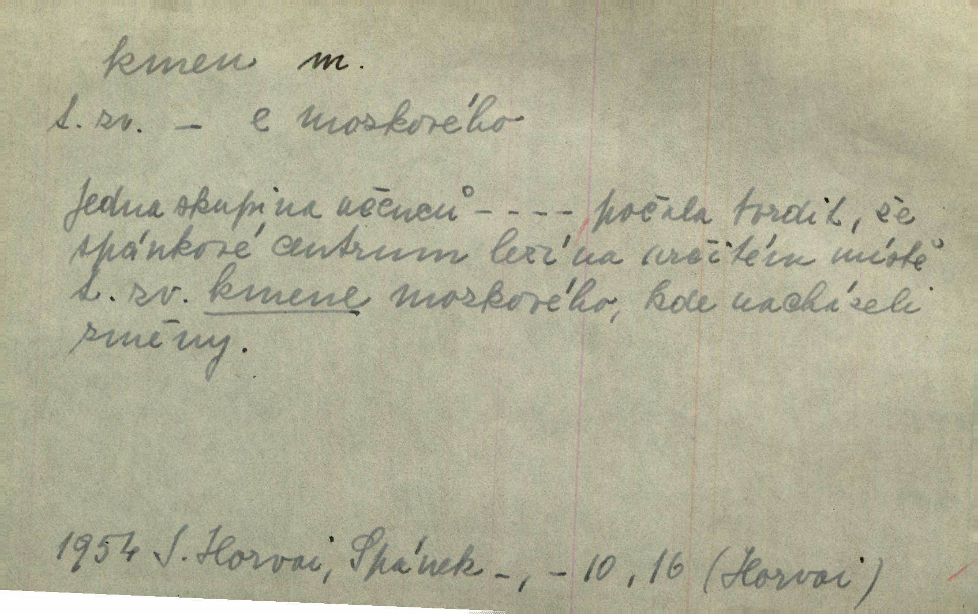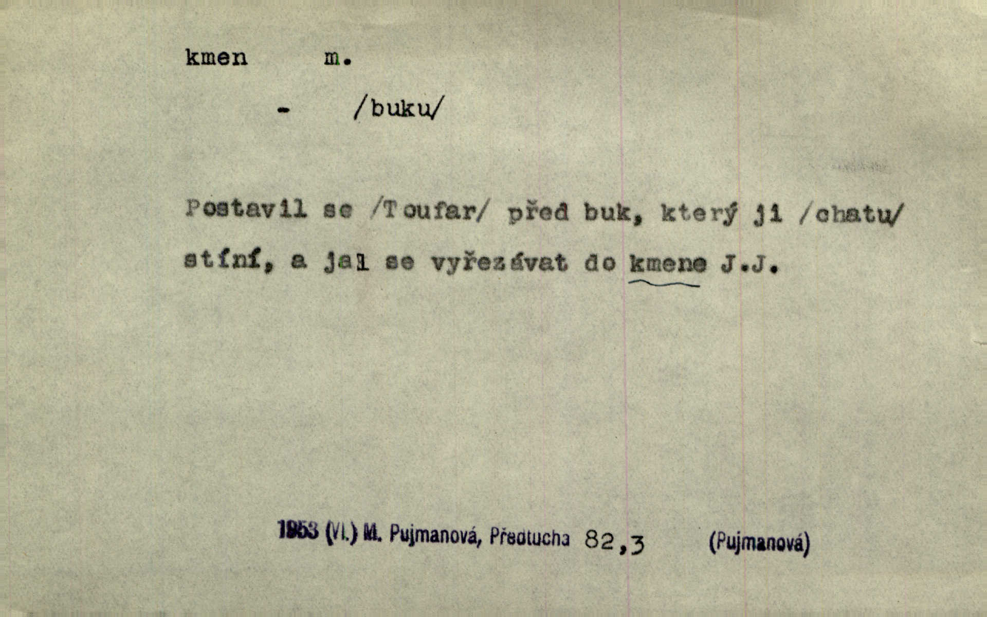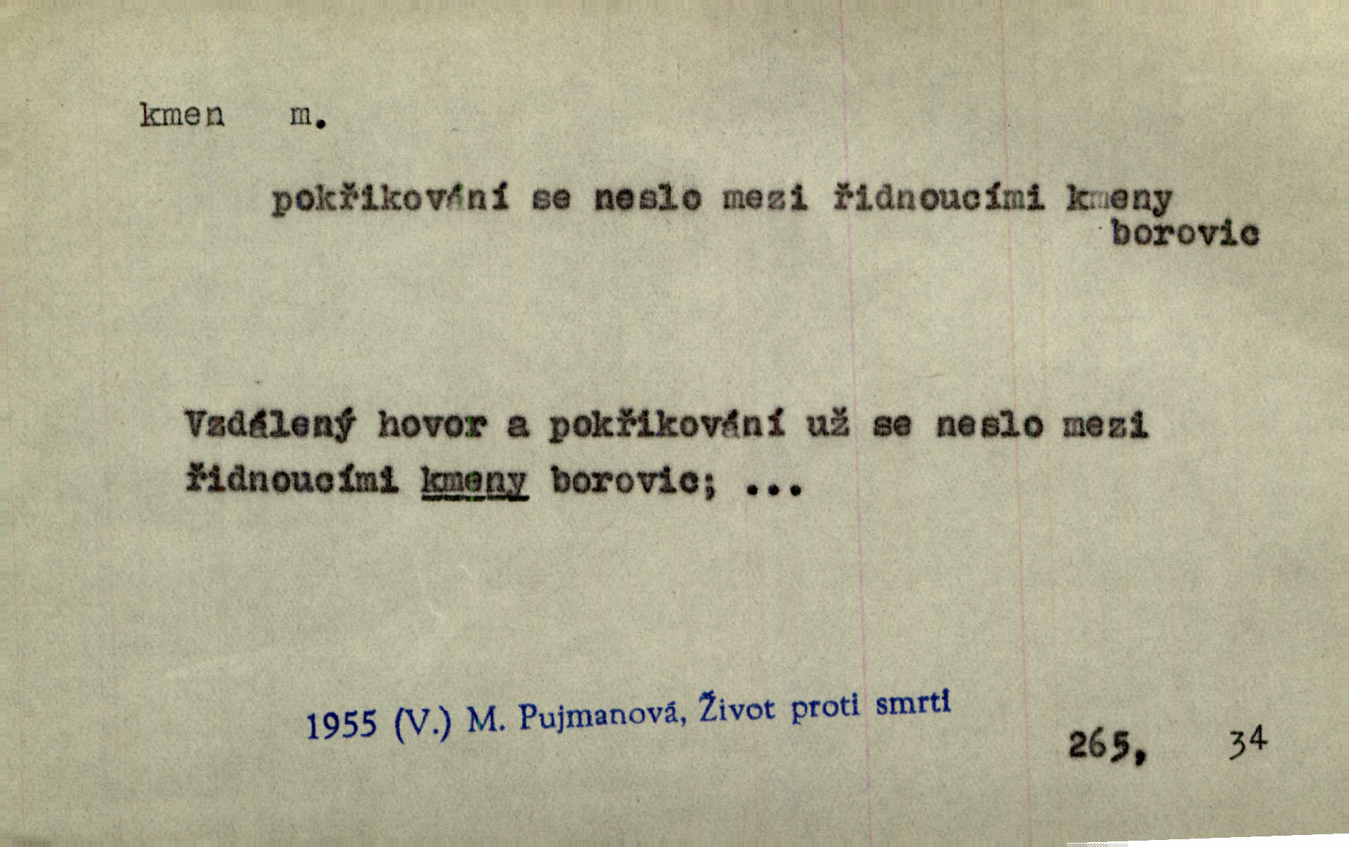 - kmen, -e i -u m. hlavní nadzemní část dřevin, zvl. stromů, peň. Kmen kvetoucí jabloně. Něm. Děvčátko zastavilo se u kmene staré lípy. Jir. Převzal celý kus lesa. Musel kmeny voziti k řece, po níž je dále plavil klády. Prav. Les. kmen loupaný, kmen na prkna, kmen pramenový vorová kláda. Vin. matečný kmen [révy]. D Řidč. silná větev stromu. Laca posadil se na nejvyšší kmen [hrušně] směle jako vrabec. Preis. Že se mnoholetá jíva nízko v pevné kmeny rozpínala, bylo by se mu [zoufalci chystajícímu se k oběšení] snad dost snadno podařilo, nahoru se vyhoupnout. Tyl. D název rozličně velkých skupin lidstva dělených podle příbuznosti: větší celek nežli rod, část národa. Staré vnitroafrické kmeny černošské. K. Čap. Spojiti rozdrobené až posud národy a kmeny jihoslovanské. Havl. Pod nebesy, jež nesou čtyři nejstarší zástupci kmenů Israelských, kráčí Bar Kochba. Vrch. D národ. Národní duch vdechnul nový život v jarý kmen českoslovanský. Sab. Vyniká národ náš i nad jiné slovanské kmeny důvtipem. Pal. Věrný syn kmene israelského. Mácha. D skupina několika příbuzných národů. Jsem dcera českého národa, ten patří ku kmenu slovanskému. Prav. Lidstvo rozpadává se v plemena, tato v čeledi a kmeny, kmenové zas v jednotlivé národy. Čel. Paměti země české začínají se od zpráv o lesu Hercynském a starých jeho obyvatelích kmene celtického a německého. Tomek. D rod. Byl [Václav III.] posledním králem a vládcem nad českou zemí z kmene Přemyslova. Mácha. Kmen mohutných někdy Vítkovcův dělil se za věku tohoto již na několikero větví. Pal. Vždyť je také z kmene Vršovců. Mik. D oddělení při klasifikaci živočichů a rostlin. Biol. soubor jedinců v jistých mezích proměnlivých, ale stejných podle vlohové konstituce, linie. Zool. a bot. skupina příbuzných tříd. Mysl. a hosp. chovný kmen základní rod chovu. D Gram. část slova, která zbývá po oddělení ohýbacích přípon. D základ, podstatná část, jádro něčeho. Kmen její [společnosti] zůstával týž, přizvaní však se často střídali. Herrm. Vy máte [kníže] svůj kmen úředníků a služebníků, někteří co pamět lidská sahá už vašemu rodu slouží. Baar. [Časopisy] měly pevný kmen svých odběratelů. Vrba. Tech. kmen sklářský směs cihlářských surovin v práškovitém stavu. Kmen likérový směs lihu, cukru a vody, likérová základna.