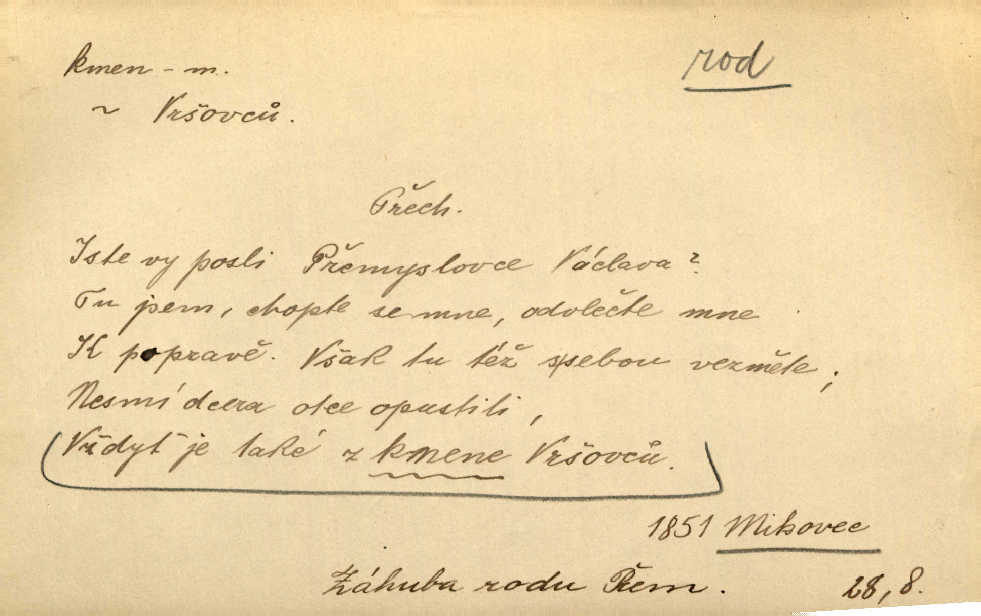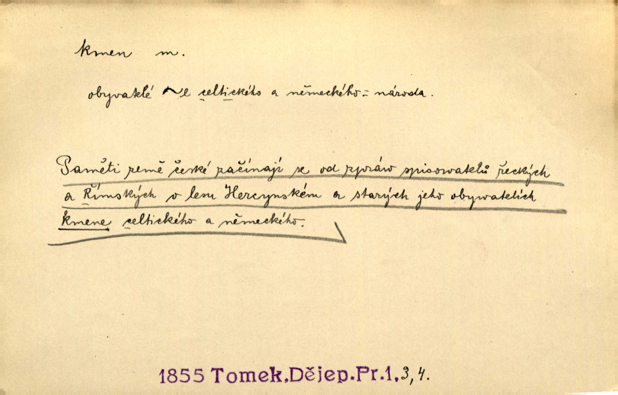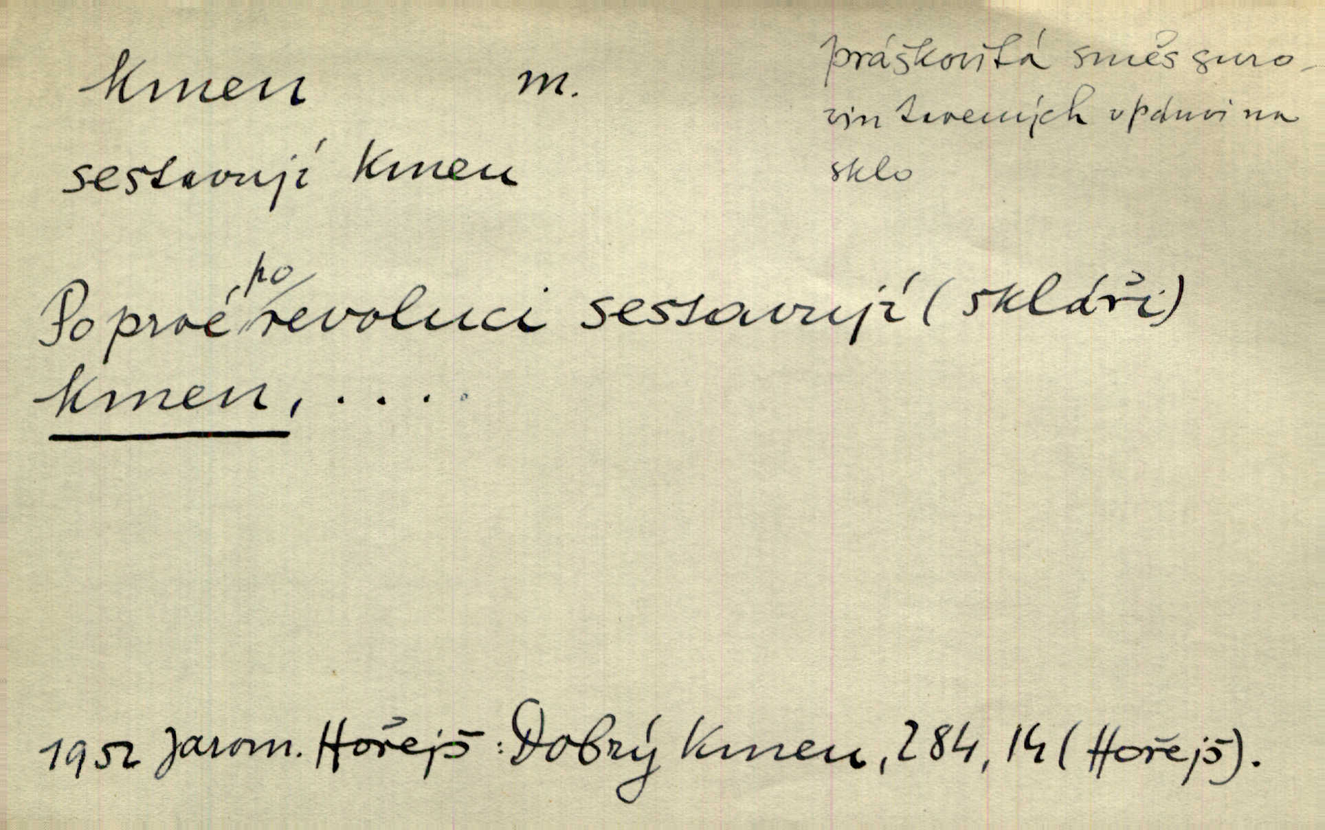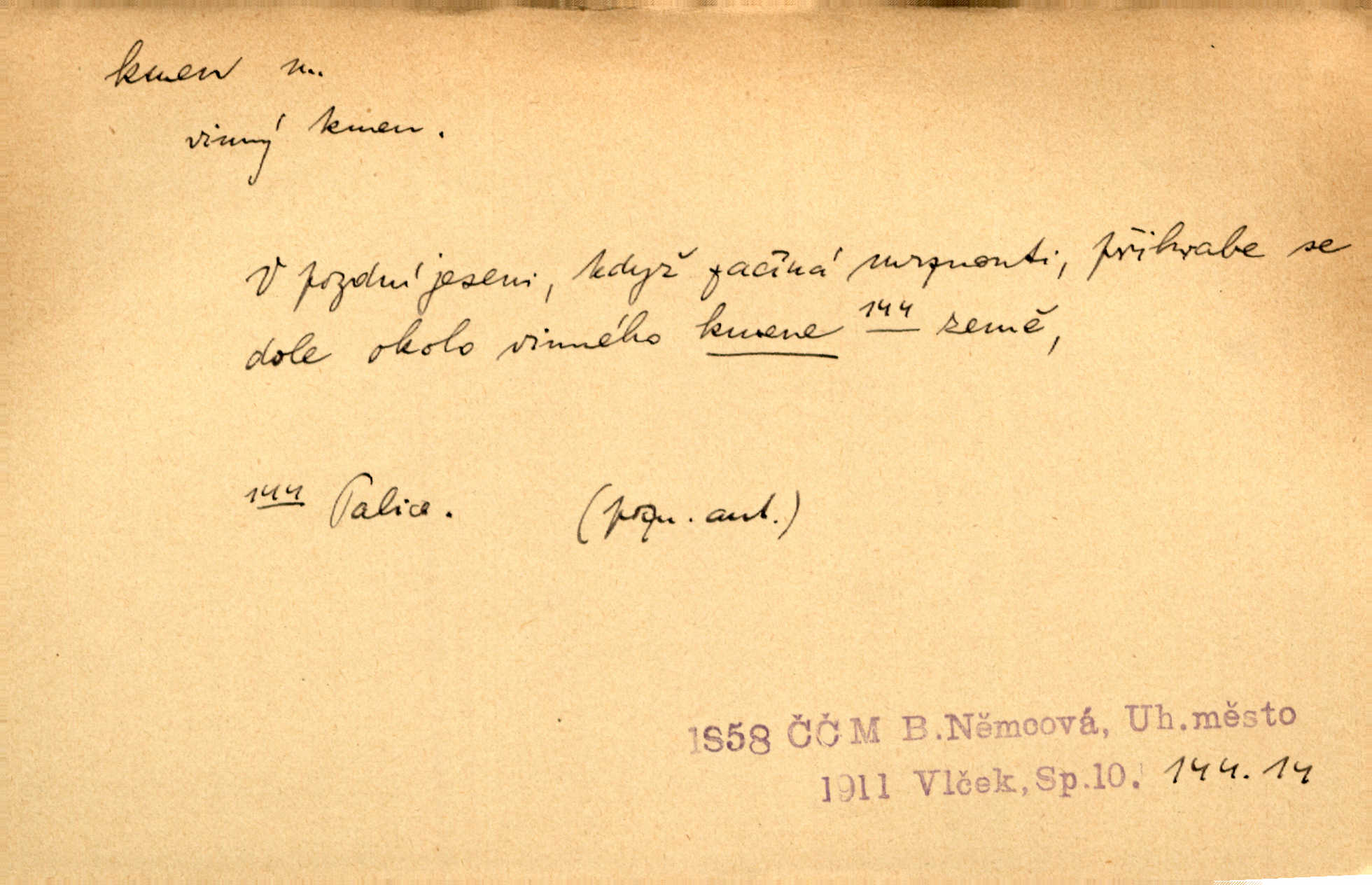 - kmen, -e i -u m. hlavní nadzemní část dřevin, zvl. stromů, peň. Kmen kvetoucí jabloně. Něm. Děvčátko zastavilo se u kmene staré lípy. Jir. Převzal celý kus lesa. Musel kmeny voziti k řece, po níž je dále plavil klády. Prav. Les. kmen loupaný, kmen na prkna, kmen pramenový vorová kláda. Vin. matečný kmen [révy]. D Řidč. silná větev stromu. Laca posadil se na nejvyšší kmen [hrušně] směle jako vrabec. Preis. Že se mnoholetá jíva nízko v pevné kmeny rozpínala, bylo by se mu [zoufalci chystajícímu se k oběšení] snad dost snadno podařilo, nahoru se vyhoupnout. Tyl. D název rozličně velkých skupin lidstva dělených podle příbuznosti: větší celek nežli rod, část národa. Staré vnitroafrické kmeny černošské. K. Čap. Spojiti rozdrobené až posud národy a kmeny jihoslovanské. Havl. Pod nebesy, jež nesou čtyři nejstarší zástupci kmenů Israelských, kráčí Bar Kochba. Vrch. D národ. Národní duch vdechnul nový život v jarý kmen českoslovanský. Sab. Vyniká národ náš i nad jiné slovanské kmeny důvtipem. Pal. Věrný syn kmene israelského. Mácha. D skupina několika příbuzných národů. Jsem dcera českého národa, ten patří ku kmenu slovanskému. Prav. Lidstvo rozpadává se v plemena, tato v čeledi a kmeny, kmenové zas v jednotlivé národy. Čel. Paměti země české začínají se od zpráv o lesu Hercynském a starých jeho obyvatelích kmene celtického a německého. Tomek. D rod. Byl [Václav III.] posledním králem a vládcem nad českou zemí z kmene Přemyslova. Mácha. Kmen mohutných někdy Vítkovcův dělil se za věku tohoto již na několikero větví. Pal. Vždyť je také z kmene Vršovců. Mik. D oddělení při klasifikaci živočichů a rostlin. Biol. soubor jedinců v jistých mezích proměnlivých, ale stejných podle vlohové konstituce, linie. Zool. a bot. skupina příbuzných tříd. Mysl. a hosp. chovný kmen základní rod chovu. D Gram. část slova, která zbývá po oddělení ohýbacích přípon. D základ, podstatná část, jádro něčeho. Kmen její [společnosti] zůstával týž, přizvaní však se často střídali. Herrm. Vy máte [kníže] svůj kmen úředníků a služebníků, někteří co pamět lidská sahá už vašemu rodu slouží. Baar. [Časopisy] měly pevný kmen svých odběratelů. Vrba. Tech. kmen sklářský směs cihlářských surovin v práškovitém stavu. Kmen likérový směs lihu, cukru a vody, likérová základna.