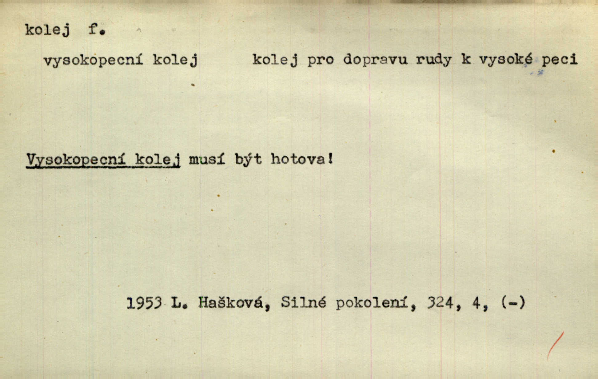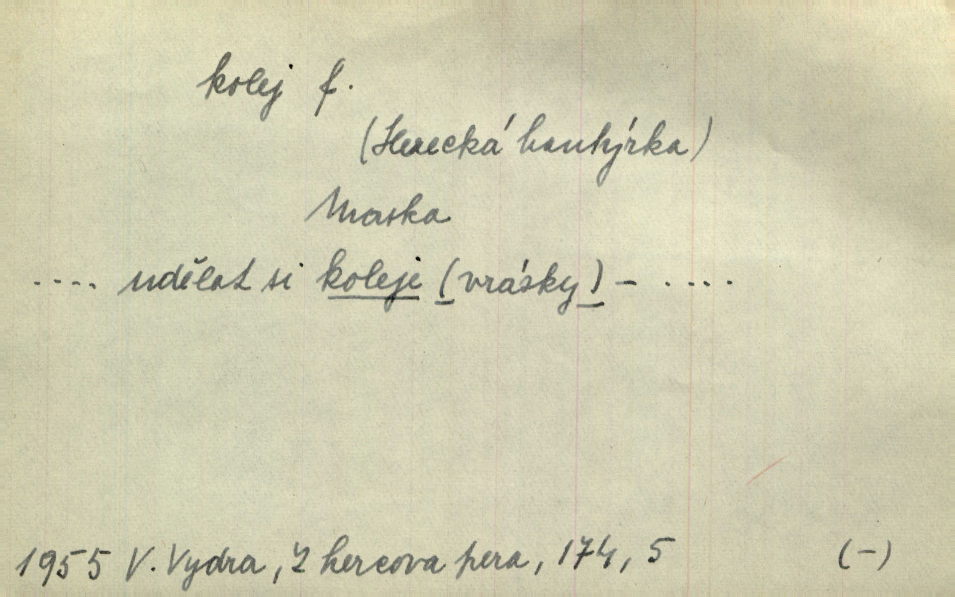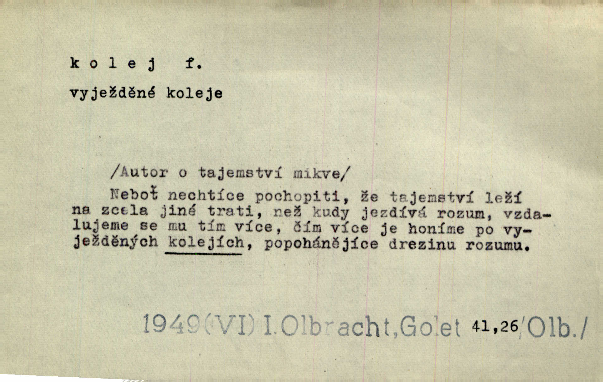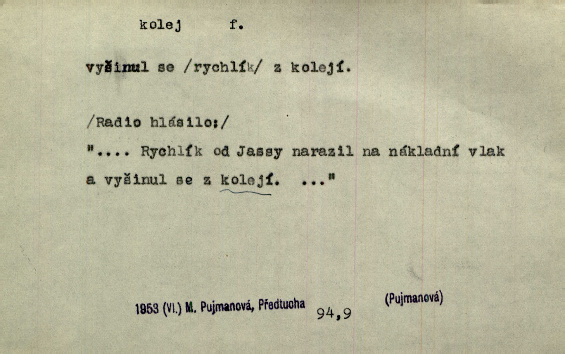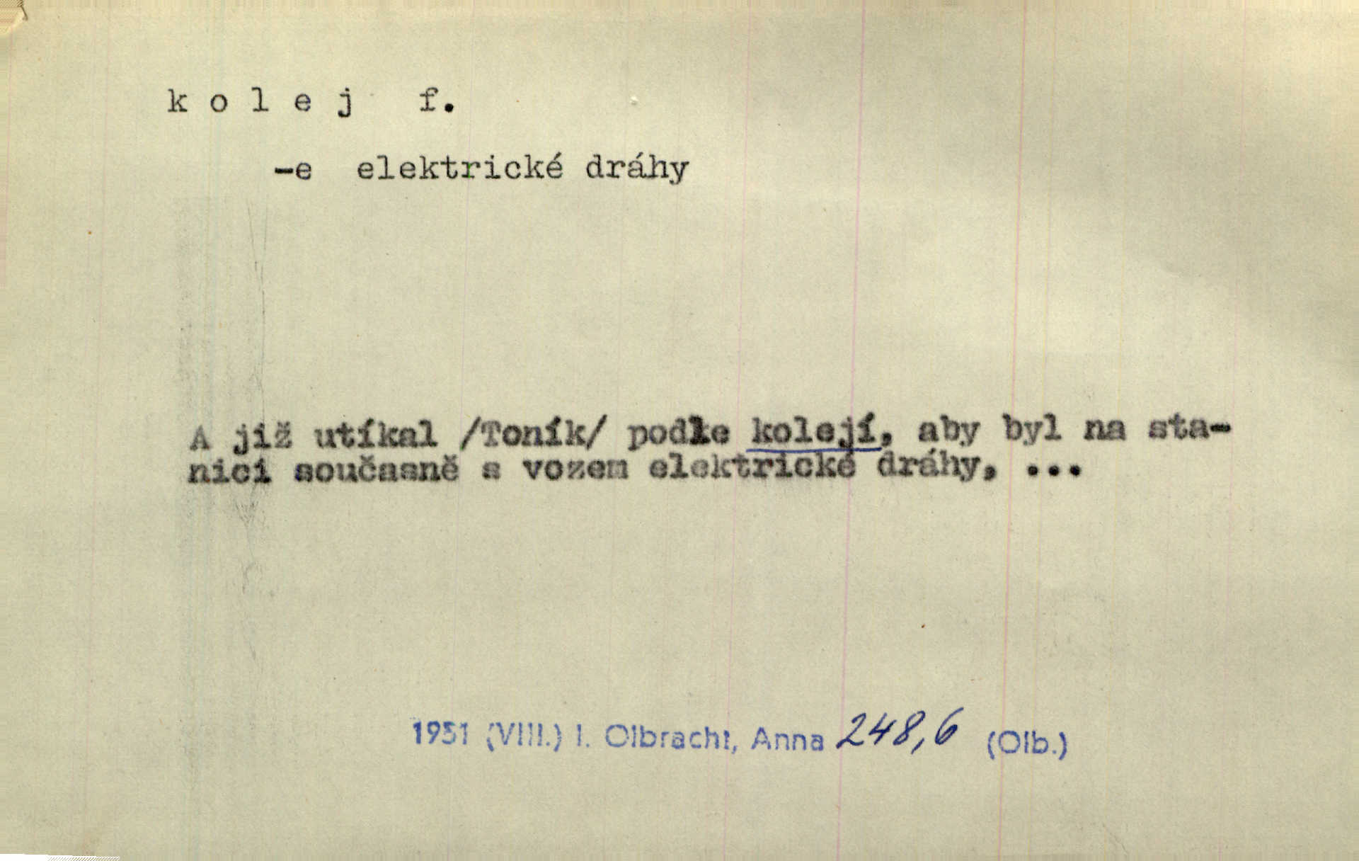 - kolej, -e f. 1. (arch. též m.) stopa, kterou kolo zanechává v cestě. Na cestách ještě stála voda v kolejích. Herb. Ani jedna kolej není ve sněhu. K. Čap. Kolej čerstvá [po saních] vede od statku ke vsi. Jir. D Dial. (jen m.) polní vozová cesta. Lamač ji [kozu] umyl vodou naběhlou v první bouřce do kolejů. Svět. D Přen. Všecko zase pomalu vstupuje v obyčejnou kolej v obvyklý způsob. Prvot. Sekční šéf aprobuje nebo neaprobuje podle vyježděných kolejí. Přít. Za nejpotřebnější práci pokládali jsme uvésti život českého studentstva v jiné koleje. Herb. Neudálo se nic, co by příliš vybočovalo z kolejí. Svob. Již jest tisk časopisový v Praze skoro zas do starých kolejů přiveden. Havl. U Radošův nešlo hospodářství nejnovějšími koleji. Třeb. D kolejnice, dvojice kolejnic. Po vysokém náspu běží kolej. Čech. Konečně přijel vlak zubovité dráhy. Taková dráha má tři koleje. Kosm. Na jedněch z kolejí stálo několik vagonů. Šrám. Přen. Některé otázky byly odsunuty na vedlejší kolej. Přít. Válka odvedla hlavní zájem na jinou kolej. Naše d.