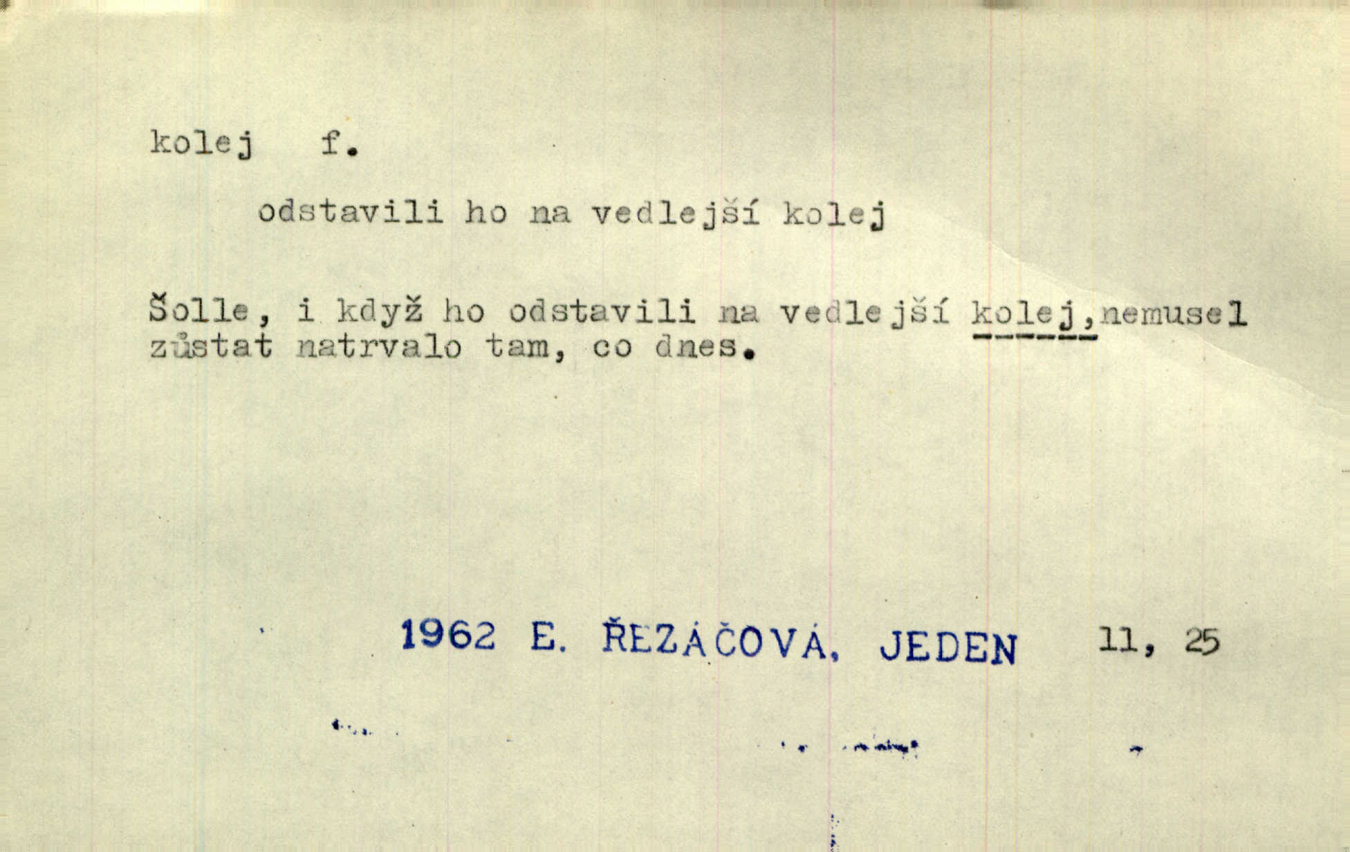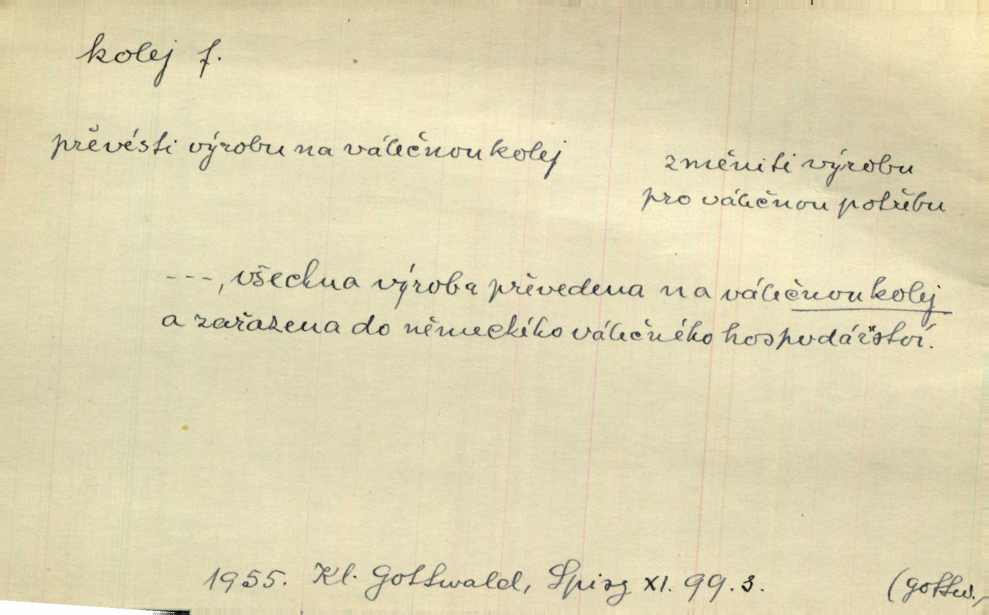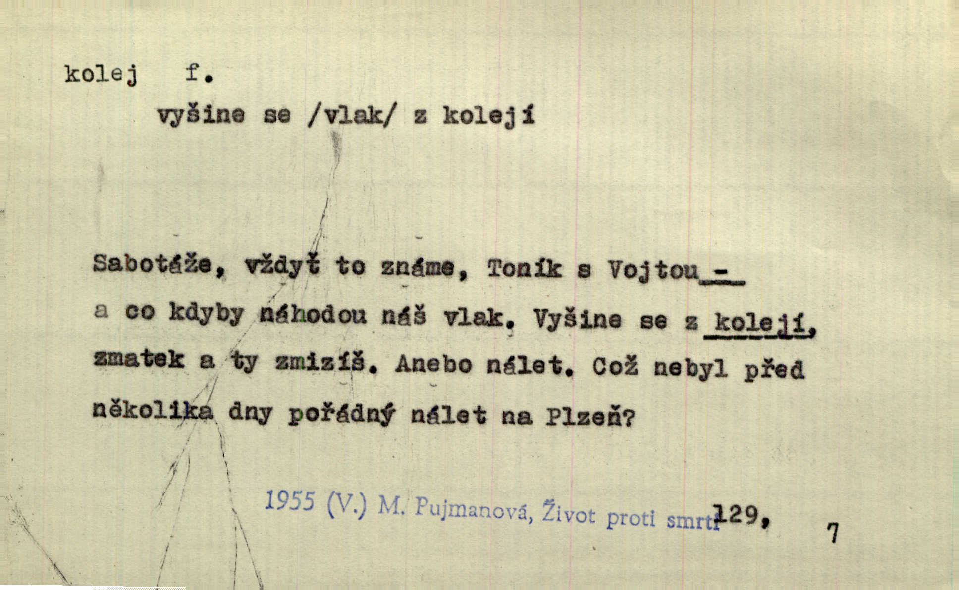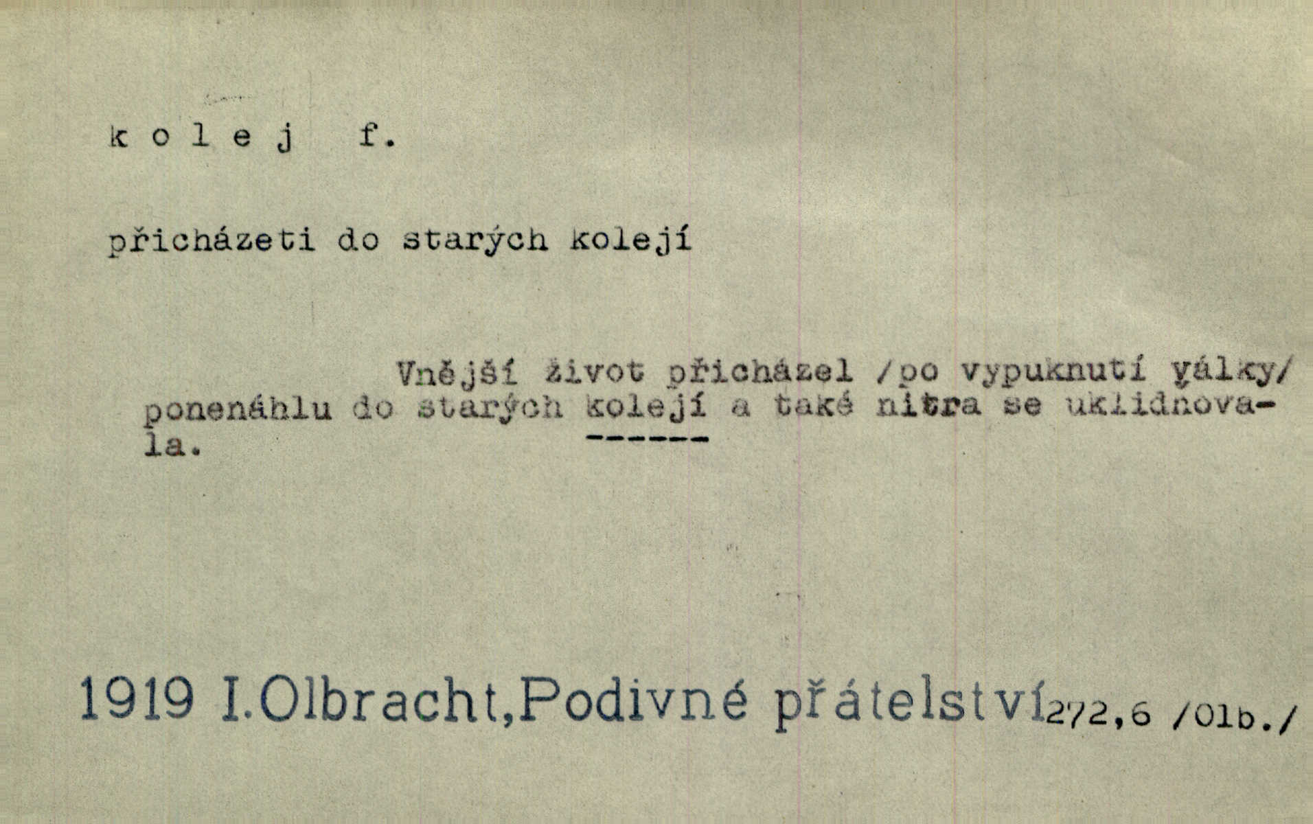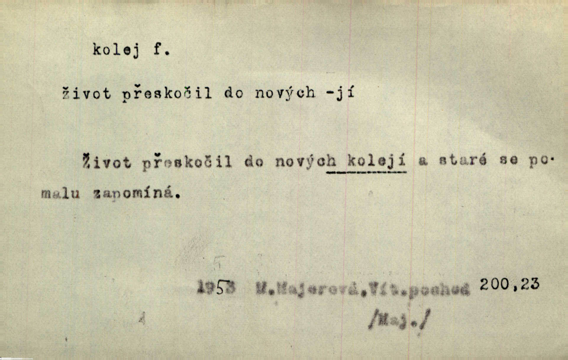- kolej, -e f. 1. (arch. též m.) stopa, kterou kolo zanechává v cestě. Na cestách ještě stála voda v kolejích. Herb. Ani jedna kolej není ve sněhu. K. Čap. Kolej čerstvá [po saních] vede od statku ke vsi. Jir. D Dial. (jen m.) polní vozová cesta. Lamač ji [kozu] umyl vodou naběhlou v první bouřce do kolejů. Svět. D Přen. Všecko zase pomalu vstupuje v obyčejnou kolej v obvyklý způsob. Prvot. Sekční šéf aprobuje nebo neaprobuje podle vyježděných kolejí. Přít. Za nejpotřebnější práci pokládali jsme uvésti život českého studentstva v jiné koleje. Herb. Neudálo se nic, co by příliš vybočovalo z kolejí. Svob. Již jest tisk časopisový v Praze skoro zas do starých kolejů přiveden. Havl. U Radošův nešlo hospodářství nejnovějšími koleji. Třeb. D kolejnice, dvojice kolejnic. Po vysokém náspu běží kolej. Čech. Konečně přijel vlak zubovité dráhy. Taková dráha má tři koleje. Kosm. Na jedněch z kolejí stálo několik vagonů. Šrám. Přen. Některé otázky byly odsunuty na vedlejší kolej. Přít. Válka odvedla hlavní zájem na jinou kolej. Naše d.