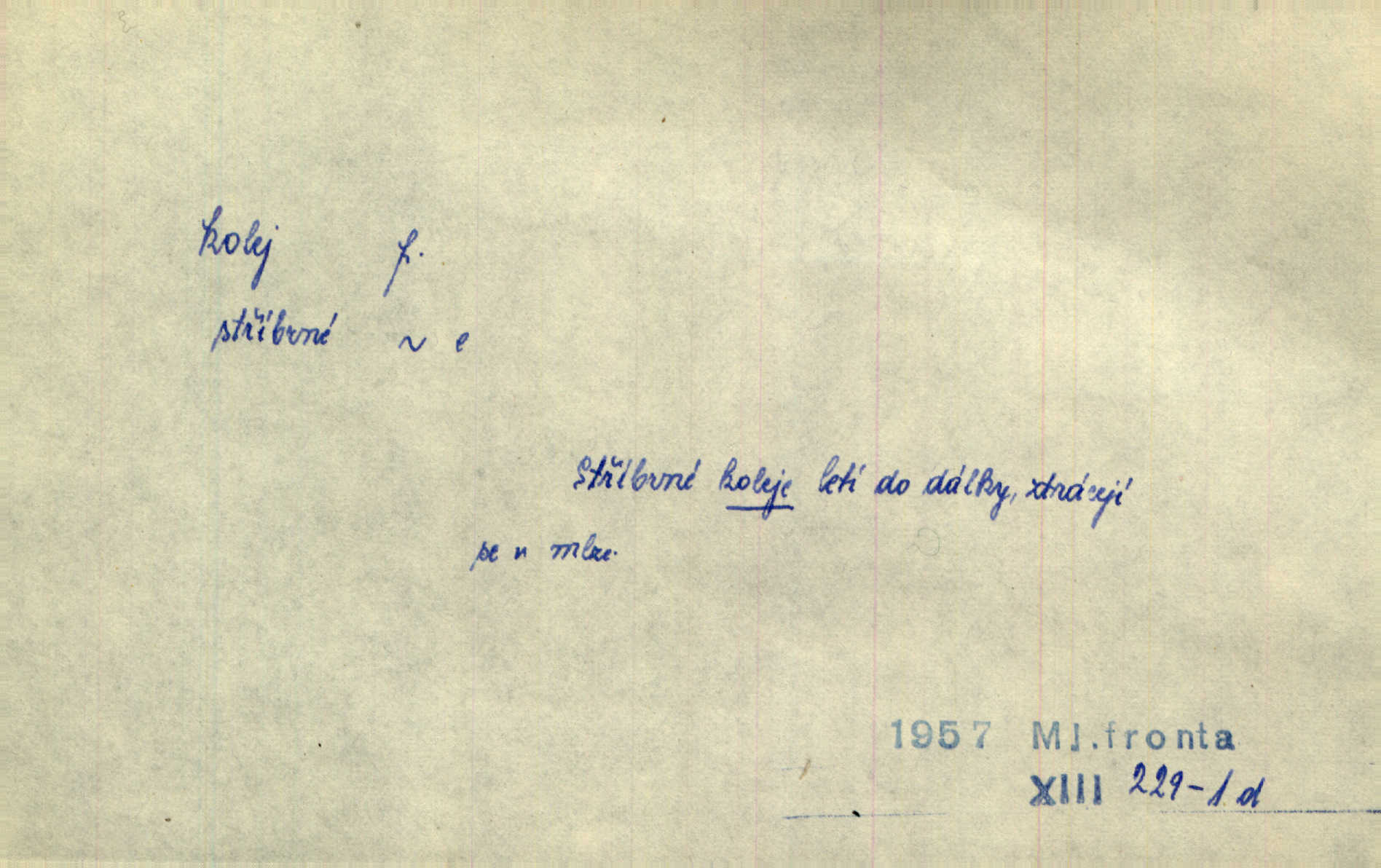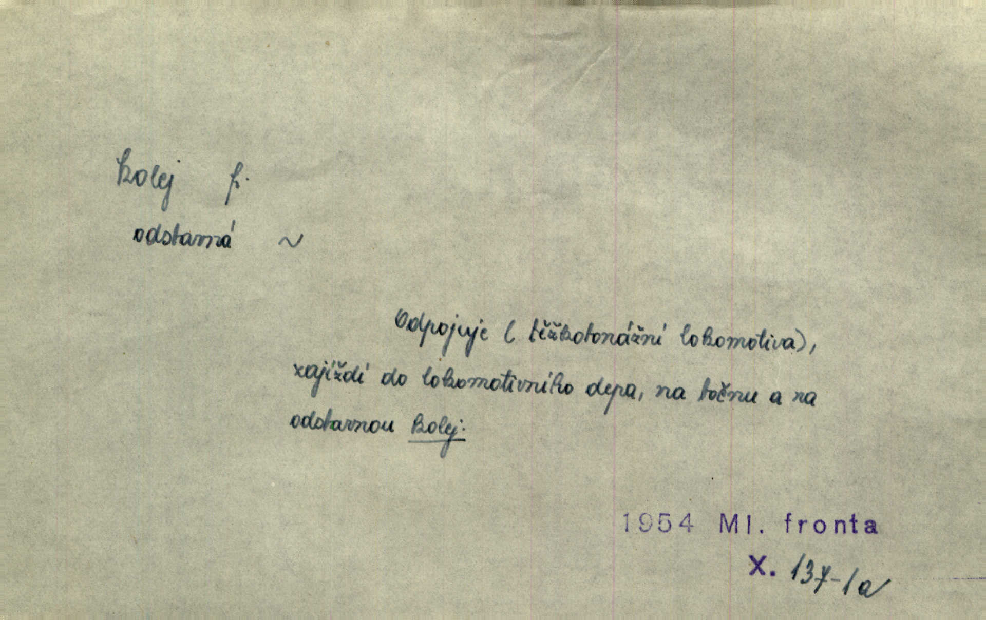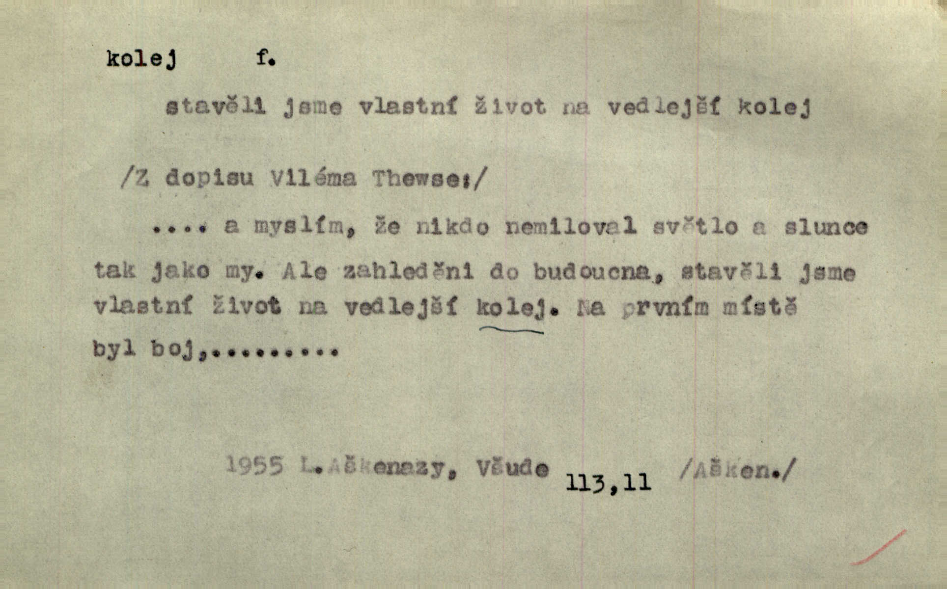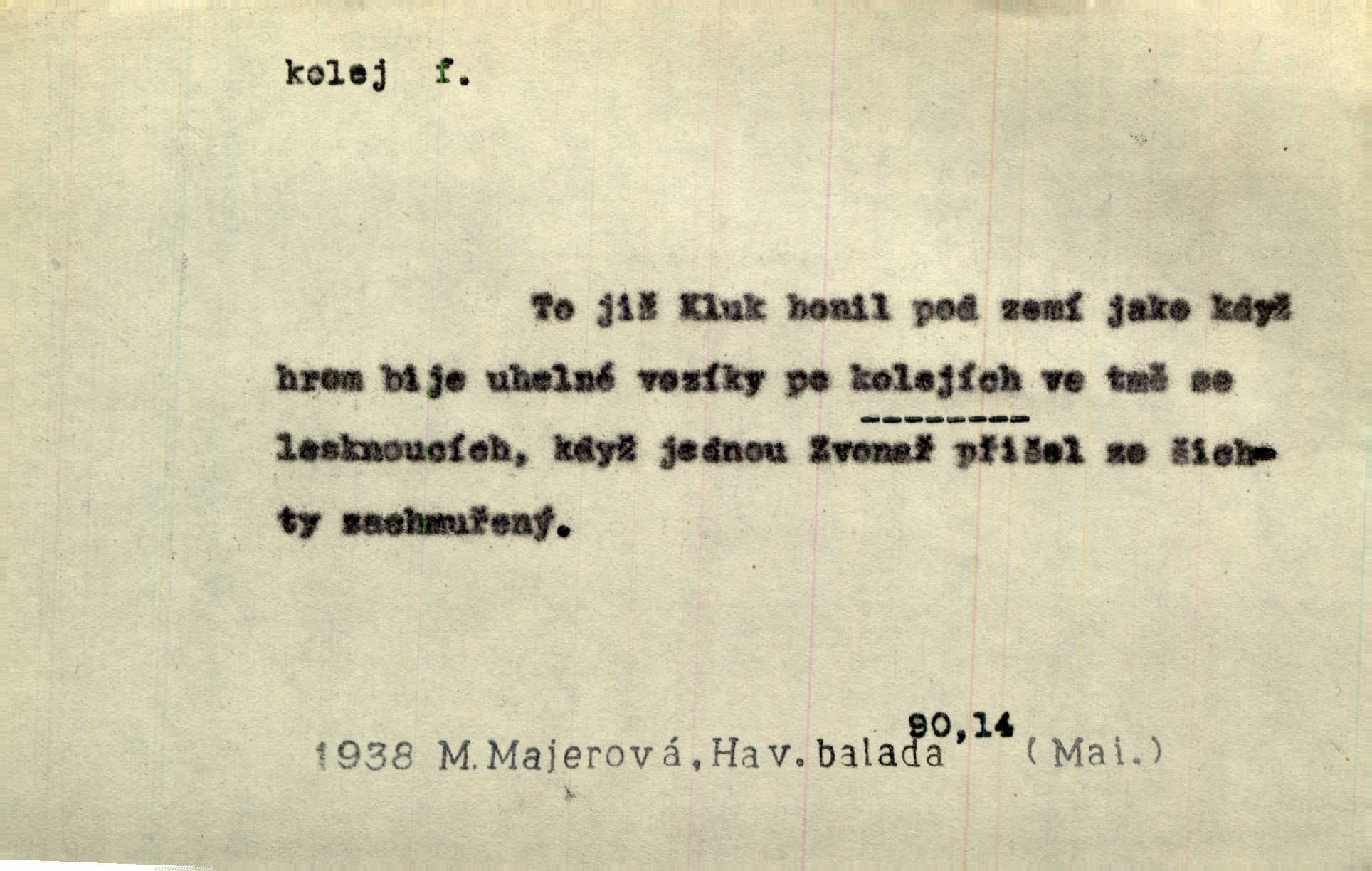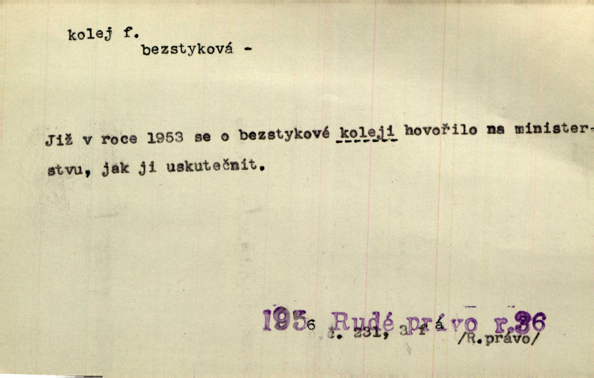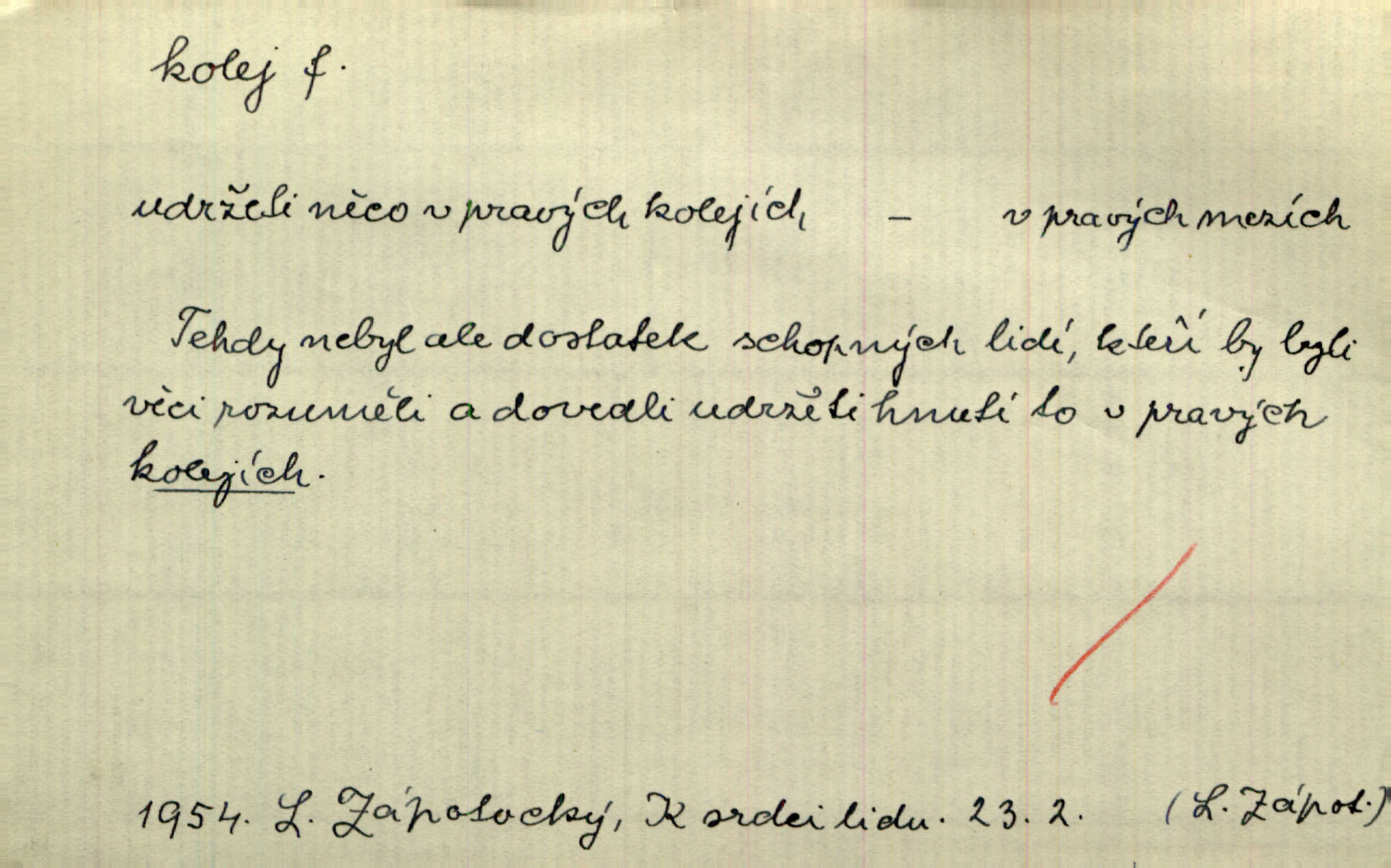 - kolej, -e f. 1. (arch. též m.) stopa, kterou kolo zanechává v cestě. Na cestách ještě stála voda v kolejích. Herb. Ani jedna kolej není ve sněhu. K. Čap. Kolej čerstvá [po saních] vede od statku ke vsi. Jir. D Dial. (jen m.) polní vozová cesta. Lamač ji [kozu] umyl vodou naběhlou v první bouřce do kolejů. Svět. D Přen. Všecko zase pomalu vstupuje v obyčejnou kolej v obvyklý způsob. Prvot. Sekční šéf aprobuje nebo neaprobuje podle vyježděných kolejí. Přít. Za nejpotřebnější práci pokládali jsme uvésti život českého studentstva v jiné koleje. Herb. Neudálo se nic, co by příliš vybočovalo z kolejí. Svob. Již jest tisk časopisový v Praze skoro zas do starých kolejů přiveden. Havl. U Radošův nešlo hospodářství nejnovějšími koleji. Třeb. D kolejnice, dvojice kolejnic. Po vysokém náspu běží kolej. Čech. Konečně přijel vlak zubovité dráhy. Taková dráha má tři koleje. Kosm. Na jedněch z kolejí stálo několik vagonů. Šrám. Přen. Některé otázky byly odsunuty na vedlejší kolej. Přít. Válka odvedla hlavní zájem na jinou kolej. Naše d.