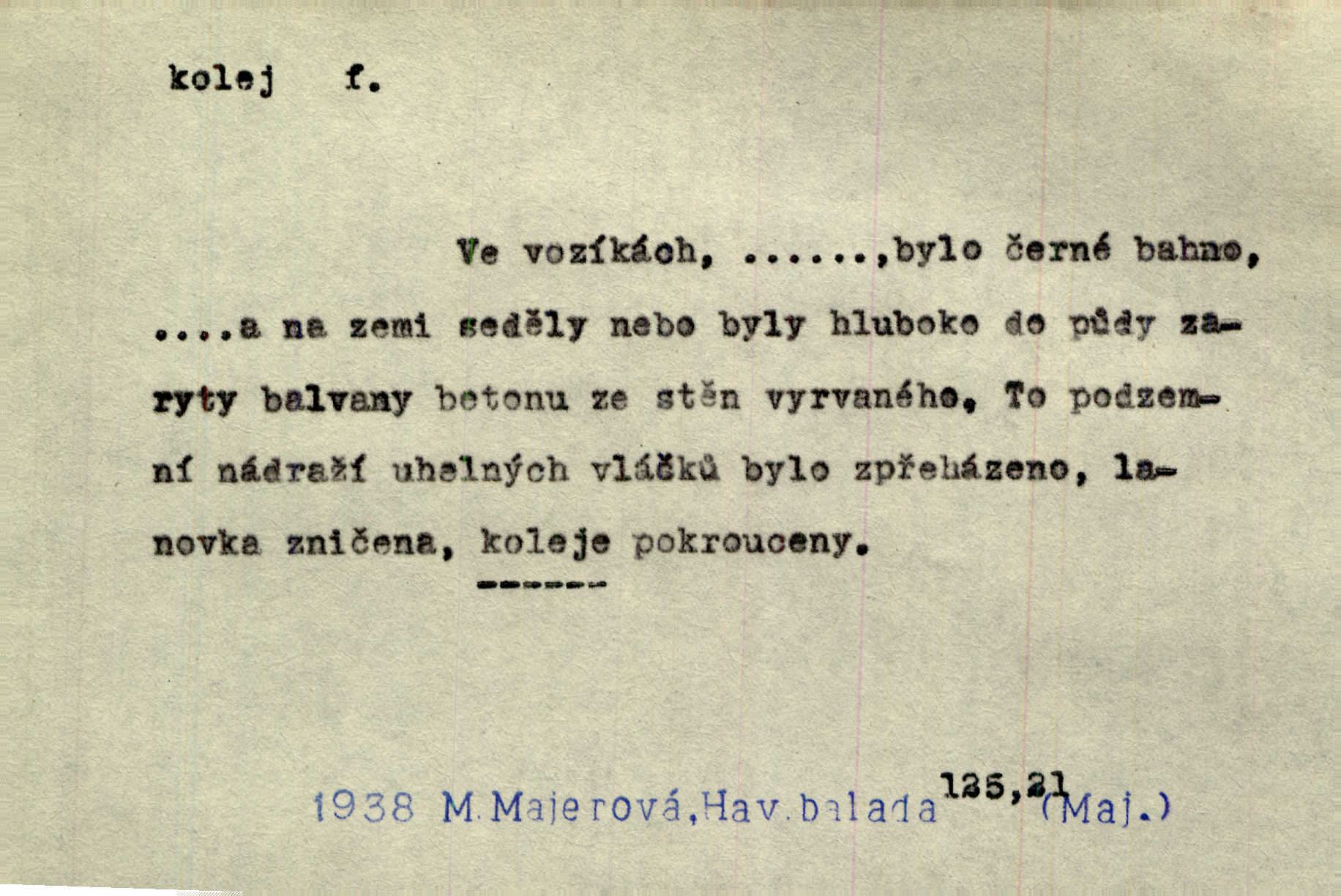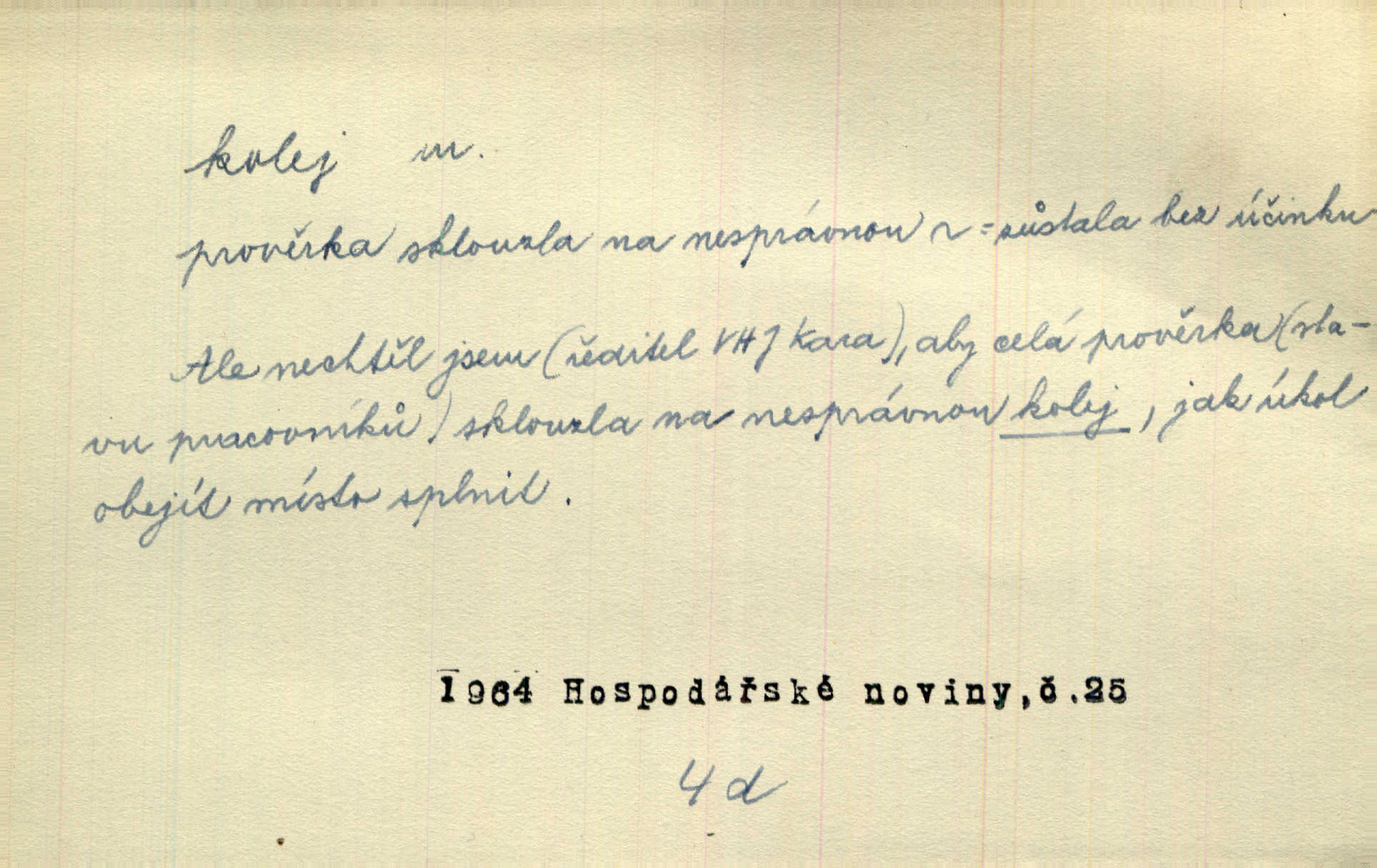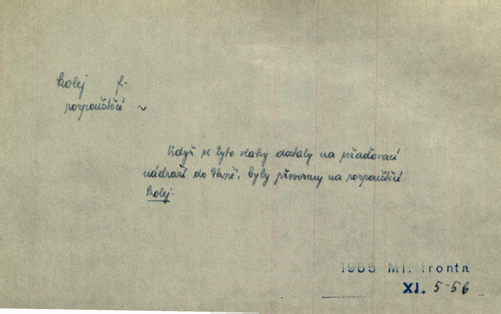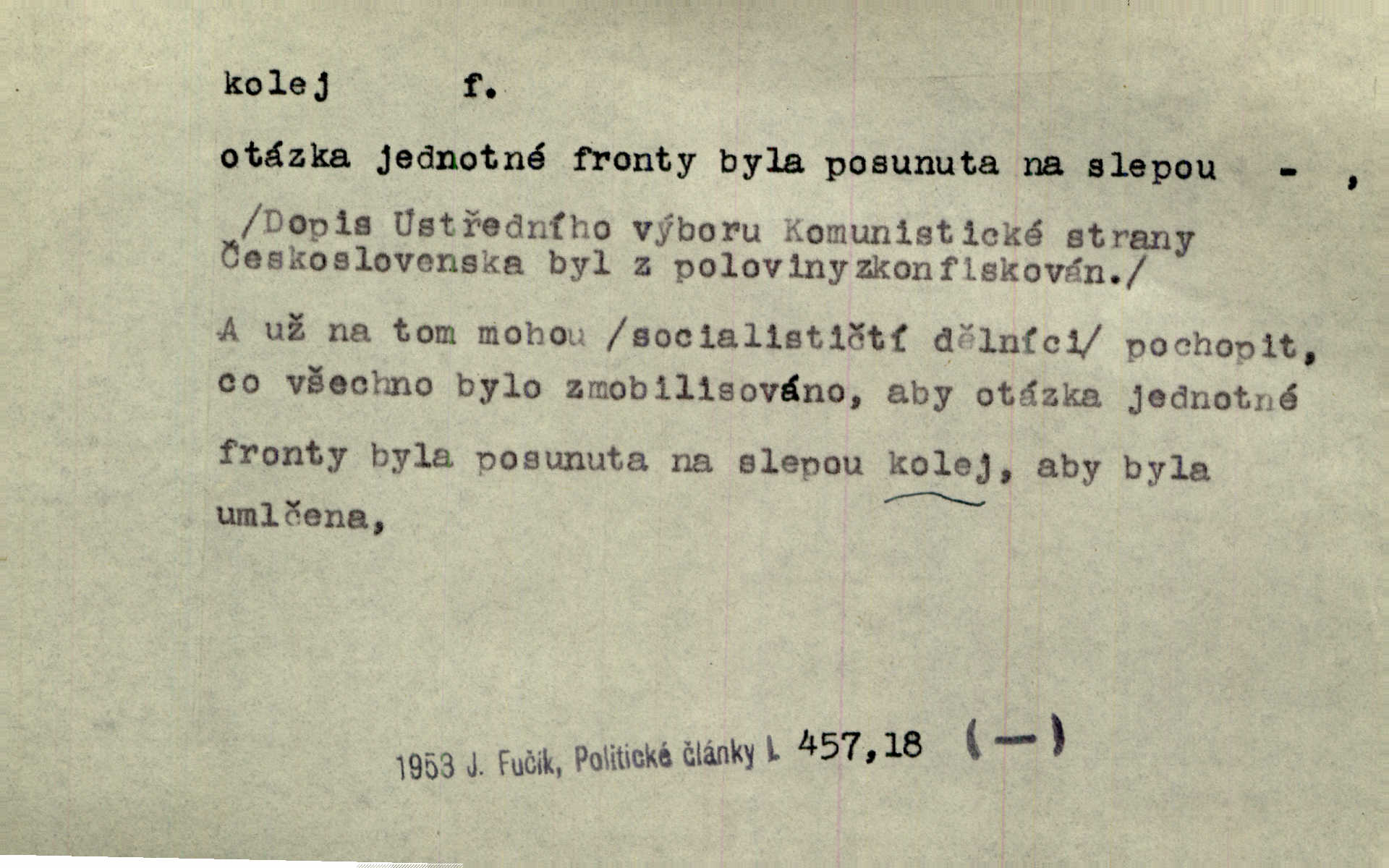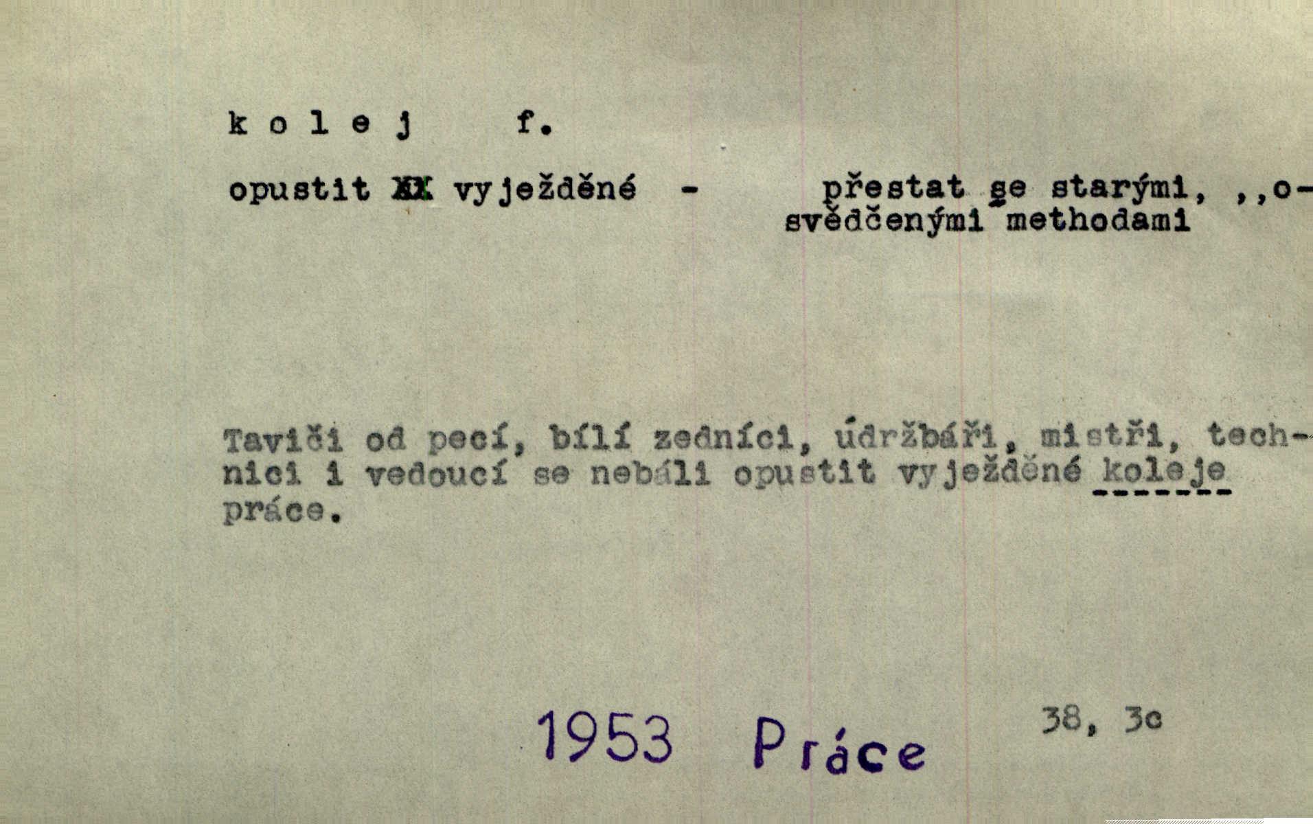 - kolej, -e f. 1. (arch. též m.) stopa, kterou kolo zanechává v cestě. Na cestách ještě stála voda v kolejích. Herb. Ani jedna kolej není ve sněhu. K. Čap. Kolej čerstvá [po saních] vede od statku ke vsi. Jir. D Dial. (jen m.) polní vozová cesta. Lamač ji [kozu] umyl vodou naběhlou v první bouřce do kolejů. Svět. D Přen. Všecko zase pomalu vstupuje v obyčejnou kolej v obvyklý způsob. Prvot. Sekční šéf aprobuje nebo neaprobuje podle vyježděných kolejí. Přít. Za nejpotřebnější práci pokládali jsme uvésti život českého studentstva v jiné koleje. Herb. Neudálo se nic, co by příliš vybočovalo z kolejí. Svob. Již jest tisk časopisový v Praze skoro zas do starých kolejů přiveden. Havl. U Radošův nešlo hospodářství nejnovějšími koleji. Třeb. D kolejnice, dvojice kolejnic. Po vysokém náspu běží kolej. Čech. Konečně přijel vlak zubovité dráhy. Taková dráha má tři koleje. Kosm. Na jedněch z kolejí stálo několik vagonů. Šrám. Přen. Některé otázky byly odsunuty na vedlejší kolej. Přít. Válka odvedla hlavní zájem na jinou kolej. Naše d.