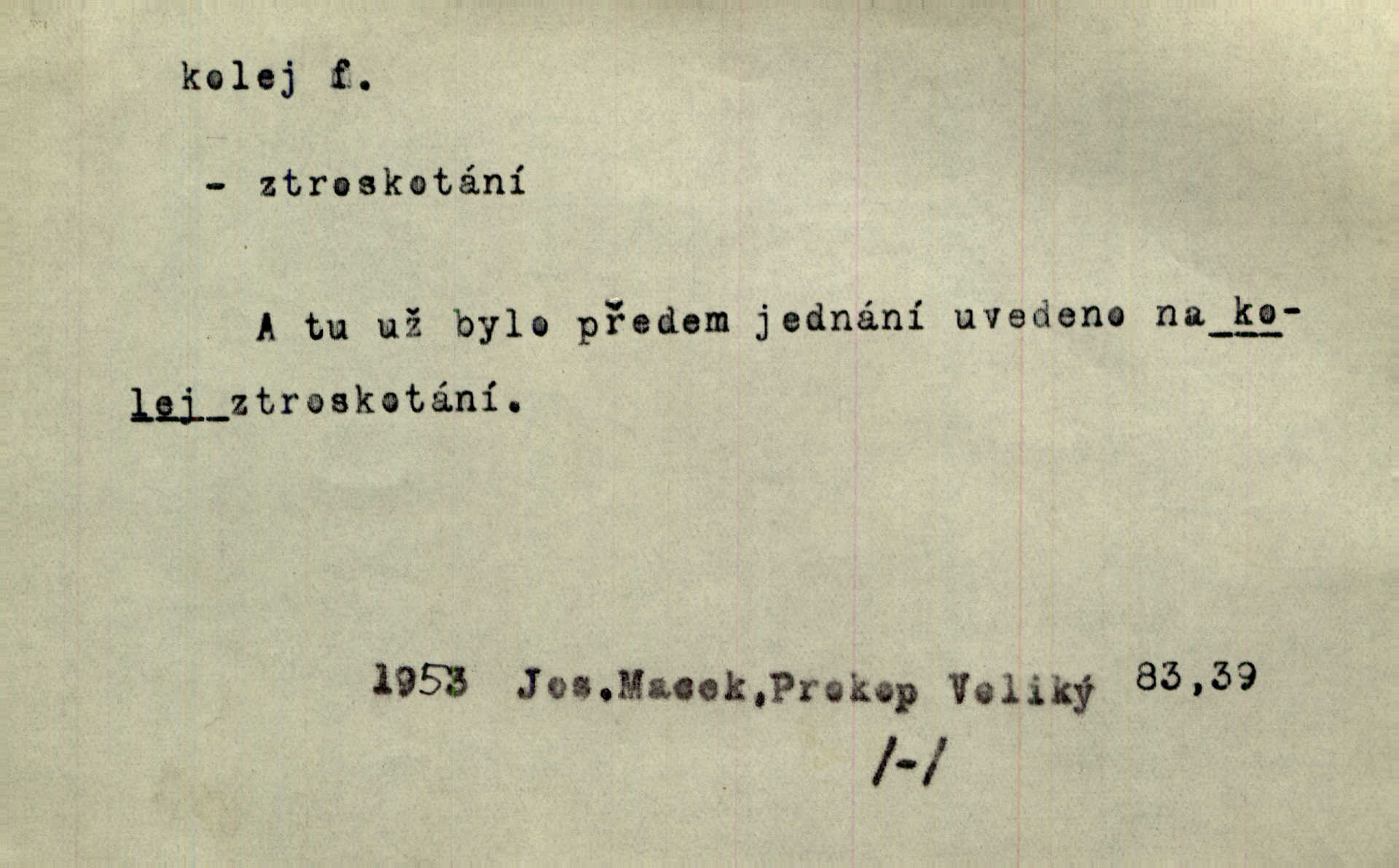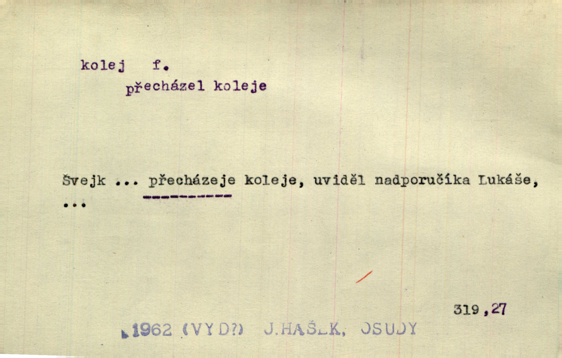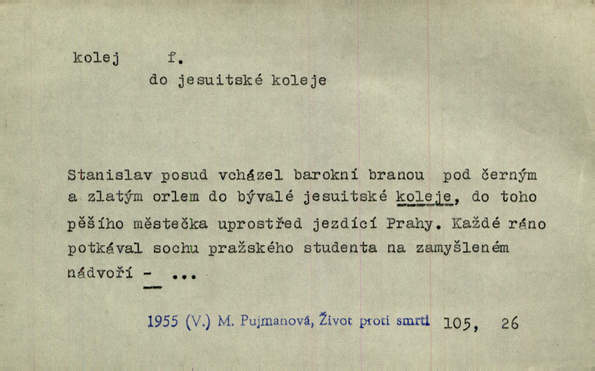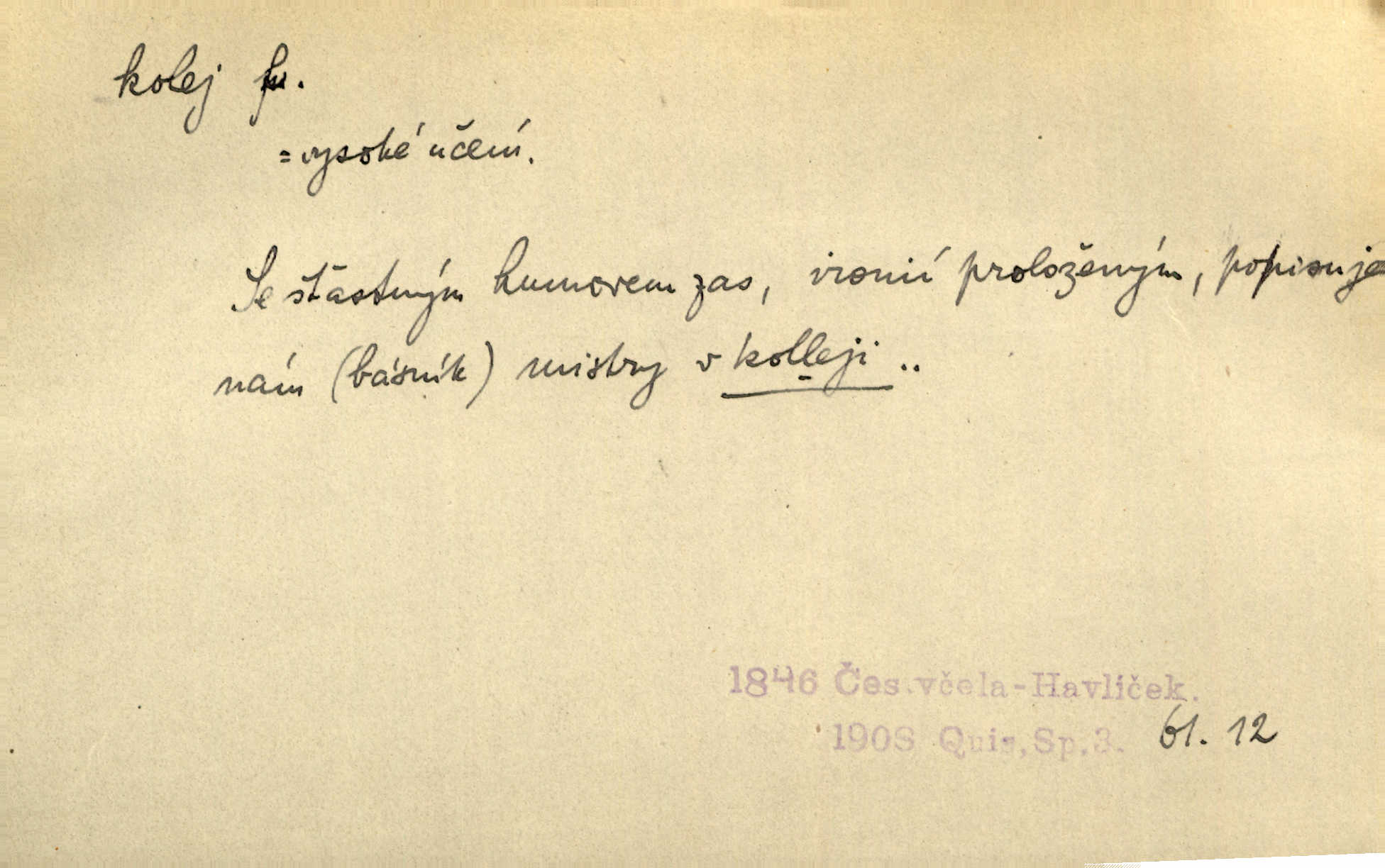 - kolej, -e f. 2. ve starší době ústav při universitě n. jiné škole, v němž učitelé i žáci bydlili a stravovali se a kde se konaly přednášky. Legatové Basilejští ubytováni byli v kolleji Karolinské. Pal. Byly to spisy vydané novoměstskou kolejí jesuitskou. Svět. D Arch. universitní budova. Na Jungmanna jsme si v Praze počkali u koleje. Rais. Kolej navštěvoval [právník Horáček] jen, když měl dlouhou chvíli. Ner. D v západních zemích vyšší škola s internátem. Charles dán do koleje Ludvíka Velkého. Vrch. Studenti bydlili společně, jako dosud jest v Anglii, v kollejích (collèges). Drt. Zpaměti jsem pak nakreslil koleje Cambridgeské. K. Čap. D ústav pro ubytování a stravování studentů. Hlávkovy studentské koleje českých vysokých škol pražských. Masarykova studentská kolej.